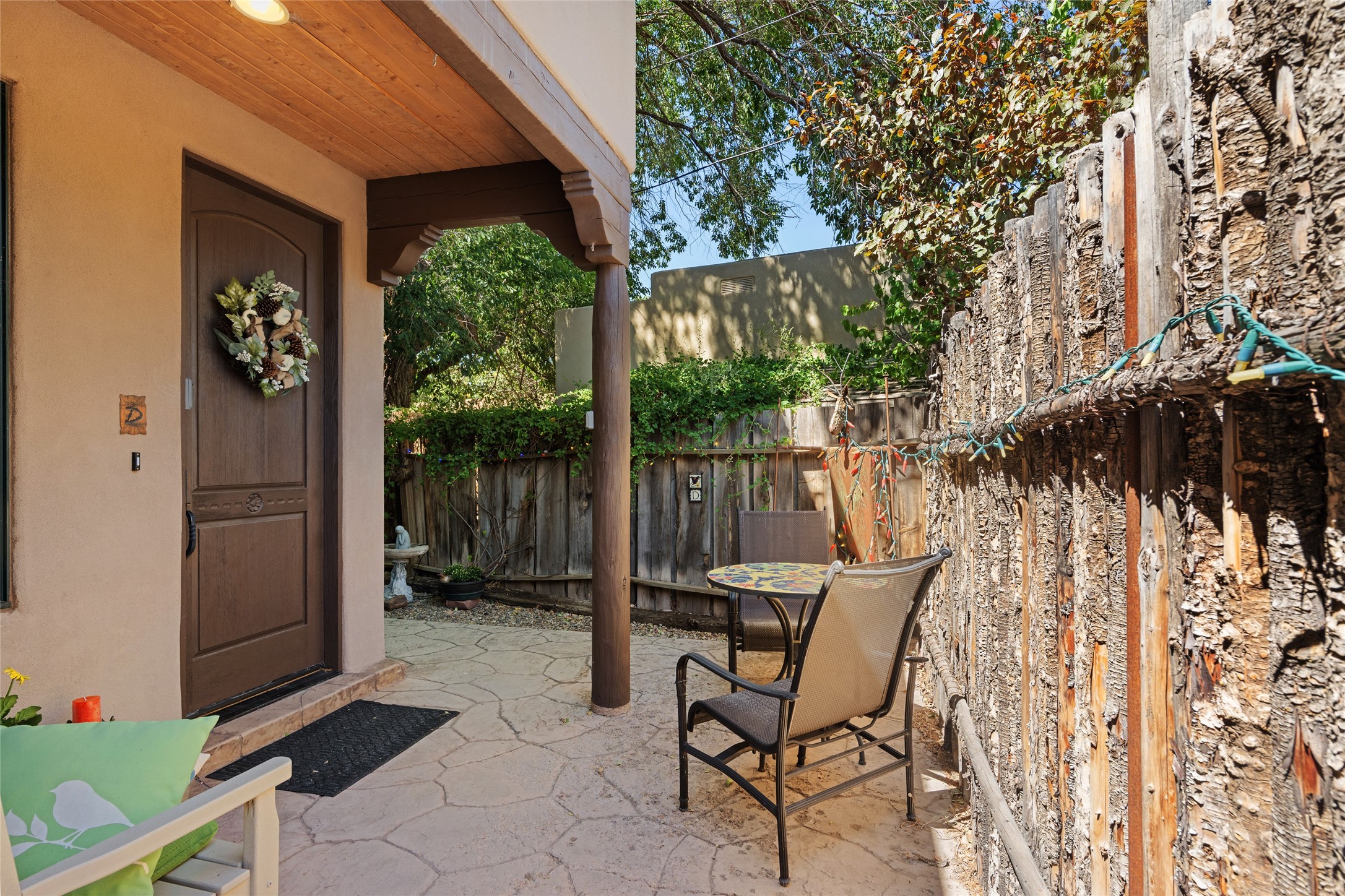 Lovely Railyard condo has current features: wood floors, granite, jetted soaker tub, 10-foot ceilings, AC, gas fireplace, high-end gas range, new water heater (1 year), walk-in pantry, four outdoor areas; all just a short 8-minute stroll to the Farmers Market and Guadalupe Street--rare two off-street parking spaces and coyote fencing. There is also a furniture package available. HOA fee also covers grounds, drip system, exterior lighting, and insurance for the maintenance of the exterior of the Condo.