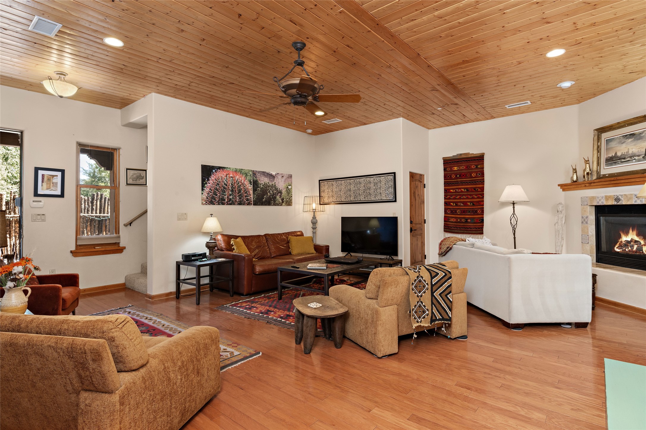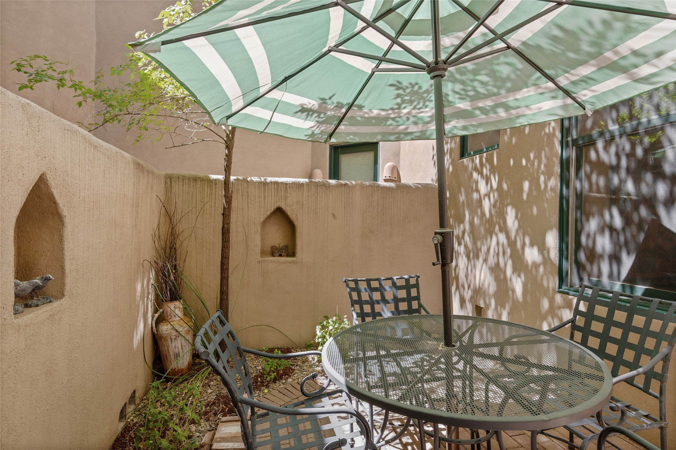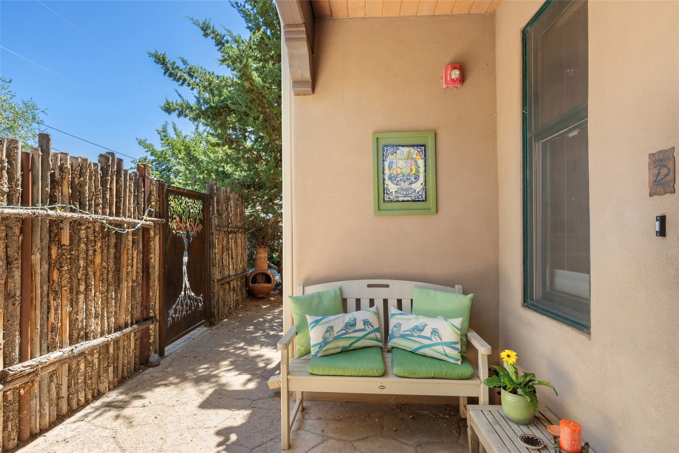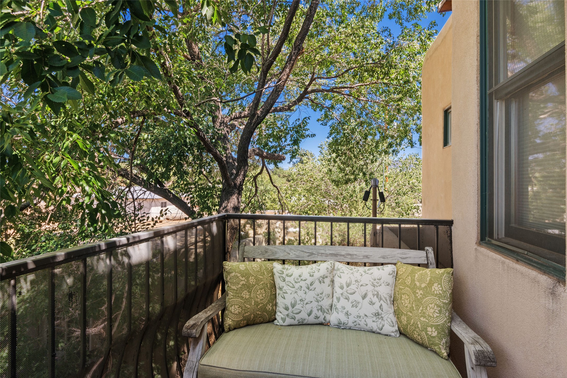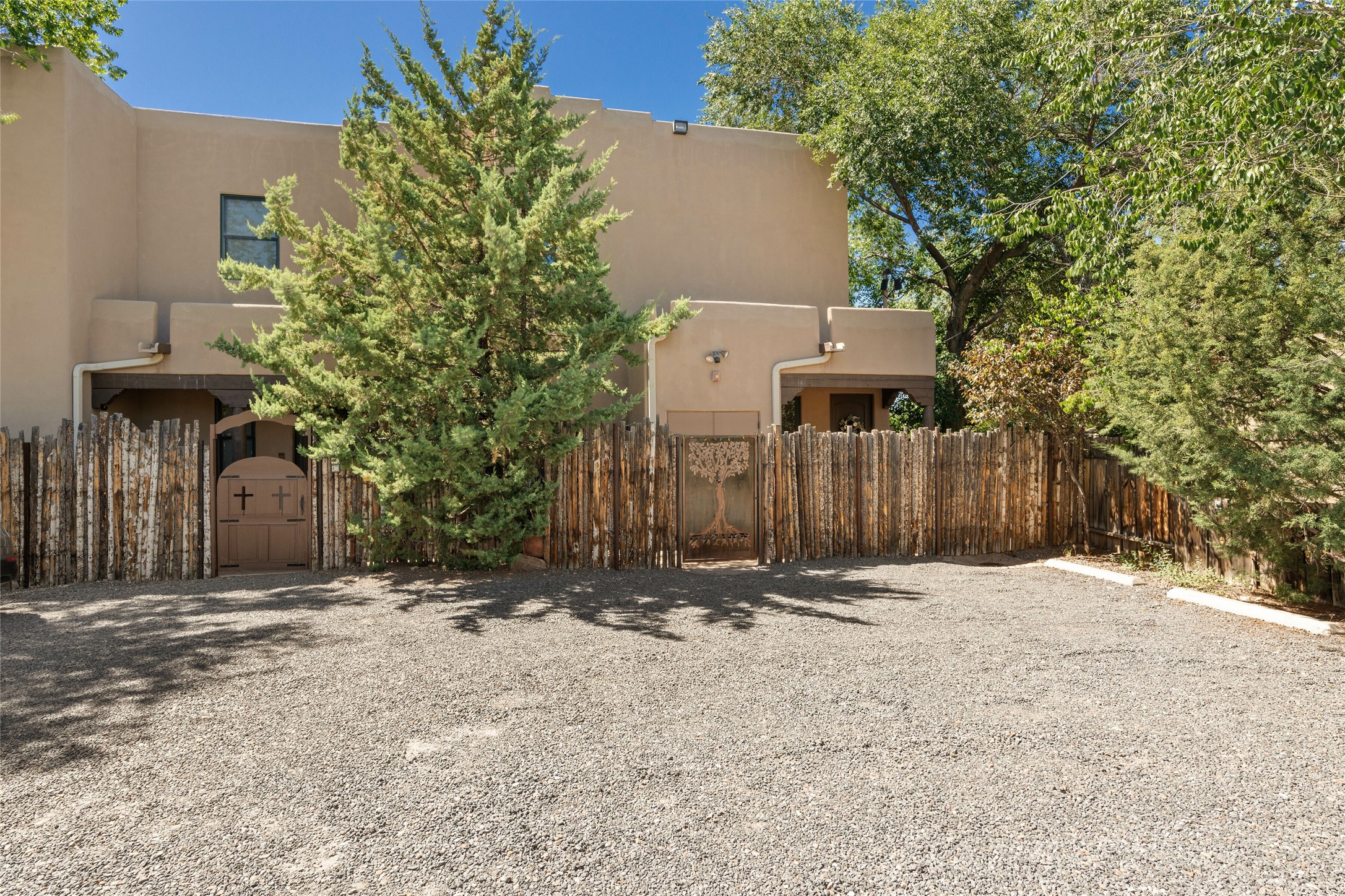 Lovely Railyard condo has current features: wood floors, granite, jetted soaker tub, 10-foot ceilings, AC, gas fireplace, high-end gas range, new water heater (1 year), walk-in pantry, four outdoor areas; all just a short 8-minute stroll to the Farmers Market and Guadalupe Street--rare two off-street parking spaces and coyote fencing. There is also a furniture package available. HOA fee also covers grounds, drip system, exterior lighting, and insurance for the maintenance of the exterior of the Condo.