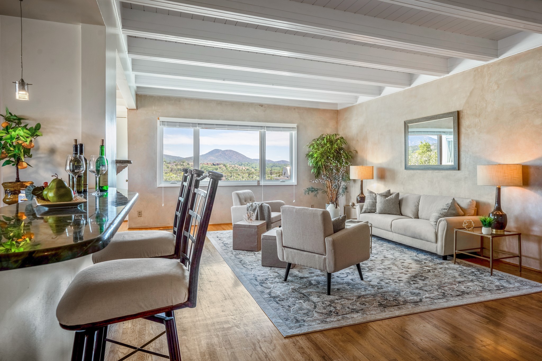 For Outstanding City and Mountain Views, discover the appeal of 783 Paseo de la Cuma, perched gracefully above the Santa Fe Plaza. From the moment you step inside, breathtaking vistas greet you in all directions. Gorgeous sunrises paint the sky every morning. Equally beautiful sunsets can be seen from the front entry. As you pass through the front gate, you'll find a private, spacious, walled courtyard and a lovely garden to enjoy Santa Fe's splendid climate. This charming mid-century home, built in 1960, features wood floors throughout the main level with three bedrooms, two updated bathrooms (including Smart toilet outlets), in just over 2,311 square feet. An open living and dining space blends seamlessly into the elegantly remodeled kitchen with custom Cherry and Maple cabinets and built-ins. The appliance package includes top-tier Sub-Zero Freezer and Refrigerator, Wolf gas range, convection oven, microwave and warming drawer, a Bosch dishwasher along with a two zone Sub-Zero wine refrigerator. A deck just off the dining/living area offers a great space to take in the city lights. A cozy banco adjacent to the kitchen welcomes you for morning coffee and surrounds you with views. In addition, a generous butlers pantry leads you into a sunlit studio/workshop/office, complete with a mini-split, providing comfort and versatility for both work and leisure. On the lower level, a separate guesthouse has its own private path and entry from the main-level parking area. This 1,475 square foot abode provides one bedroom and office, a tastefully updated 3/4 bath, a comfortable living and dining area with a well-appointed kitchenette. Additionally, there is a stackable washer and dryer, and tankless water heater. A workout/yoga room completes the package. The views from the picture windows are sure to delight your guests or tenants. This unit provides an excellent investment opportunity or a very appealing destination for friends and family, located just a short walk from the Plaza. Impeccable maintenance and thoughtful updates include a well-maintained roof, new Marvin casement and picture windows, and fresh stucco updates in 2023. Completing the picture is a two-car garage with mudroom and ample additional parking spaces... ideal for hosting gatherings with family and friends. This beautiful property is a short walk to Fort Marcy park with its community center, pickleball courts and the many festivals Santa Fe has to offer. Come and experience 783 Paseo de la Cuma...you won't want to miss it.