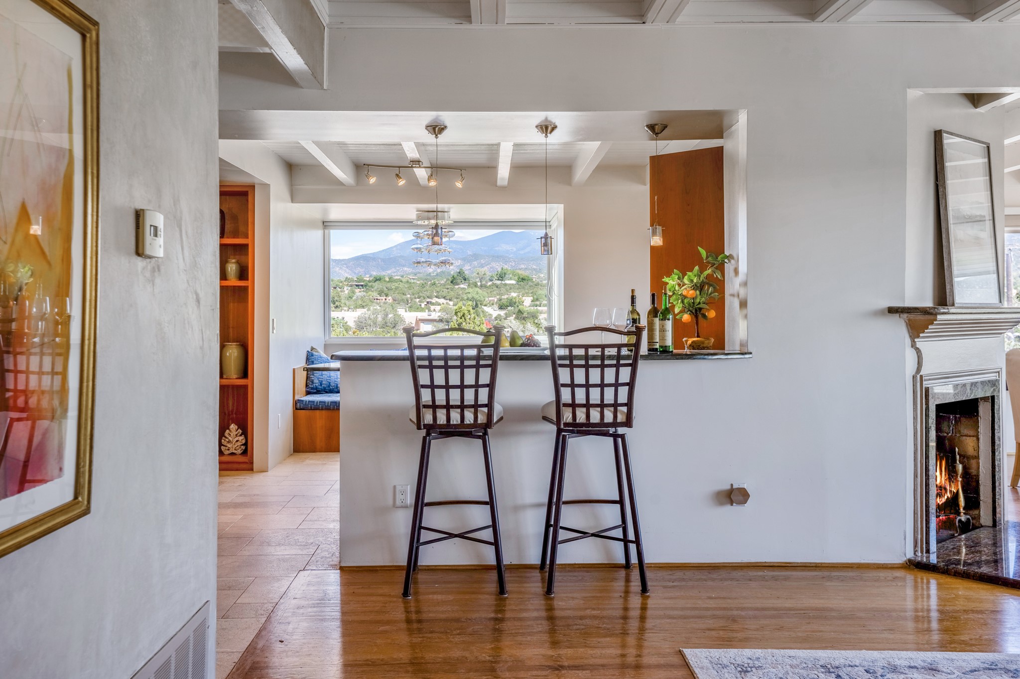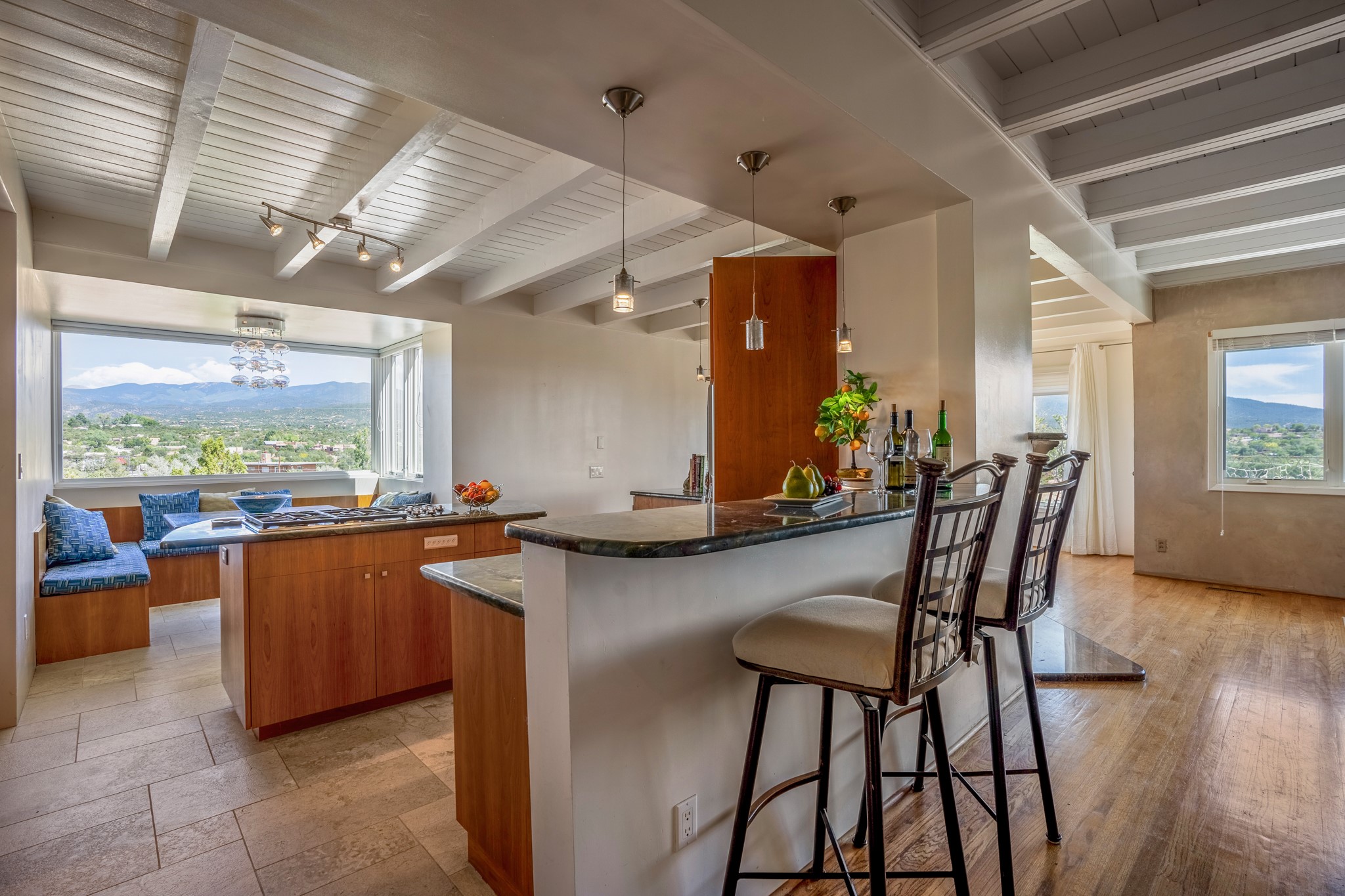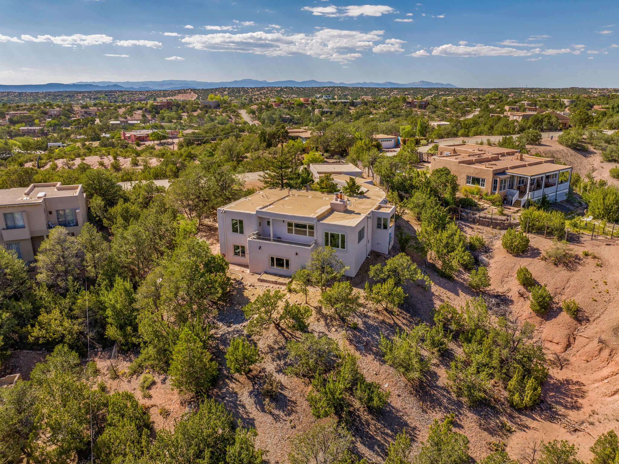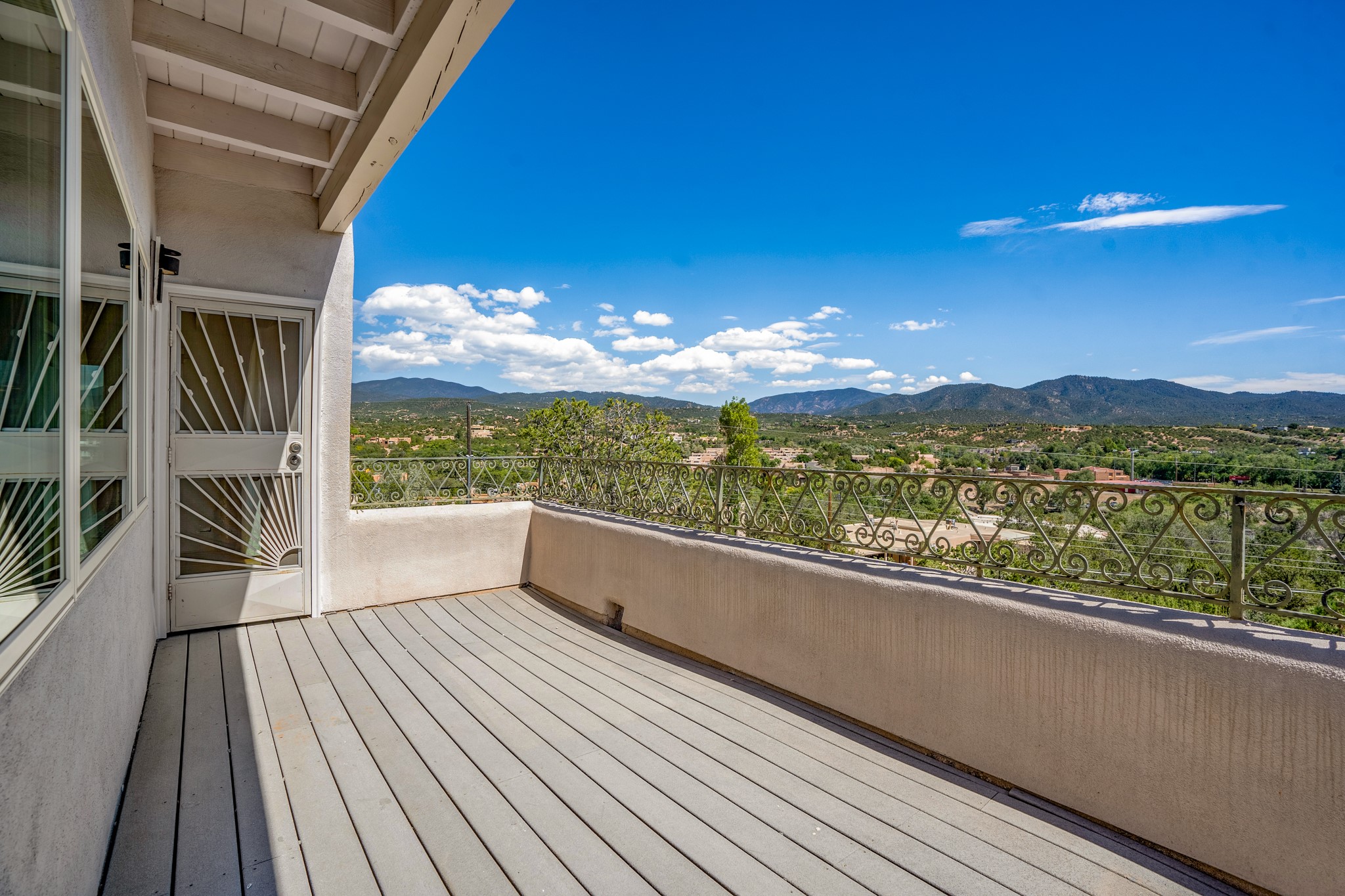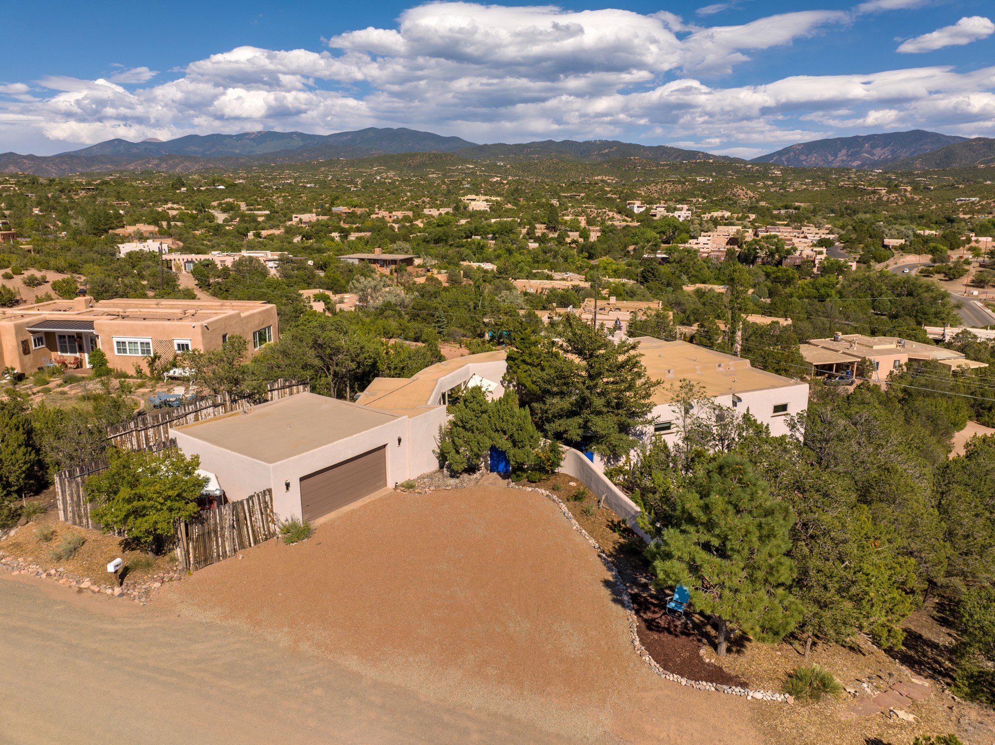 For Outstanding City and Mountain Views, discover the appeal of 783 Paseo de la Cuma, perched gracefully above the Santa Fe Plaza. From the moment you step inside, breathtaking vistas greet you in all directions. Gorgeous sunrises paint the sky every morning. Equally beautiful sunsets can be seen from the front entry. As you pass through the front gate, you'll find a private, spacious, walled courtyard and a lovely garden to enjoy Santa Fe's splendid climate. This charming mid-century home, built in 1960, features wood floors throughout the main level with three bedrooms, two updated bathrooms (including Smart toilet outlets), in just over 2,311 square feet. An open living and dining space blends seamlessly into the elegantly remodeled kitchen with custom Cherry and Maple cabinets and built-ins. The appliance package includes top-tier Sub-Zero Freezer and Refrigerator, Wolf gas range, convection oven, microwave and warming drawer, a Bosch dishwasher along with a two zone Sub-Zero wine refrigerator. A deck just off the dining/living area offers a great space to take in the city lights. A cozy banco adjacent to the kitchen welcomes you for morning coffee and surrounds you with views. In addition, a generous butlers pantry leads you into a sunlit studio/workshop/office, complete with a mini-split, providing comfort and versatility for both work and leisure. On the lower level, a separate guesthouse has its own private path and entry from the main-level parking area. This 1,475 square foot abode provides one bedroom and office, a tastefully updated 3/4 bath, a comfortable living and dining area with a well-appointed kitchenette. Additionally, there is a stackable washer and dryer, and tankless water heater. A workout/yoga room completes the package. The views from the picture windows are sure to delight your guests or tenants. This unit provides an excellent investment opportunity or a very appealing destination for friends and family, located just a short walk from the Plaza. Impeccable maintenance and thoughtful updates include a well-maintained roof, new Marvin casement and picture windows, and fresh stucco updates in 2023. Completing the picture is a two-car garage with mudroom and ample additional parking spaces... ideal for hosting gatherings with family and friends. This beautiful property is a short walk to Fort Marcy park with its community center, pickleball courts and the many festivals Santa Fe has to offer. Come and experience 783 Paseo de la Cuma...you won't want to miss it.