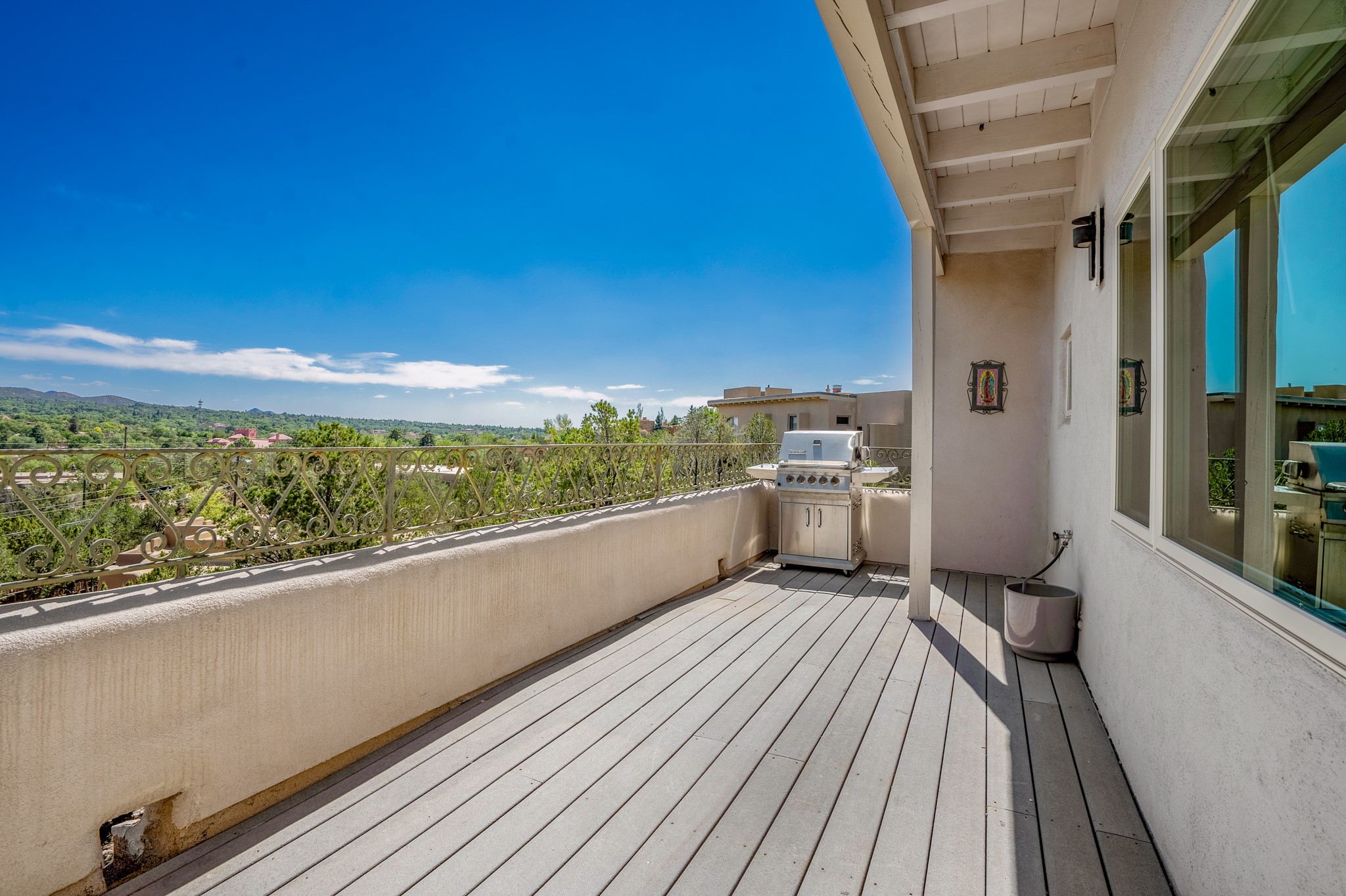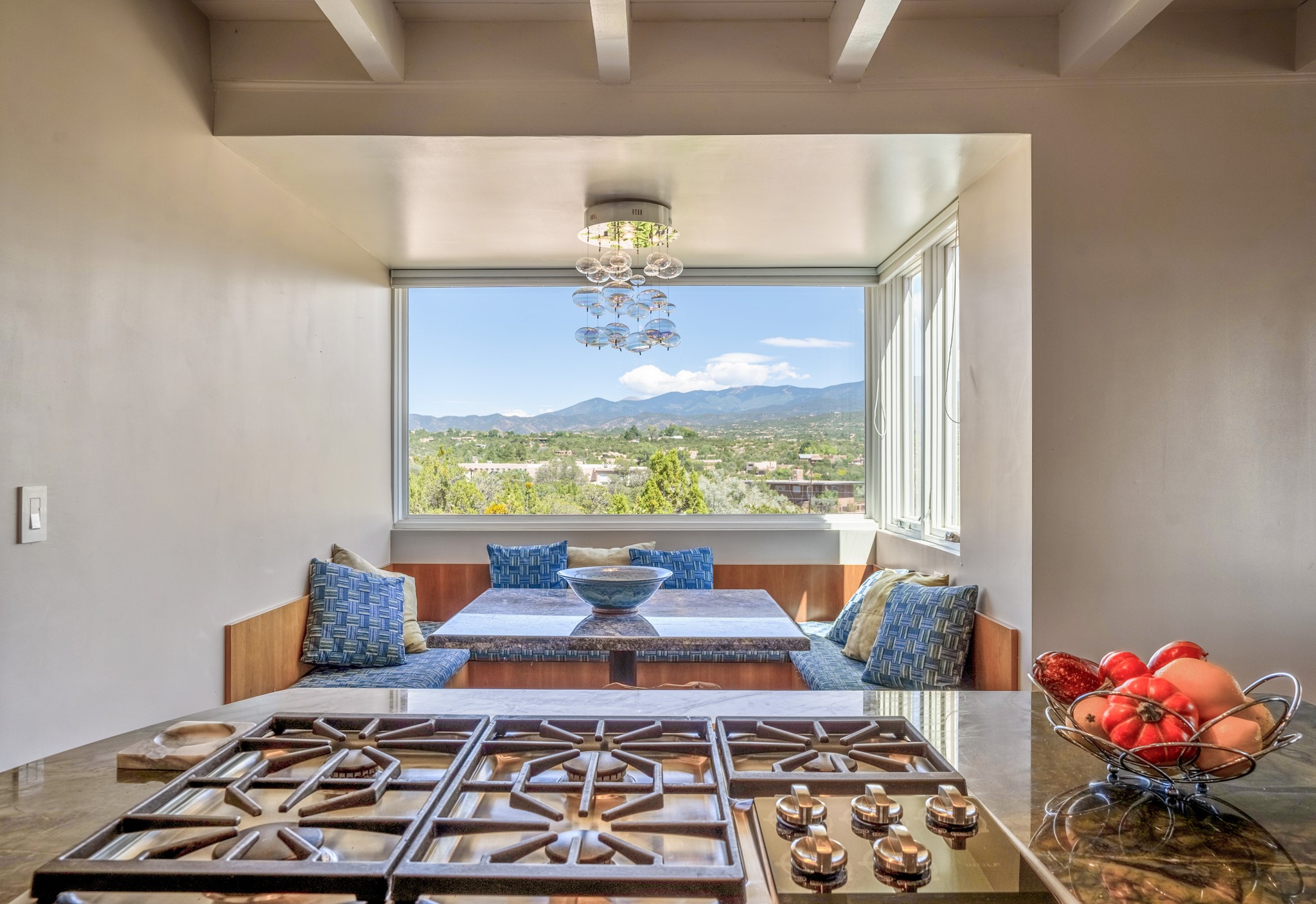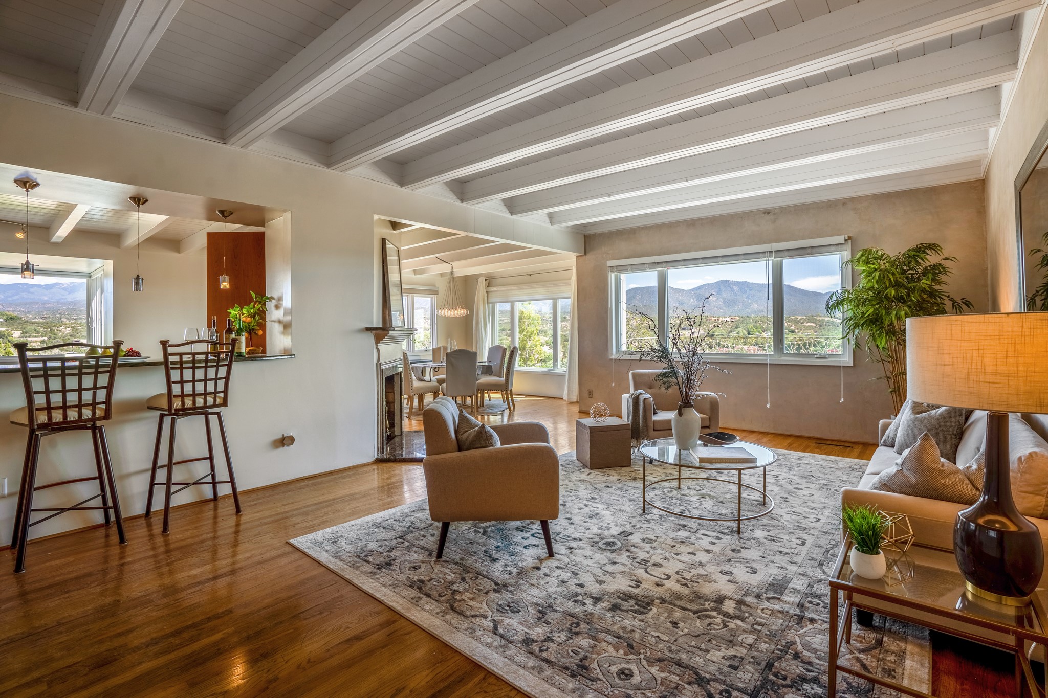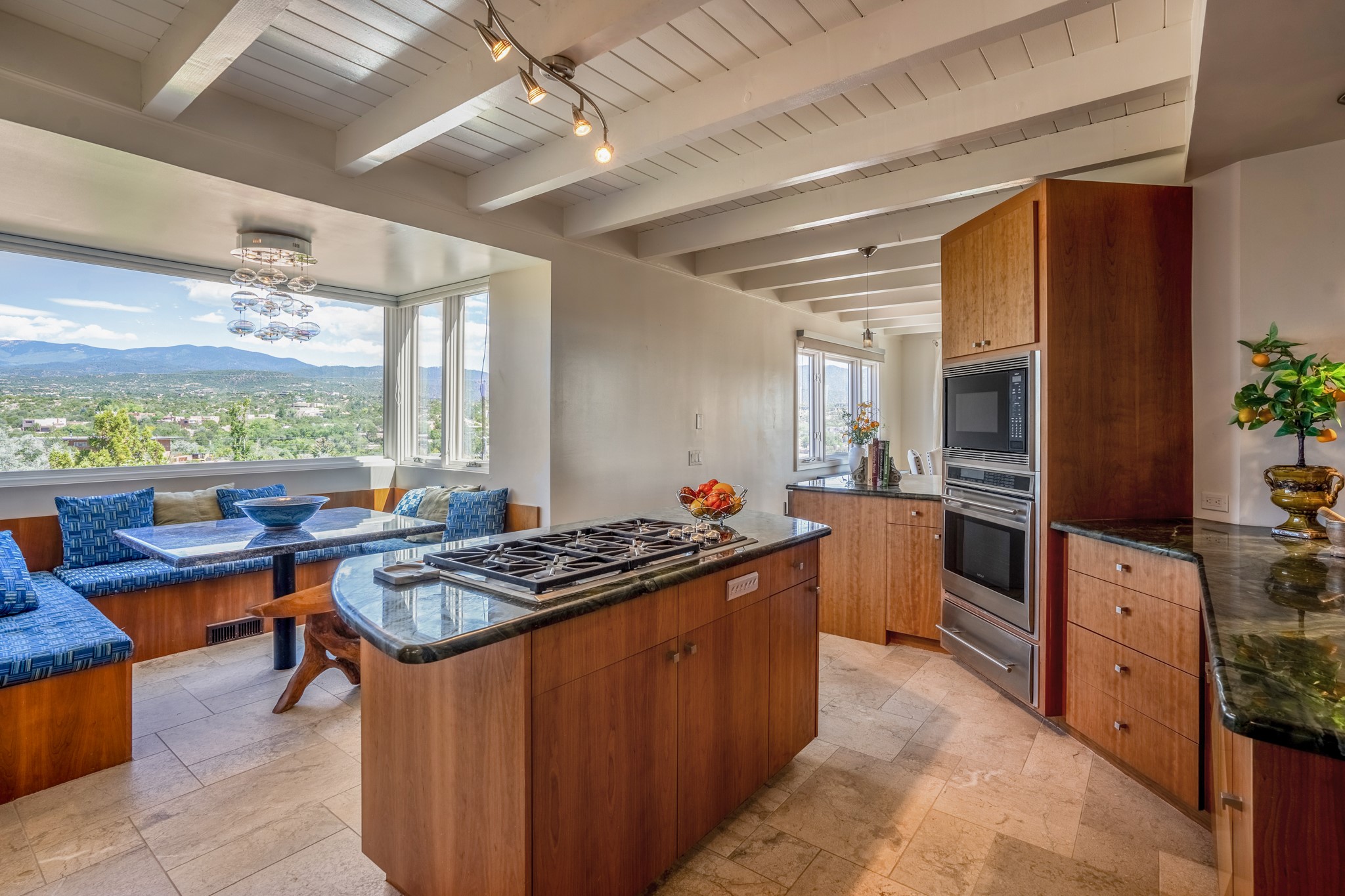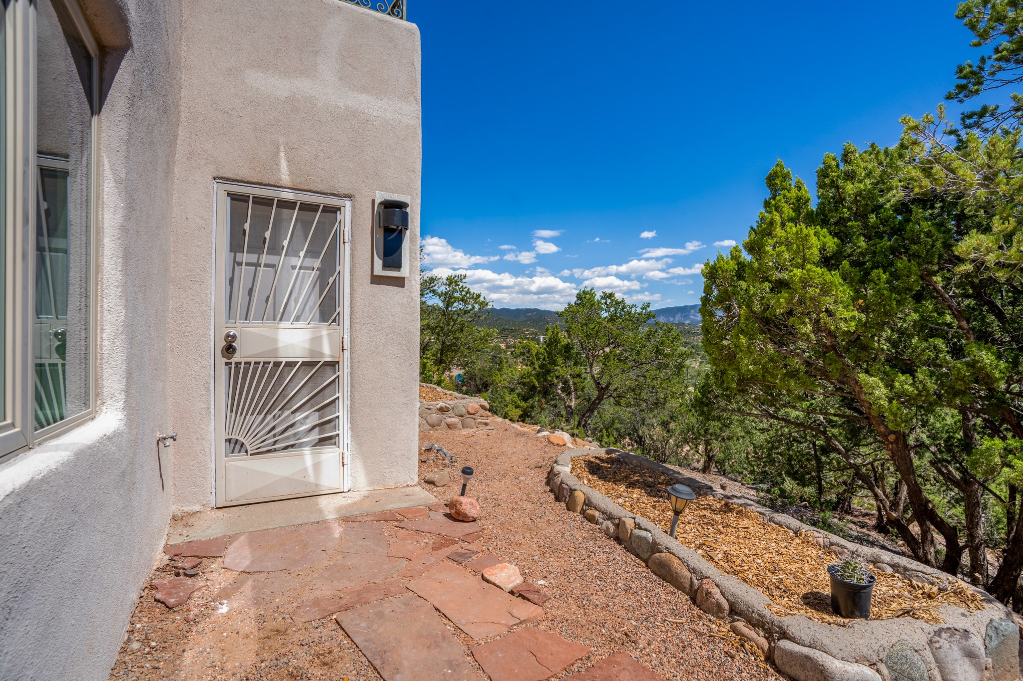 For Outstanding City and Mountain Views, discover the appeal of 783 Paseo de la Cuma, perched gracefully above the Santa Fe Plaza. From the moment you step inside, breathtaking vistas greet you in all directions. Gorgeous sunrises paint the sky every morning. Equally beautiful sunsets can be seen from the front entry. As you pass through the front gate, you'll find a private, spacious, walled courtyard and a lovely garden to enjoy Santa Fe's splendid climate. This charming mid-century home, built in 1960, features wood floors throughout the main level with three bedrooms, two updated bathrooms (including Smart toilet outlets), in just over 2,311 square feet. An open living and dining space blends seamlessly into the elegantly remodeled kitchen with custom Cherry and Maple cabinets and built-ins. The appliance package includes top-tier Sub-Zero Freezer and Refrigerator, Wolf gas range, convection oven, microwave and warming drawer, a Bosch dishwasher along with a two zone Sub-Zero wine refrigerator. A deck just off the dining/living area offers a great space to take in the city lights. A cozy banco adjacent to the kitchen welcomes you for morning coffee and surrounds you with views. In addition, a generous butlers pantry leads you into a sunlit studio/workshop/office, complete with a mini-split, providing comfort and versatility for both work and leisure. On the lower level, a separate guesthouse has its own private path and entry from the main-level parking area. This 1,475 square foot abode provides one bedroom and office, a tastefully updated 3/4 bath, a comfortable living and dining area with a well-appointed kitchenette. Additionally, there is a stackable washer and dryer, and tankless water heater. A workout/yoga room completes the package. The views from the picture windows are sure to delight your guests or tenants. This unit provides an excellent investment opportunity or a very appealing destination for friends and family, located just a short walk from the Plaza. Impeccable maintenance and thoughtful updates include a well-maintained roof, new Marvin casement and picture windows, and fresh stucco updates in 2023. Completing the picture is a two-car garage with mudroom and ample additional parking spaces... ideal for hosting gatherings with family and friends. This beautiful property is a short walk to Fort Marcy park with its community center, pickleball courts and the many festivals Santa Fe has to offer. Come and experience 783 Paseo de la Cuma...you won't want to miss it.