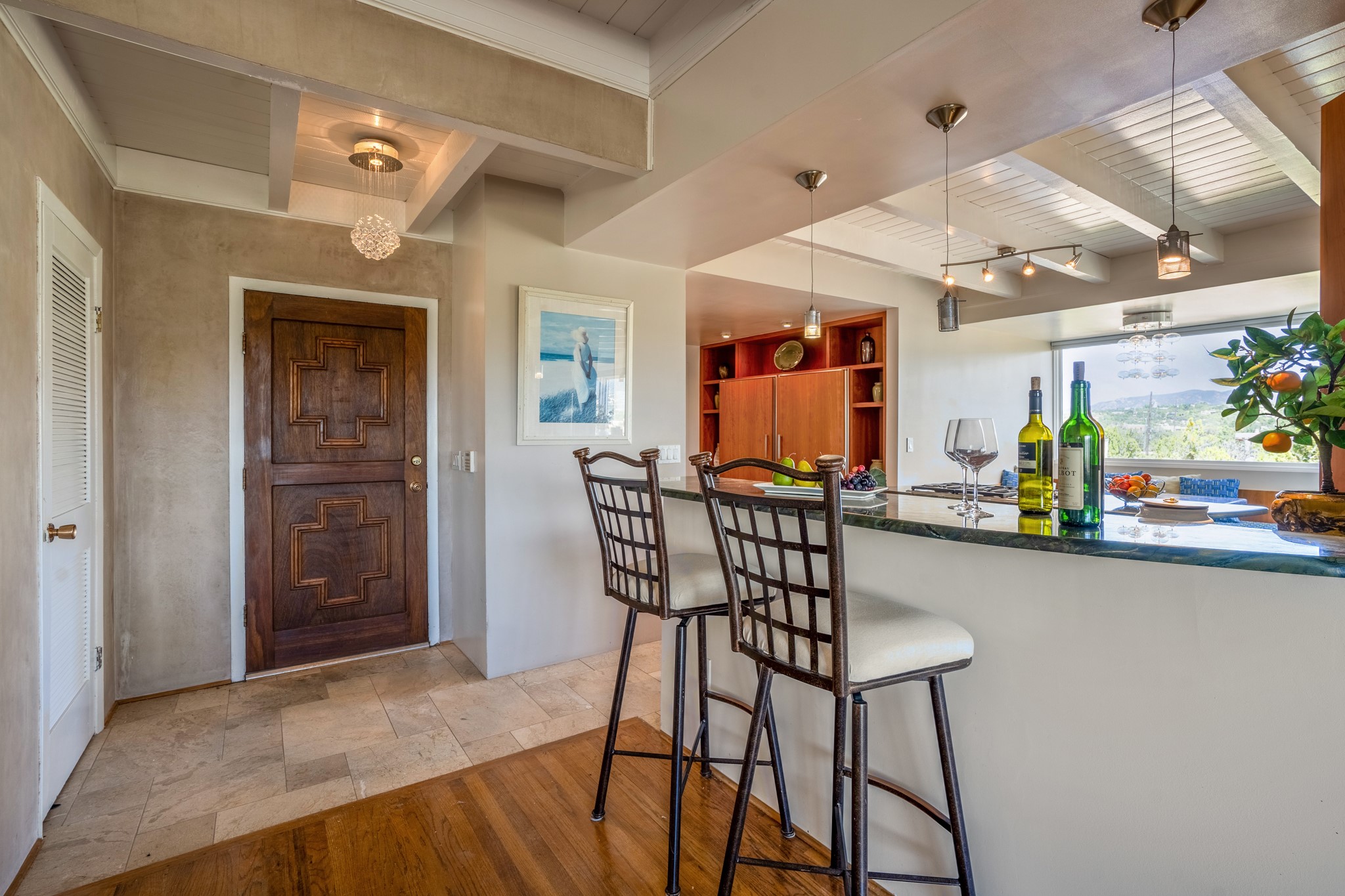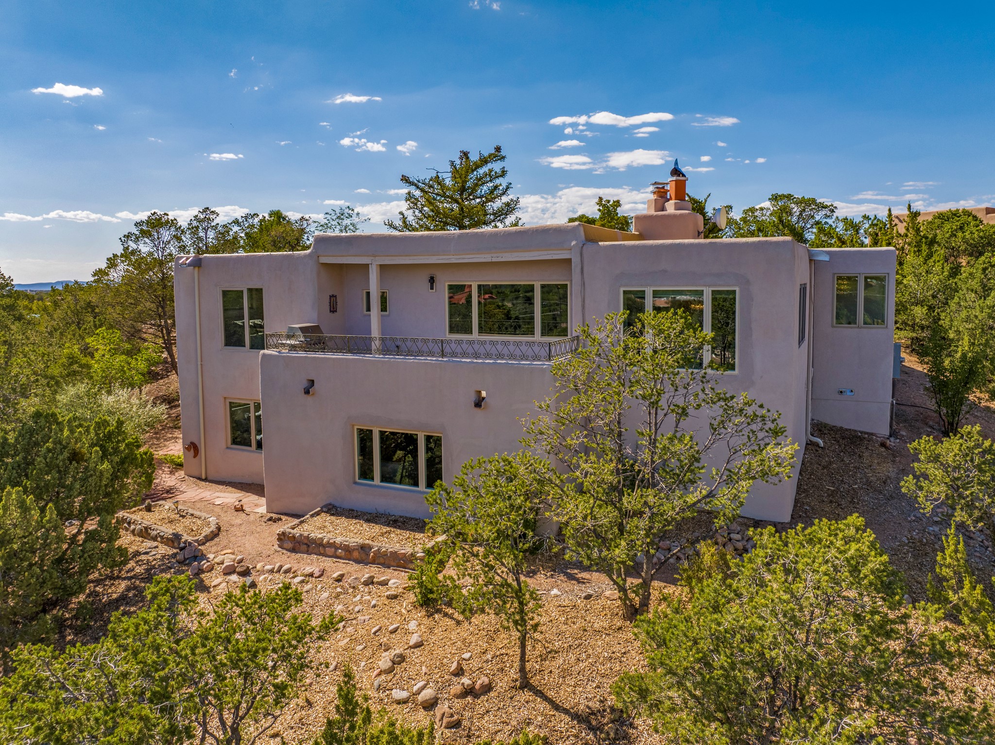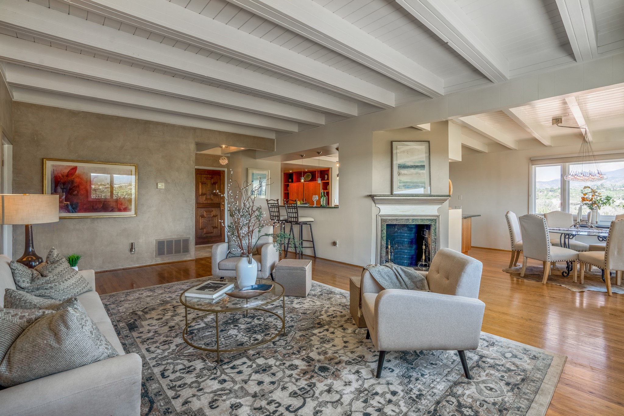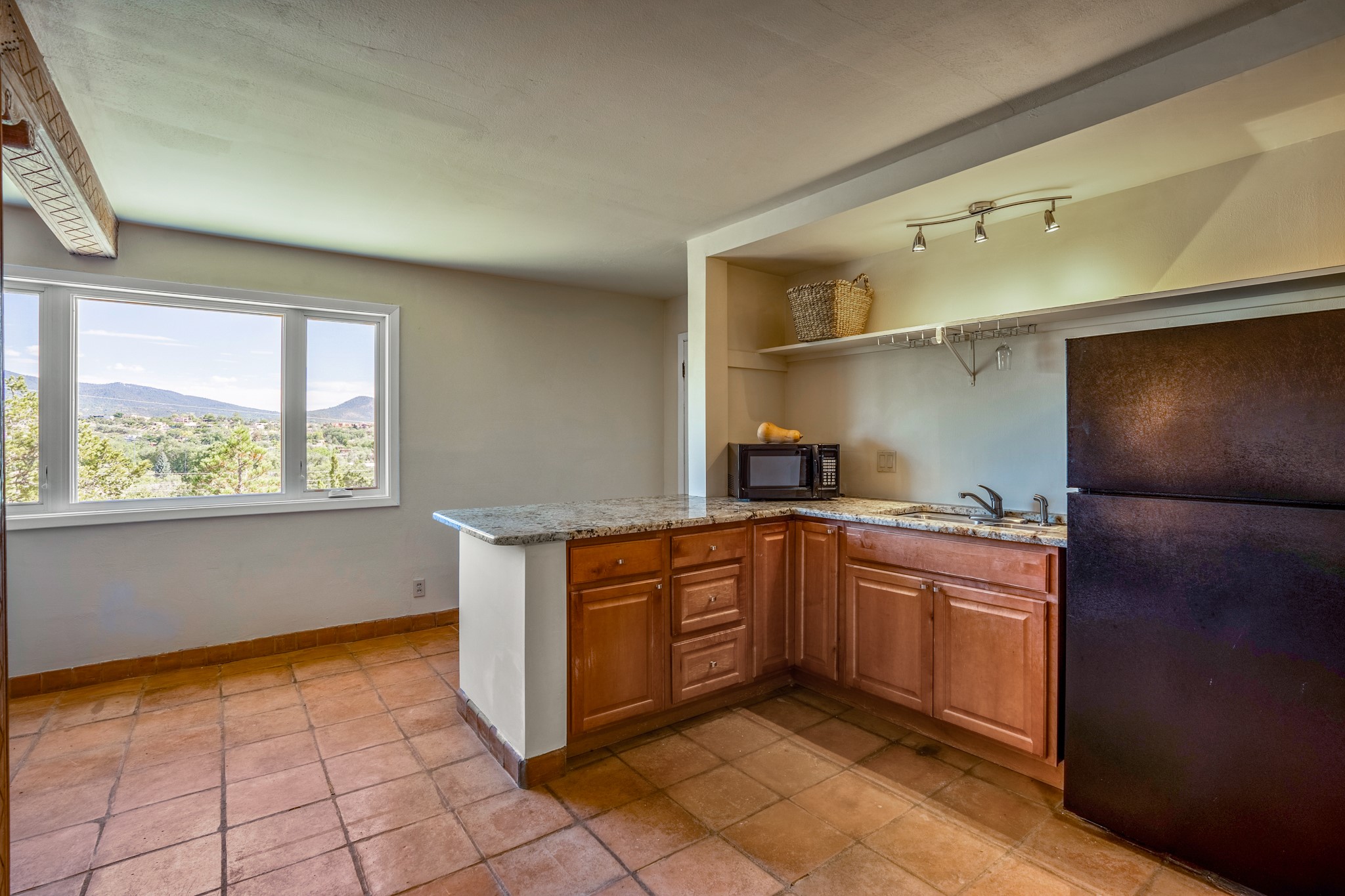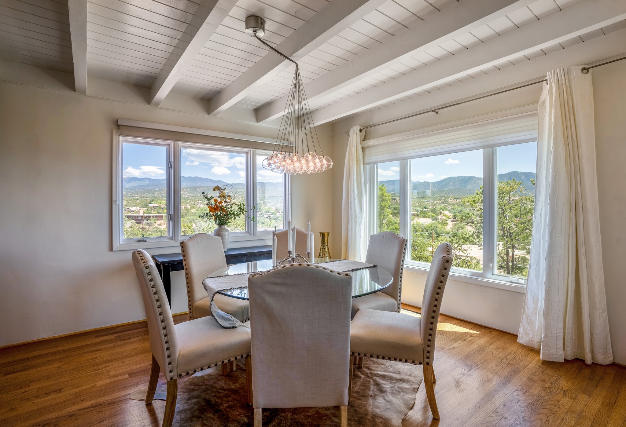 For Outstanding City and Mountain Views, discover the appeal of 783 Paseo de la Cuma, perched gracefully above the Santa Fe Plaza. From the moment you step inside, breathtaking vistas greet you in all directions. Gorgeous sunrises paint the sky every morning. Equally beautiful sunsets can be seen from the front entry. As you pass through the front gate, you'll find a private, spacious, walled courtyard and a lovely garden to enjoy Santa Fe's splendid climate. This charming mid-century home, built in 1960, features wood floors throughout the main level with three bedrooms, two updated bathrooms (including Smart toilet outlets), in just over 2,311 square feet. An open living and dining space blends seamlessly into the elegantly remodeled kitchen with custom Cherry and Maple cabinets and built-ins. The appliance package includes top-tier Sub-Zero Freezer and Refrigerator, Wolf gas range, convection oven, microwave and warming drawer, a Bosch dishwasher along with a two zone Sub-Zero wine refrigerator. A deck just off the dining/living area offers a great space to take in the city lights. A cozy banco adjacent to the kitchen welcomes you for morning coffee and surrounds you with views. In addition, a generous butlers pantry leads you into a sunlit studio/workshop/office, complete with a mini-split, providing comfort and versatility for both work and leisure. On the lower level, a separate guesthouse has its own private path and entry from the main-level parking area. This 1,475 square foot abode provides one bedroom and office, a tastefully updated 3/4 bath, a comfortable living and dining area with a well-appointed kitchenette. Additionally, there is a stackable washer and dryer, and tankless water heater. A workout/yoga room completes the package. The views from the picture windows are sure to delight your guests or tenants. This unit provides an excellent investment opportunity or a very appealing destination for friends and family, located just a short walk from the Plaza. Impeccable maintenance and thoughtful updates include a well-maintained roof, new Marvin casement and picture windows, and fresh stucco updates in 2023. Completing the picture is a two-car garage with mudroom and ample additional parking spaces... ideal for hosting gatherings with family and friends. This beautiful property is a short walk to Fort Marcy park with its community center, pickleball courts and the many festivals Santa Fe has to offer. Come and experience 783 Paseo de la Cuma...you won't want to miss it.