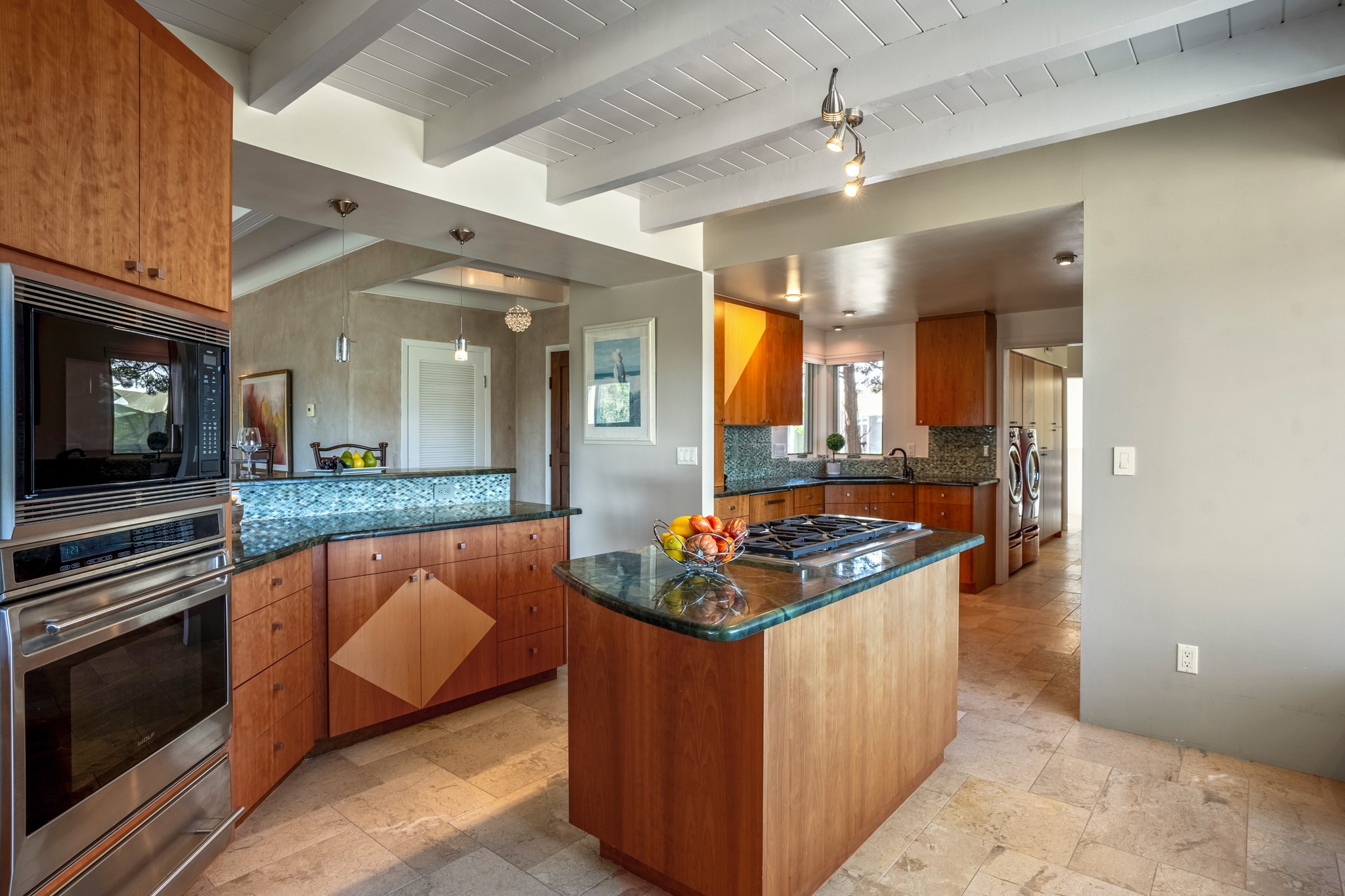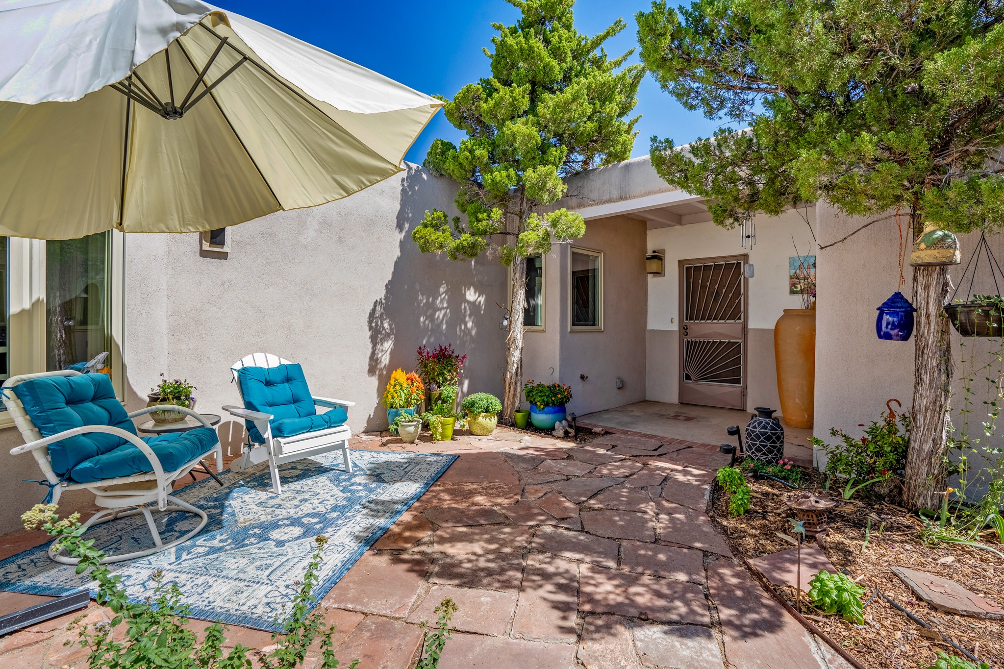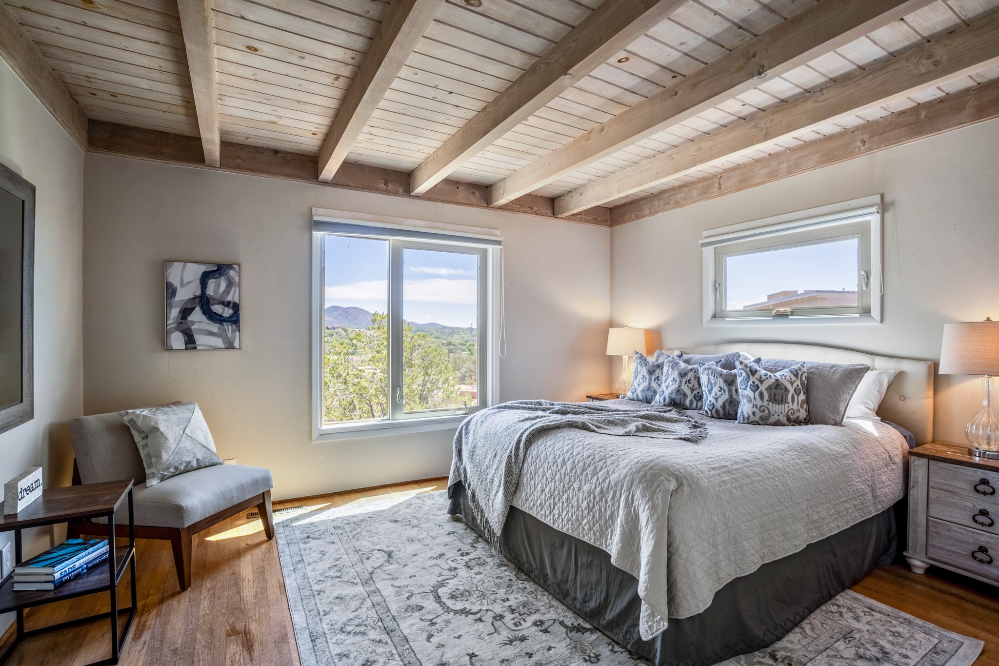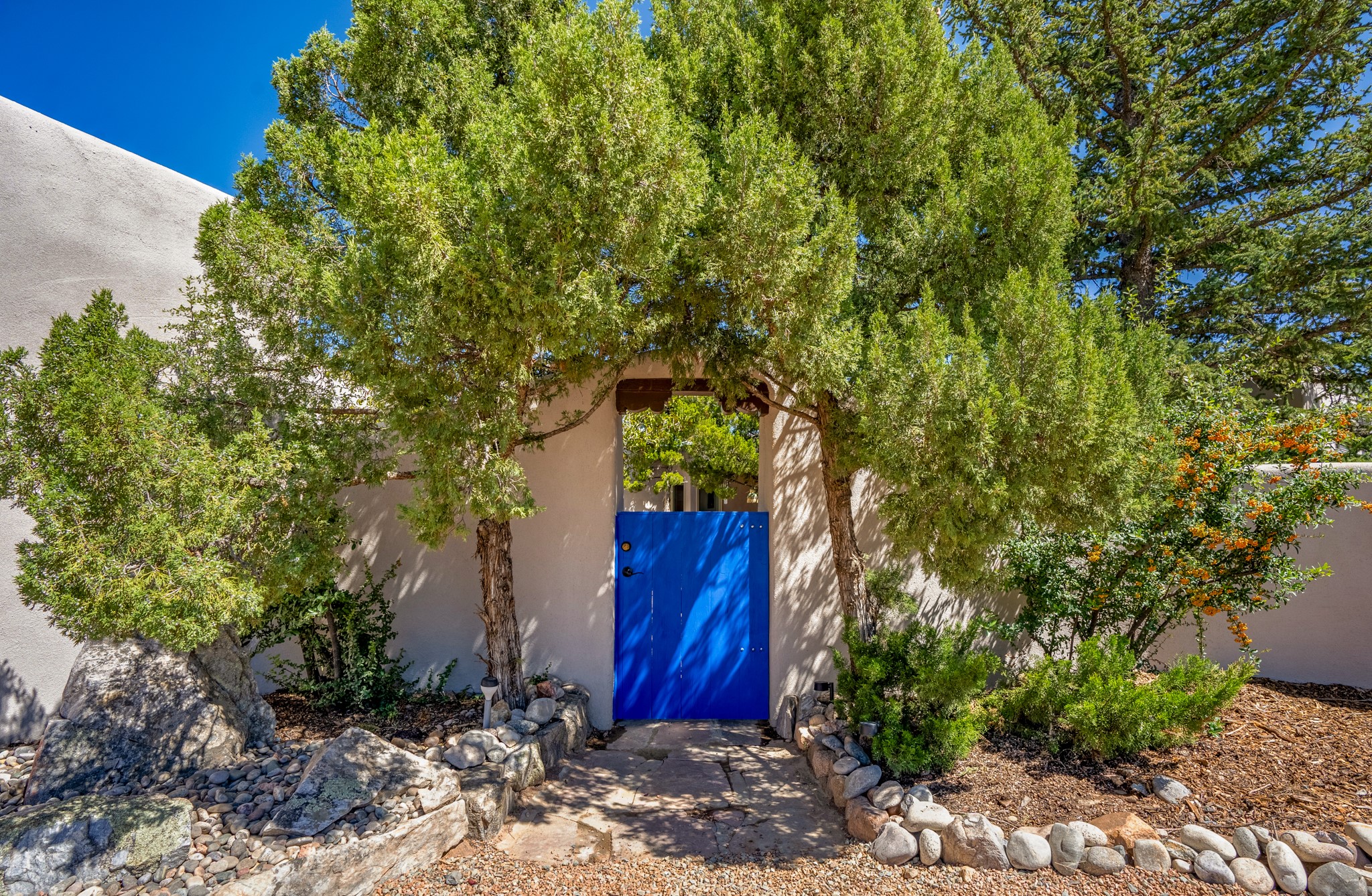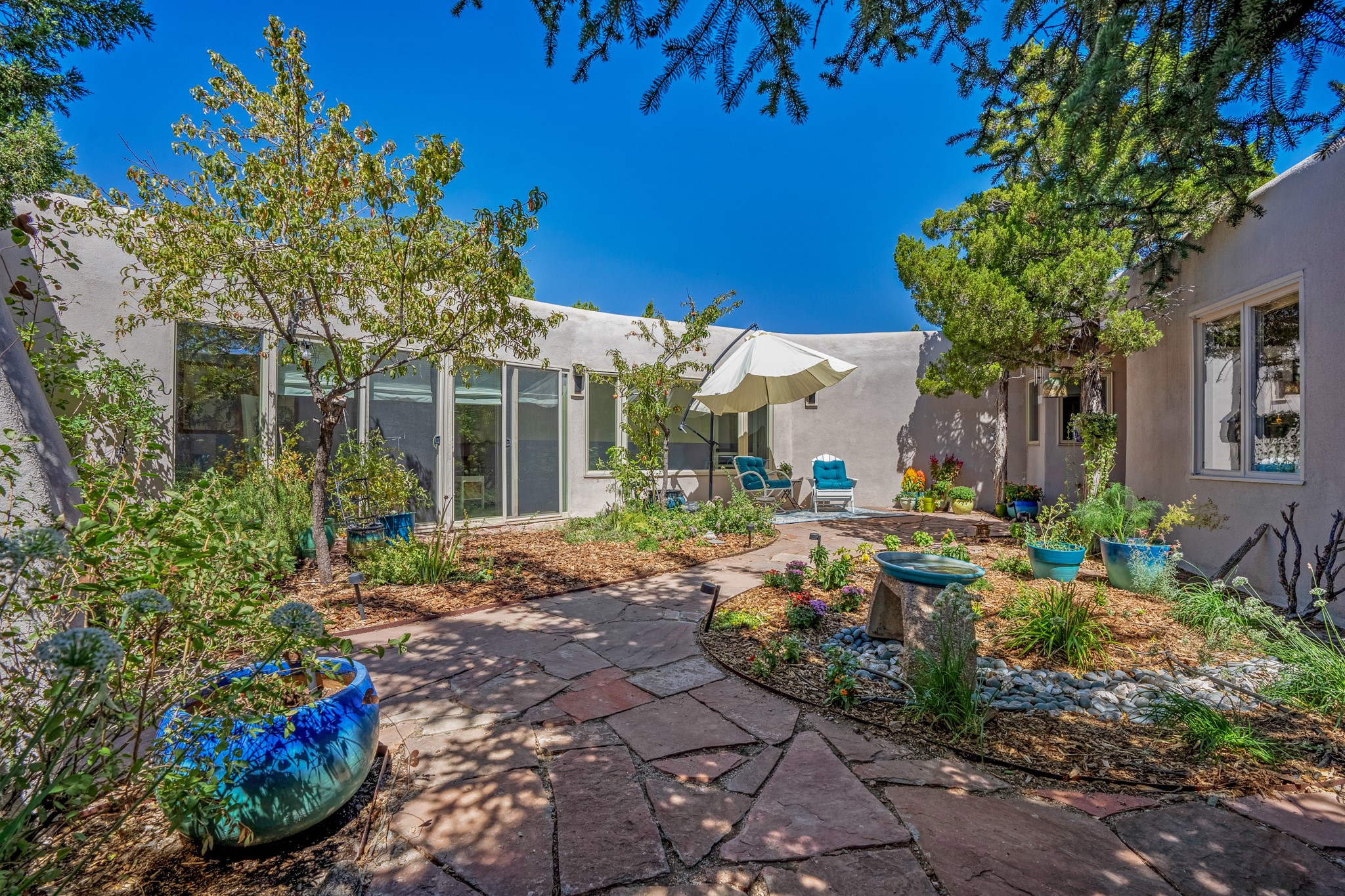 For Outstanding City and Mountain Views, discover the appeal of 783 Paseo de la Cuma, perched gracefully above the Santa Fe Plaza. From the moment you step inside, breathtaking vistas greet you in all directions. Gorgeous sunrises paint the sky every morning. Equally beautiful sunsets can be seen from the front entry. As you pass through the front gate, you'll find a private, spacious, walled courtyard and a lovely garden to enjoy Santa Fe's splendid climate. This charming mid-century home, built in 1960, features wood floors throughout the main level with three bedrooms, two updated bathrooms (including Smart toilet outlets), in just over 2,311 square feet. An open living and dining space blends seamlessly into the elegantly remodeled kitchen with custom Cherry and Maple cabinets and built-ins. The appliance package includes top-tier Sub-Zero Freezer and Refrigerator, Wolf gas range, convection oven, microwave and warming drawer, a Bosch dishwasher along with a two zone Sub-Zero wine refrigerator. A deck just off the dining/living area offers a great space to take in the city lights. A cozy banco adjacent to the kitchen welcomes you for morning coffee and surrounds you with views. In addition, a generous butlers pantry leads you into a sunlit studio/workshop/office, complete with a mini-split, providing comfort and versatility for both work and leisure. On the lower level, a separate guesthouse has its own private path and entry from the main-level parking area. This 1,475 square foot abode provides one bedroom and office, a tastefully updated 3/4 bath, a comfortable living and dining area with a well-appointed kitchenette. Additionally, there is a stackable washer and dryer, and tankless water heater. A workout/yoga room completes the package. The views from the picture windows are sure to delight your guests or tenants. This unit provides an excellent investment opportunity or a very appealing destination for friends and family, located just a short walk from the Plaza. Impeccable maintenance and thoughtful updates include a well-maintained roof, new Marvin casement and picture windows, and fresh stucco updates in 2023. Completing the picture is a two-car garage with mudroom and ample additional parking spaces... ideal for hosting gatherings with family and friends. This beautiful property is a short walk to Fort Marcy park with its community center, pickleball courts and the many festivals Santa Fe has to offer. Come and experience 783 Paseo de la Cuma...you won't want to miss it.