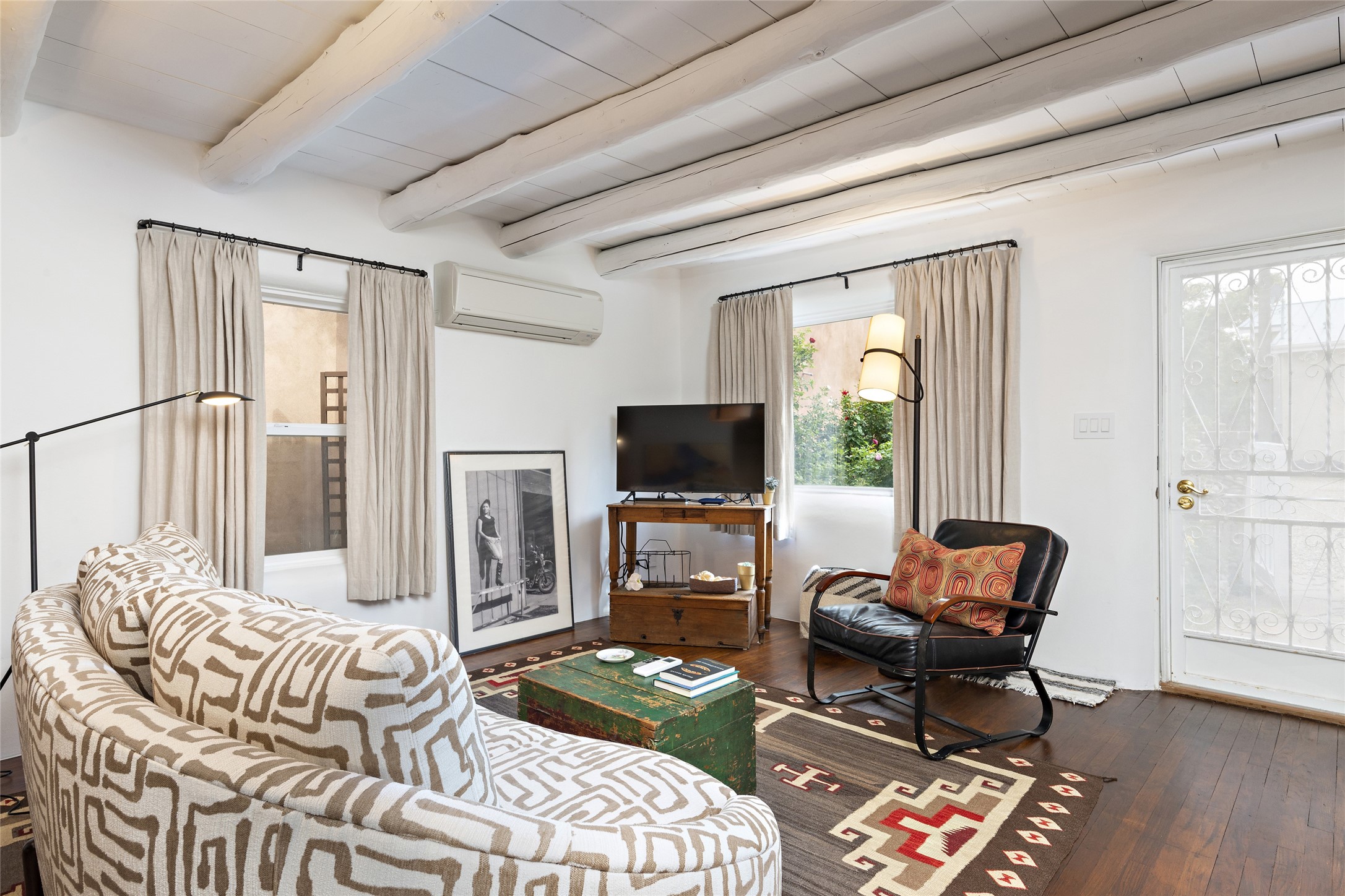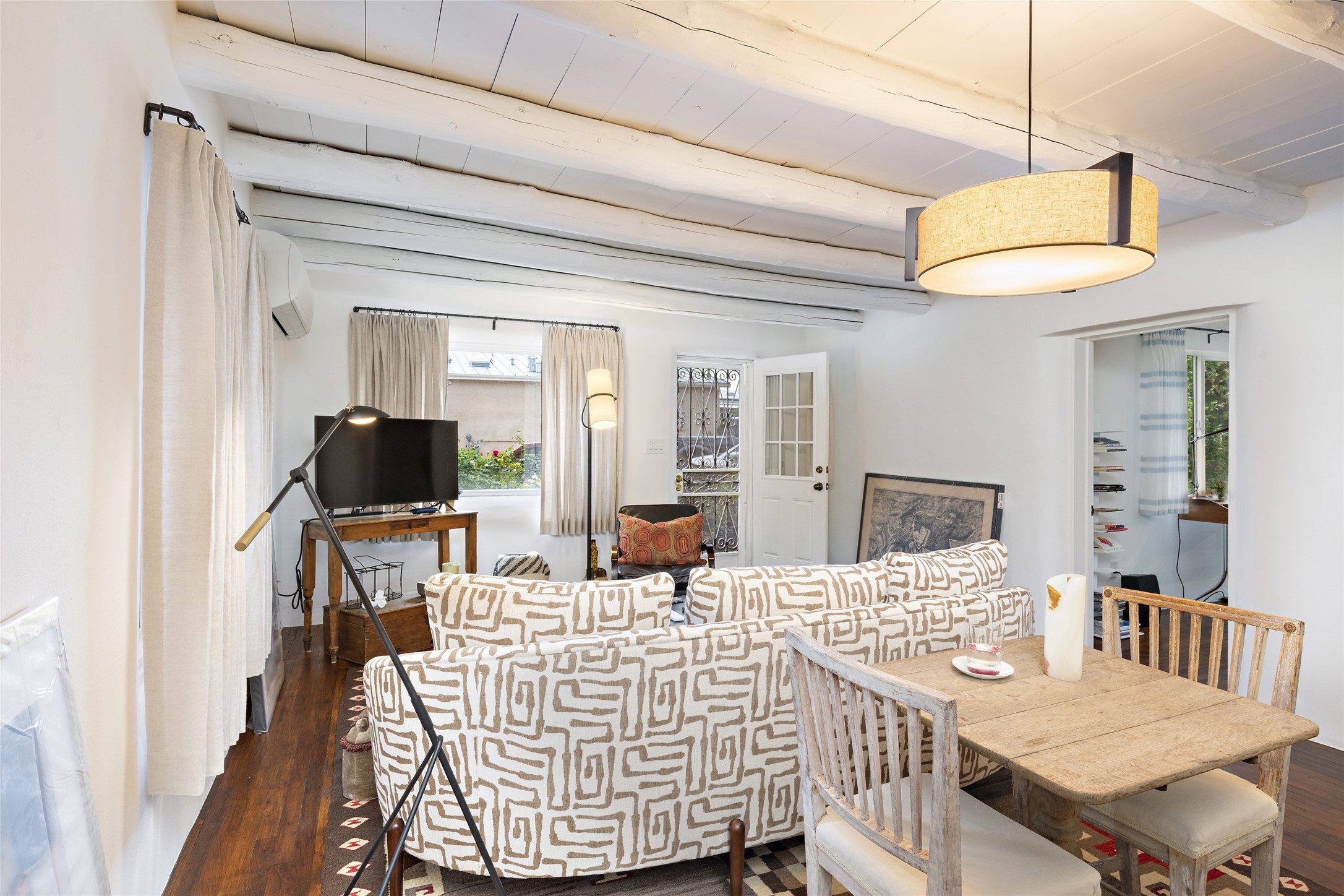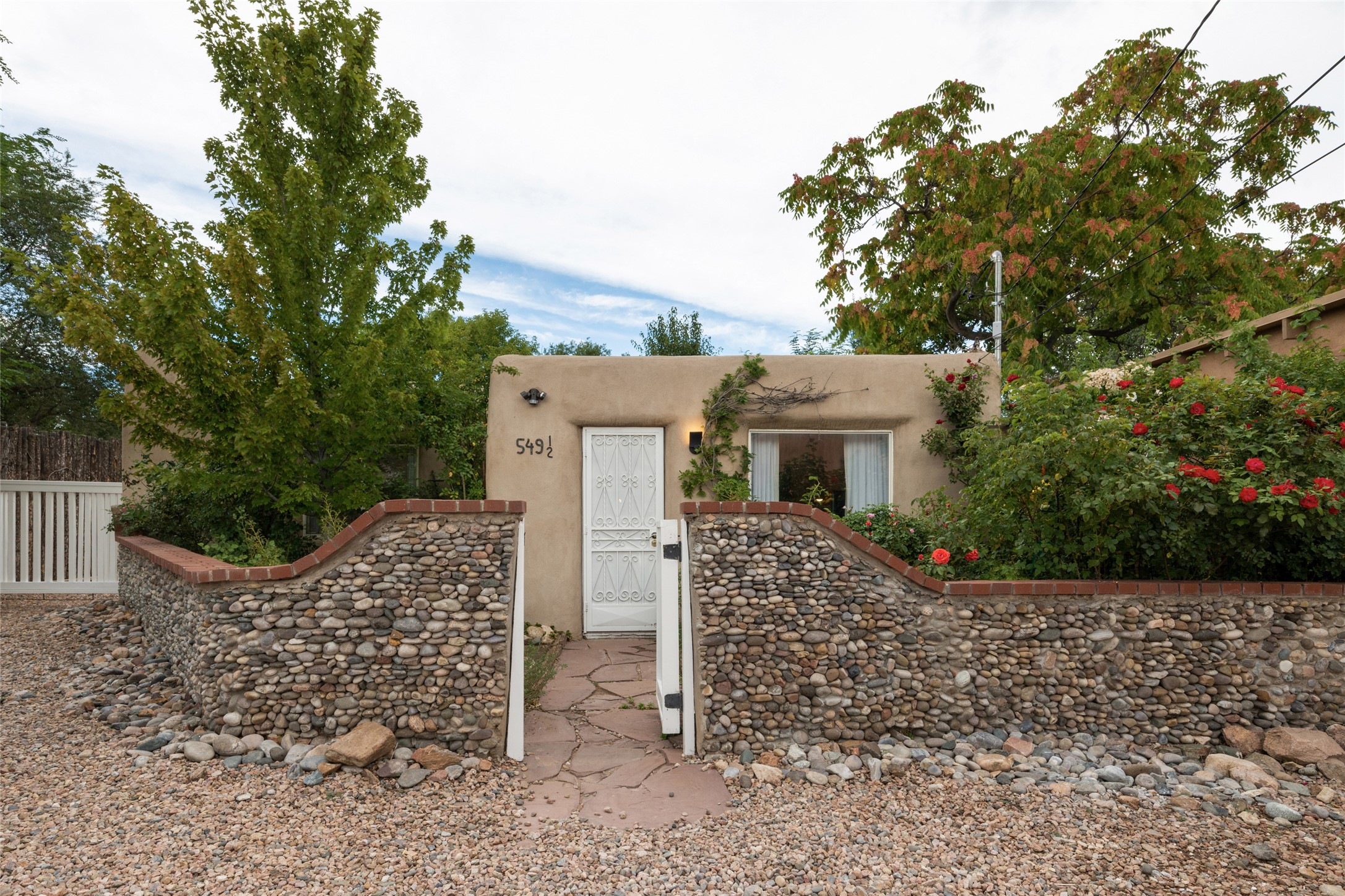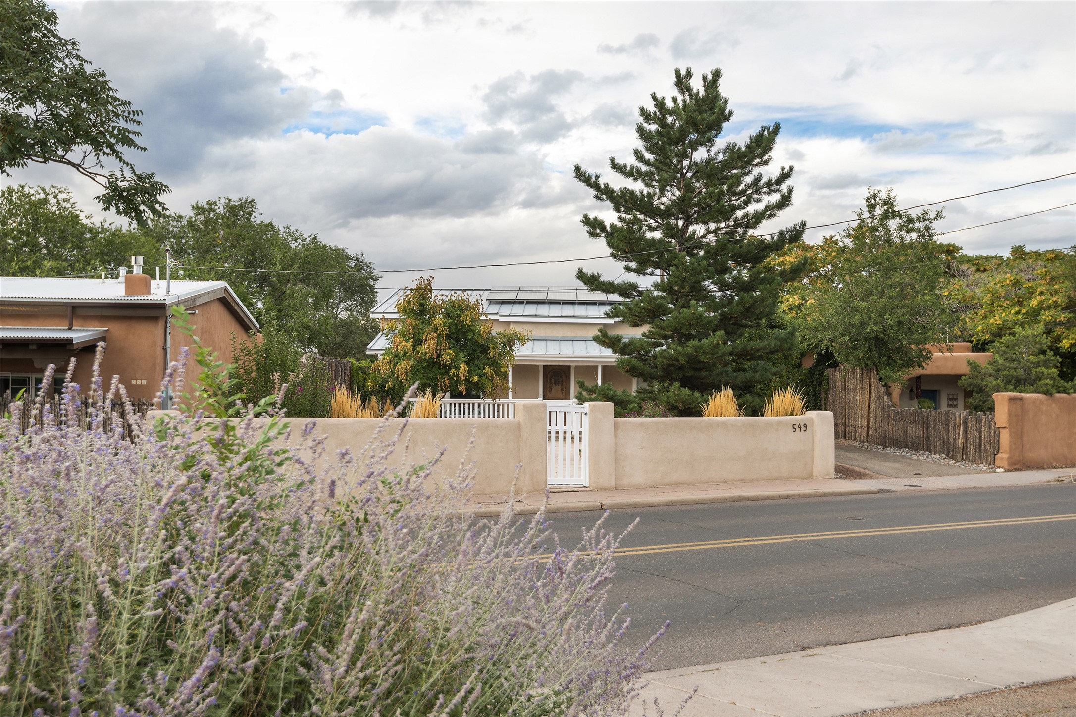This lovely compound with two adobe homes located in the historic Guadalupe District, offers a number of opportunities: live in one and rent the other or use it as a guest house or an office/studio. The Northern NM style double adobe main residence was originally built in the late 1800s. Since 2010, the main house has been restored to its original beauty and the electrical, heating and plumbing systems have been updated. A nice-sized yard with xeriscaping, mature trees and portal are perfect for outdoor gatherings. The living room is open to the formal dining area with lovely wood and glass cabinets in between. The kitchen is open and inviting with modern appliances and plenty of storage. Nicely separated from the common rooms, the primary bedroom has a dressing room, closet and three quarter bath. There is a full bath in between the primary bedroom and the second bedroom. The 2 bedroom adobe guesthouse has been extensively updated since 2020 including hardwood floors, a kiva fireplace in one bedroom, a full bath, laundry room and kitchen. These 2 classic homes are located within the historic community surrounding Our Lady Of Guadalupe Santuario in the heart of Santa Fe.