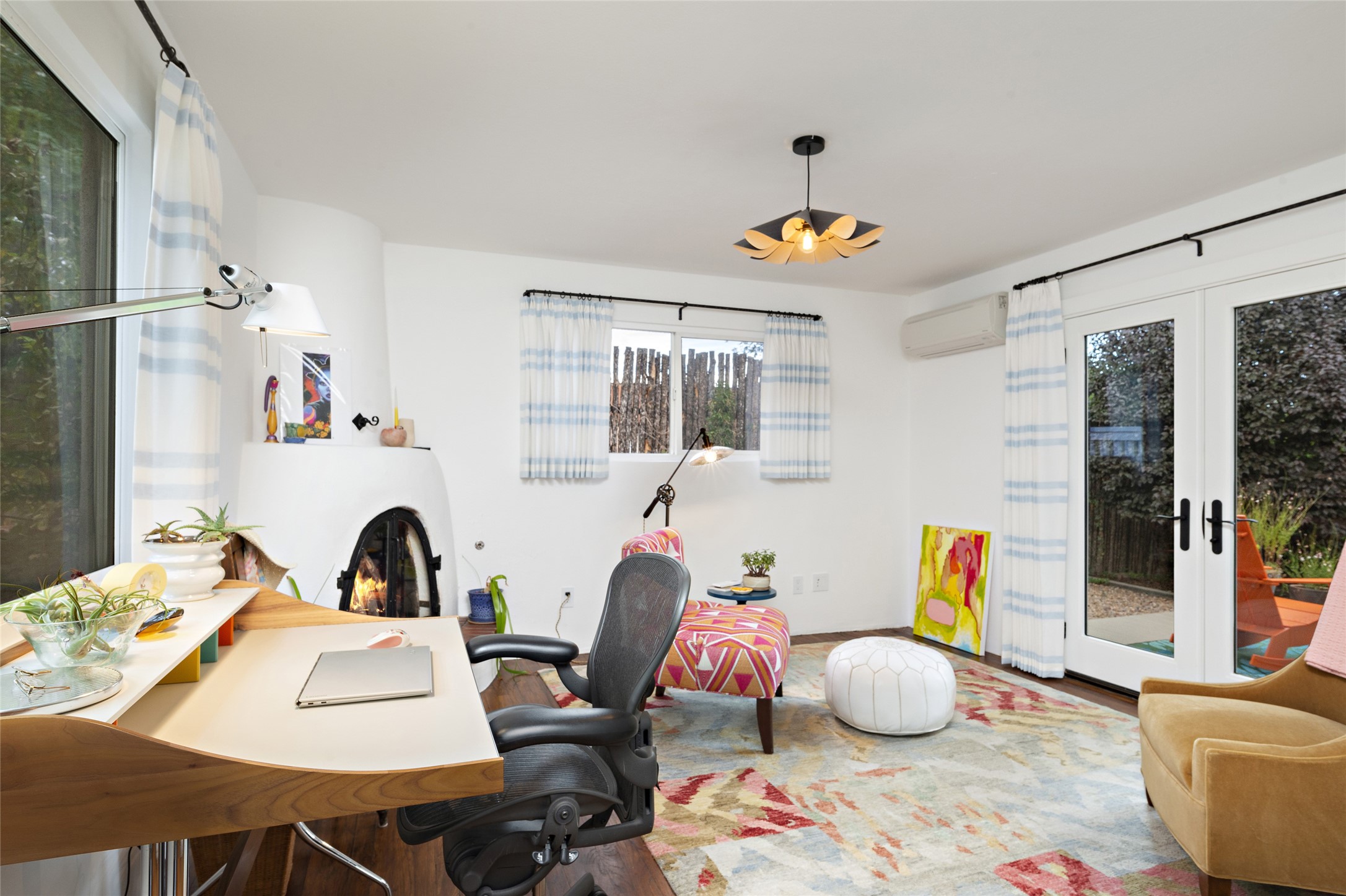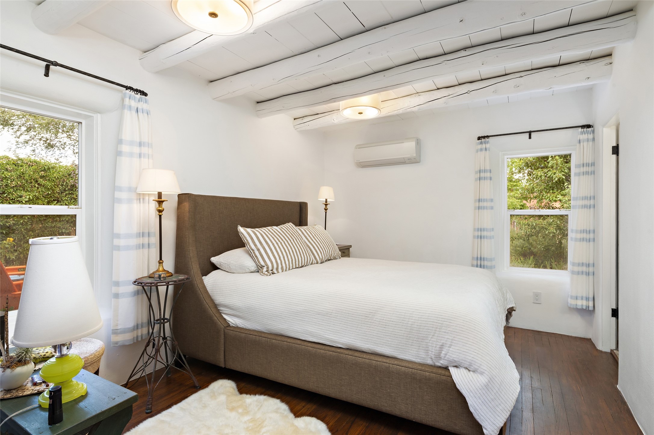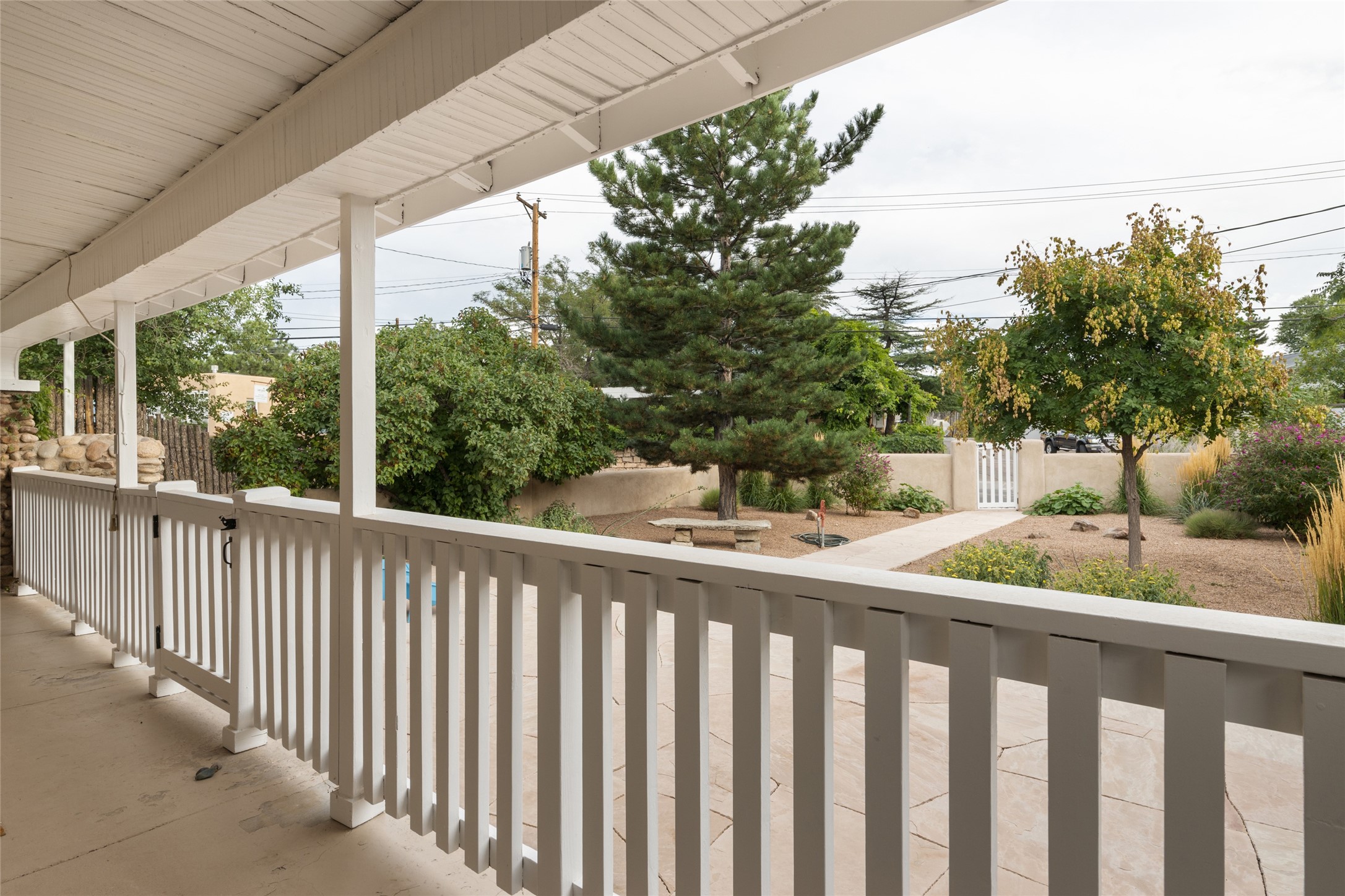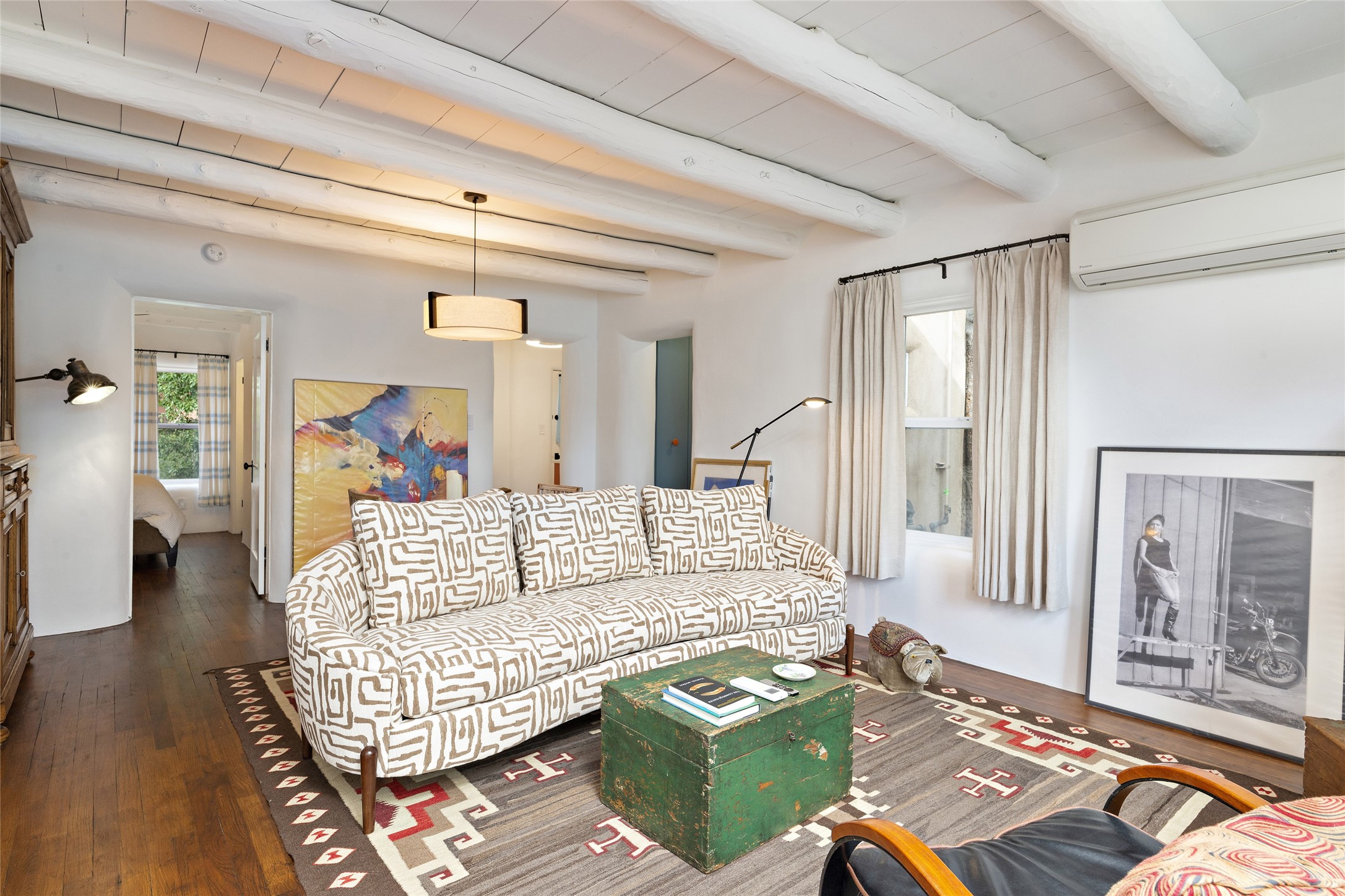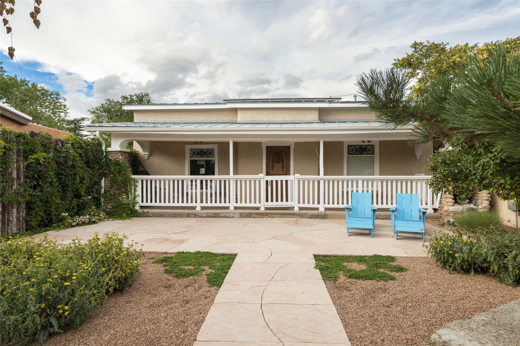 This lovely compound with two adobe homes located in the historic Guadalupe District, offers a number of opportunities: live in one and rent the other or use it as a guest house or an office/studio. The Northern NM style double adobe main residence was originally built in the late 1800s. Since 2010, the main house has been restored to its original beauty and the electrical, heating and plumbing systems have been updated. A nice-sized yard with xeriscaping, mature trees and portal are perfect for outdoor gatherings. The living room is open to the formal dining area with lovely wood and glass cabinets in between. The kitchen is open and inviting with modern appliances and plenty of storage. Nicely separated from the common rooms, the primary bedroom has a dressing room, closet and three quarter bath. There is a full bath in between the primary bedroom and the second bedroom. The 2 bedroom adobe guesthouse has been extensively updated since 2020 including hardwood floors, a kiva fireplace in one bedroom, a full bath, laundry room and kitchen. These 2 classic homes are located within the historic community surrounding Our Lady Of Guadalupe Santuario in the heart of Santa Fe.