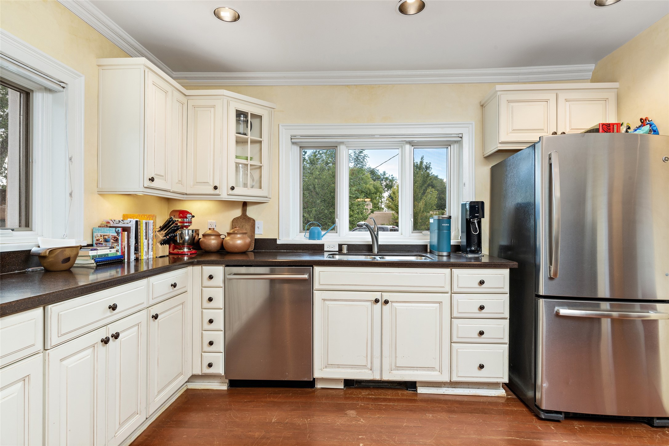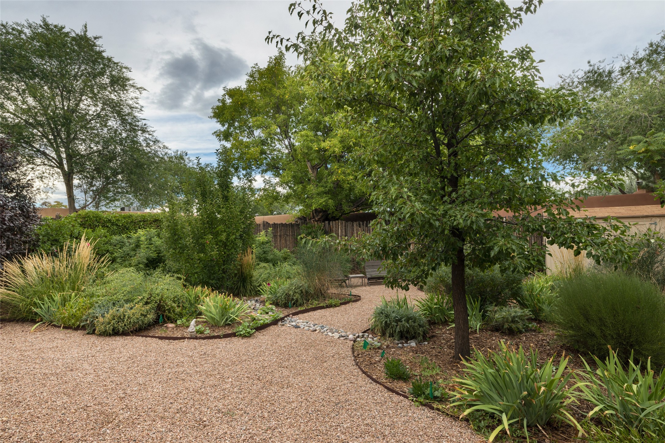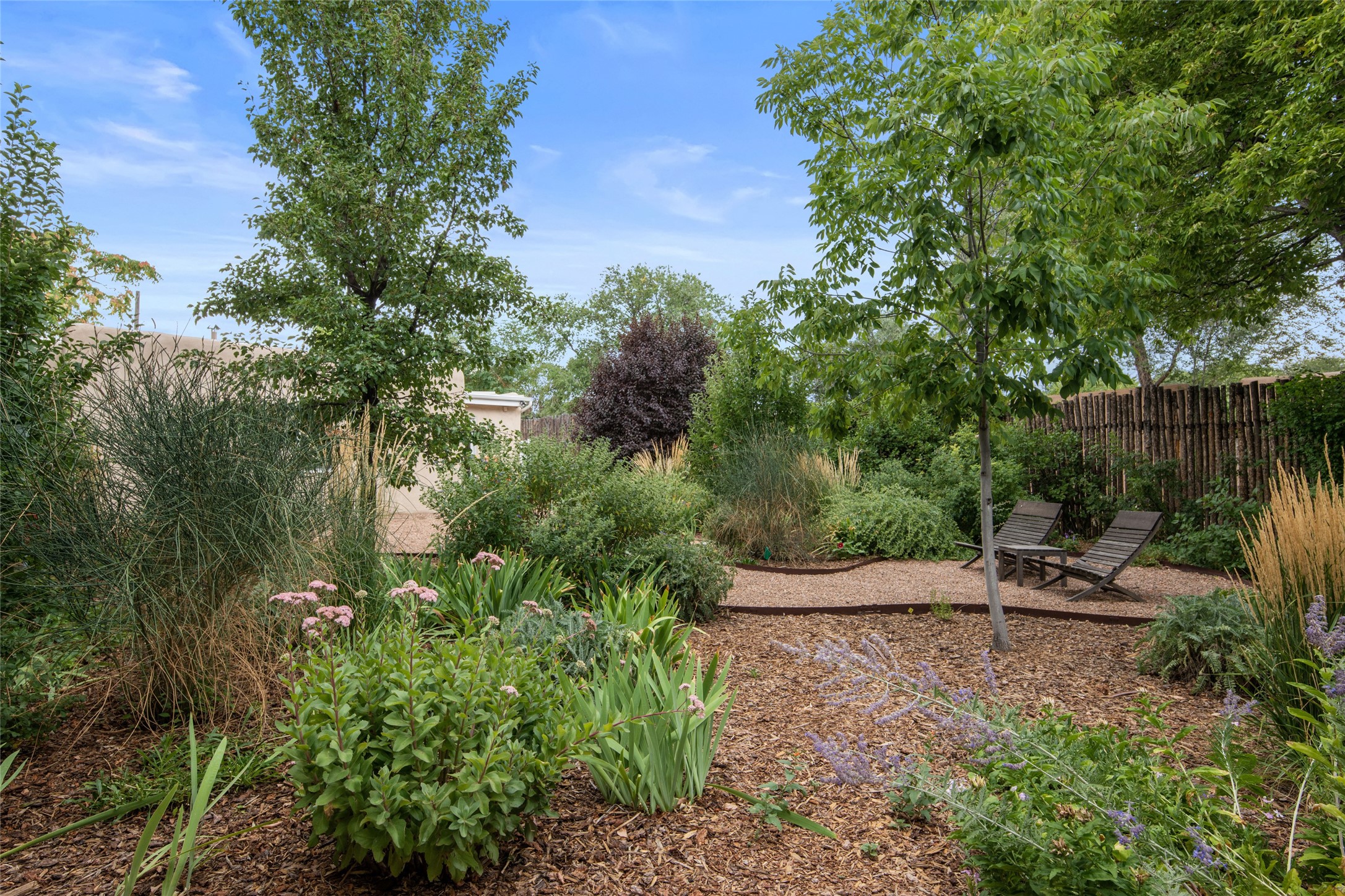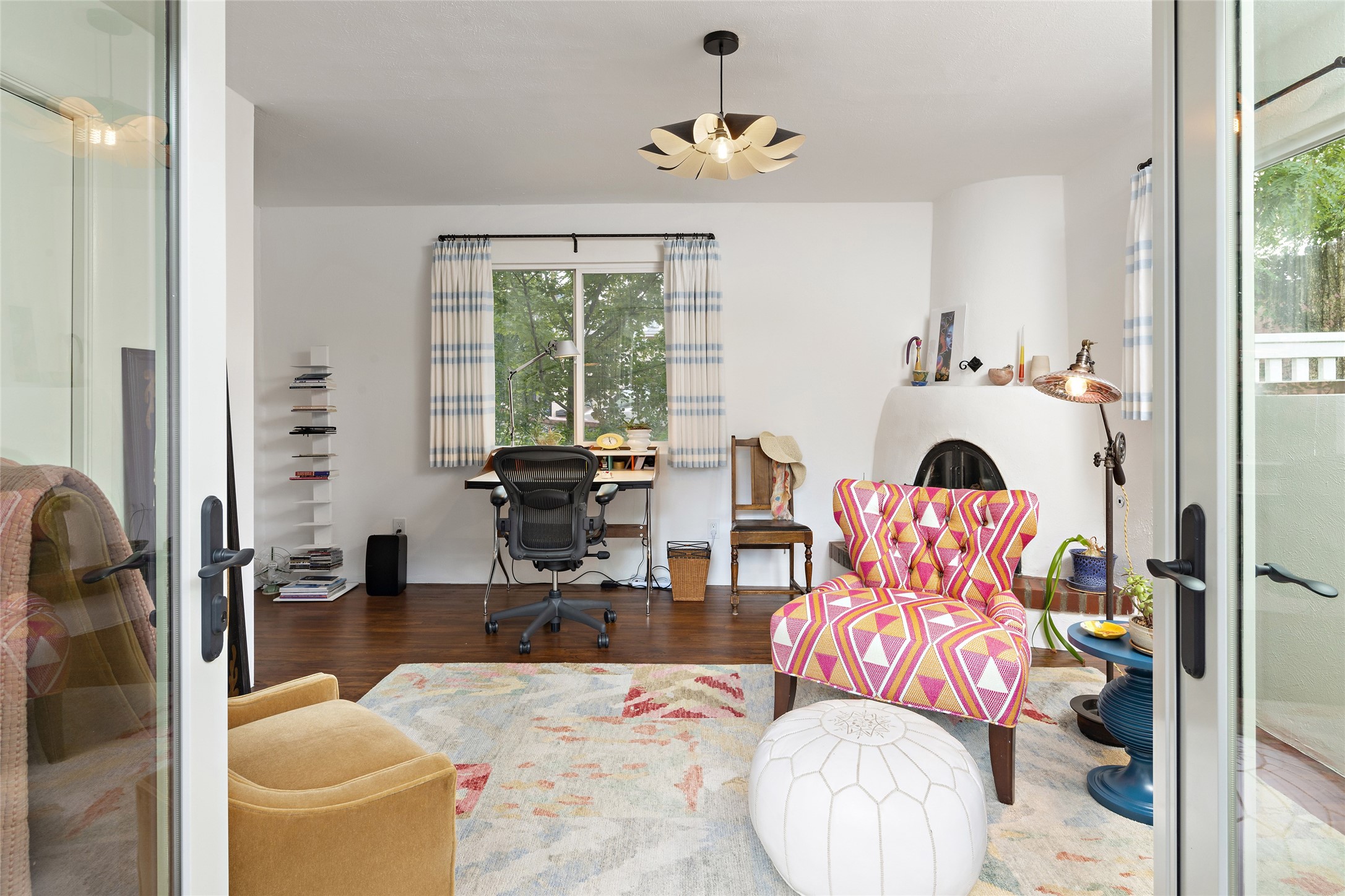 This lovely compound with two adobe homes located in the historic Guadalupe District, offers a number of opportunities: live in one and rent the other or use it as a guest house or an office/studio. The Northern NM style double adobe main residence was originally built in the late 1800s. Since 2010, the main house has been restored to its original beauty and the electrical, heating and plumbing systems have been updated. A nice-sized yard with xeriscaping, mature trees and portal are perfect for outdoor gatherings. The living room is open to the formal dining area with lovely wood and glass cabinets in between. The kitchen is open and inviting with modern appliances and plenty of storage. Nicely separated from the common rooms, the primary bedroom has a dressing room, closet and three quarter bath. There is a full bath in between the primary bedroom and the second bedroom. The 2 bedroom adobe guesthouse has been extensively updated since 2020 including hardwood floors, a kiva fireplace in one bedroom, a full bath, laundry room and kitchen. These 2 classic homes are located within the historic community surrounding Our Lady Of Guadalupe Santuario in the heart of Santa Fe.