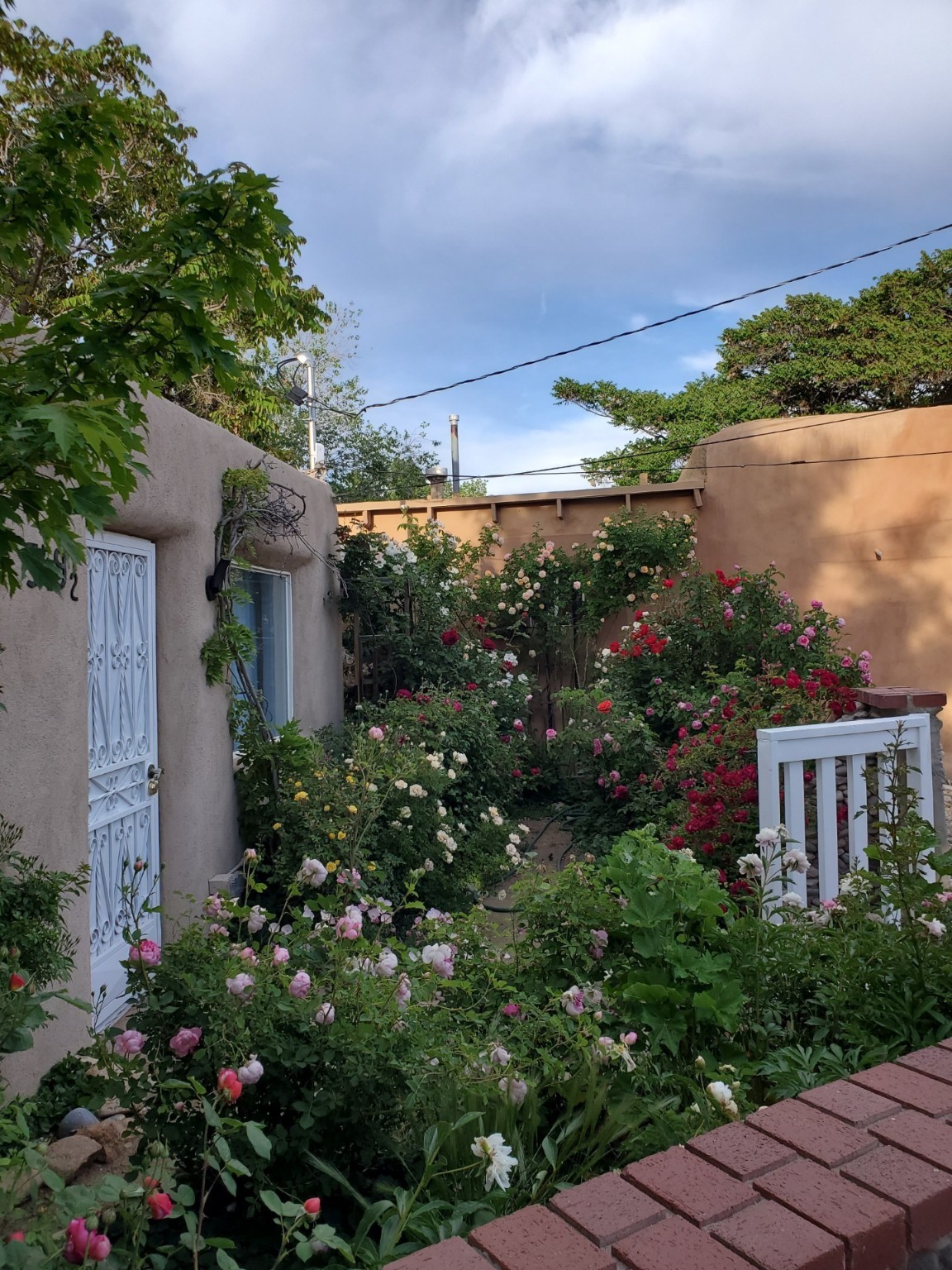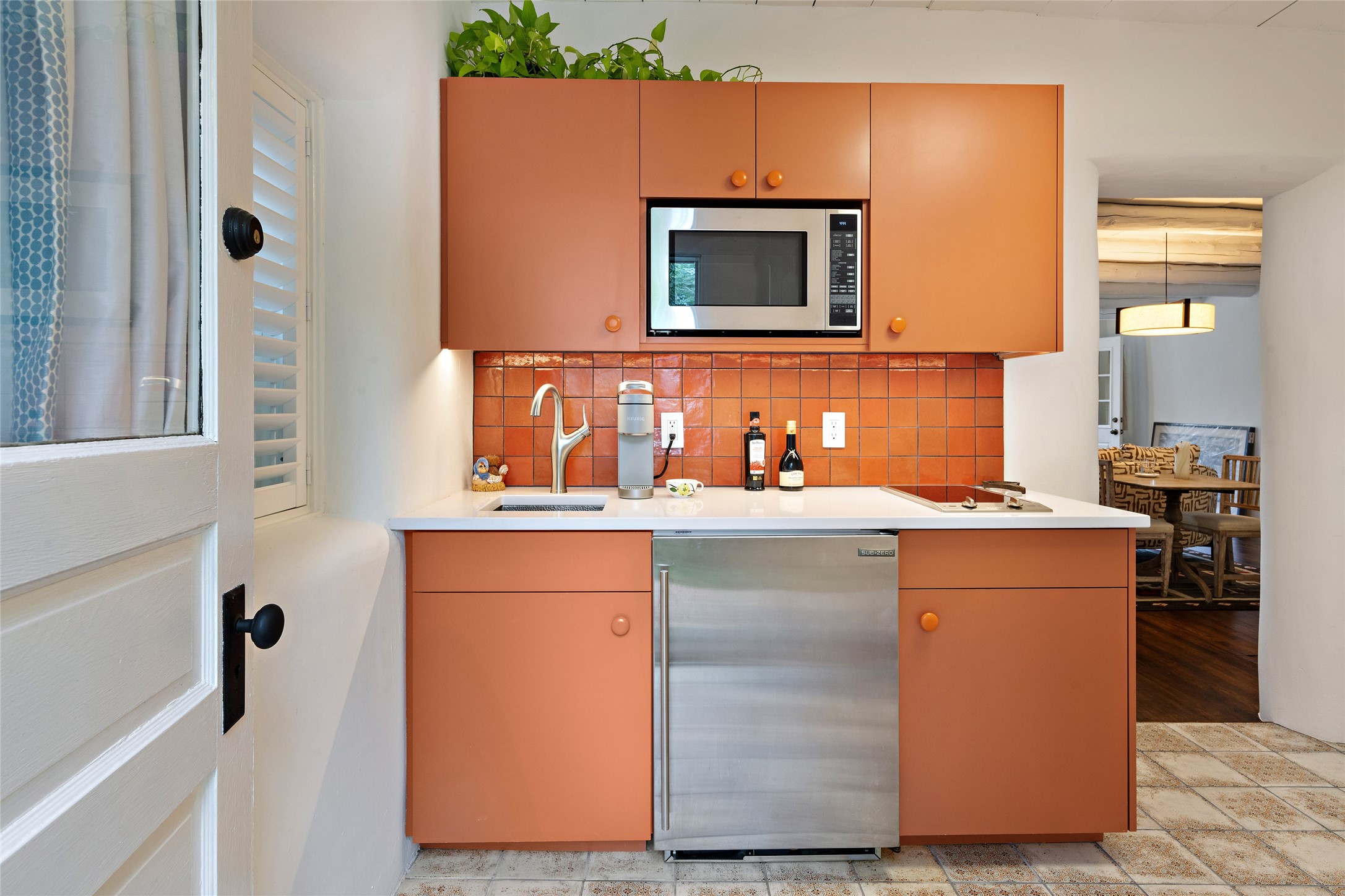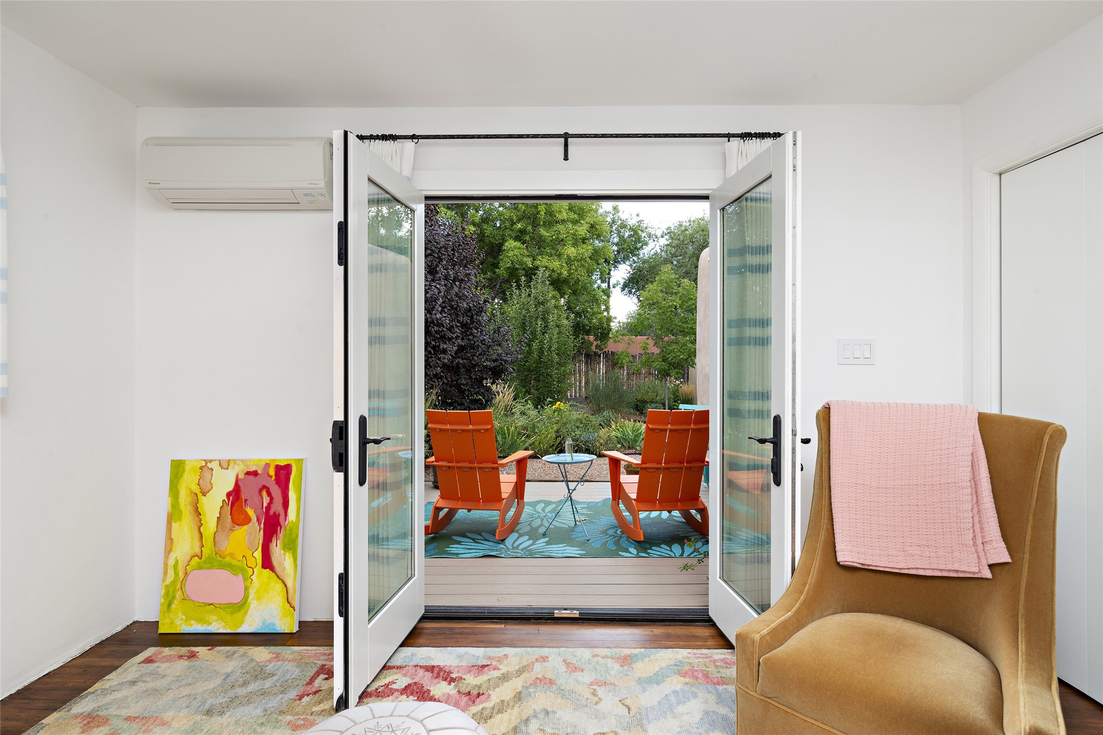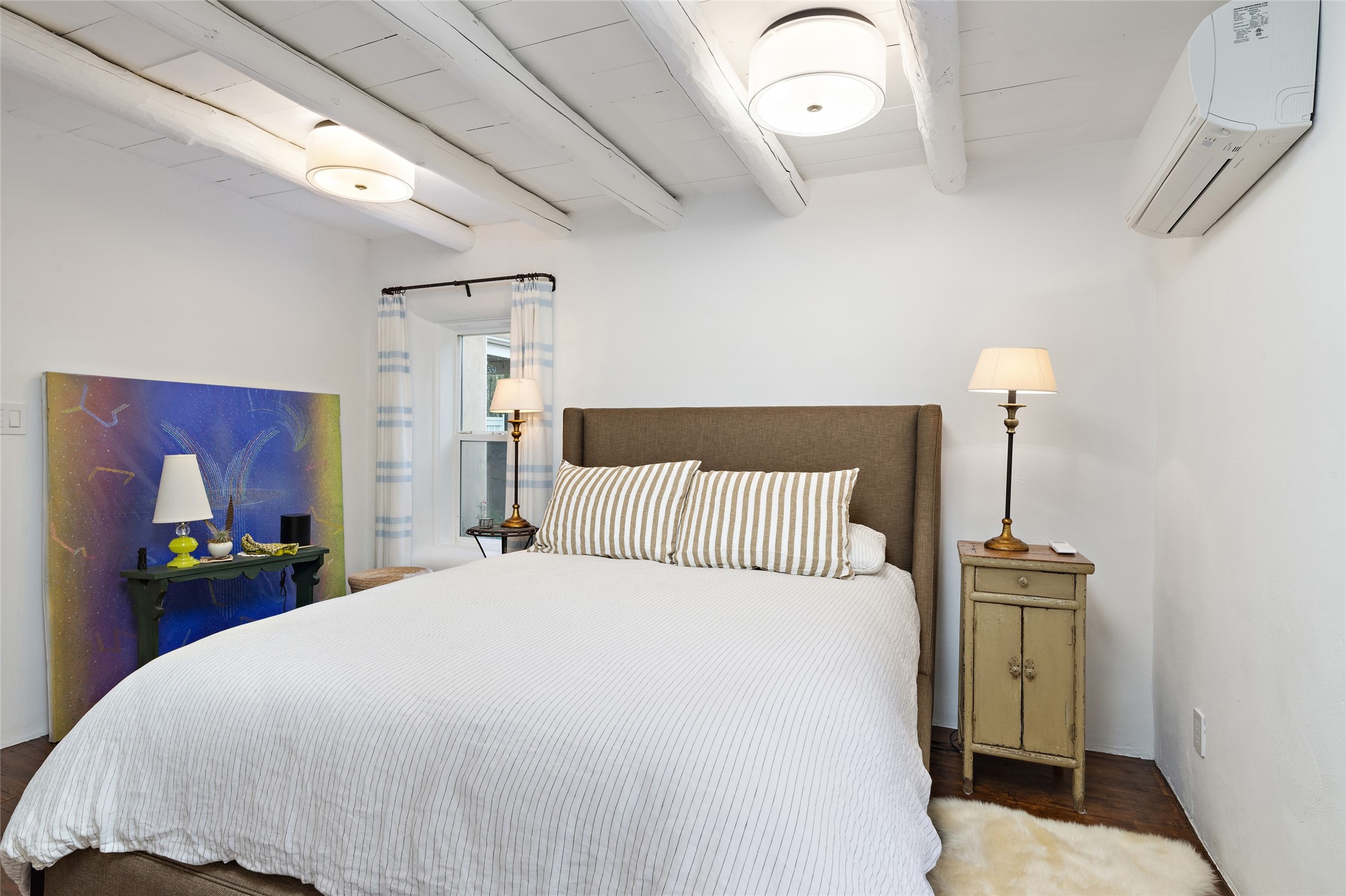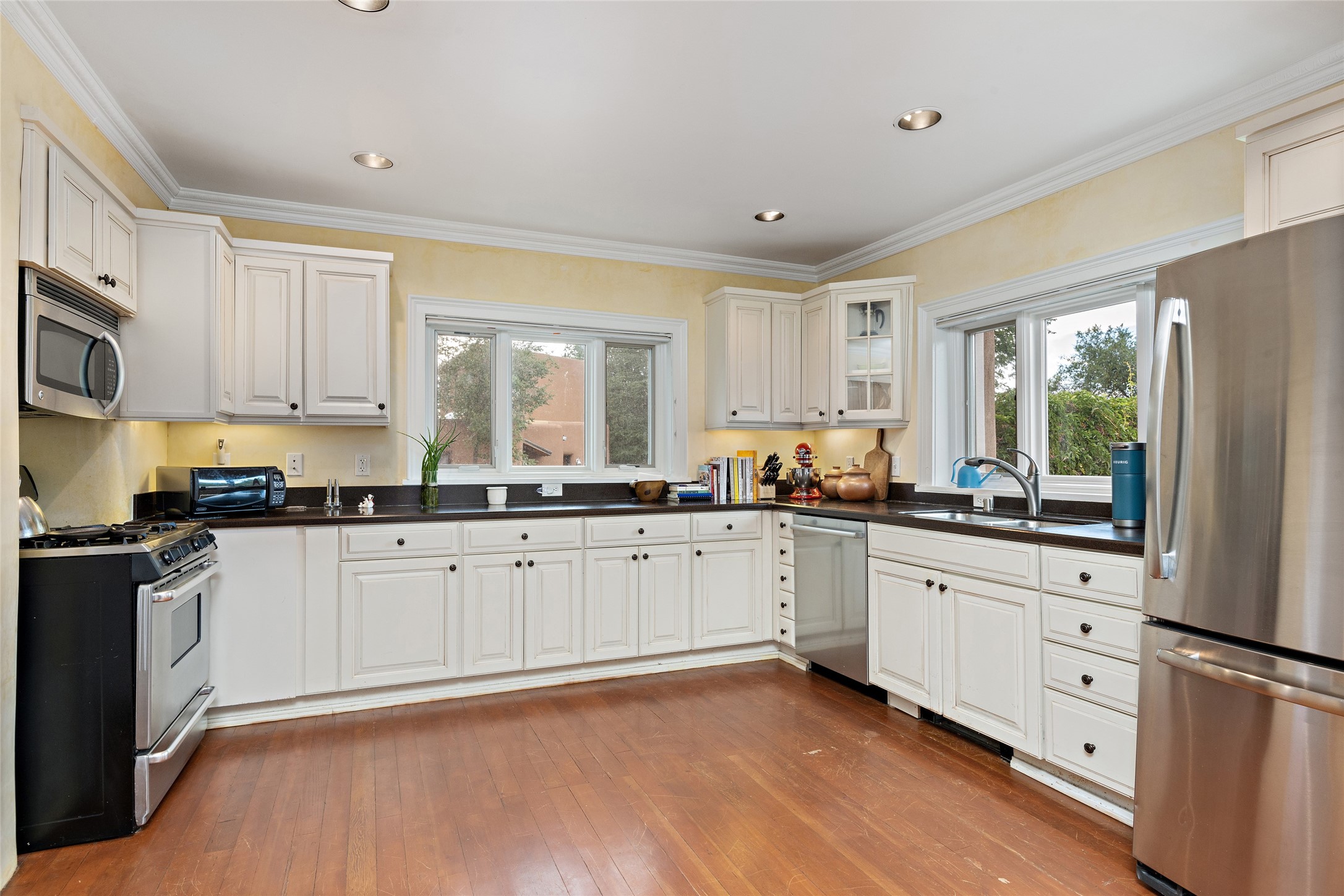 This lovely compound with two adobe homes located in the historic Guadalupe District, offers a number of opportunities: live in one and rent the other or use it as a guest house or an office/studio. The Northern NM style double adobe main residence was originally built in the late 1800s. Since 2010, the main house has been restored to its original beauty and the electrical, heating and plumbing systems have been updated. A nice-sized yard with xeriscaping, mature trees and portal are perfect for outdoor gatherings. The living room is open to the formal dining area with lovely wood and glass cabinets in between. The kitchen is open and inviting with modern appliances and plenty of storage. Nicely separated from the common rooms, the primary bedroom has a dressing room, closet and three quarter bath. There is a full bath in between the primary bedroom and the second bedroom. The 2 bedroom adobe guesthouse has been extensively updated since 2020 including hardwood floors, a kiva fireplace in one bedroom, a full bath, laundry room and kitchen. These 2 classic homes are located within the historic community surrounding Our Lady Of Guadalupe Santuario in the heart of Santa Fe.