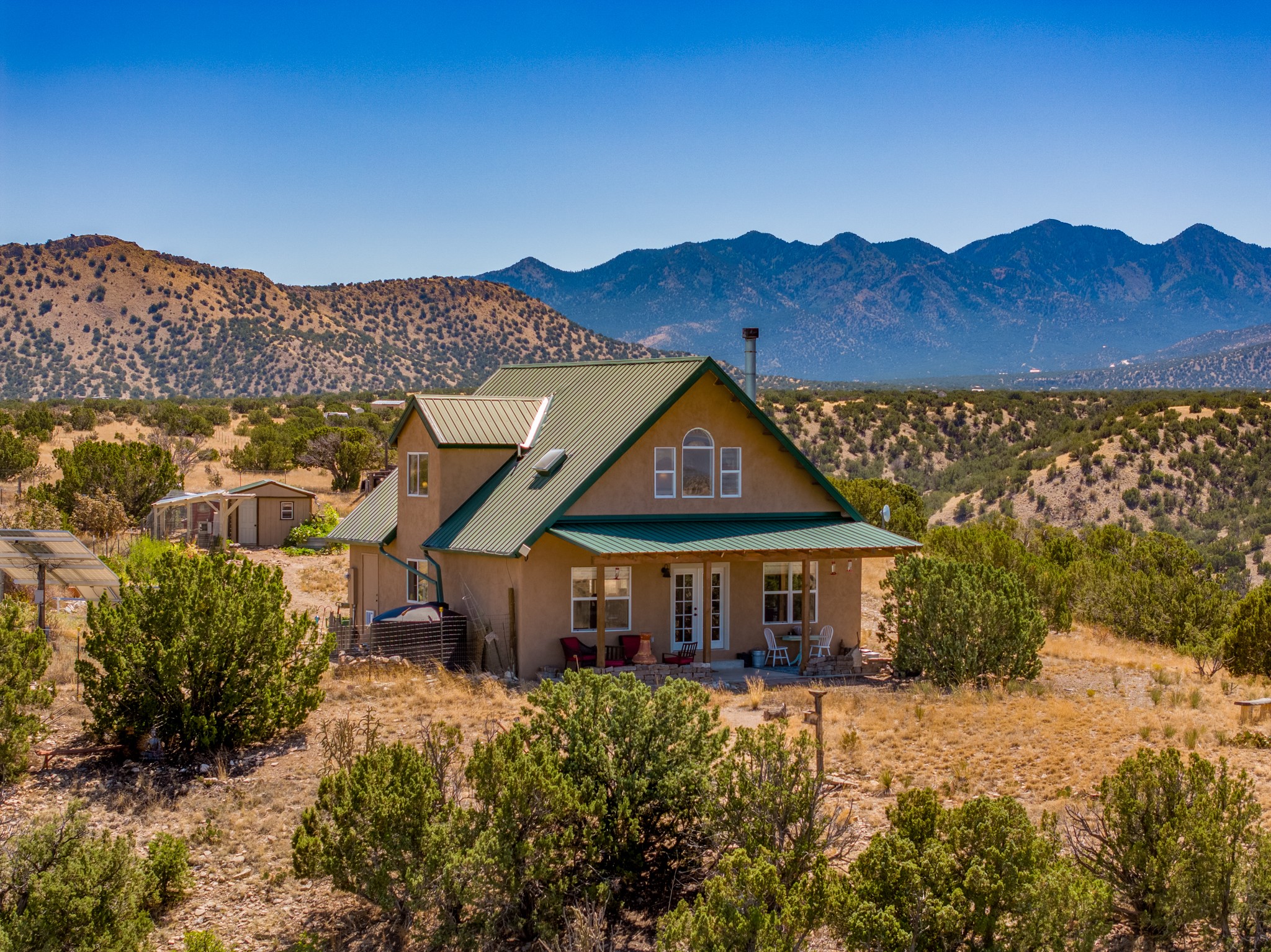 You'll find this high-desert homestead perched on a mesa's edge, with jaw-dropping views in every direction. A high-ceilinged, 1259 square foot home, with one bedroom and one bathroom, sits on 40 acres. This open floor plan home gives many configuration options- a roomy yet cozy space. Property has abundant, thriving gardens, a shed and chicken coop, as well as a corral and space for horses. Water is supplied by a private well, and electricity by the sun. Sellers have recently invested nearly $50,000 in the property, including new solar panels, charge controller, inverters, and batteries, 5600 gallons of water storage (in addition to 3100 gallons of rain catchment), new well pump, booster pump and whole house water filtration system. 3.5 miles from highway 14. Come experience the profound privacy, and quiet this property provides while only being a short hop to the thriving artist community of Madrid and a 45 min drive to Santa Fe. Excellent off the grid property with expansive vistas of the Cerrillos Hills and the Jemez, Sangre de Cristo, Ortiz, and Sandia Mountains.