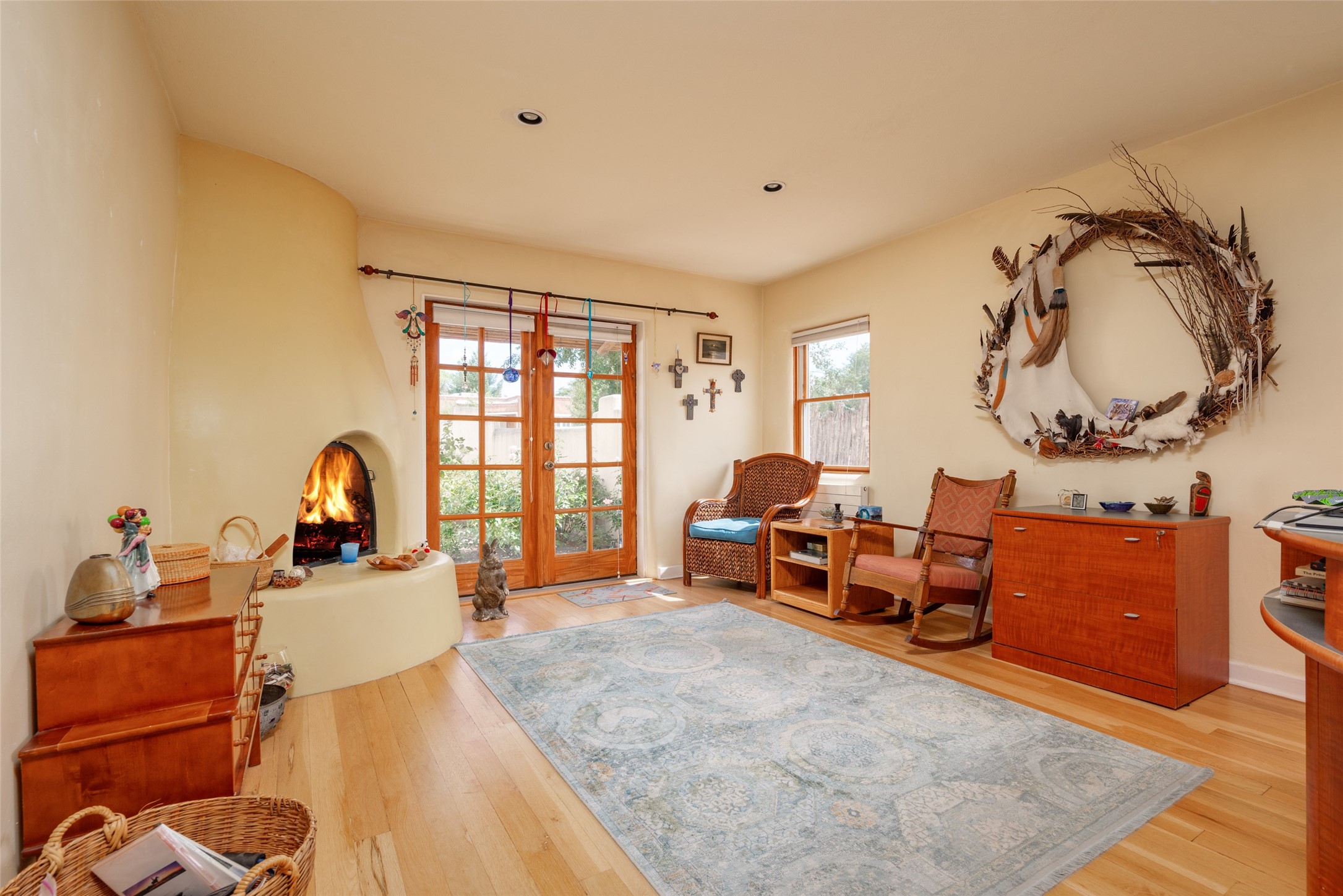 A single-level, charming home that is 1 of 2 free-standing units that are declared as a condo; however, there is Not a COA fee! This 2 bedroom/2 bath home, built in 1943 offers great livability at a terrific location! Enter the home through the private enclosed courtyard with a covered patio to enjoy all the seasons. Features include saltillo and wood flooring, stainless steel appliances, a nicho to display your beloved treasures, and a kiva fireplace for additional warmth to keep your home cozy and comfortable. Both bedrooms have doors that lead to a deck, creating more outdoor living area for relaxation. Ample street parking. Conveniently located close to many amenities, this property is a short stroll to the beautiful Harvey Cornell Rose Park, Trader Joes, CVS, restaurants and the Santa Fe historic plaza.