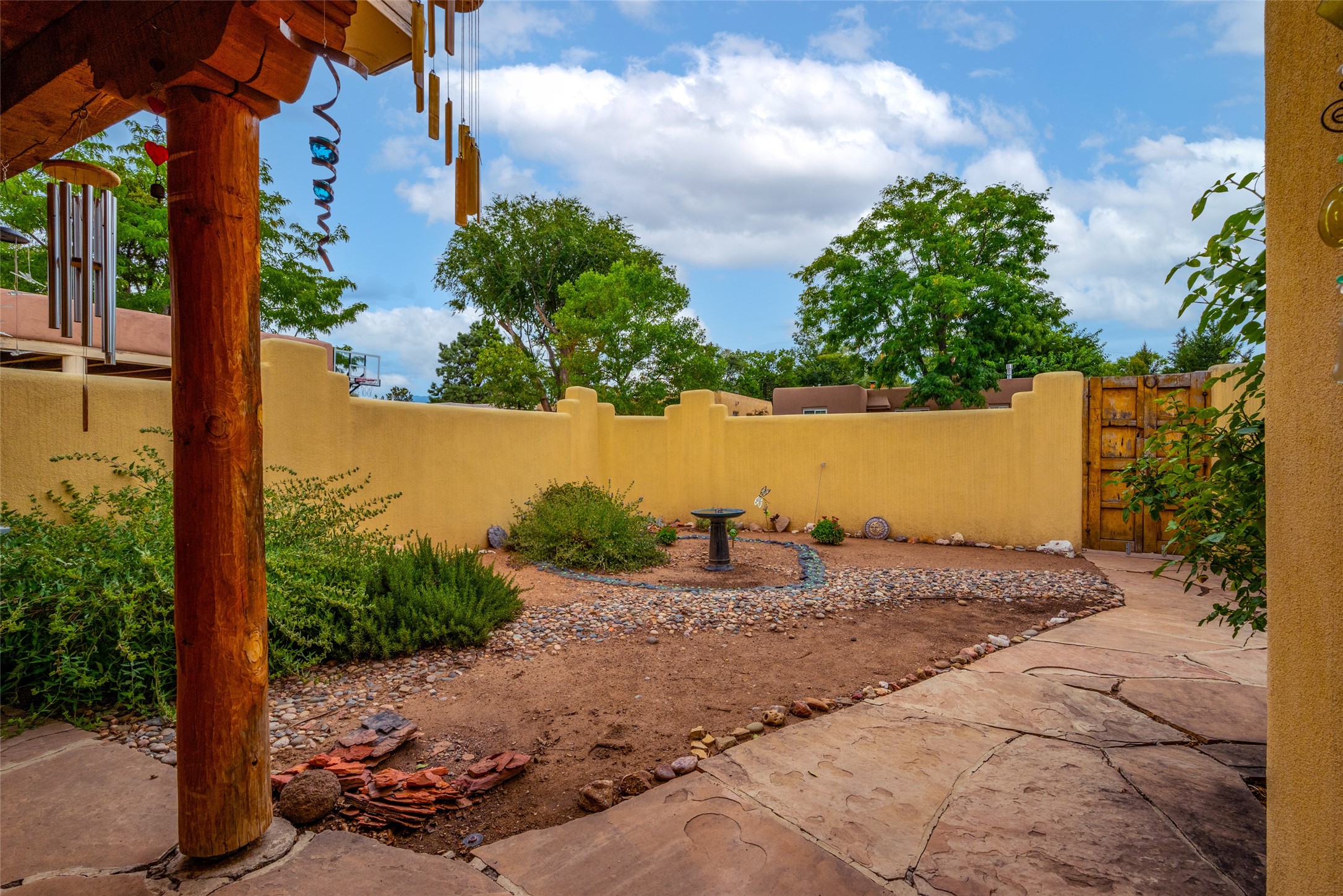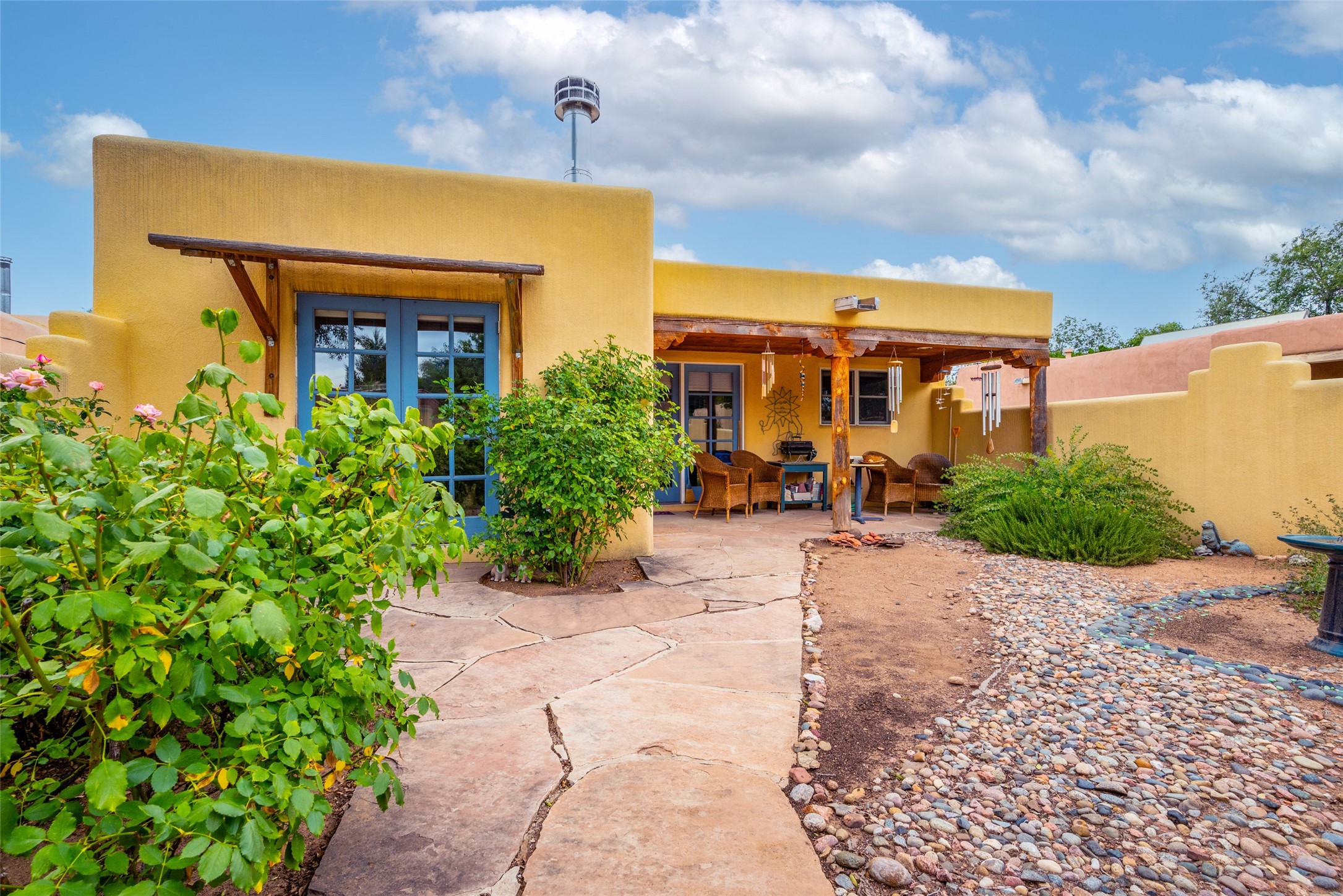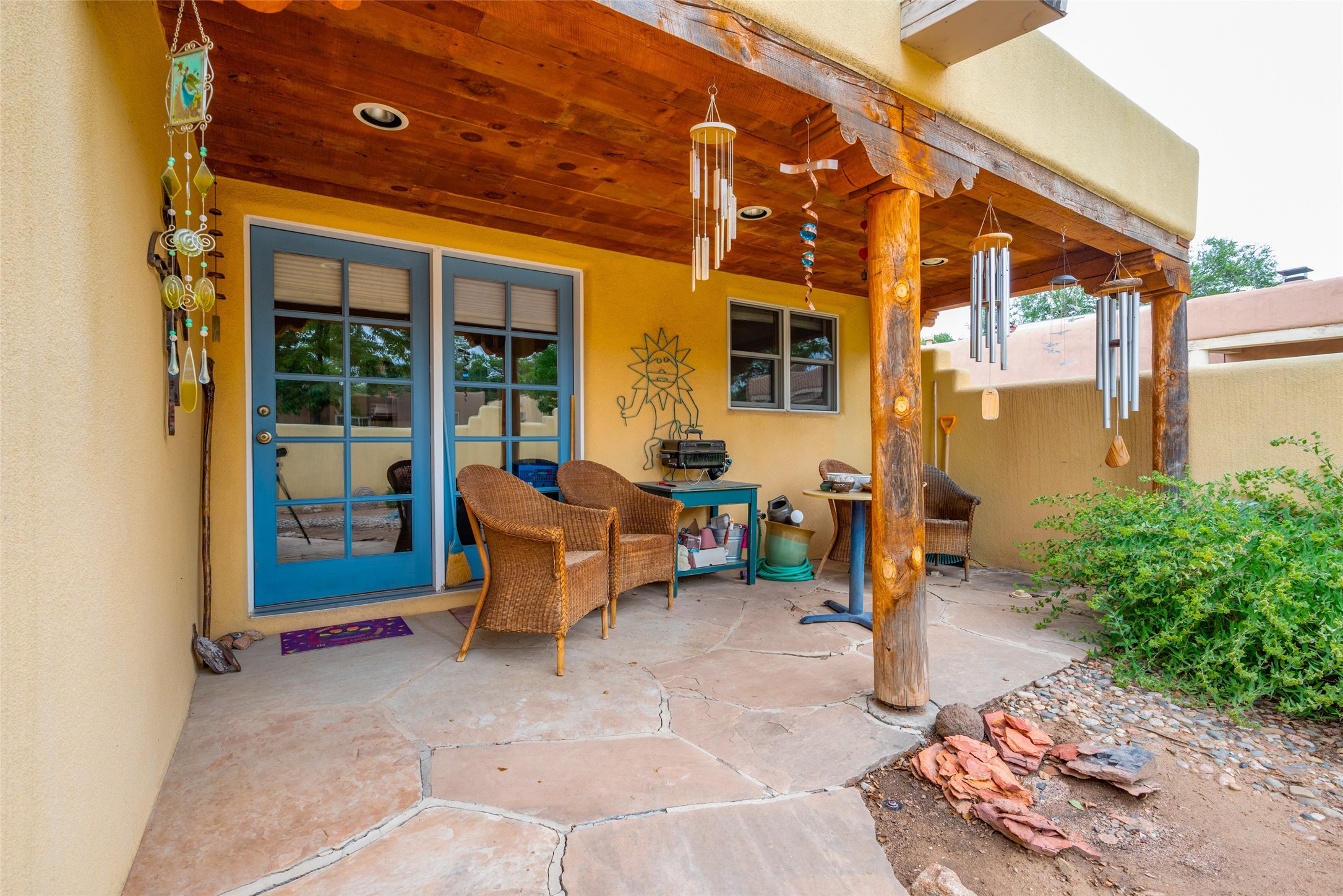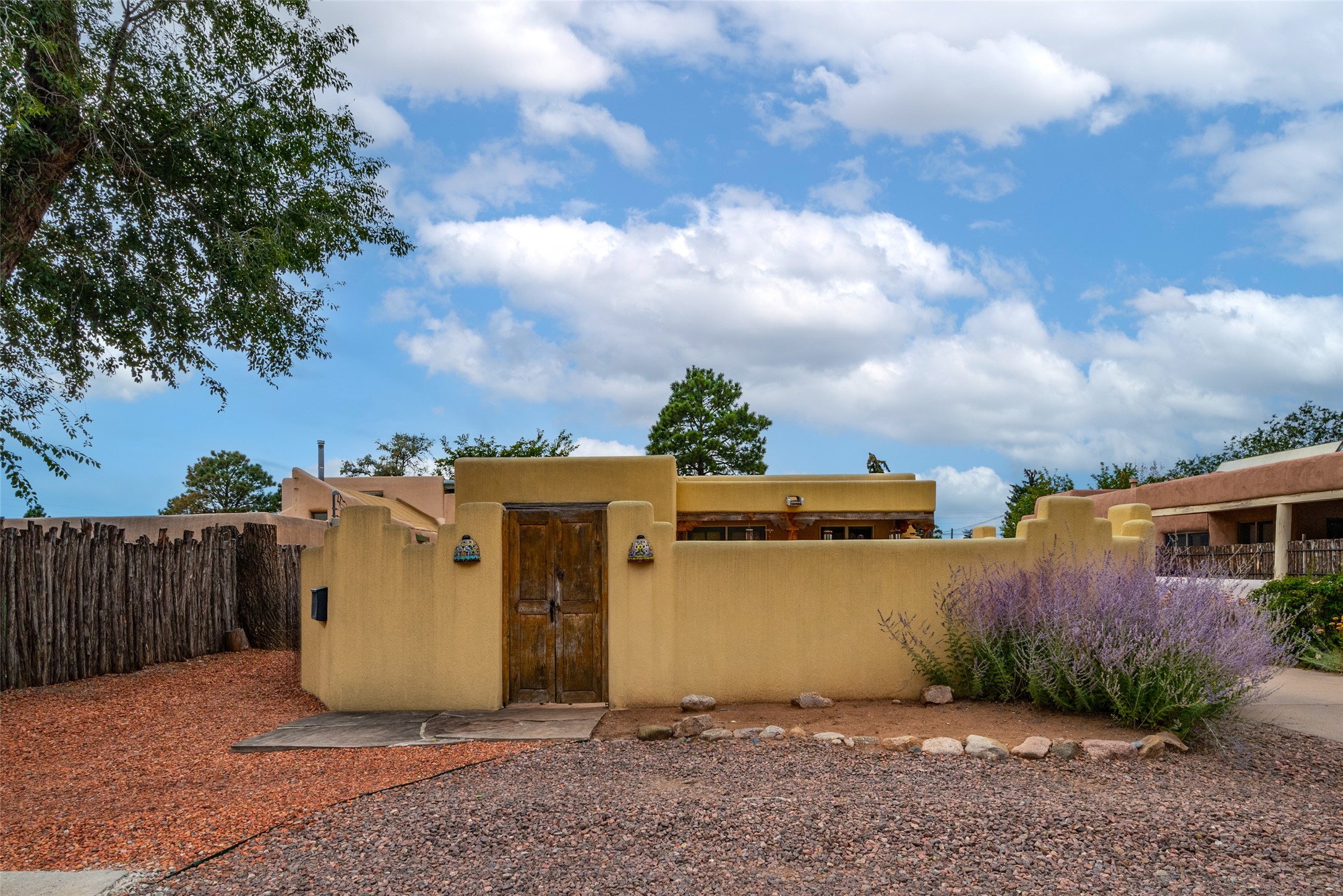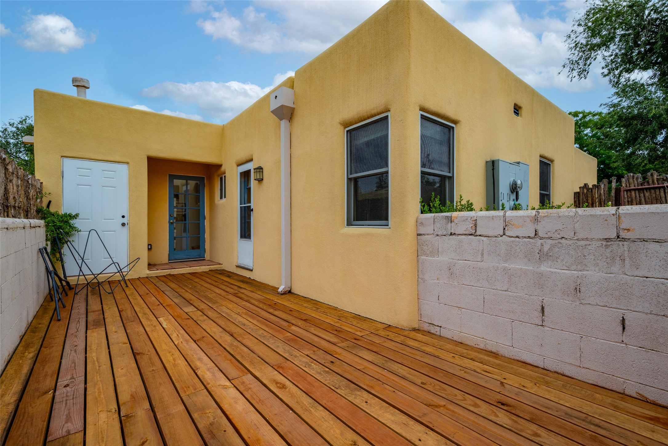 A single-level, charming home that is 1 of 2 free-standing units that are declared as a condo; however, there is Not a COA fee! This 2 bedroom/2 bath home, built in 1943 offers great livability at a terrific location! Enter the home through the private enclosed courtyard with a covered patio to enjoy all the seasons. Features include saltillo and wood flooring, stainless steel appliances, a nicho to display your beloved treasures, and a kiva fireplace for additional warmth to keep your home cozy and comfortable. Both bedrooms have doors that lead to a deck, creating more outdoor living area for relaxation. Ample street parking. Conveniently located close to many amenities, this property is a short stroll to the beautiful Harvey Cornell Rose Park, Trader Joes, CVS, restaurants and the Santa Fe historic plaza.