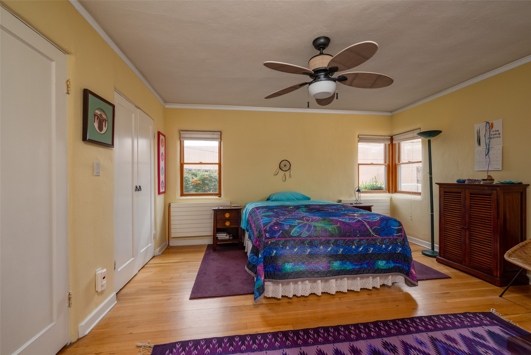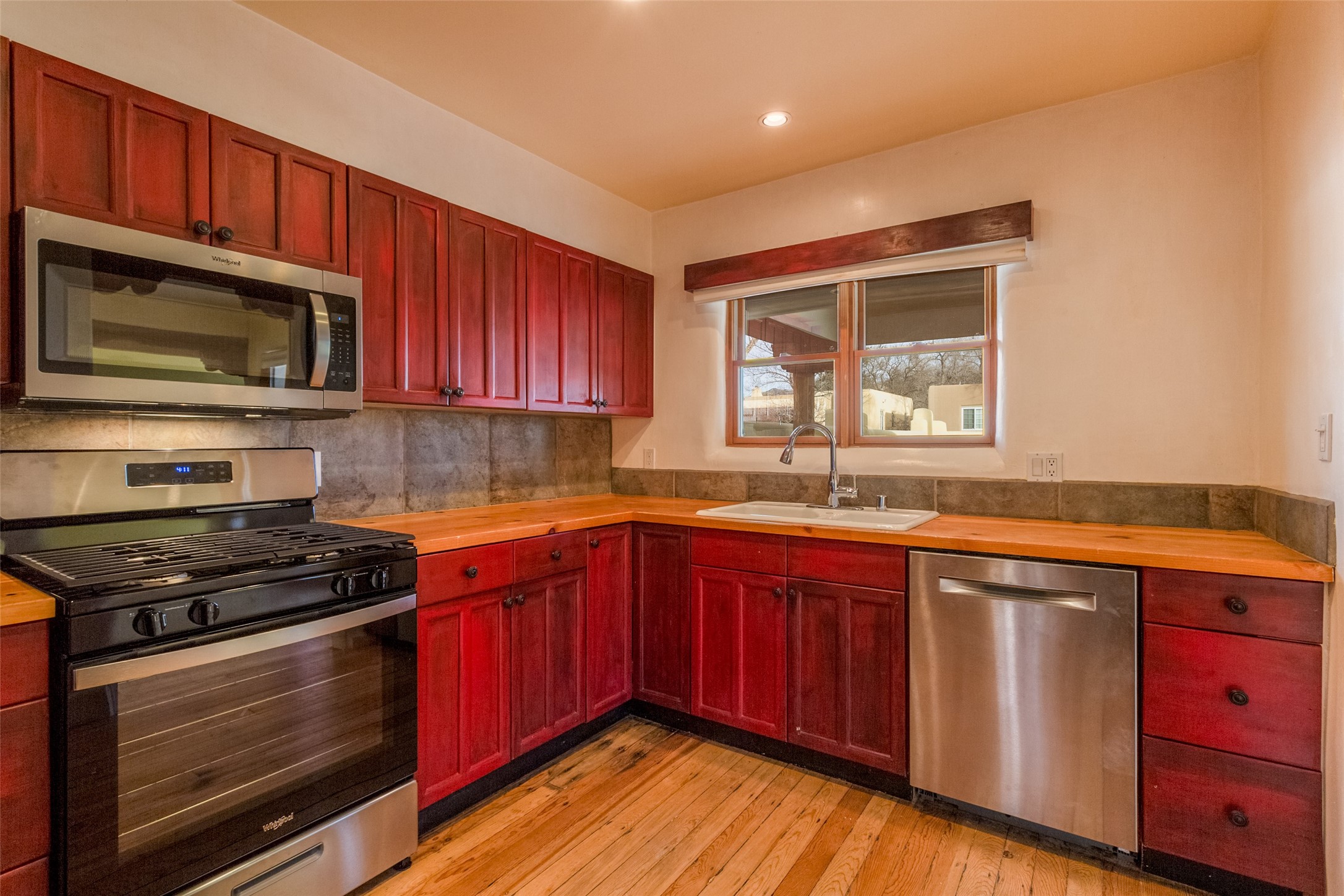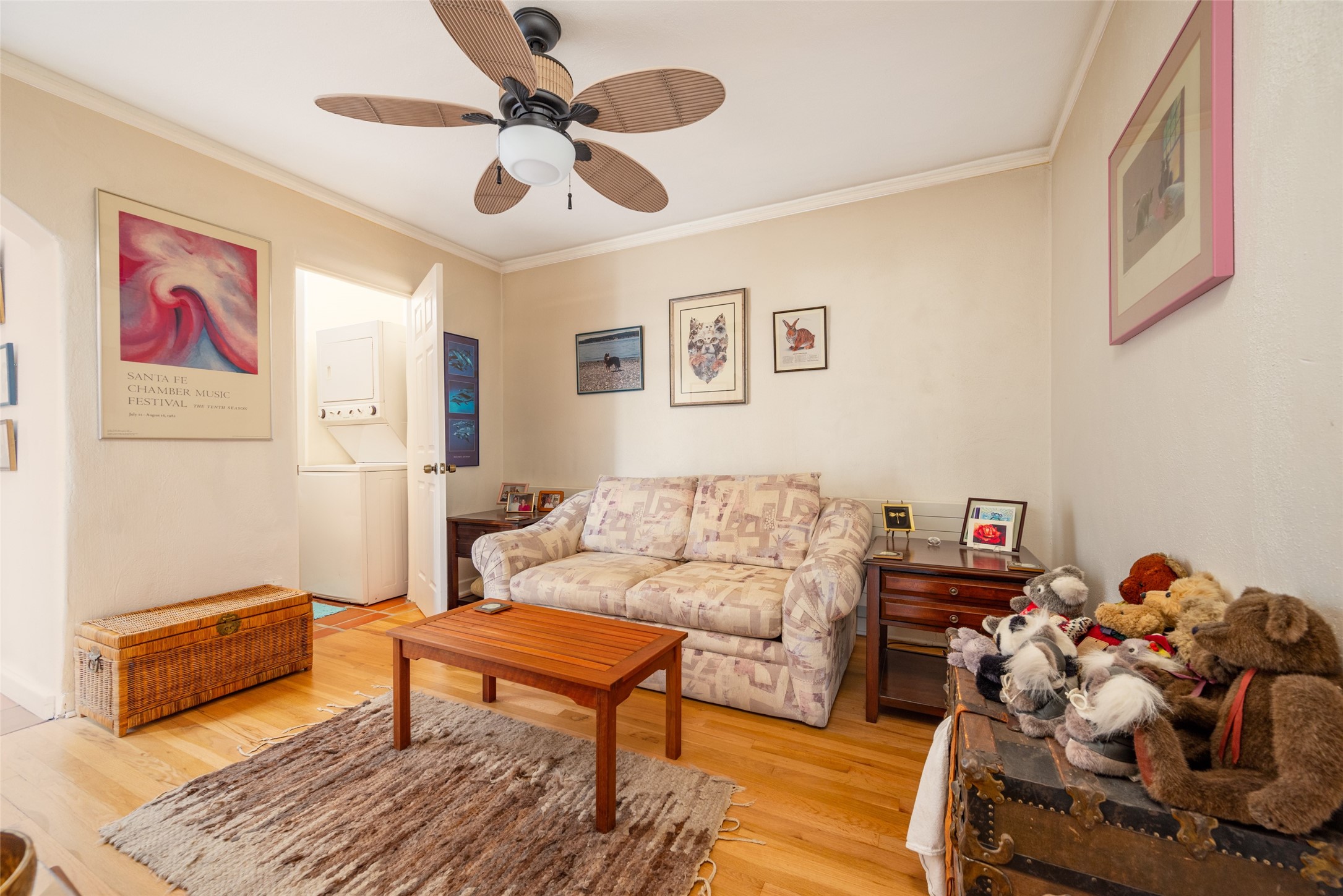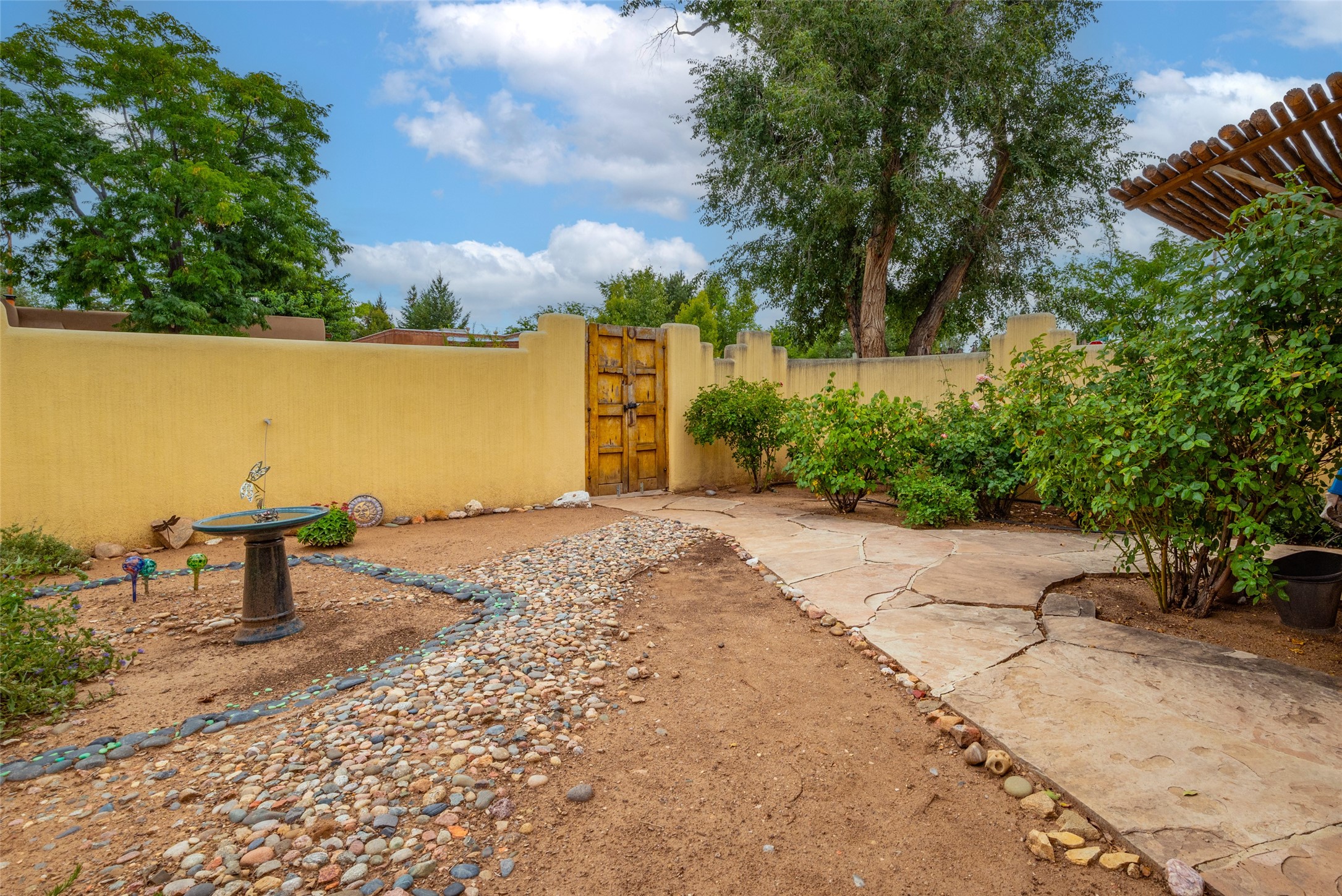 A single-level, charming home that is 1 of 2 free-standing units that are declared as a condo; however, there is Not a COA fee! This 2 bedroom/2 bath home, built in 1943 offers great livability at a terrific location! Enter the home through the private enclosed courtyard with a covered patio to enjoy all the seasons. Features include saltillo and wood flooring, stainless steel appliances, a nicho to display your beloved treasures, and a kiva fireplace for additional warmth to keep your home cozy and comfortable. Both bedrooms have doors that lead to a deck, creating more outdoor living area for relaxation. Ample street parking. Conveniently located close to many amenities, this property is a short stroll to the beautiful Harvey Cornell Rose Park, Trader Joes, CVS, restaurants and the Santa Fe historic plaza.