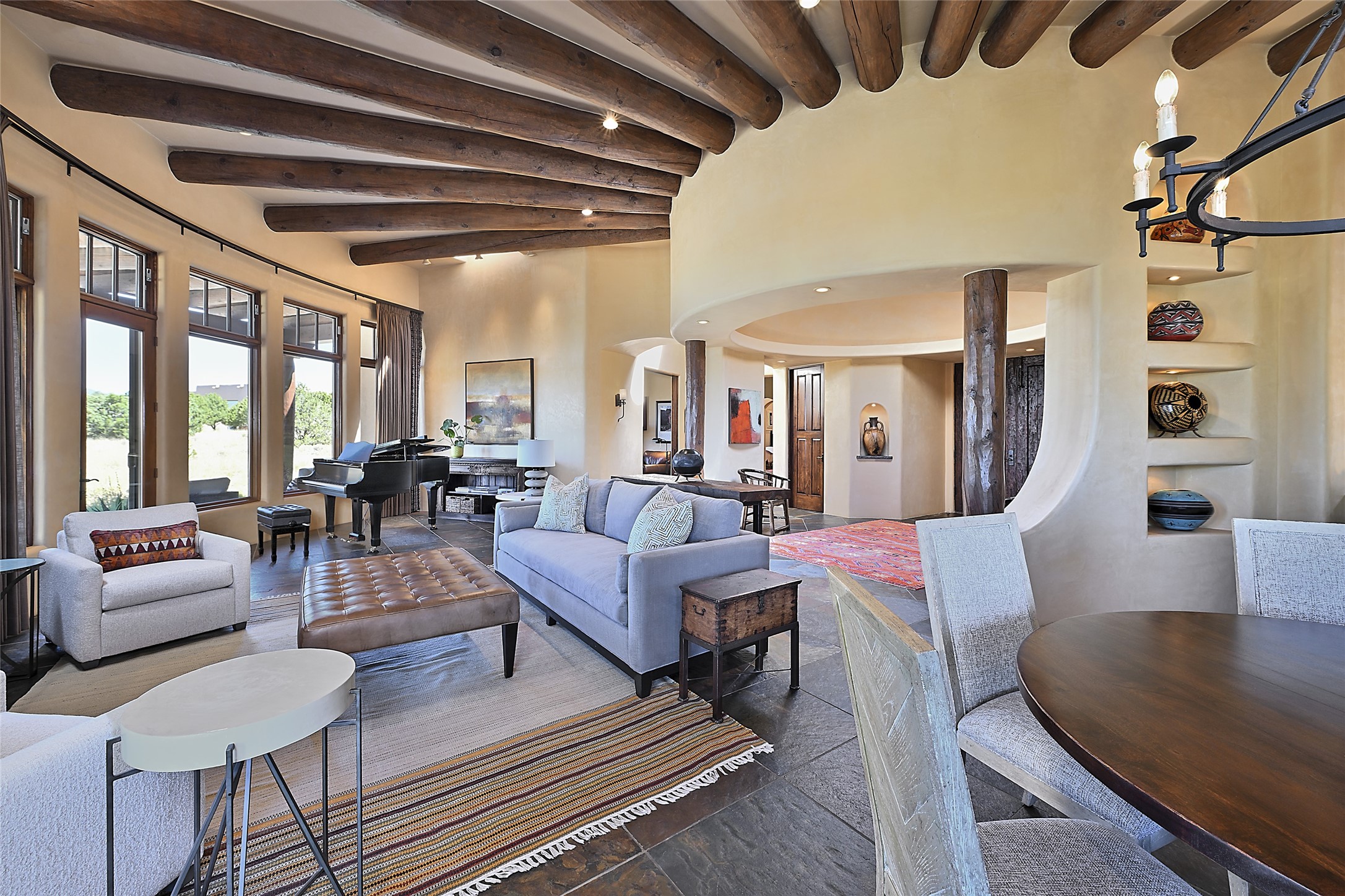 Masterfully sited 3 bedroom 2.5 bath Pueblo style home with a spectacular panorama of the Jemez and Sangre de Cristo mountains. Single level, no interior steps. Traditional Southwest ceiling treatments including radiating vigas and plastered ceilings, hand-troweled, pigmented plaster walls and skylights work in harmony to create a warm and comfortable home. Slate tile and wood floors. Double custom wood door opens to grand rotunda with 2 lighted art nichos with chiseled-edged flagstone sills. Spacious curved living/dining room providing 180-degree scenic views. Large gas-fueled fireplace with custom iron screens and beaver-chipped mantel. Chef's kitchen is appointed with ample lower/upper cabinets, granite countertops with decorative harlequin tile backsplash, Wolf double ovens and cooktop with 4 gas burners, griddle and grill, Sub-Zero refrigerator, 2 dishwashers, 2 sinks in kitchen, 2 wine fridges/racks in kitchen, and center island. Primary suite includes sitting area with kiva fireplace, a custom designed walk-in closet and luxurious bath with free-standing tub and separate walk-in shower. Split bedroom plan offers privacy for owners and guests. Separate office with built-ins and kiva fireplace. Ideal home for year-round outdoor living and dining with both winter and summer portal. Outdoor kiva and built-in grill. Enclosed entry courtyard with lush landscaping. 3-car heated garage. Convenient location with easy access to 599 and all the cultural amenities of Santa Fe.
