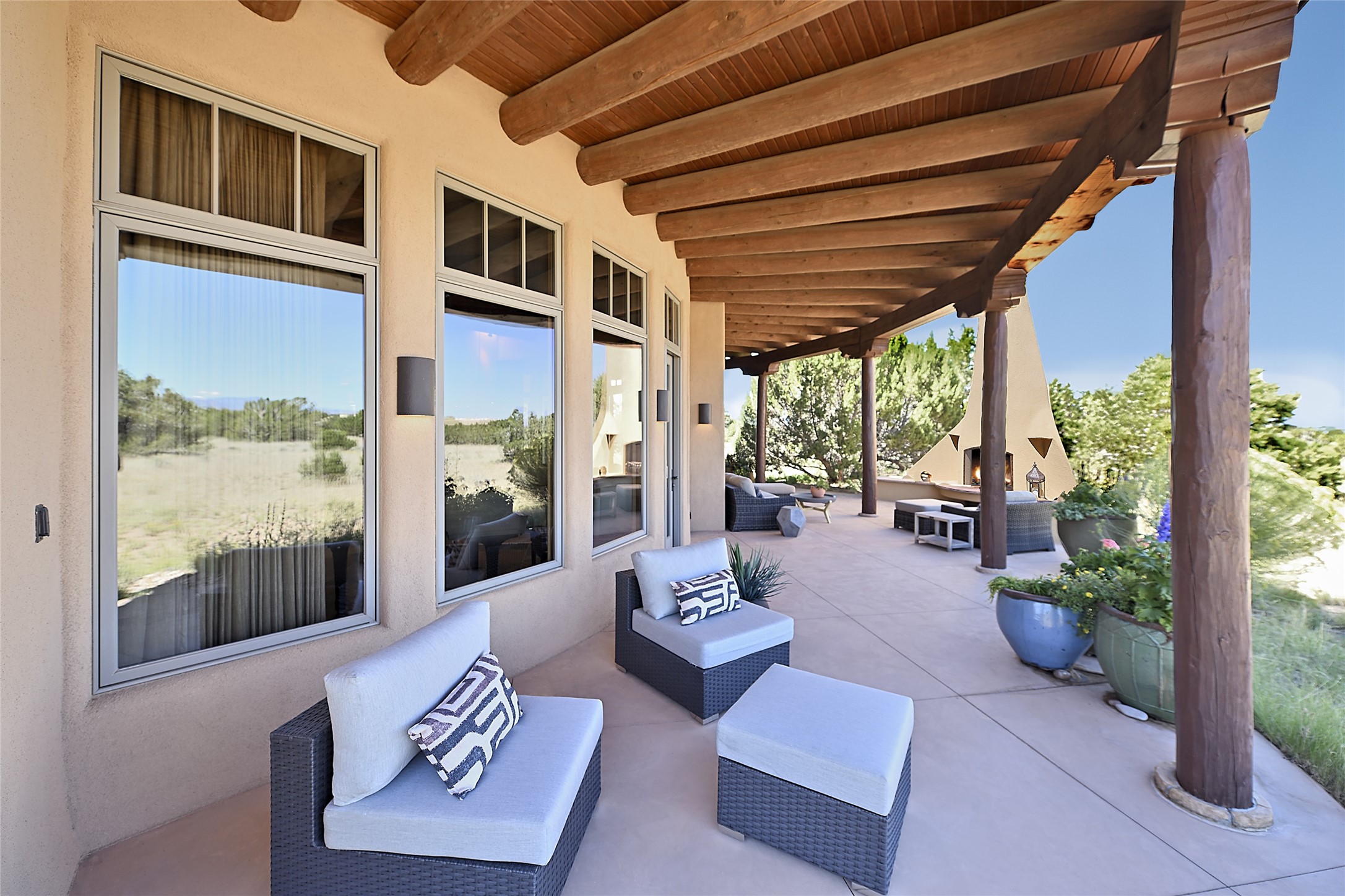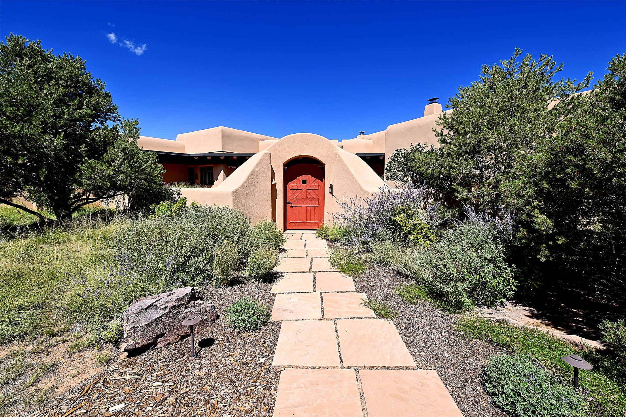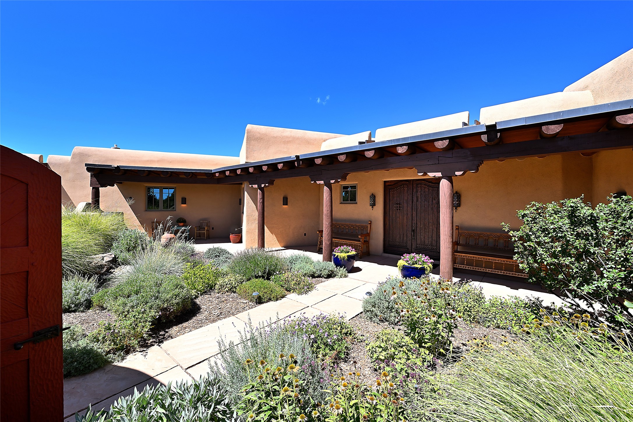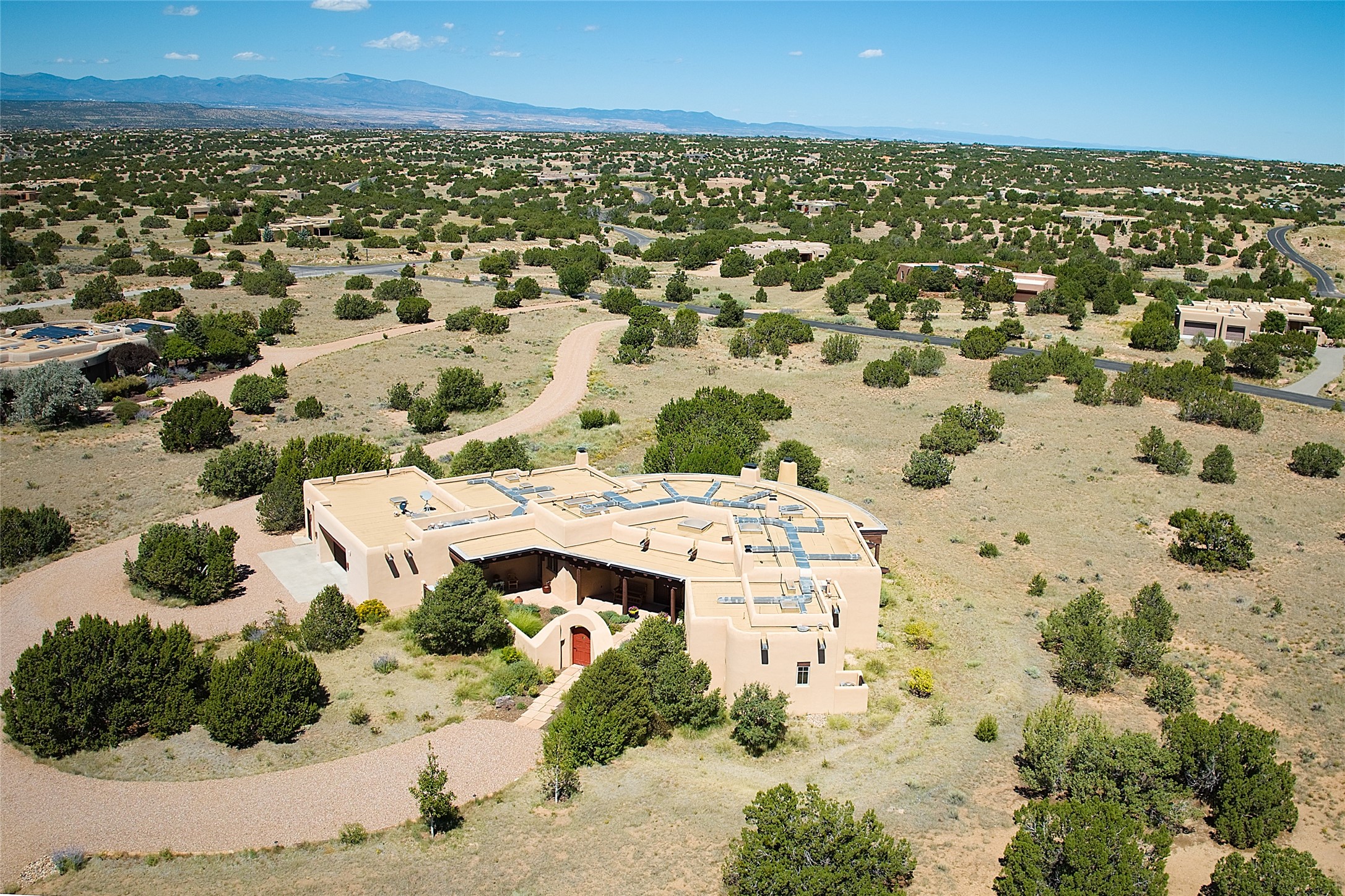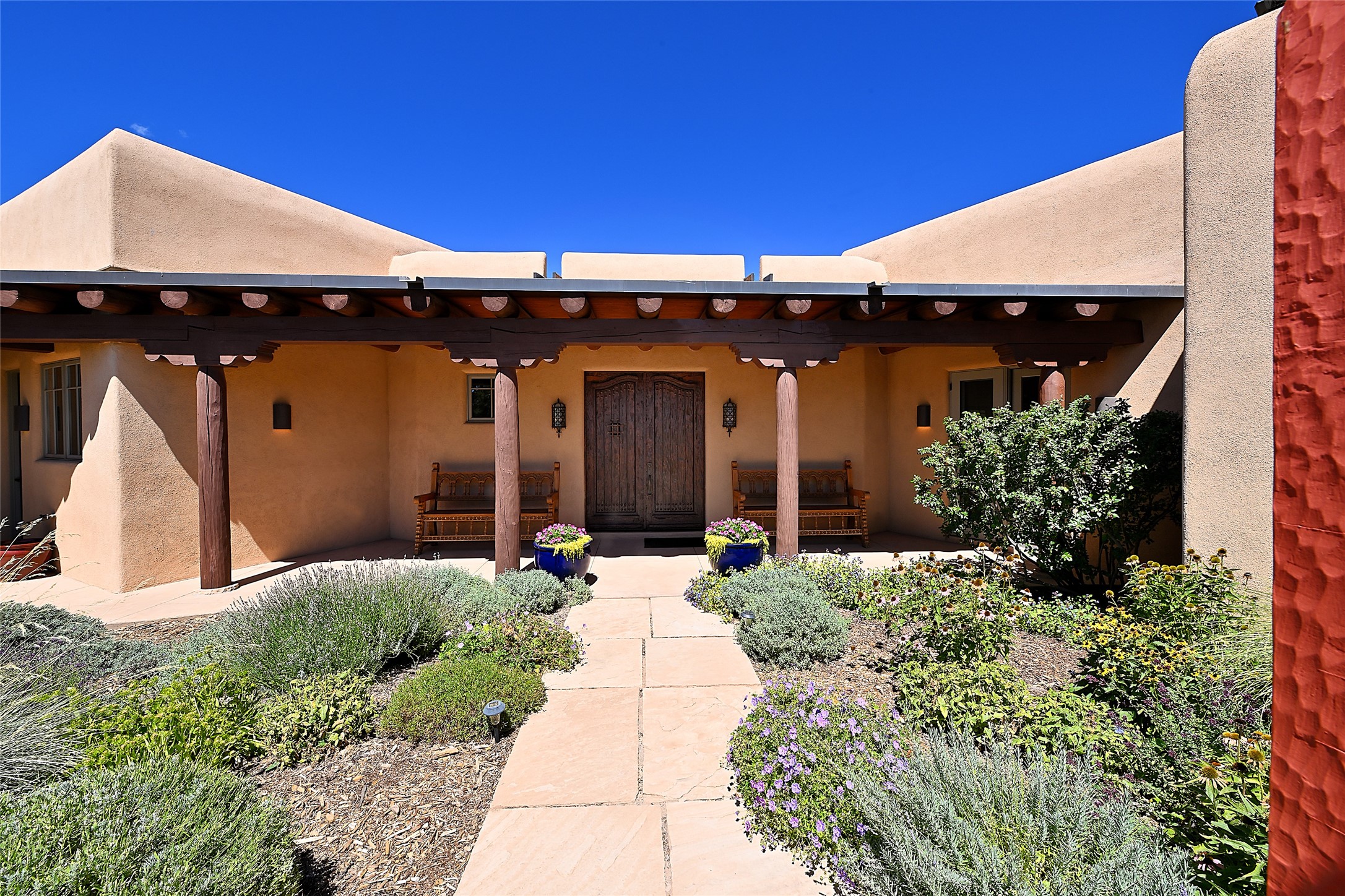 Masterfully sited 3 bedroom 2.5 bath Pueblo style home with a spectacular panorama of the Jemez and Sangre de Cristo mountains. Single level, no interior steps. Traditional Southwest ceiling treatments including radiating vigas and plastered ceilings, hand-troweled, pigmented plaster walls and skylights work in harmony to create a warm and comfortable home. Slate tile and wood floors. Double custom wood door opens to grand rotunda with 2 lighted art nichos with chiseled-edged flagstone sills. Spacious curved living/dining room providing 180-degree scenic views. Large gas-fueled fireplace with custom iron screens and beaver-chipped mantel. Chef's kitchen is appointed with ample lower/upper cabinets, granite countertops with decorative harlequin tile backsplash, Wolf double ovens and cooktop with 4 gas burners, griddle and grill, Sub-Zero refrigerator, 2 dishwashers, 2 sinks in kitchen, 2 wine fridges/racks in kitchen, and center island. Primary suite includes sitting area with kiva fireplace, a custom designed walk-in closet and luxurious bath with free-standing tub and separate walk-in shower. Split bedroom plan offers privacy for owners and guests. Separate office with built-ins and kiva fireplace. Ideal home for year-round outdoor living and dining with both winter and summer portal. Outdoor kiva and built-in grill. Enclosed entry courtyard with lush landscaping. 3-car heated garage. Convenient location with easy access to 599 and all the cultural amenities of Santa Fe.