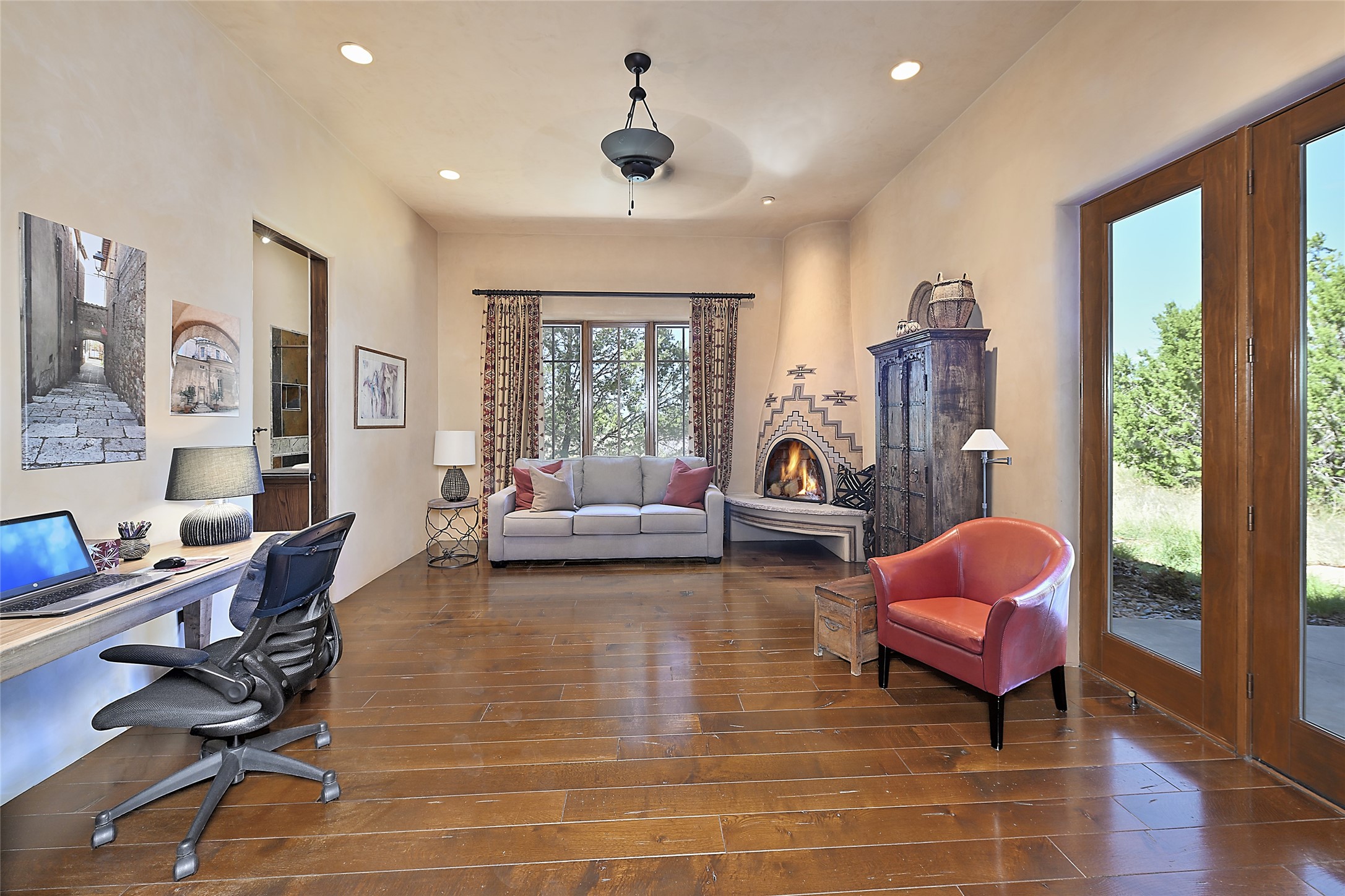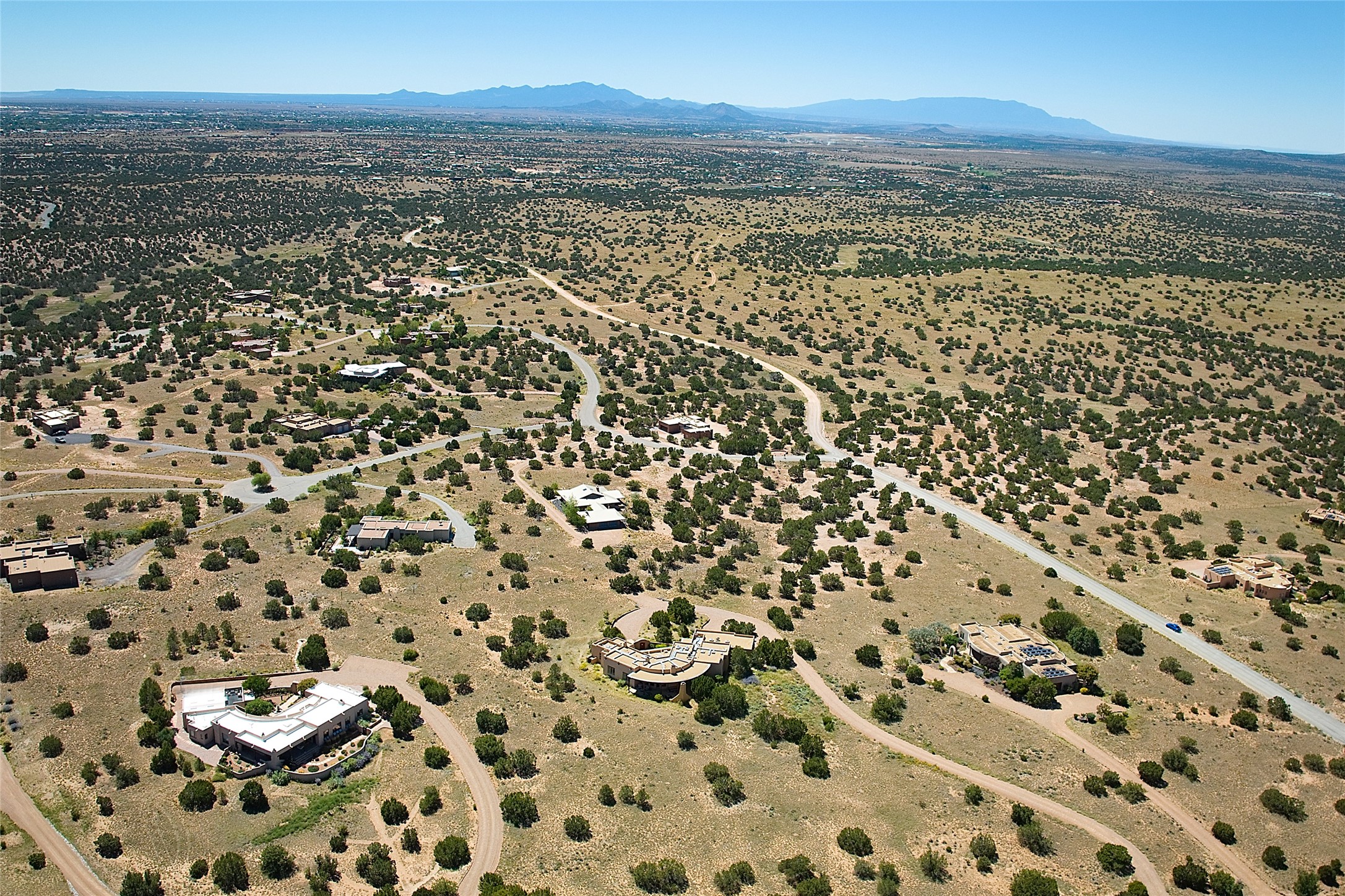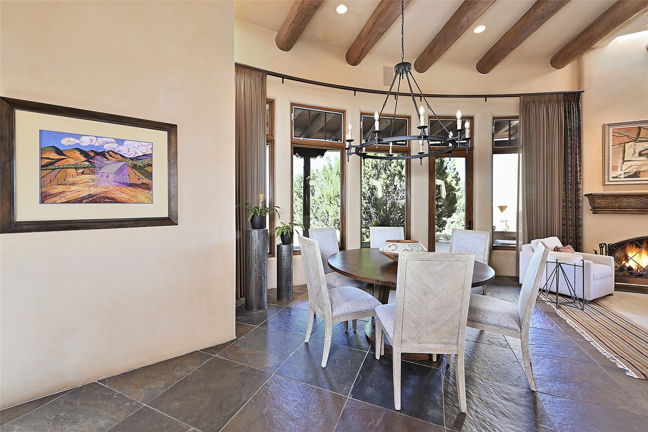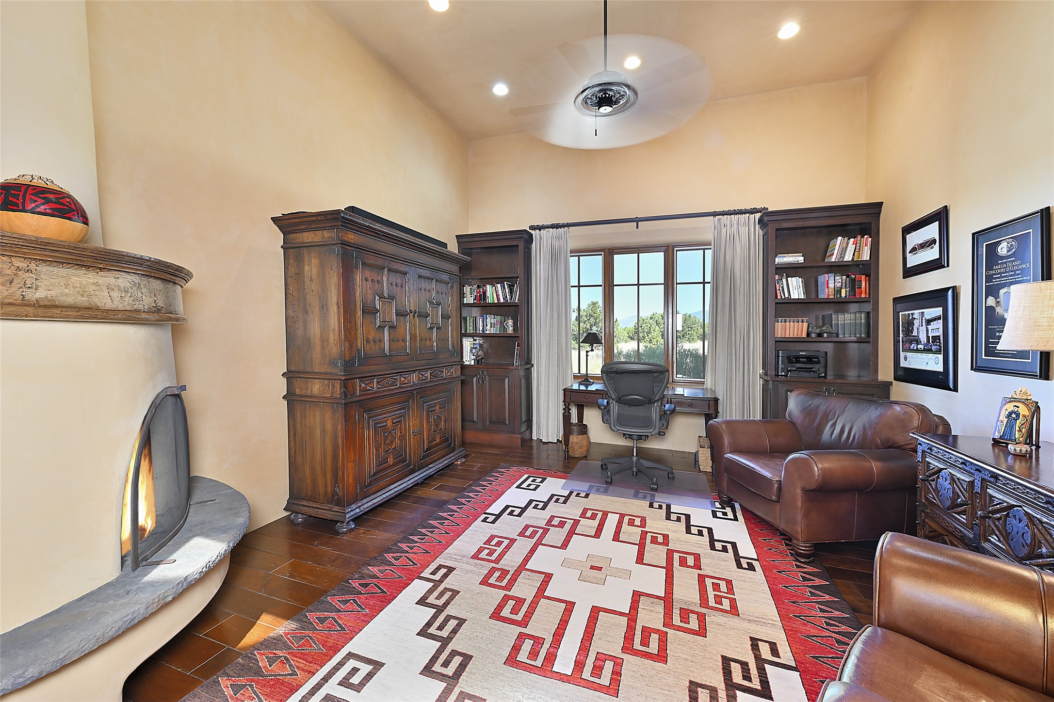 Masterfully sited 3 bedroom 2.5 bath Pueblo style home with a spectacular panorama of the Jemez and Sangre de Cristo mountains. Single level, no interior steps. Traditional Southwest ceiling treatments including radiating vigas and plastered ceilings, hand-troweled, pigmented plaster walls and skylights work in harmony to create a warm and comfortable home. Slate tile and wood floors. Double custom wood door opens to grand rotunda with 2 lighted art nichos with chiseled-edged flagstone sills. Spacious curved living/dining room providing 180-degree scenic views. Large gas-fueled fireplace with custom iron screens and beaver-chipped mantel. Chef's kitchen is appointed with ample lower/upper cabinets, granite countertops with decorative harlequin tile backsplash, Wolf double ovens and cooktop with 4 gas burners, griddle and grill, Sub-Zero refrigerator, 2 dishwashers, 2 sinks in kitchen, 2 wine fridges/racks in kitchen, and center island. Primary suite includes sitting area with kiva fireplace, a custom designed walk-in closet and luxurious bath with free-standing tub and separate walk-in shower. Split bedroom plan offers privacy for owners and guests. Separate office with built-ins and kiva fireplace. Ideal home for year-round outdoor living and dining with both winter and summer portal. Outdoor kiva and built-in grill. Enclosed entry courtyard with lush landscaping. 3-car heated garage. Convenient location with easy access to 599 and all the cultural amenities of Santa Fe.