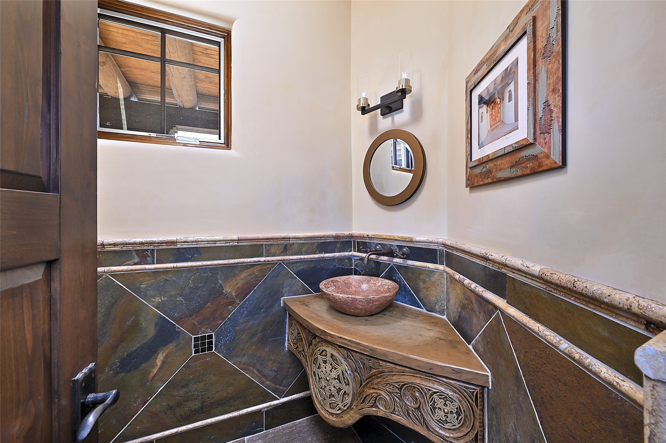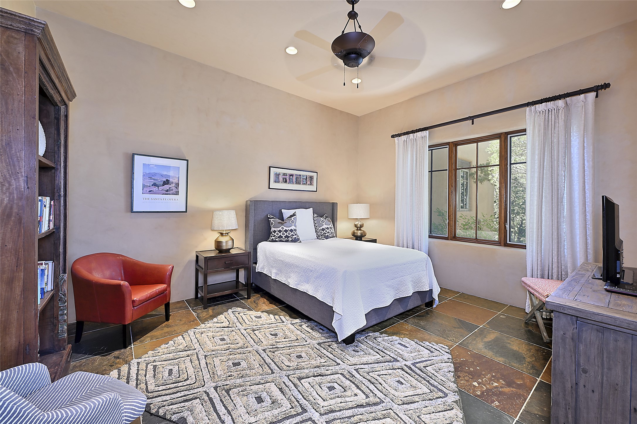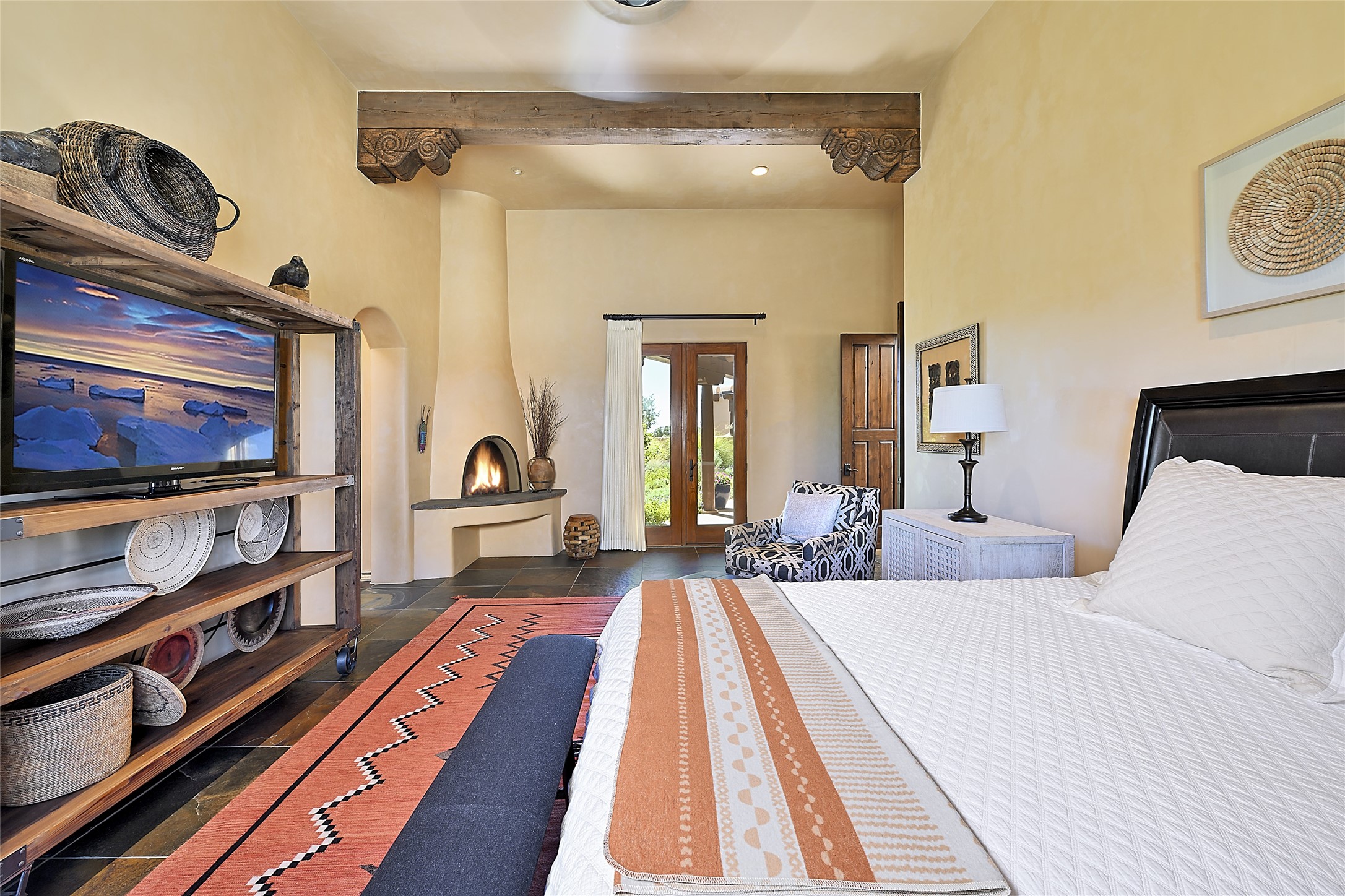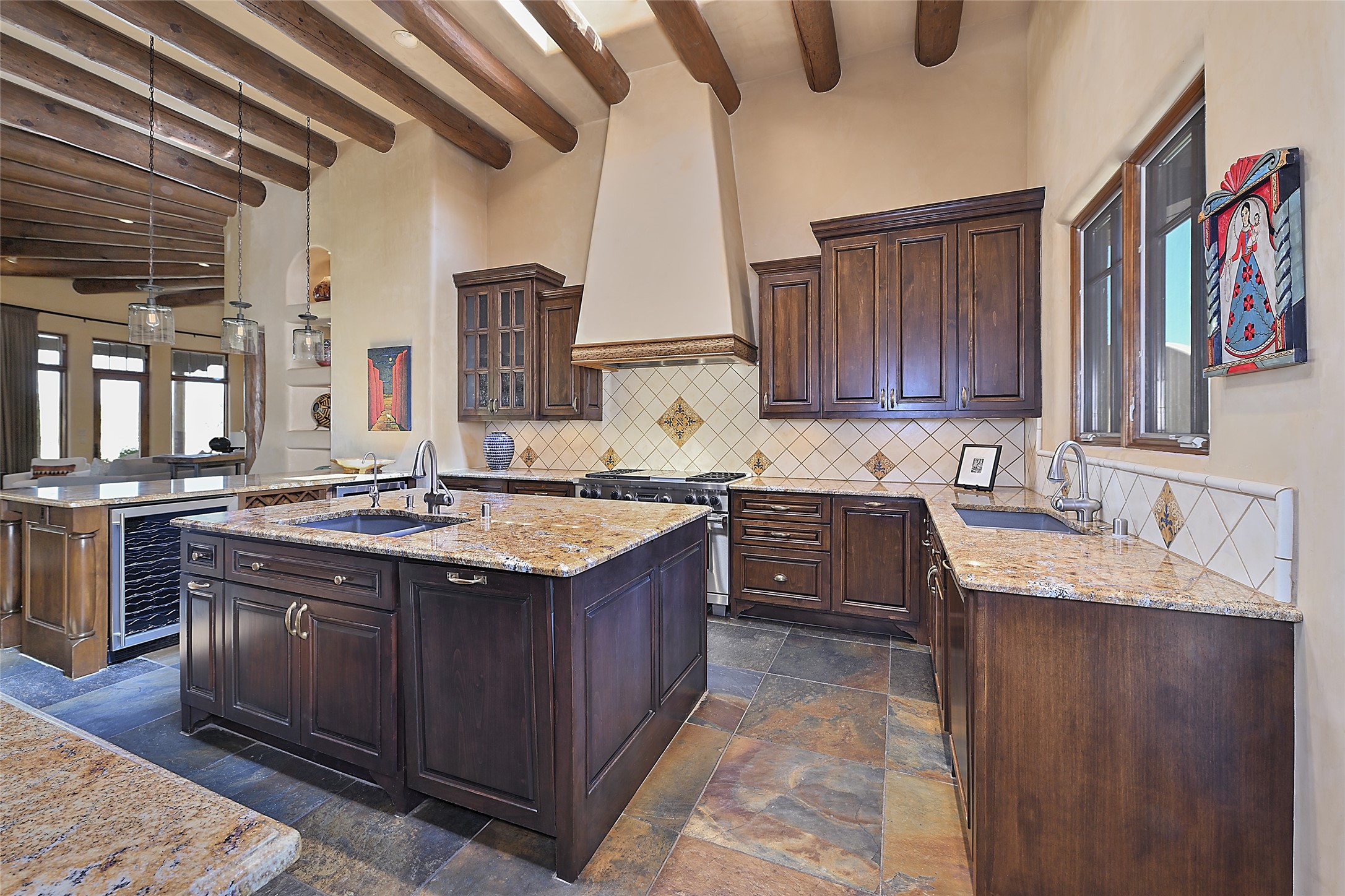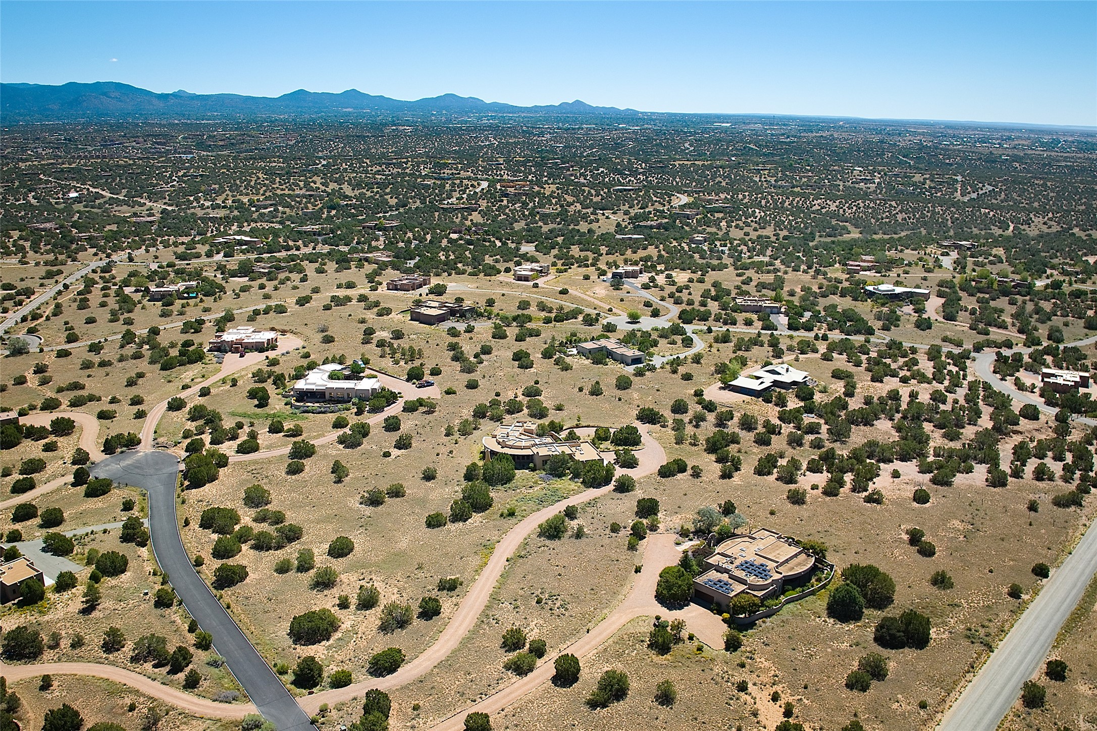 Masterfully sited 3 bedroom 2.5 bath Pueblo style home with a spectacular panorama of the Jemez and Sangre de Cristo mountains. Single level, no interior steps. Traditional Southwest ceiling treatments including radiating vigas and plastered ceilings, hand-troweled, pigmented plaster walls and skylights work in harmony to create a warm and comfortable home. Slate tile and wood floors. Double custom wood door opens to grand rotunda with 2 lighted art nichos with chiseled-edged flagstone sills. Spacious curved living/dining room providing 180-degree scenic views. Large gas-fueled fireplace with custom iron screens and beaver-chipped mantel. Chef's kitchen is appointed with ample lower/upper cabinets, granite countertops with decorative harlequin tile backsplash, Wolf double ovens and cooktop with 4 gas burners, griddle and grill, Sub-Zero refrigerator, 2 dishwashers, 2 sinks in kitchen, 2 wine fridges/racks in kitchen, and center island. Primary suite includes sitting area with kiva fireplace, a custom designed walk-in closet and luxurious bath with free-standing tub and separate walk-in shower. Split bedroom plan offers privacy for owners and guests. Separate office with built-ins and kiva fireplace. Ideal home for year-round outdoor living and dining with both winter and summer portal. Outdoor kiva and built-in grill. Enclosed entry courtyard with lush landscaping. 3-car heated garage. Convenient location with easy access to 599 and all the cultural amenities of Santa Fe.