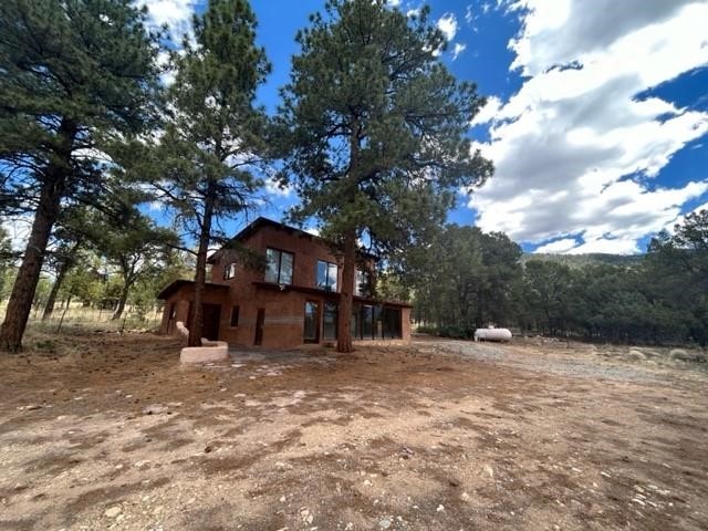 Discover serenity and rustic charm in this unique two-story pumice-crete and frame constructed southwestern-style home nestled on 4.99acres of pristine forest in Valdez, bordering the Carson National Forest. Situated atop a ridge, this southwestern territorial style home offers panoramic views of the valley and the majestic mountains beyond, allowing you to immerse yourself in the beauty of nature. Passive solar orientation ensures energy efficiency and a harmonious connection with the environment. The in-floor radiant heating(downstairs) adds to your comfort, making every corner of the 1342 sq. ft., 2-bedroom, 1-bathroom living space welcoming. Concrete, wood, and carpeted floors create a blend of modern functionality and rustic appeal. The open kitchen/dining/living area on the 2nd story is the heart of the home, features a functional layout and a convenient door leading to an elevated deck. From this vantage point, soak in the breathtaking landscape that stretches before you. The home's thoughtful simple design incorporates a pro-panel roof and on-demand domestic water heater to complement mountain living. Warm up during cooler months by the wood stove while admiring the views through strategically placed windows. Embrace green living with the attached 300 sq.ft. greenhouse sunroom, a perfect space to nurture plants and enjoy year-round sun-soaked tranquility. An additional 20x20x8 detached storage room/cistern provides ample storage options, enhancing the practicality of the property. While the home features a certain funky rustic charm, it holds vast potential for customization and transformation. The property's extra acreage invites you to expand your dreams, whether it's building another home, a garage, or a workshop. Partial fencing lends privacy, making it an ideal setting for horse enthusiasts or those seeking to explore the outdoors via mountain biking, hiking, or other recreational activities on the nearby public lands and trail systems. This home is not just a dwelling; it's an invitation to embrace the Southwest's allure, forge a connection with the land, and embark on a journey of discovery and fulfillment. Convenient access to Taos Ski Valley.