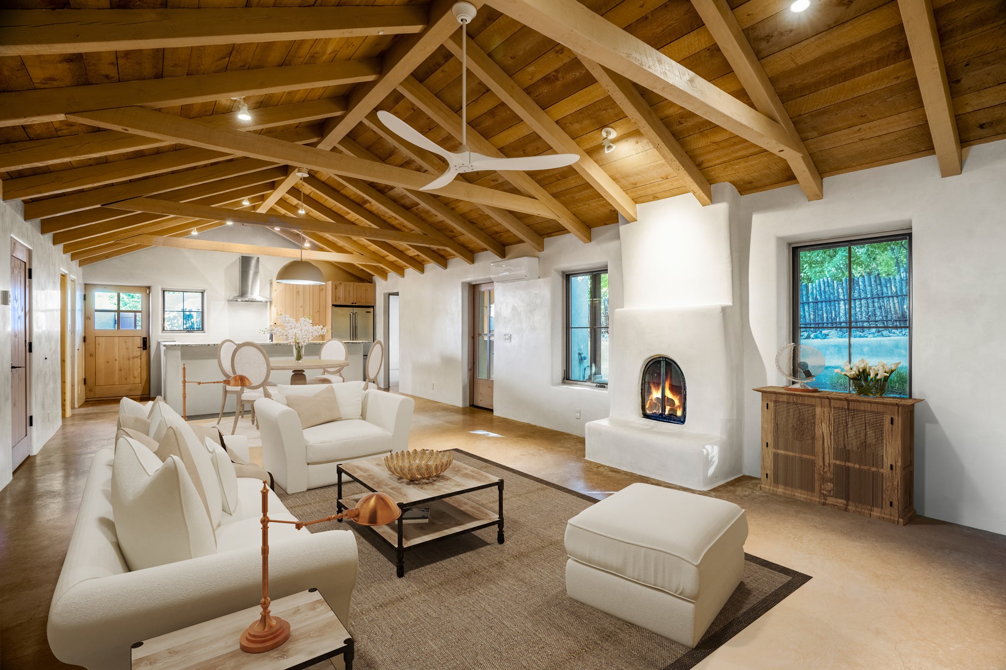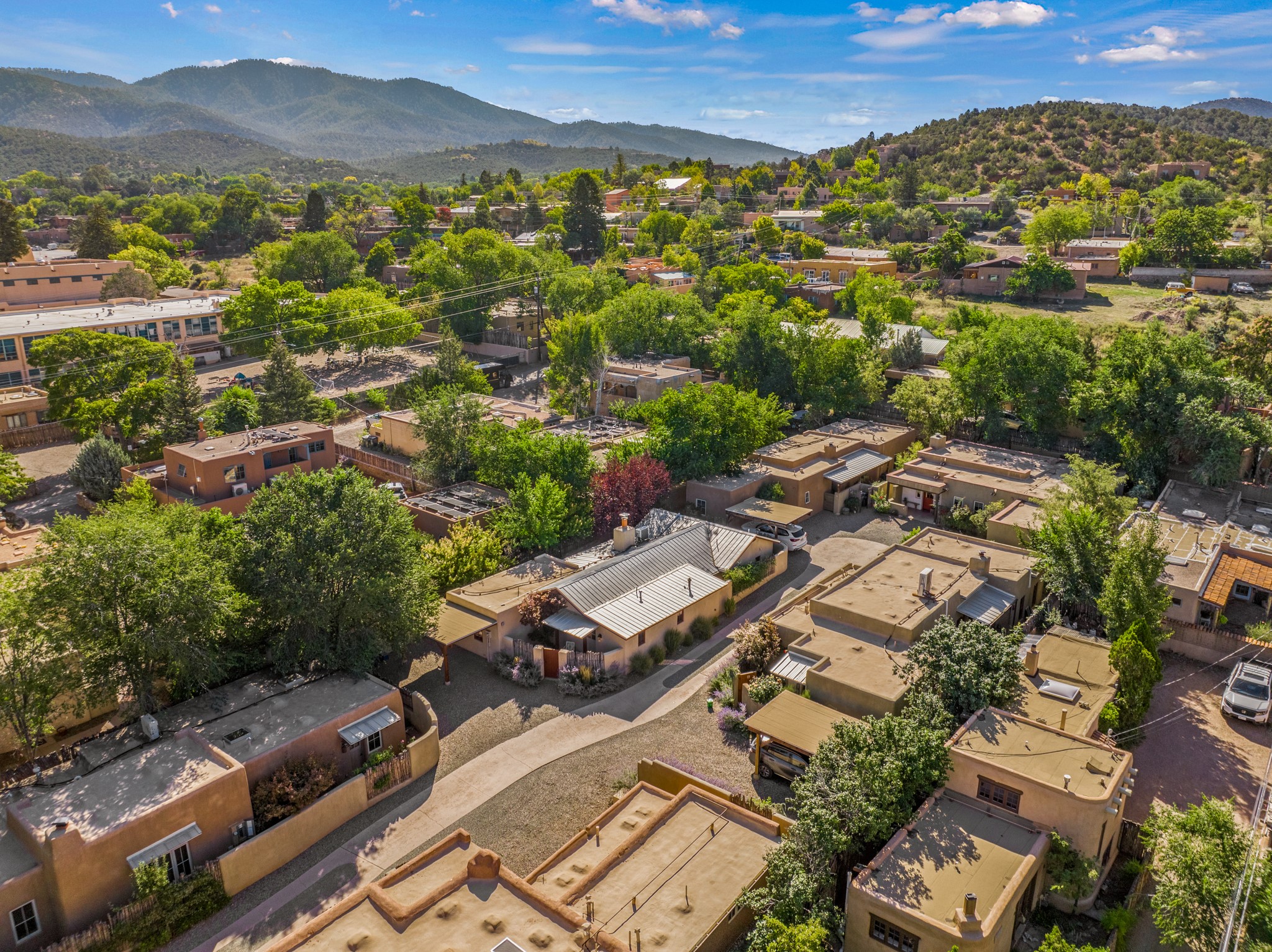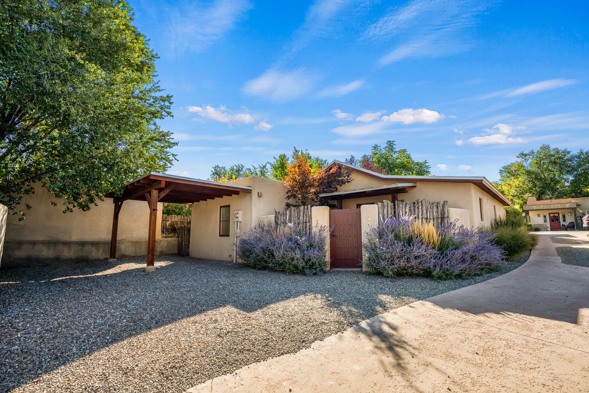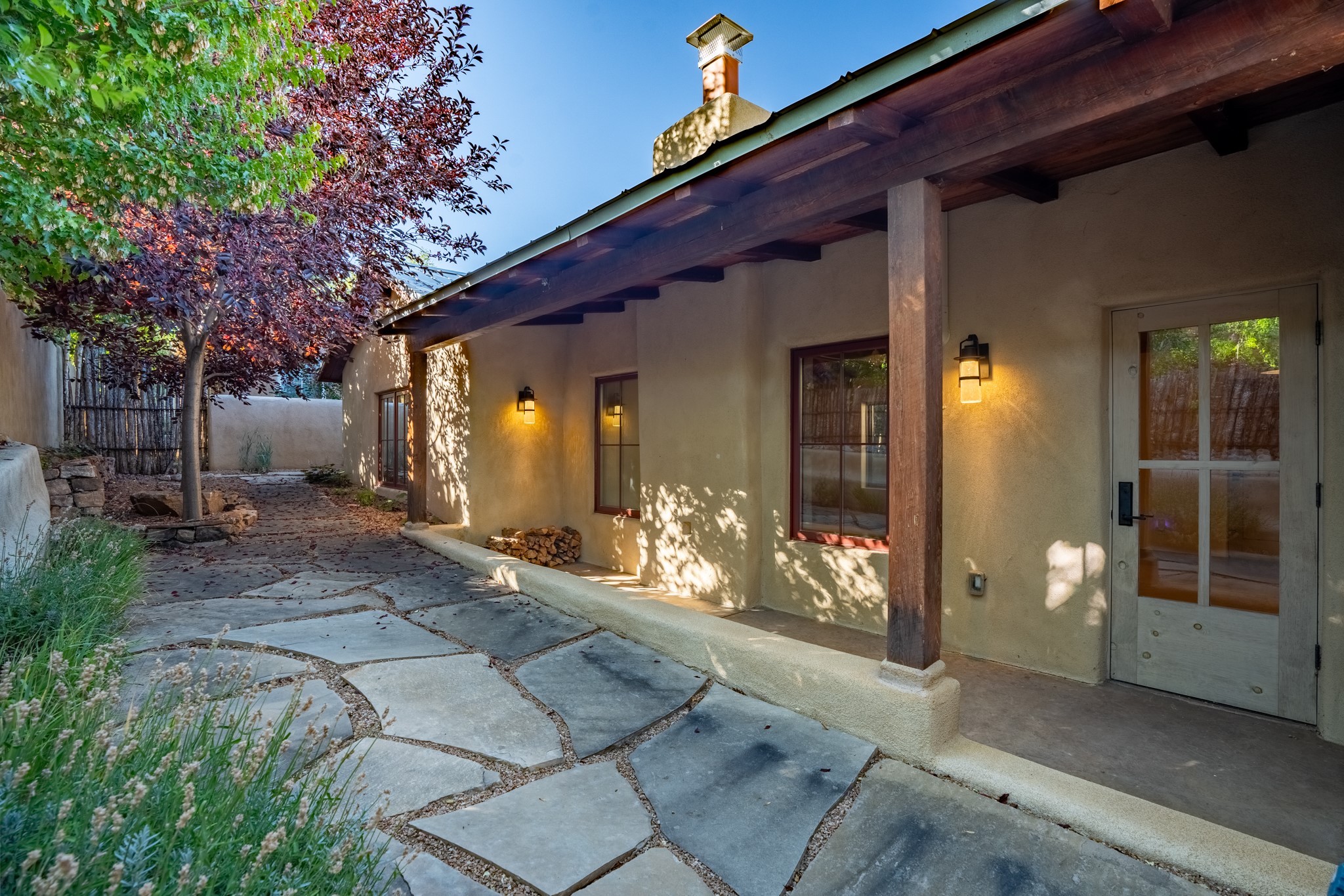 Exuding pride of ownership! Absolutely delightful and pristine 2 bedroom, 2 full bath home with 2 designated parking spaces (1 of which is a carport) single level downtown detached condo on Canyon Rd is minutes to the Santa Fe Plaza, Downtown Subscription, galleries, Patrick Smith Park & fine dining such as Geronimo, The Compound & many others. Charm and warmth abound this Northern New Mexico energy efficient (HERS rating of 53) adobe home built by True North Builders in 2014 with a pitched roof, plaster walls throughout including in the bedrooms and baths. This gem offers an open concept kitchen with granite counters, subway tile backsplash, soft close drawers/cabinets, stainless steel Jenn-air appliances, pantry with built-in shelving, and a breakfast bar. The living room is grand and offers high ceiling with beams and a wood burning fireplace. Both bathrooms are beautifully appointed with high end finishes. Owner's suite has an ensuite bath with double vanities, separate shower and tub and a custom-built walk-in closet. The outdoor spaces offer mature landscaping, drip irrigation, a private front entry walled and gated courtyard in addition to a sweet little yard with a large portal, flagstone patio, walk-way, various sitting areas and gardens. Features and amenities: Concrete floors-2nd bedroom with walk in closet-Ceiling fans-Wood doors-Security system-Radiant in floor heat-Mini splits-Water filtration system at kitchen sink faucet-Hard wired smoke & carbon monoxide detectors-Track lighting-Large laundry room with washer and dryer-Good bedroom separation-Plenty of storage and more. Short term rentals permitted by COA.