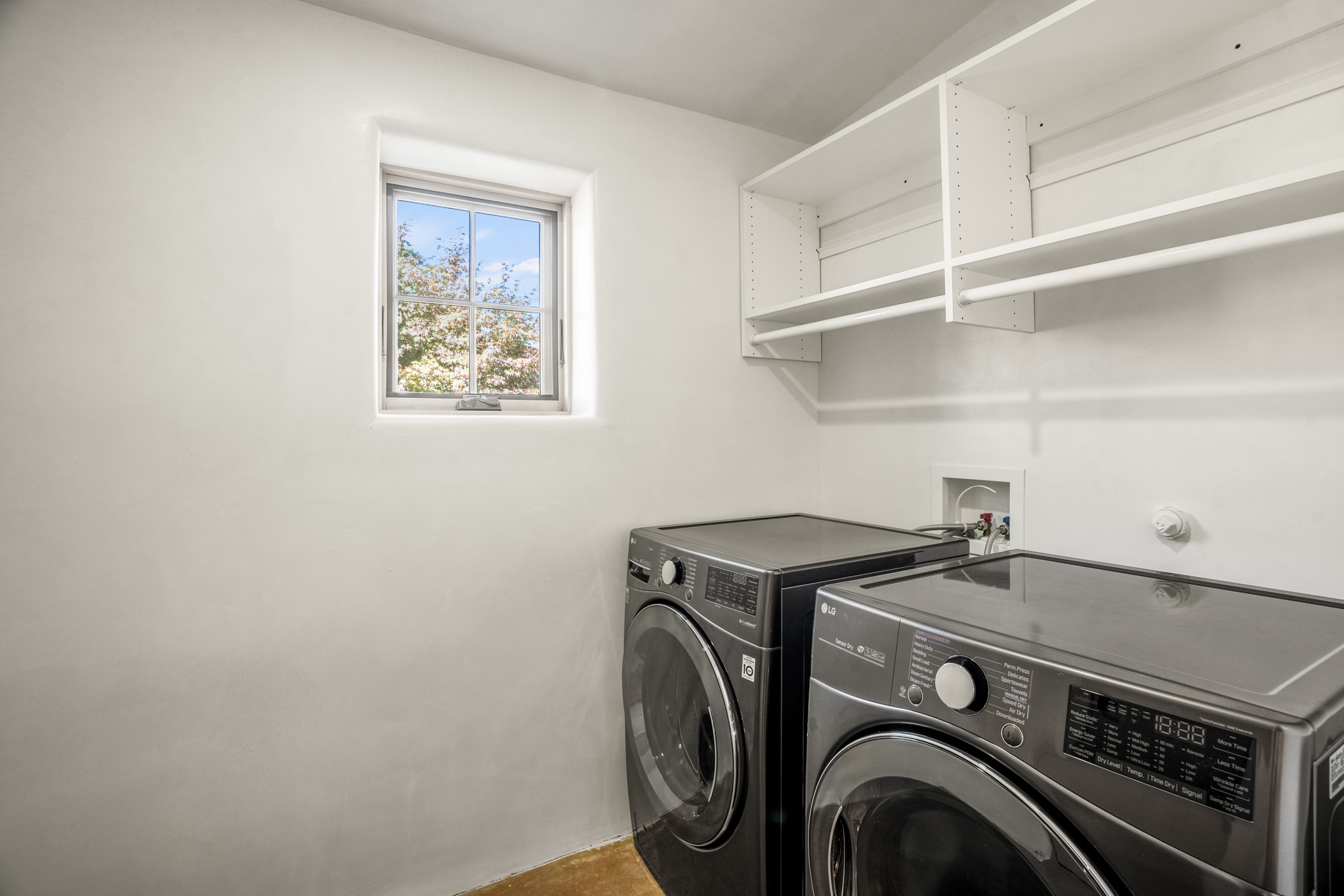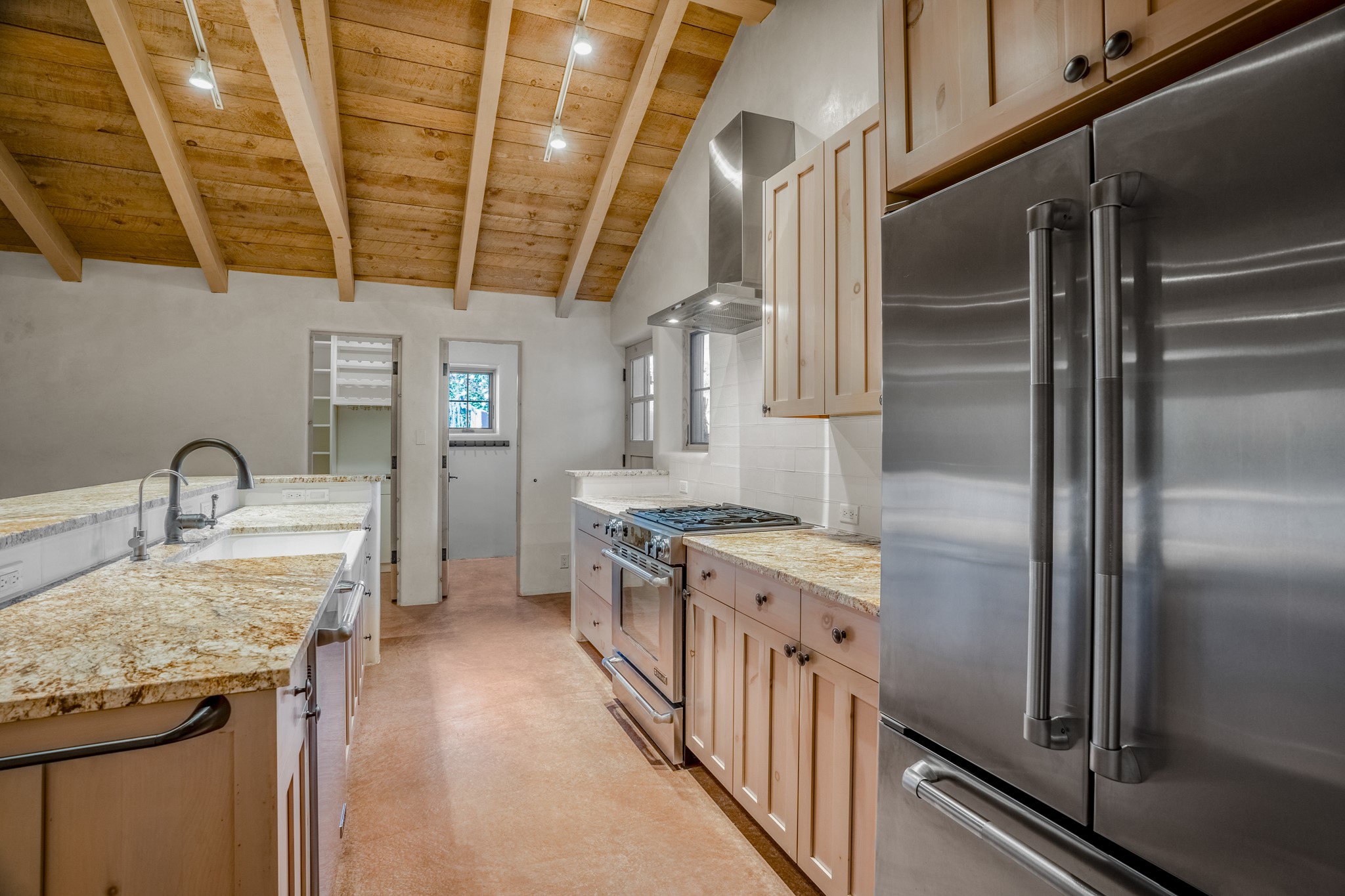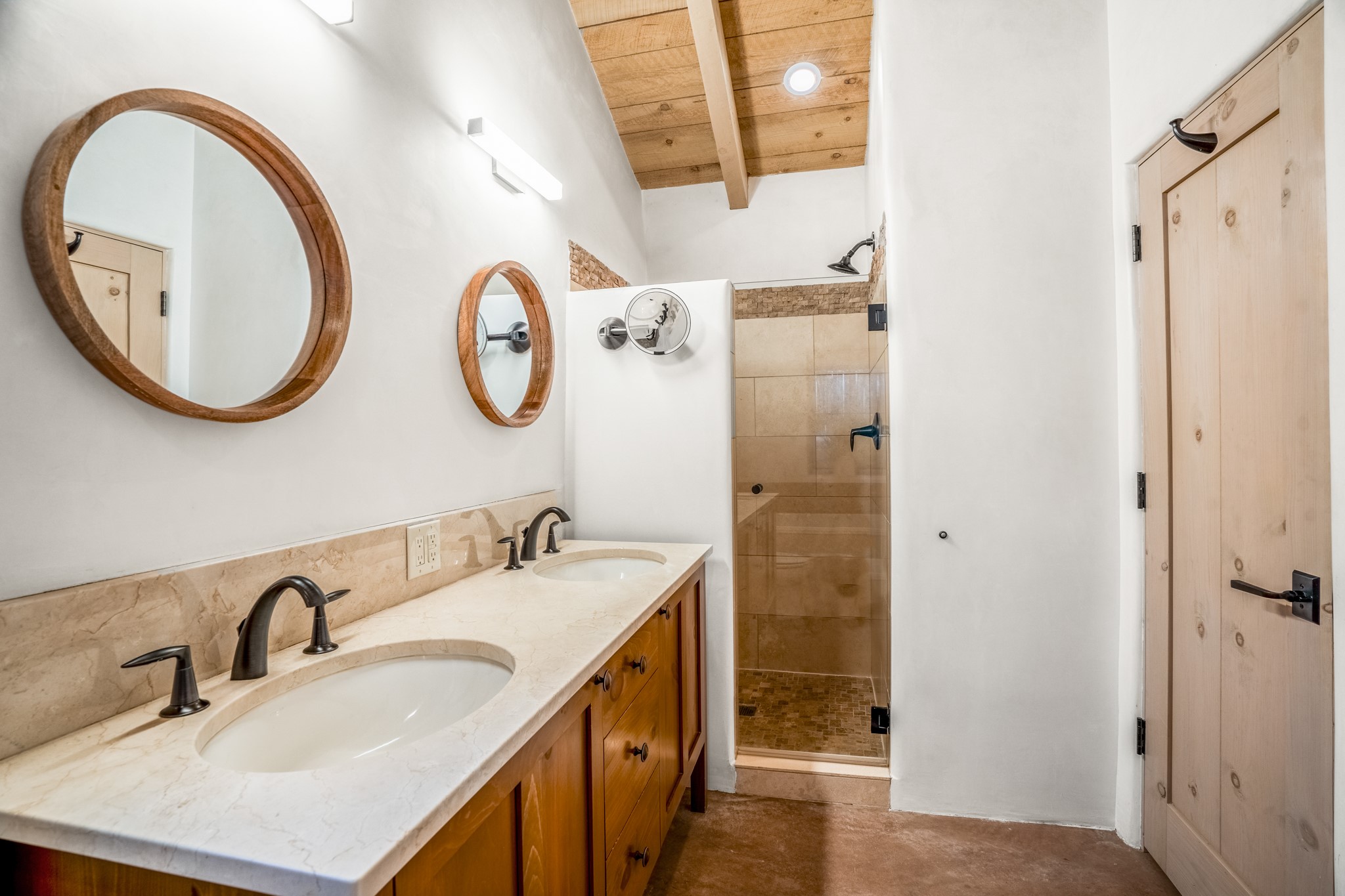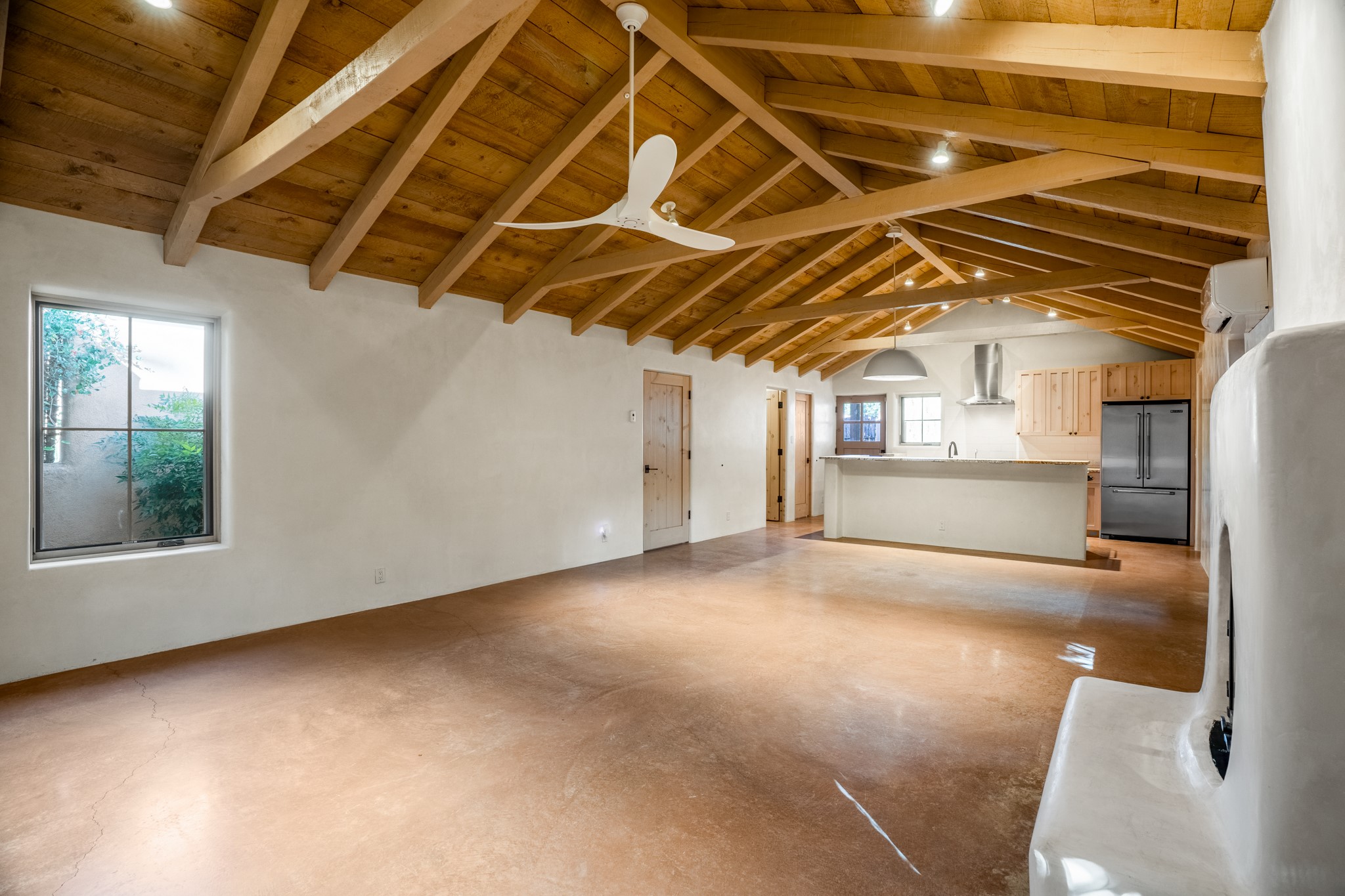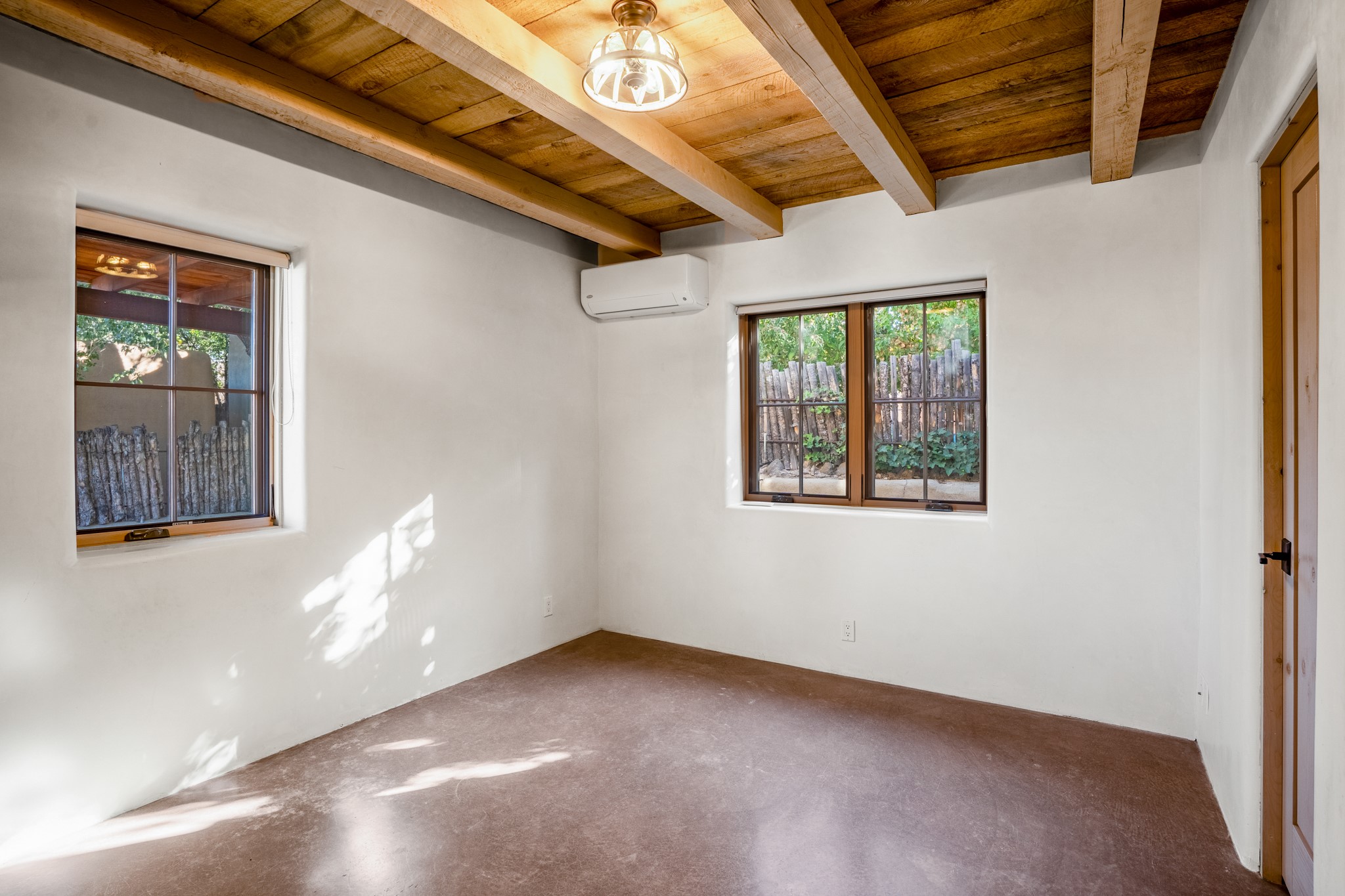 Exuding pride of ownership! Absolutely delightful and pristine 2 bedroom, 2 full bath home with 2 designated parking spaces (1 of which is a carport) single level downtown detached condo on Canyon Rd is minutes to the Santa Fe Plaza, Downtown Subscription, galleries, Patrick Smith Park & fine dining such as Geronimo, The Compound & many others. Charm and warmth abound this Northern New Mexico energy efficient (HERS rating of 53) adobe home built by True North Builders in 2014 with a pitched roof, plaster walls throughout including in the bedrooms and baths. This gem offers an open concept kitchen with granite counters, subway tile backsplash, soft close drawers/cabinets, stainless steel Jenn-air appliances, pantry with built-in shelving, and a breakfast bar. The living room is grand and offers high ceiling with beams and a wood burning fireplace. Both bathrooms are beautifully appointed with high end finishes. Owner's suite has an ensuite bath with double vanities, separate shower and tub and a custom-built walk-in closet. The outdoor spaces offer mature landscaping, drip irrigation, a private front entry walled and gated courtyard in addition to a sweet little yard with a large portal, flagstone patio, walk-way, various sitting areas and gardens. Features and amenities: Concrete floors-2nd bedroom with walk in closet-Ceiling fans-Wood doors-Security system-Radiant in floor heat-Mini splits-Water filtration system at kitchen sink faucet-Hard wired smoke & carbon monoxide detectors-Track lighting-Large laundry room with washer and dryer-Good bedroom separation-Plenty of storage and more. Short term rentals permitted by COA.