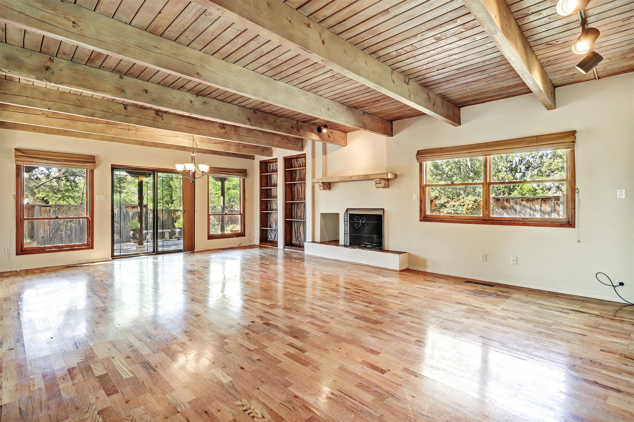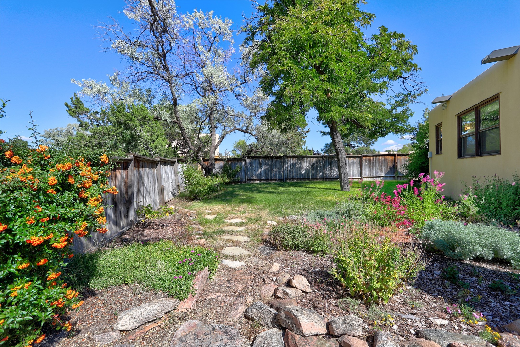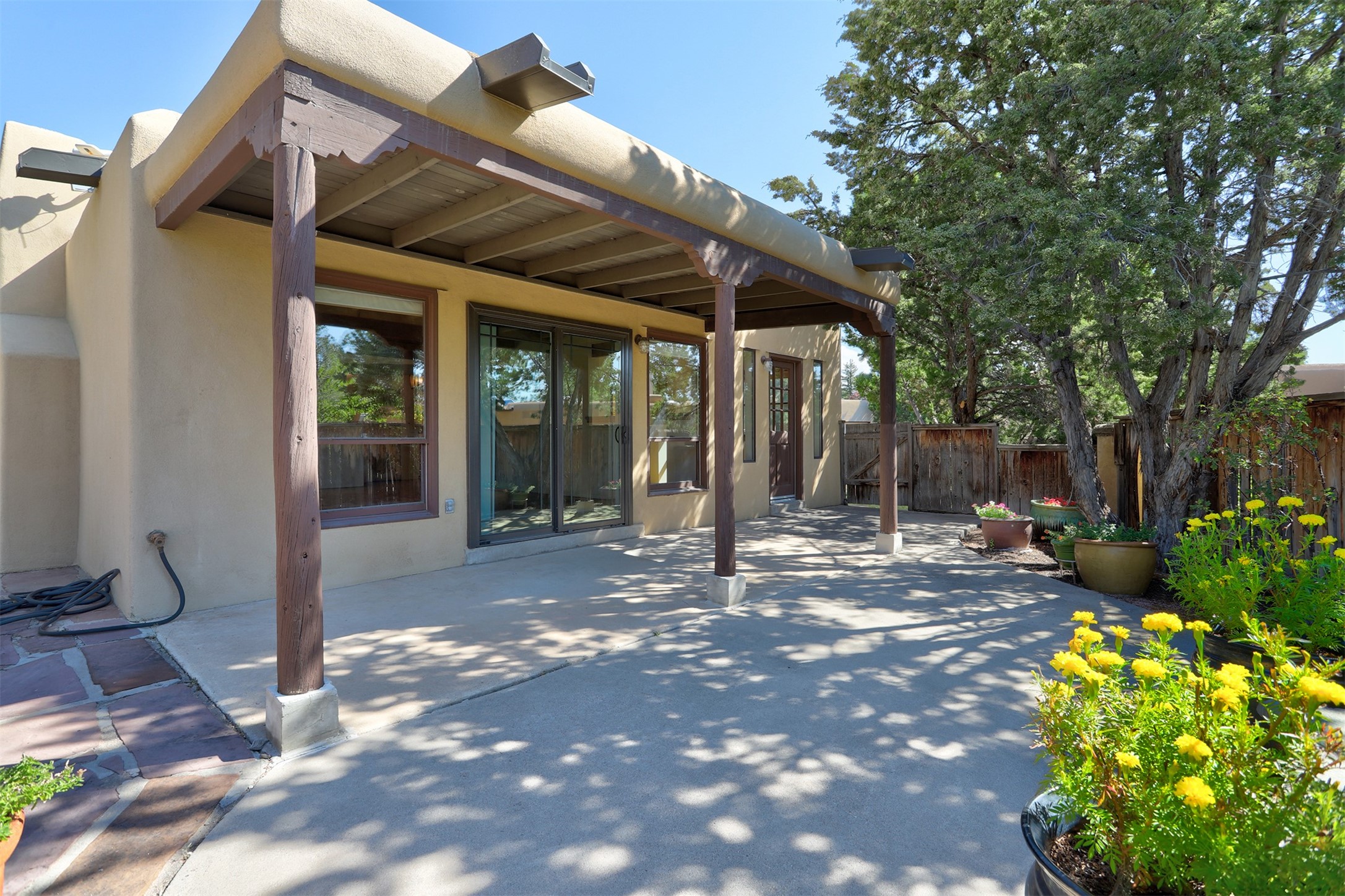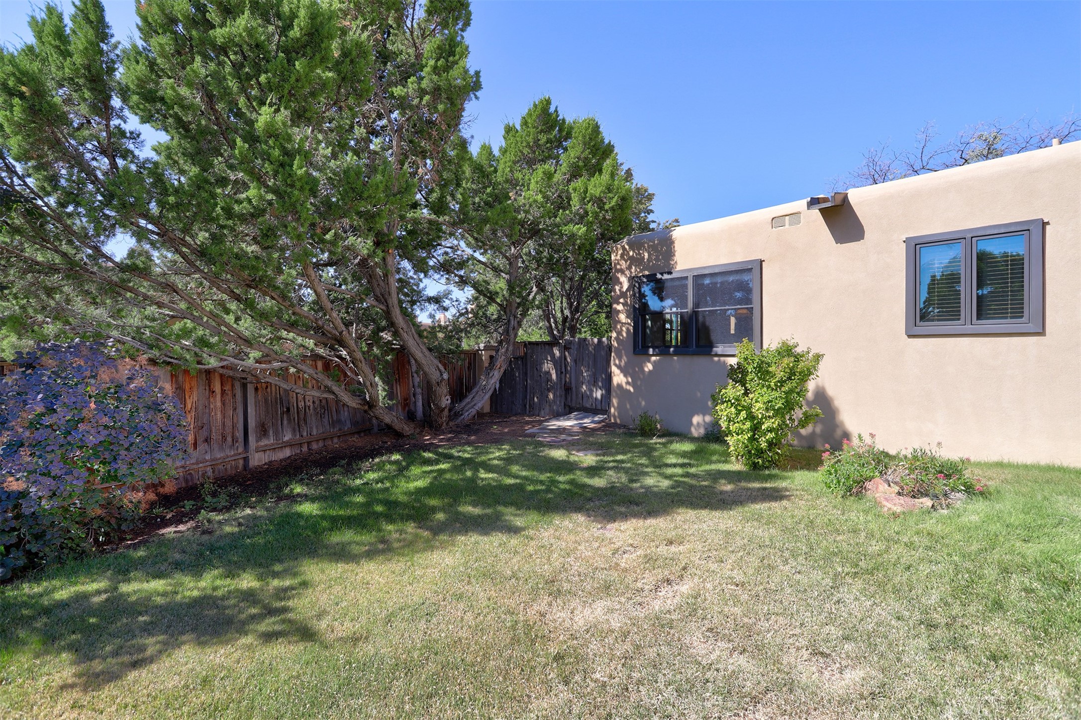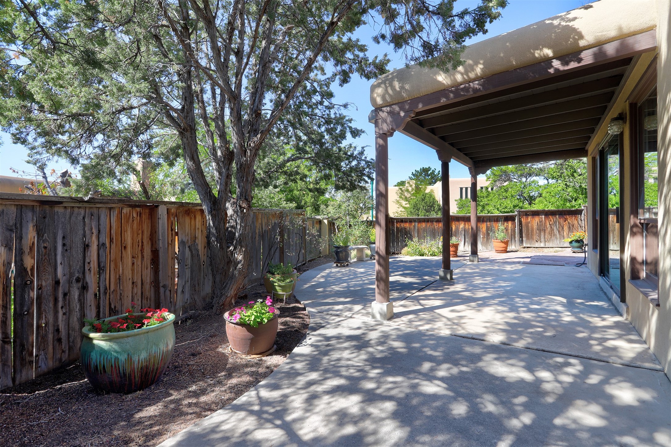 BACK ON MARKET, no fault of the seller! Nestled at the end of a very quiet cul de sac, you will find this well-kept Park Plaza home. This 1895 sq ft, free-standing, single level, 3 bedroom, 2 bathroom comes with an additional home office.As soon as you enter the home, you will notice the beautifullywarm wooden floors and white-washed wooden beamedceilings in the living room, dining room, and kitchen nook that give the open floor plan a warm and rustic feel. The spacious, well-lighted living room with a wood-burning fireplace opens up to the large covered portal and a fenced landscaped private garden. The stucco was recentlyredone, a newer Pella sliding door and some newer windows were installed, newer carpet, updated bathrooms, minsplit, and sprinkler system were installed in front and back yard, a new water heater in 2022, and a newer gas range and beverage cooler were installed.Just from the frontdoor, you have easy access tothe beautiful 8-mile-long walking trail system that runs around the property with open spaces, mature trees, and natural landscaping. This desirable community has much to offer for its residents, from tennis and pickleball courts, community gardens, walking/running trails, an off-leashdog park, RV storage, etc. It is conveniently located close to the state-of-the-art GCCC community center, shopping malls, restaurants, supermarkets, hospitals, and medical offices, and only 15 minutes from the Santa Fe Plaza.Come and check out this hidden communityon a natural 154 acres. You can live in a beautiful "green place" in the heart of Santa Fe.