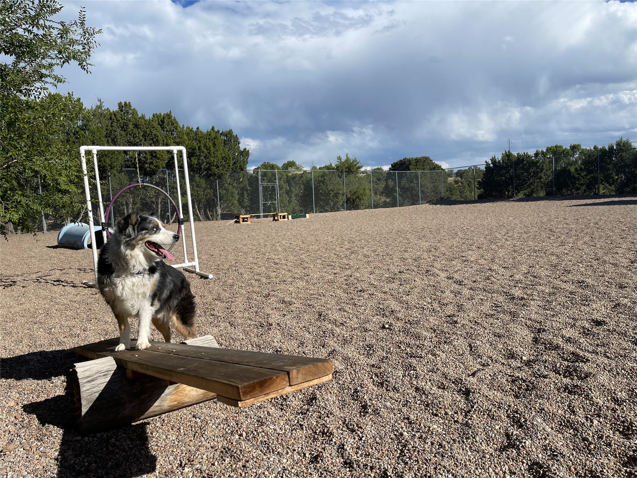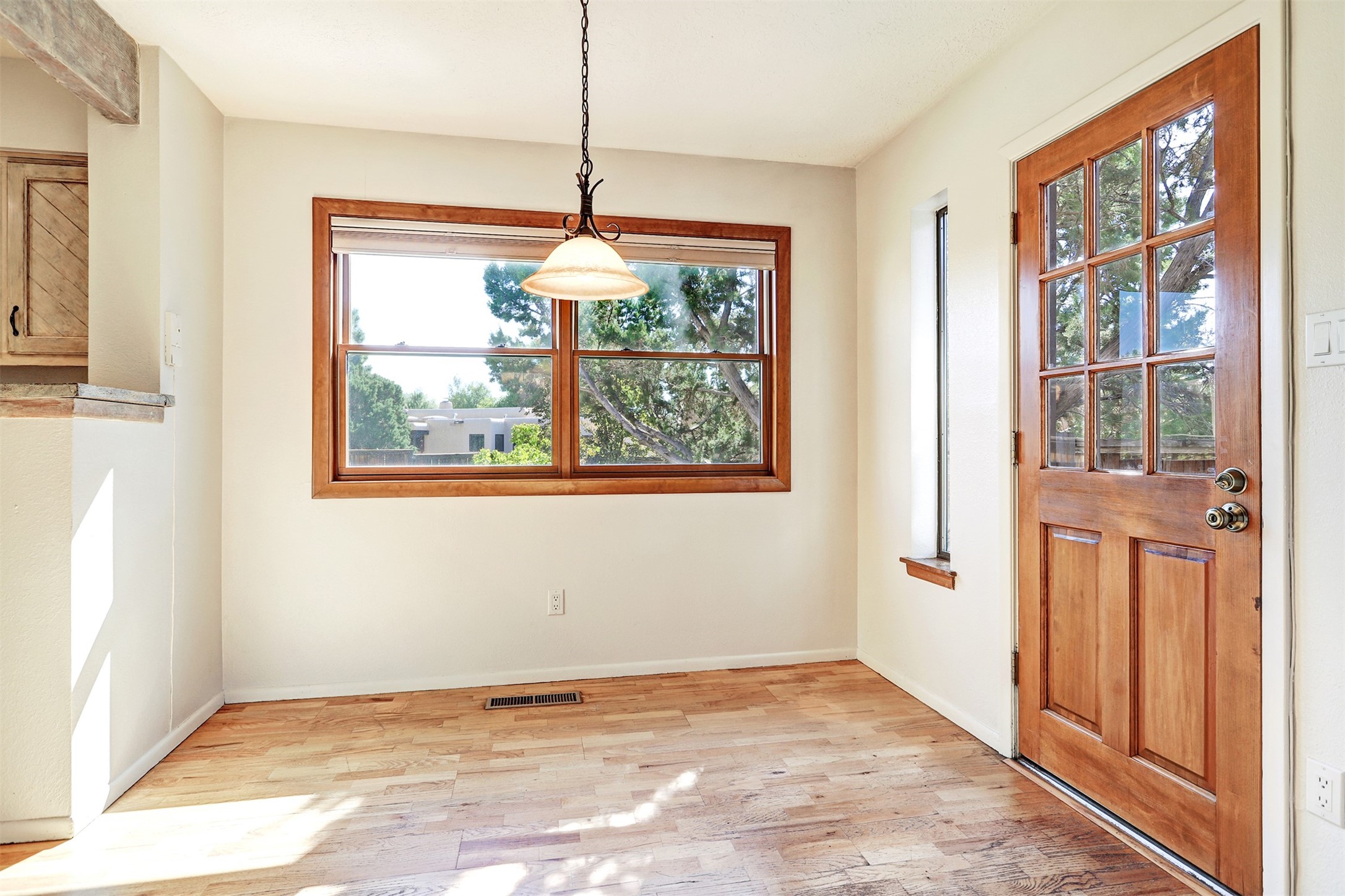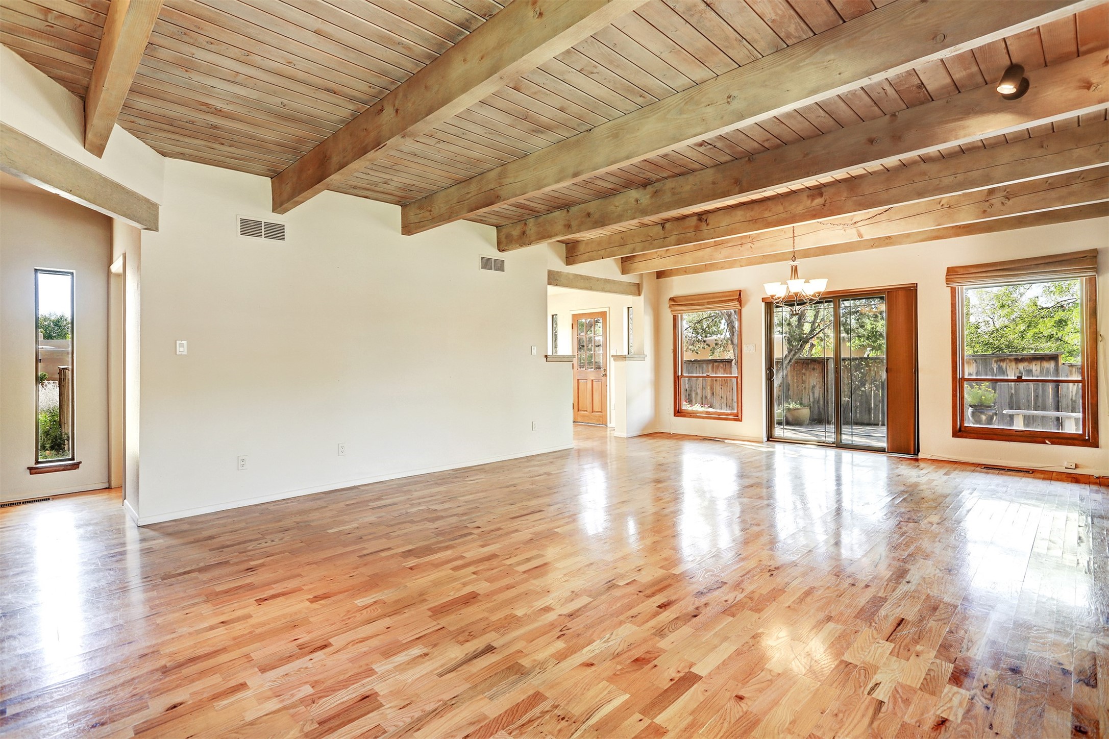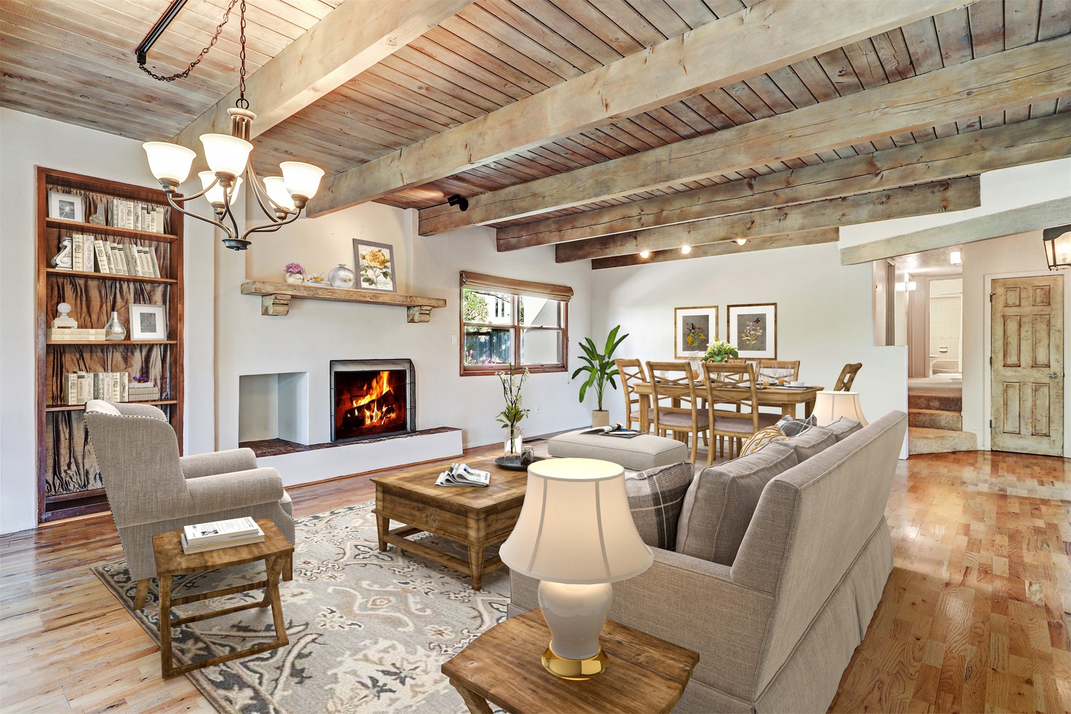BACK ON MARKET, no fault of the seller! Nestled at the end of a very quiet cul de sac, you will find this well-kept Park Plaza home. This 1895 sq ft, free-standing, single level, 3 bedroom, 2 bathroom comes with an additional home office.As soon as you enter the home, you will notice the beautifullywarm wooden floors and white-washed wooden beamedceilings in the living room, dining room, and kitchen nook that give the open floor plan a warm and rustic feel. The spacious, well-lighted living room with a wood-burning fireplace opens up to the large covered portal and a fenced landscaped private garden. The stucco was recentlyredone, a newer Pella sliding door and some newer windows were installed, newer carpet, updated bathrooms, minsplit, and sprinkler system were installed in front and back yard, a new water heater in 2022, and a newer gas range and beverage cooler were installed.Just from the frontdoor, you have easy access tothe beautiful 8-mile-long walking trail system that runs around the property with open spaces, mature trees, and natural landscaping. This desirable community has much to offer for its residents, from tennis and pickleball courts, community gardens, walking/running trails, an off-leashdog park, RV storage, etc. It is conveniently located close to the state-of-the-art GCCC community center, shopping malls, restaurants, supermarkets, hospitals, and medical offices, and only 15 minutes from the Santa Fe Plaza.Come and check out this hidden communityon a natural 154 acres. You can live in a beautiful "green place" in the heart of Santa Fe.