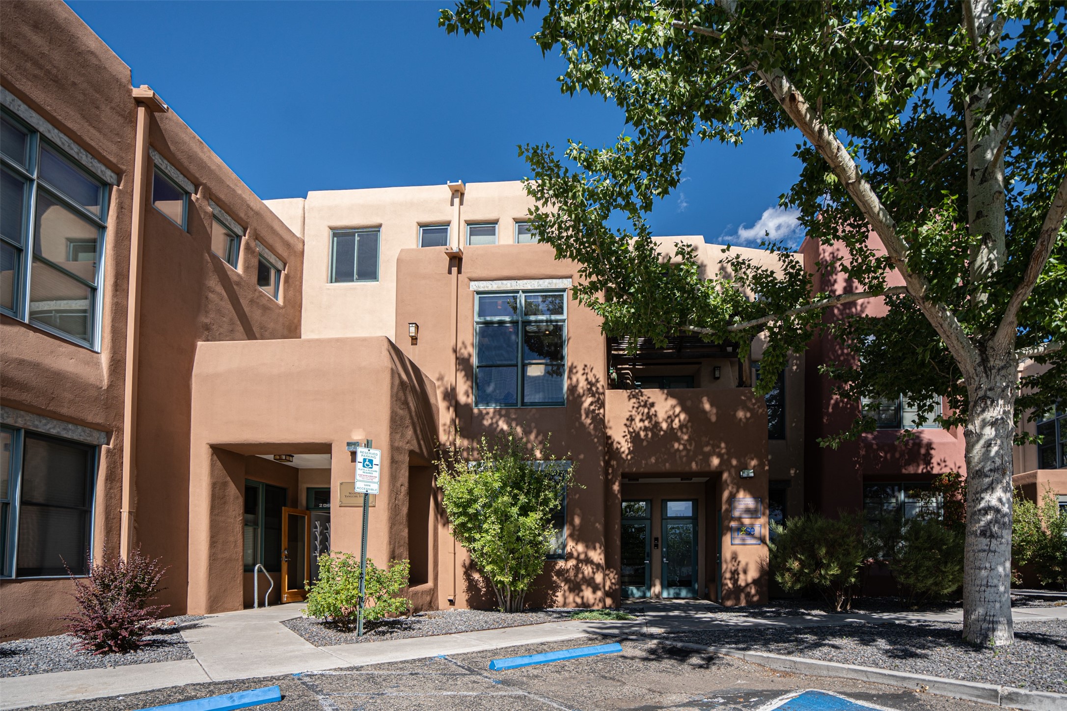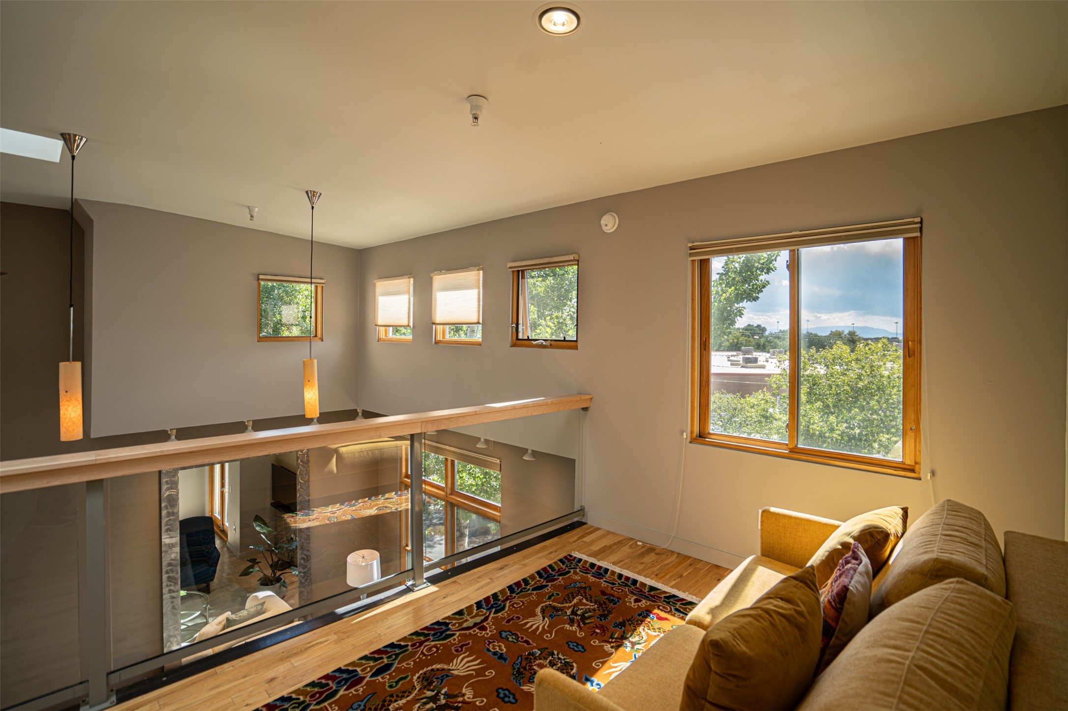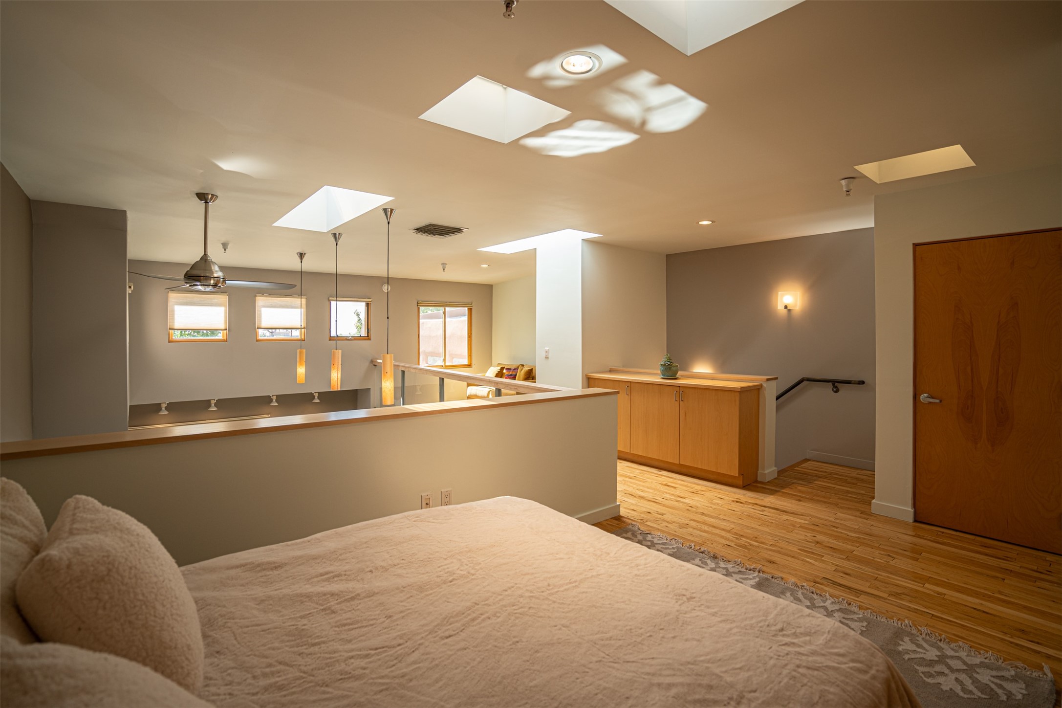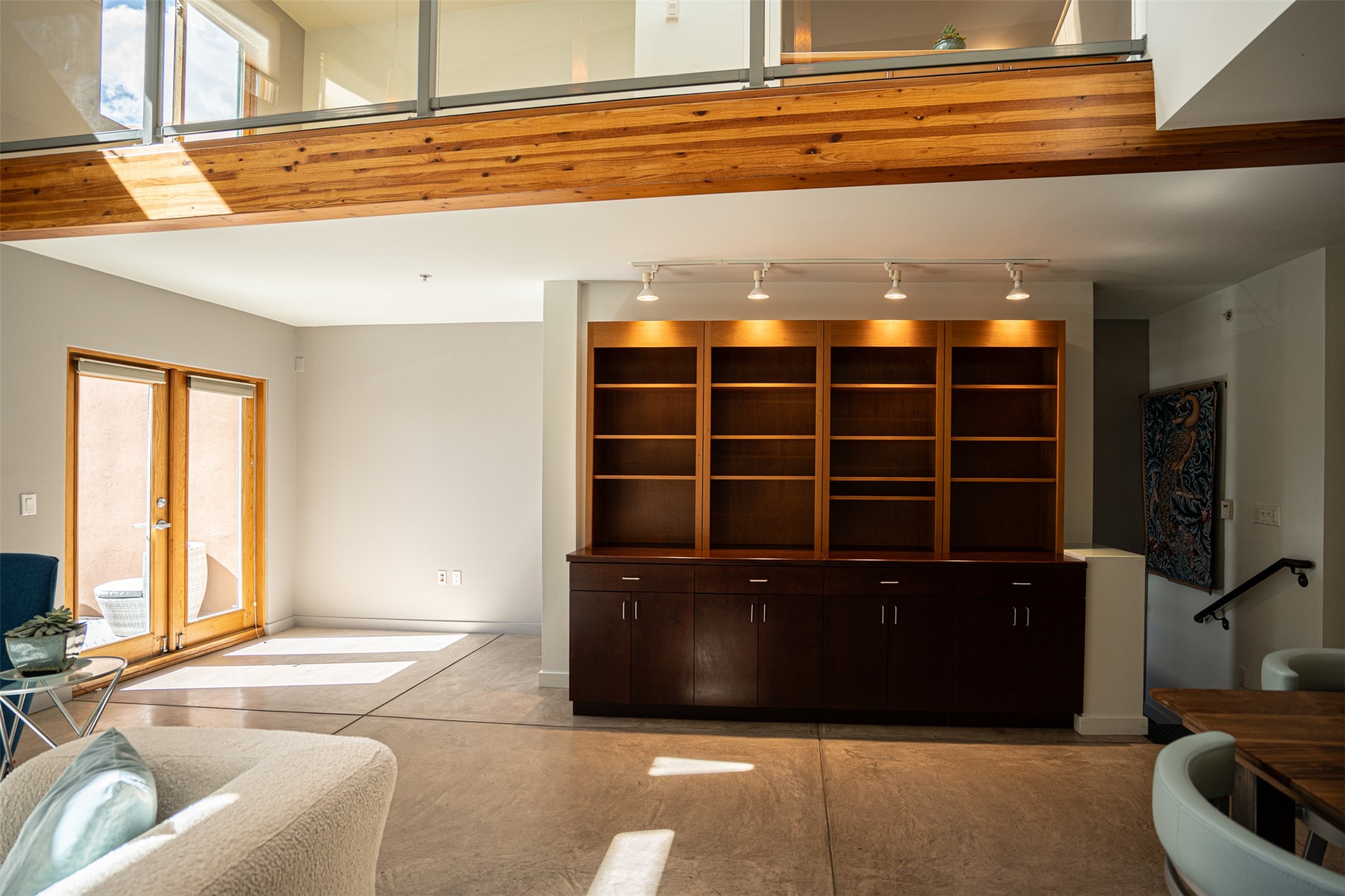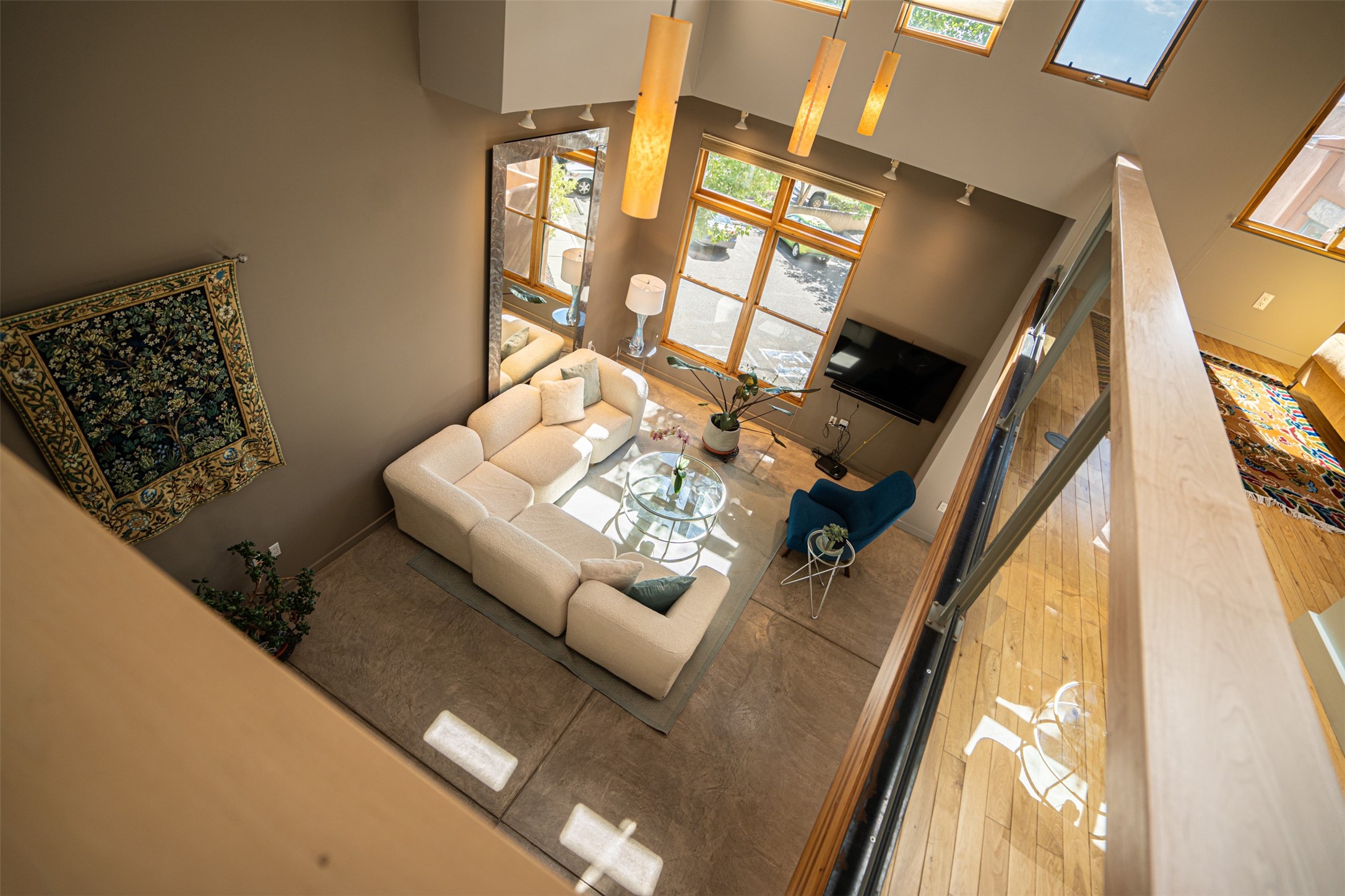 Stylish Marquez Place Loft with Abundant Sunshine! This south-facing loft have abundance of natural light. Its location is incredibly convenient, situated near the Cordova Road Corridor and the charming Guadalupe District. You'll find Trader Joe's, Clafoutis, and the Santa Fe Baking Company all within easy walking distance. The open floor plan offers versatility for both residential and mixed-use purposes. With two loft areas that can serve as bedrooms, offices, or a combination of both. This property is an excellent fit for live/work professionals or anyone seeking an exciting Santa Fe pied--terre or a second home. Sophisticated and comfortable. Nice-sized living area with contemporary kitchen cabinets and countertops. Roomy dining and living areas, with built-in shelving units for storage and display. Master suite is in the loft. Powder room downstairs; full bath upstairs. Wood floors, tons of light, and balcony provides outdoor living space. This unit is very sleek, modern and has that cool factor! Just minutes away from the historic downtown Plaza, museums, and world-class dining options!
