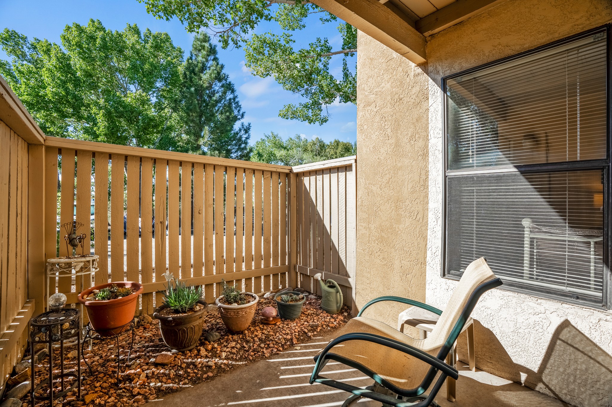 LOCATION, LOCATION , LOCATION...... This charming, 2 bedroom, 2 bath, ground floor unit is in the first building to the right as you enter the compound overlooking beautiful, large shade trees, (not other buildings) offering tons of privacy. It is right next to the walking trails, easy access to all of the Reserve Compound's amenities. The Reserve offers a year round swimming pool, a hot tub, fitness center, a mail center and laundry facilities on 16 acres of a mature park-like setting with privacy, ample car and bicycle parking (small pets 25 lbs and under are allowed). All this just minutes from the Historic Plaza, downtown area and exciting RailYard Area!This unit is being offered fully furnished (a few pieces and some art will not stay). It has been updated with granite counter tops in the kitchen and both bathrooms, the vinyl wood flooring is newer)....many special touches throughout. The patio area is very inviting and private. Roof, stucco, and landscaping are maintained by the HOA. No rentals are allowed under 30 days within the HOA. For more information, check out: https://www.reserveatsantafe.org/condos-available.html