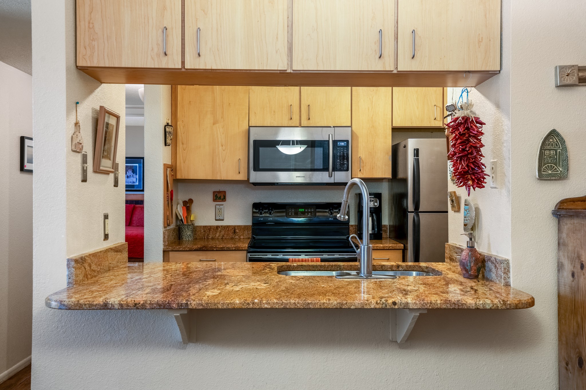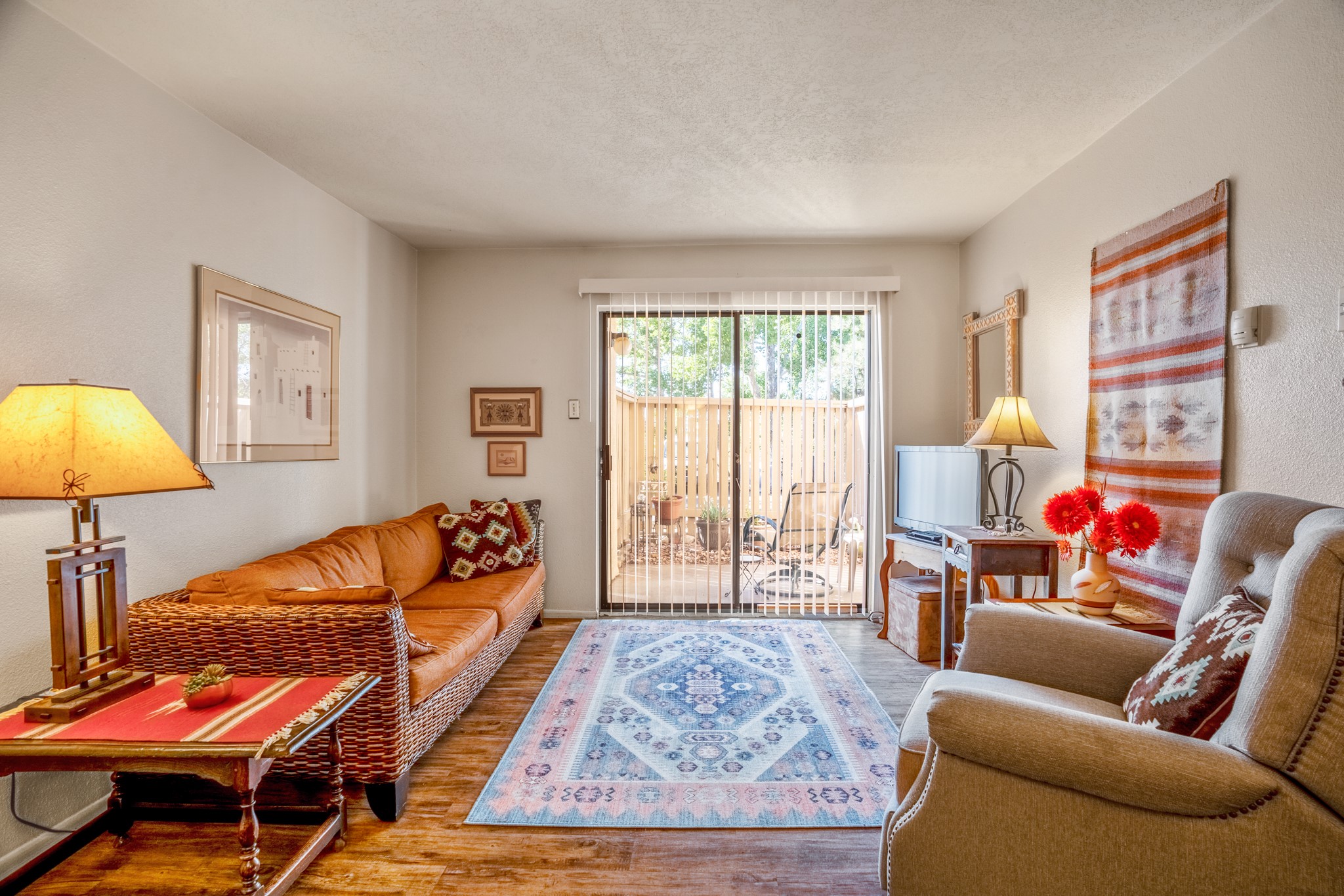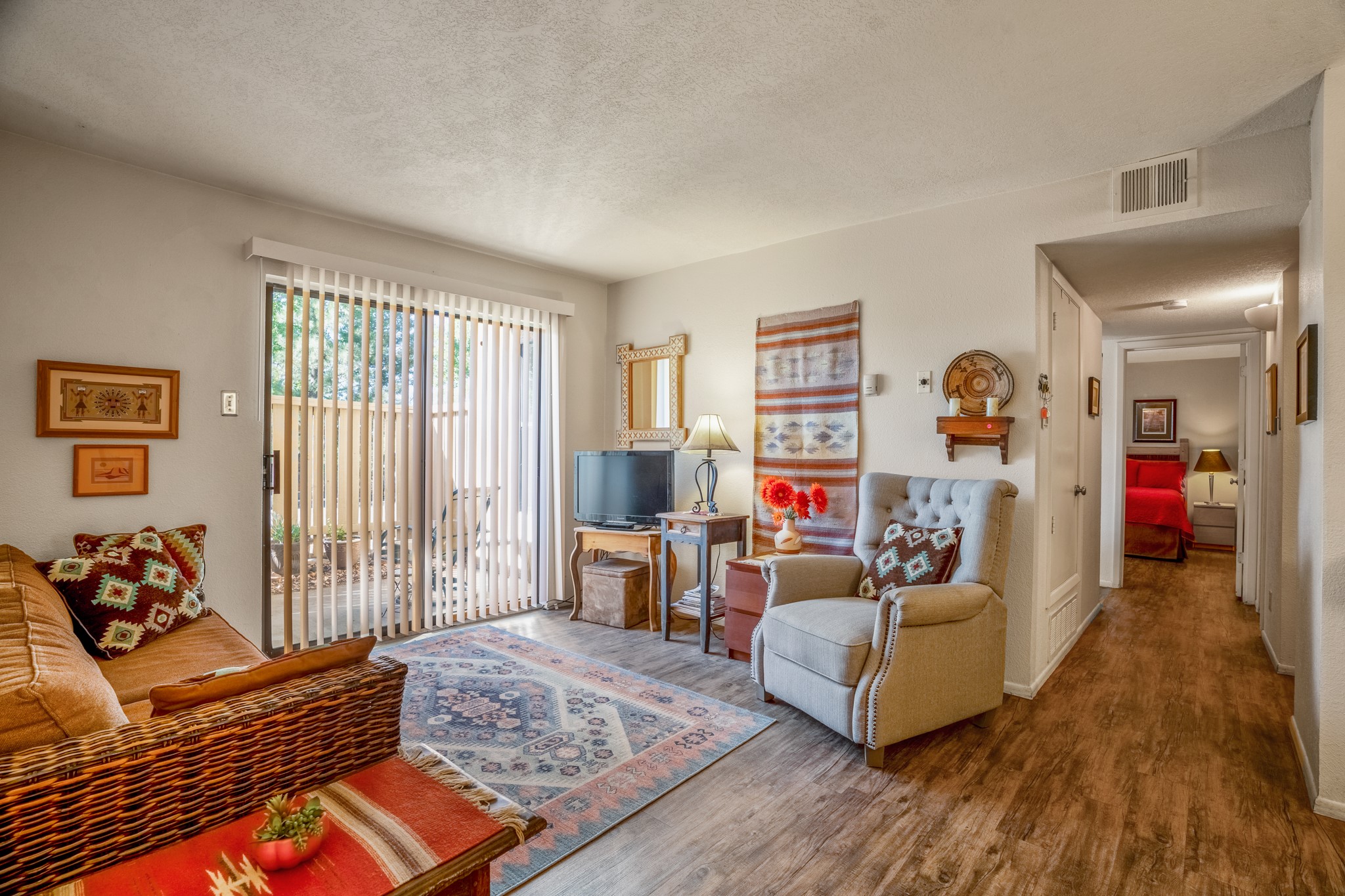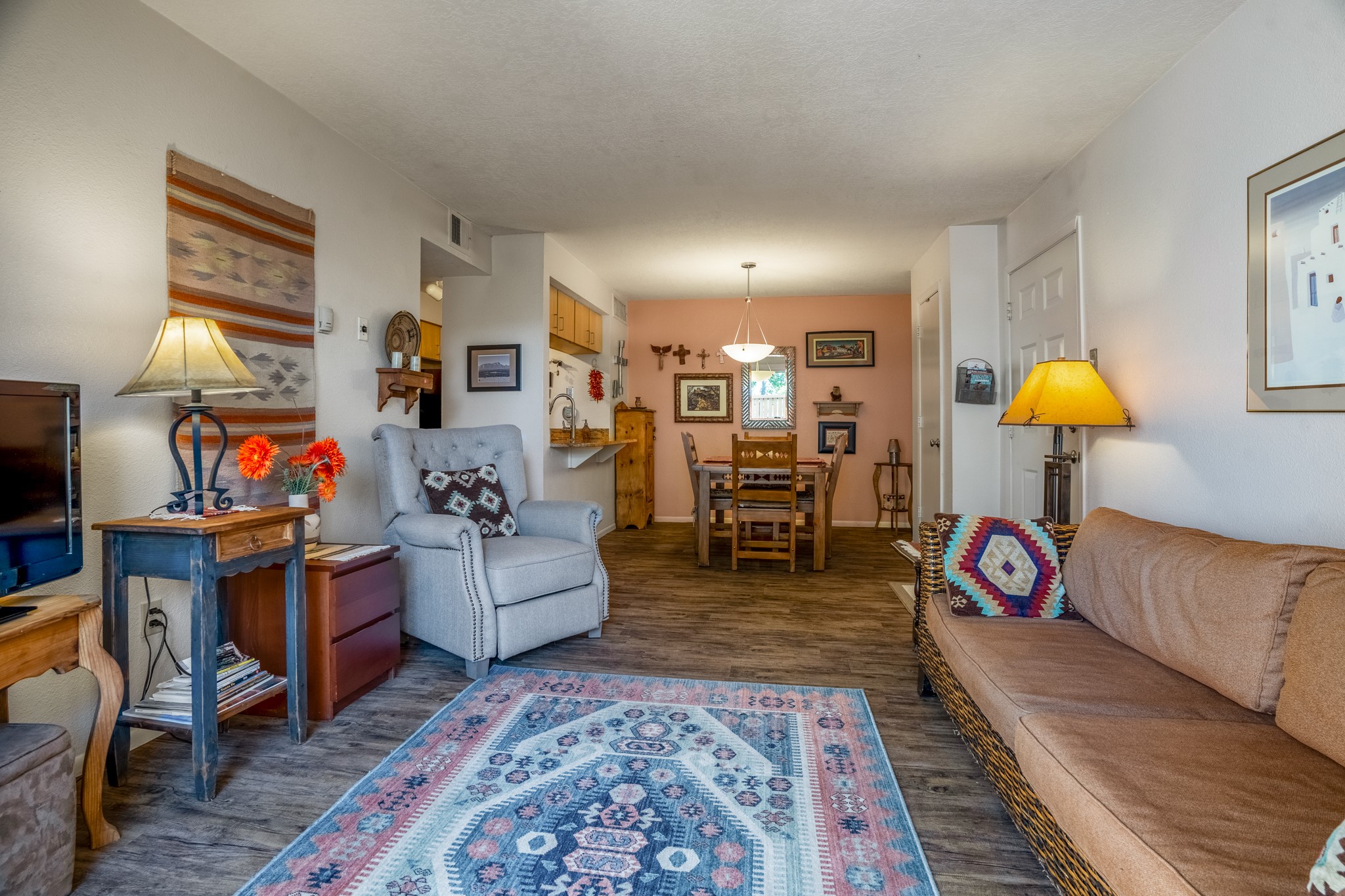 LOCATION, LOCATION , LOCATION...... This charming, 2 bedroom, 2 bath, ground floor unit is in the first building to the right as you enter the compound overlooking beautiful, large shade trees, (not other buildings) offering tons of privacy. It is right next to the walking trails, easy access to all of the Reserve Compound's amenities. The Reserve offers a year round swimming pool, a hot tub, fitness center, a mail center and laundry facilities on 16 acres of a mature park-like setting with privacy, ample car and bicycle parking (small pets 25 lbs and under are allowed). All this just minutes from the Historic Plaza, downtown area and exciting RailYard Area!This unit is being offered fully furnished (a few pieces and some art will not stay). It has been updated with granite counter tops in the kitchen and both bathrooms, the vinyl wood flooring is newer)....many special touches throughout. The patio area is very inviting and private. Roof, stucco, and landscaping are maintained by the HOA. No rentals are allowed under 30 days within the HOA. For more information, check out: https://www.reserveatsantafe.org/condos-available.html