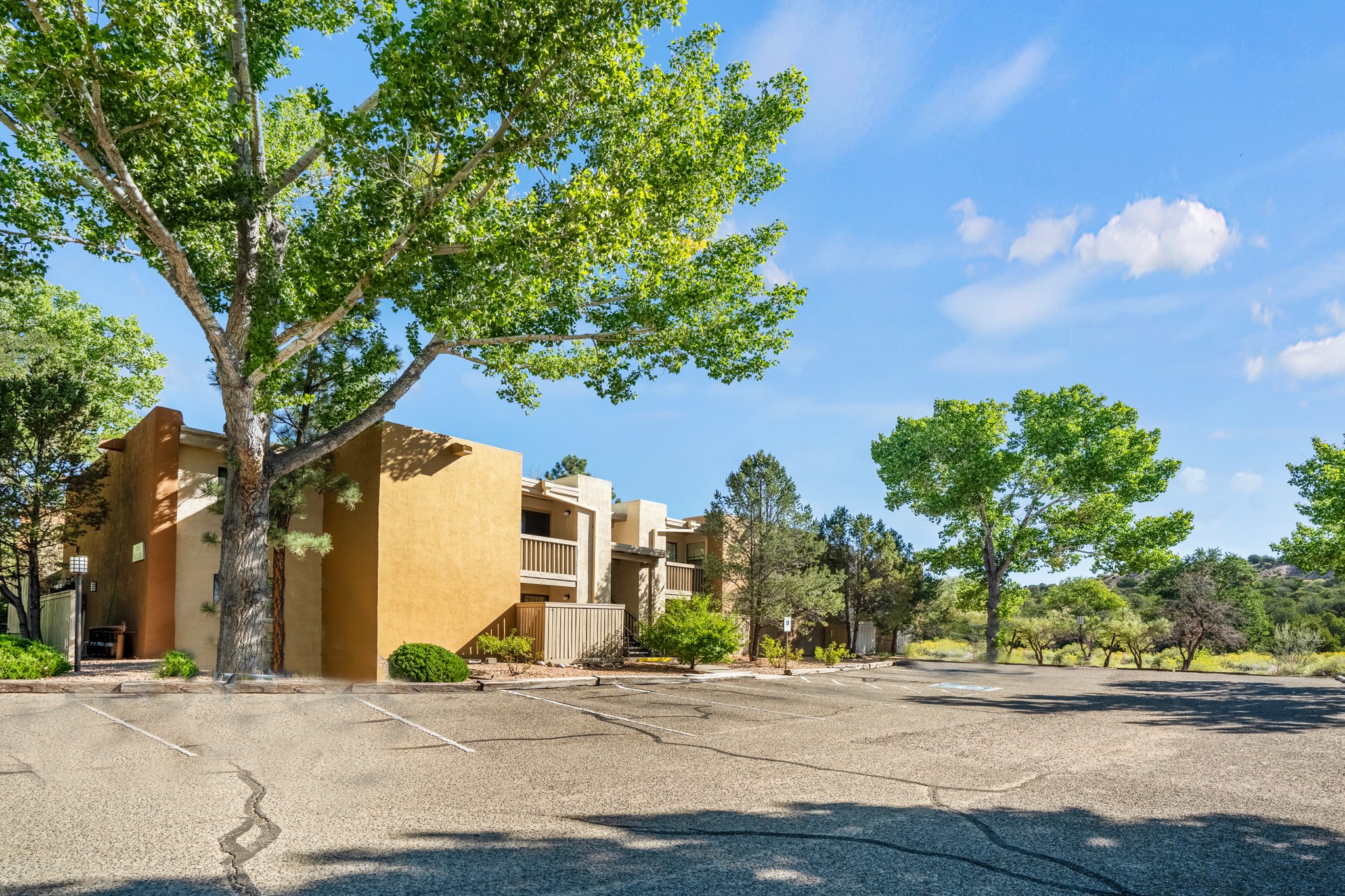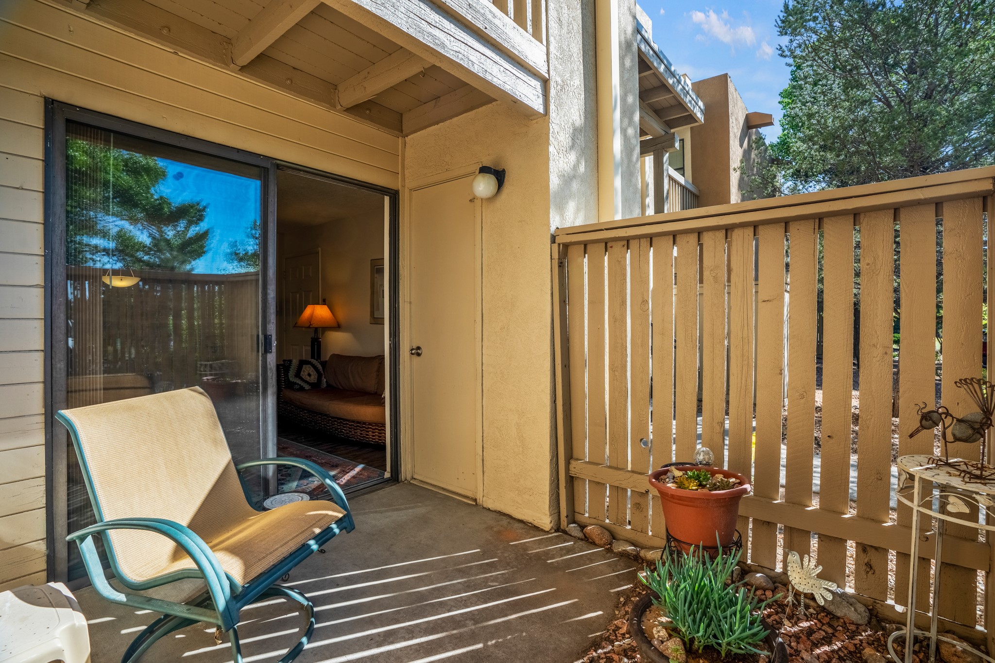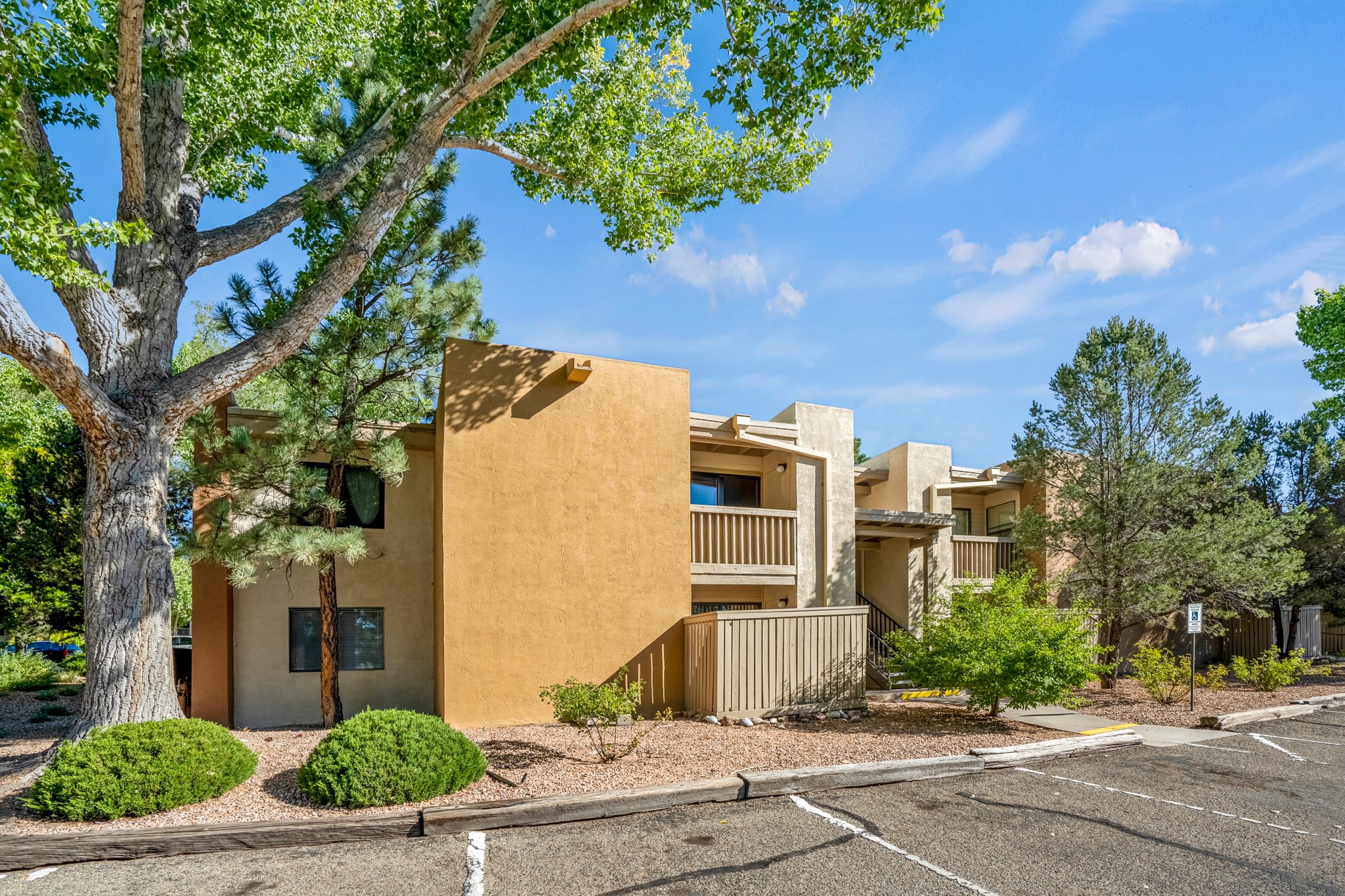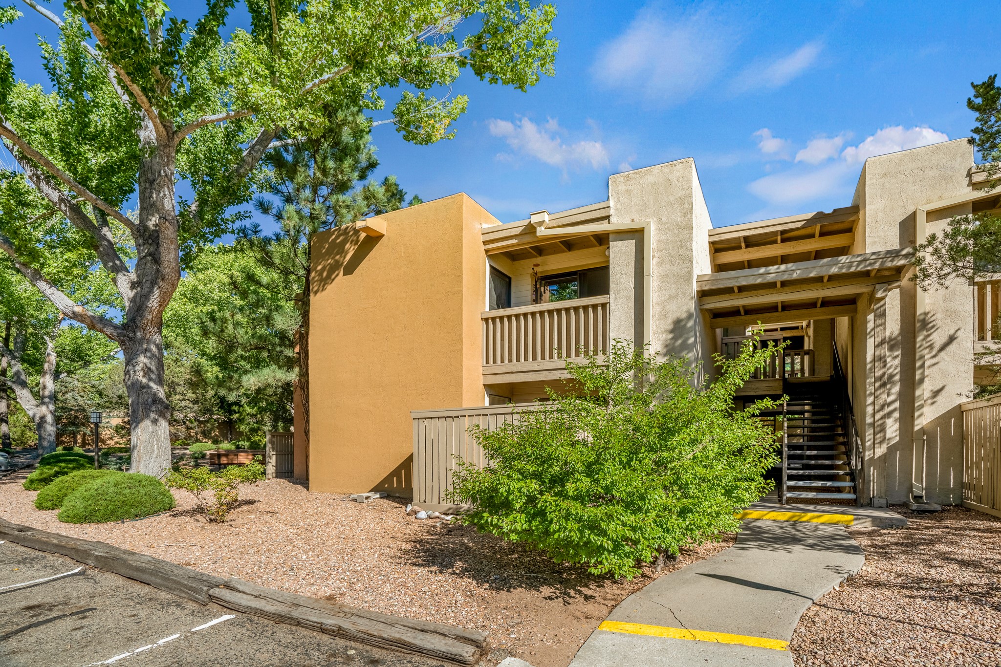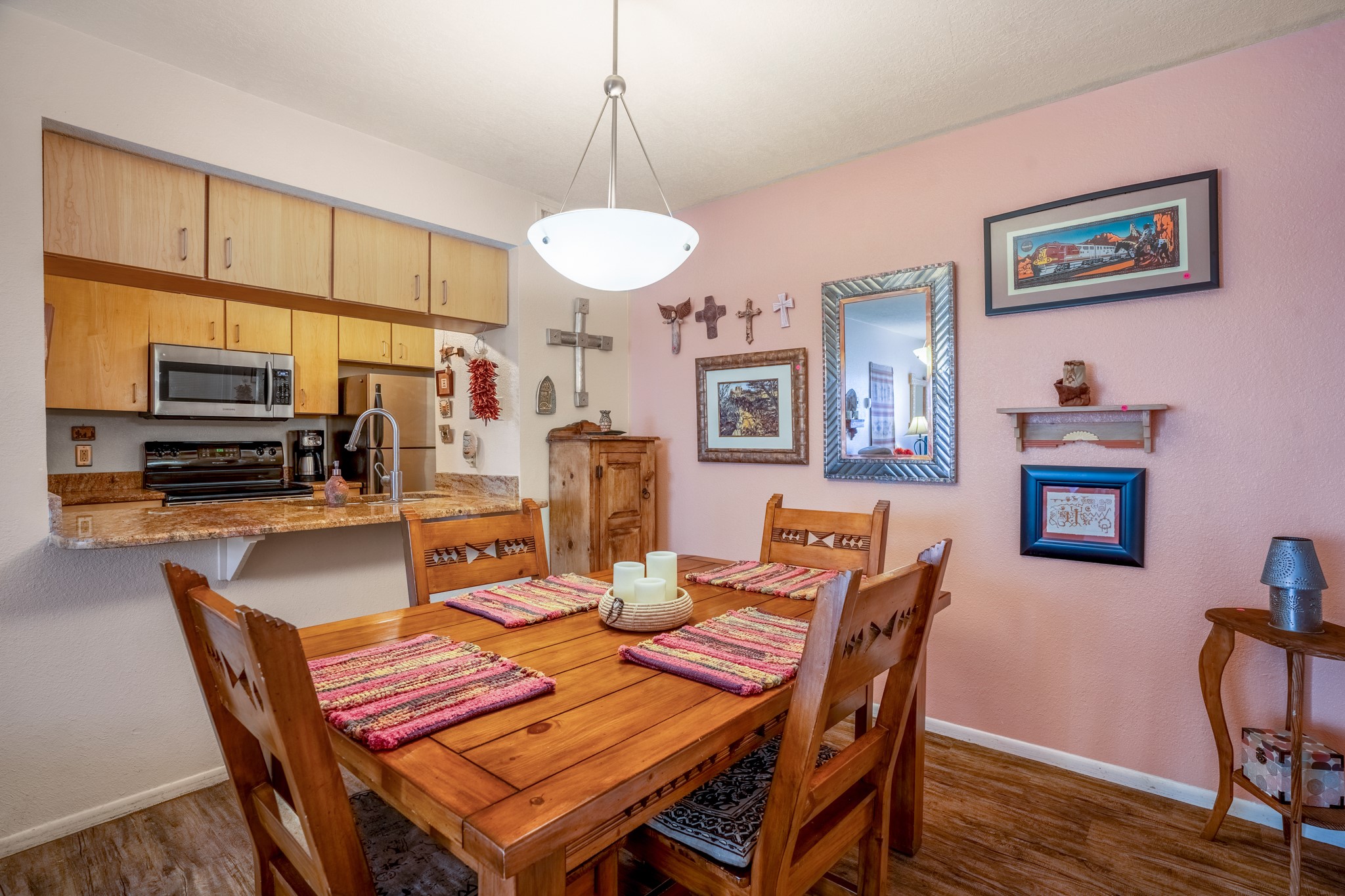 LOCATION, LOCATION , LOCATION...... This charming, 2 bedroom, 2 bath, ground floor unit is in the first building to the right as you enter the compound overlooking beautiful, large shade trees, (not other buildings) offering tons of privacy. It is right next to the walking trails, easy access to all of the Reserve Compound's amenities. The Reserve offers a year round swimming pool, a hot tub, fitness center, a mail center and laundry facilities on 16 acres of a mature park-like setting with privacy, ample car and bicycle parking (small pets 25 lbs and under are allowed). All this just minutes from the Historic Plaza, downtown area and exciting RailYard Area!This unit is being offered fully furnished (a few pieces and some art will not stay). It has been updated with granite counter tops in the kitchen and both bathrooms, the vinyl wood flooring is newer)....many special touches throughout. The patio area is very inviting and private. Roof, stucco, and landscaping are maintained by the HOA. No rentals are allowed under 30 days within the HOA. For more information, check out: https://www.reserveatsantafe.org/condos-available.html