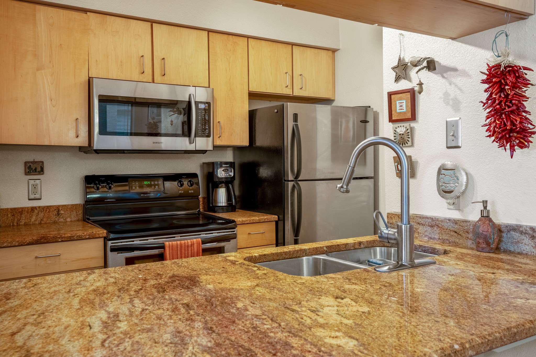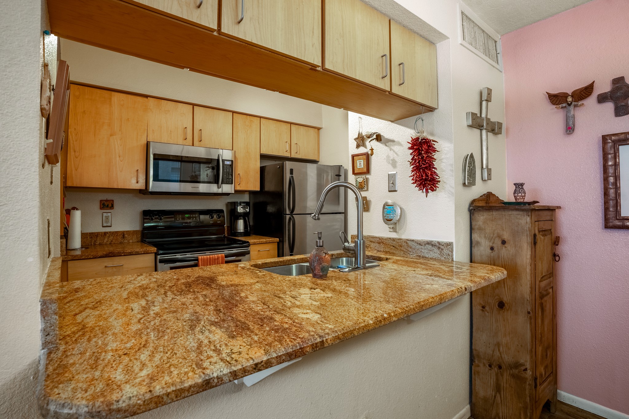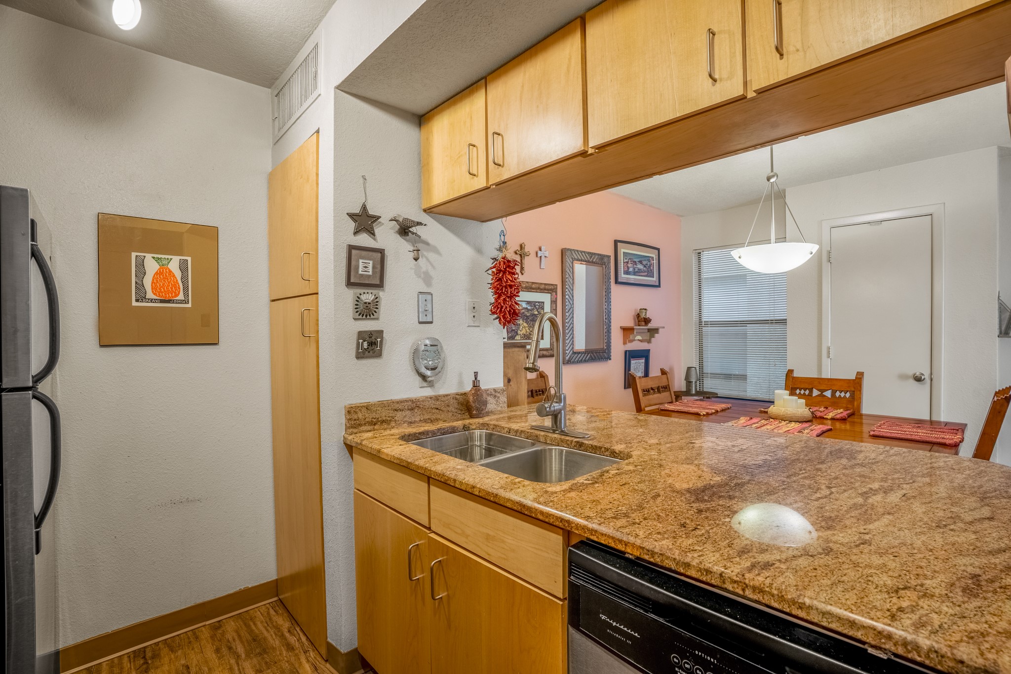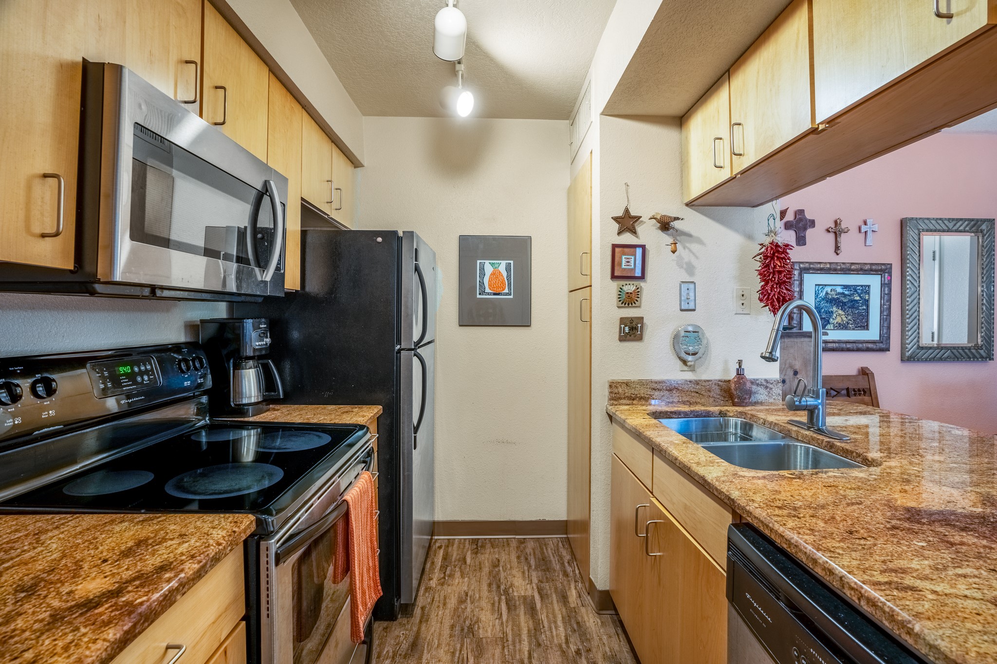 LOCATION, LOCATION , LOCATION...... This charming, 2 bedroom, 2 bath, ground floor unit is in the first building to the right as you enter the compound overlooking beautiful, large shade trees, (not other buildings) offering tons of privacy. It is right next to the walking trails, easy access to all of the Reserve Compound's amenities. The Reserve offers a year round swimming pool, a hot tub, fitness center, a mail center and laundry facilities on 16 acres of a mature park-like setting with privacy, ample car and bicycle parking (small pets 25 lbs and under are allowed). All this just minutes from the Historic Plaza, downtown area and exciting RailYard Area!This unit is being offered fully furnished (a few pieces and some art will not stay). It has been updated with granite counter tops in the kitchen and both bathrooms, the vinyl wood flooring is newer)....many special touches throughout. The patio area is very inviting and private. Roof, stucco, and landscaping are maintained by the HOA. No rentals are allowed under 30 days within the HOA. For more information, check out: https://www.reserveatsantafe.org/condos-available.html