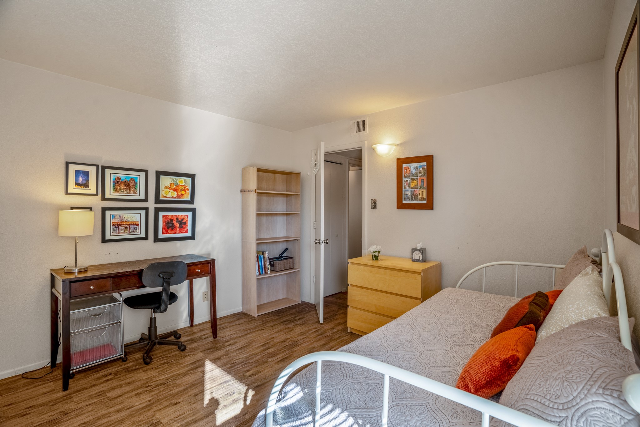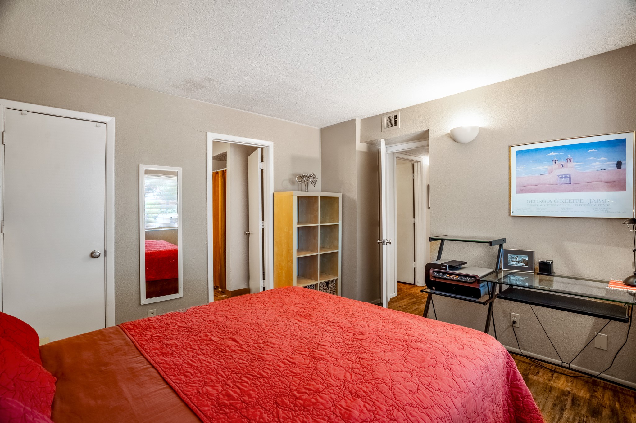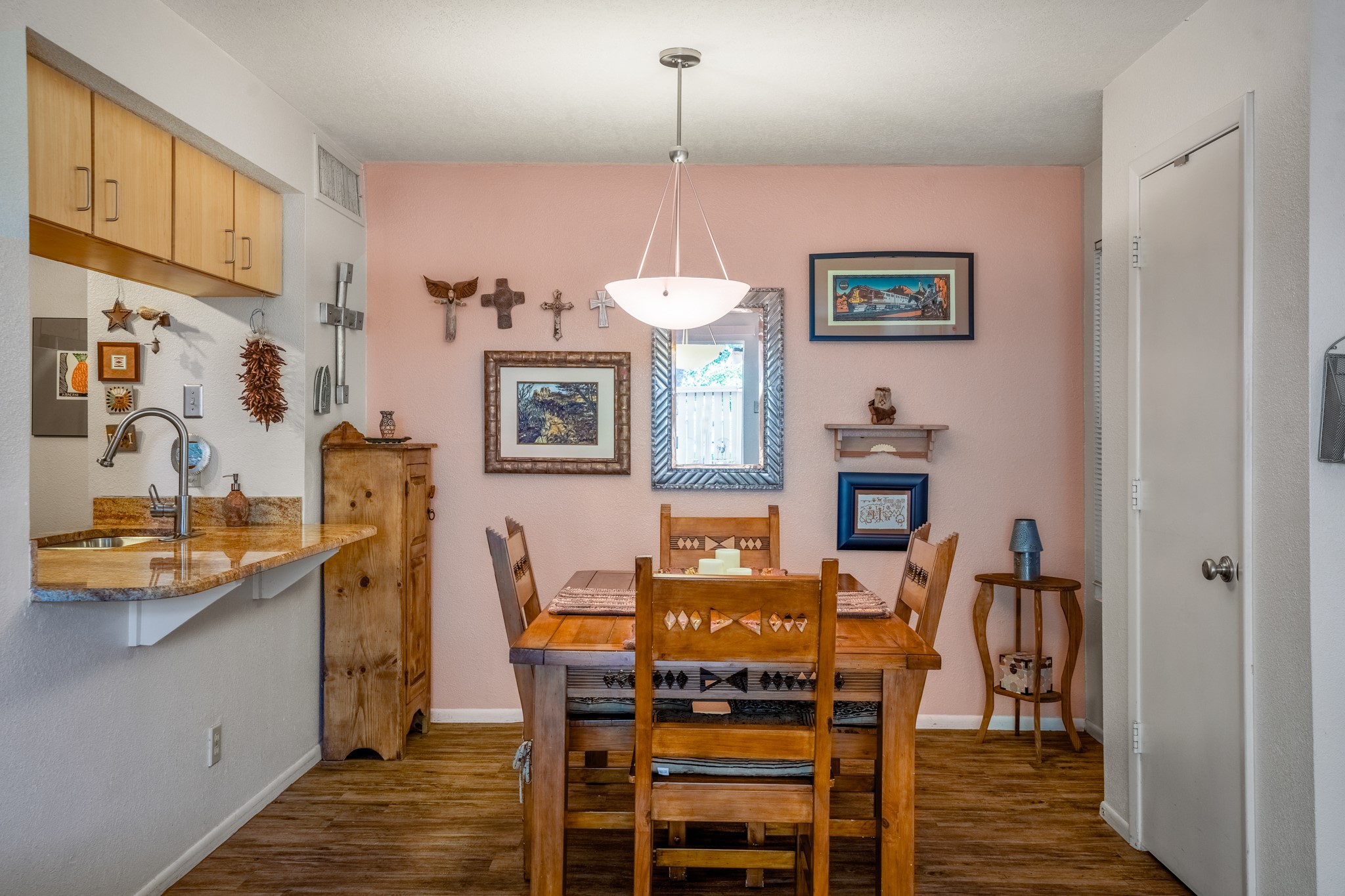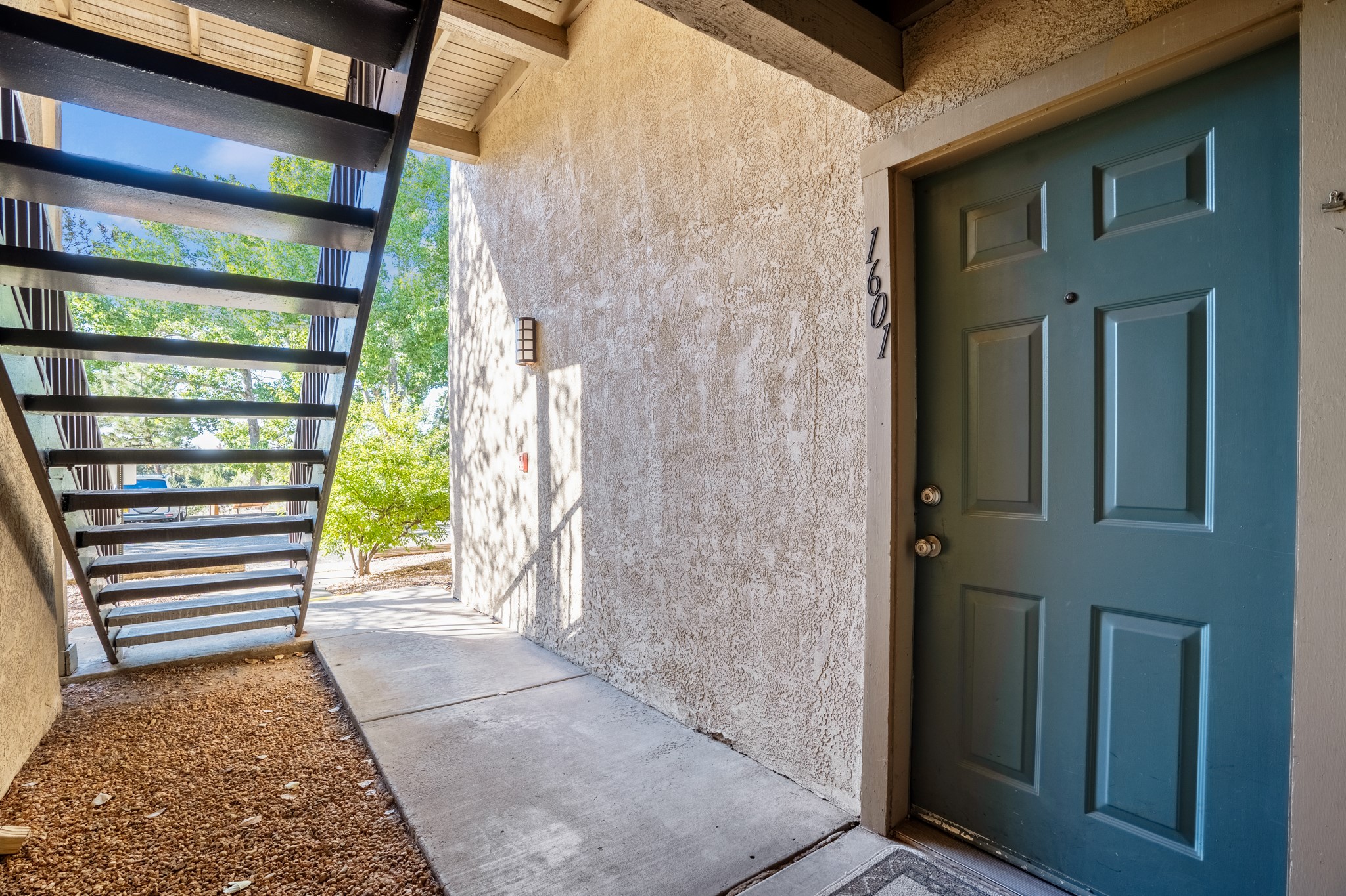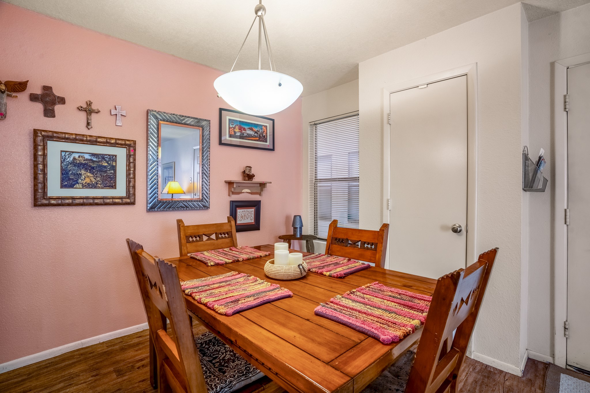 LOCATION, LOCATION , LOCATION...... This charming, 2 bedroom, 2 bath, ground floor unit is in the first building to the right as you enter the compound overlooking beautiful, large shade trees, (not other buildings) offering tons of privacy. It is right next to the walking trails, easy access to all of the Reserve Compound's amenities. The Reserve offers a year round swimming pool, a hot tub, fitness center, a mail center and laundry facilities on 16 acres of a mature park-like setting with privacy, ample car and bicycle parking (small pets 25 lbs and under are allowed). All this just minutes from the Historic Plaza, downtown area and exciting RailYard Area!This unit is being offered fully furnished (a few pieces and some art will not stay). It has been updated with granite counter tops in the kitchen and both bathrooms, the vinyl wood flooring is newer)....many special touches throughout. The patio area is very inviting and private. Roof, stucco, and landscaping are maintained by the HOA. No rentals are allowed under 30 days within the HOA. For more information, check out: https://www.reserveatsantafe.org/condos-available.html