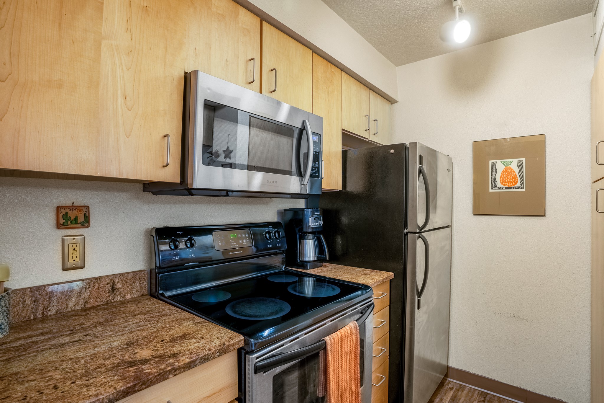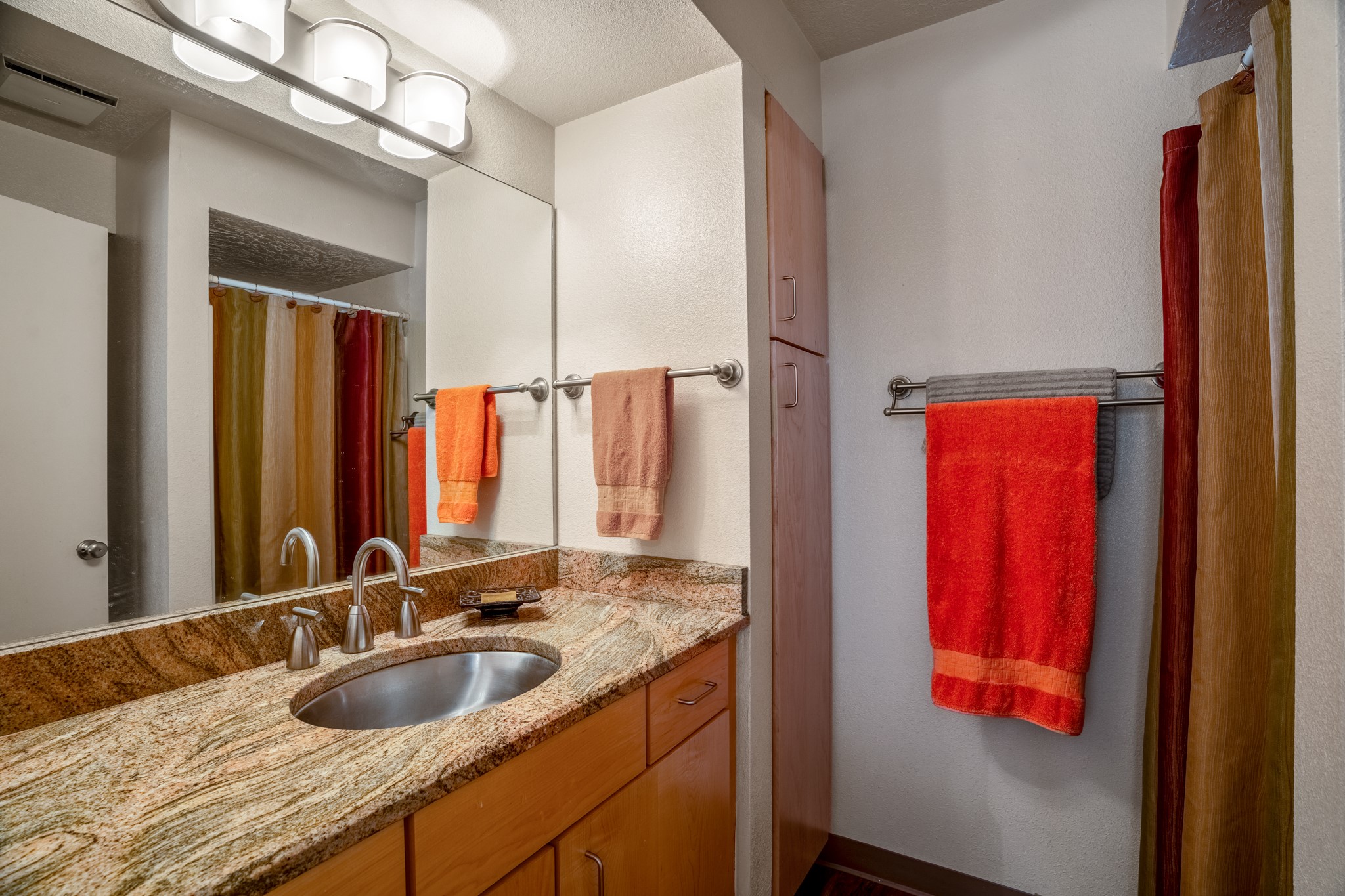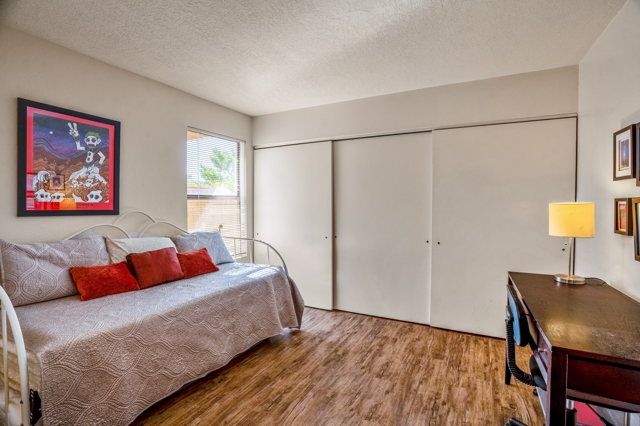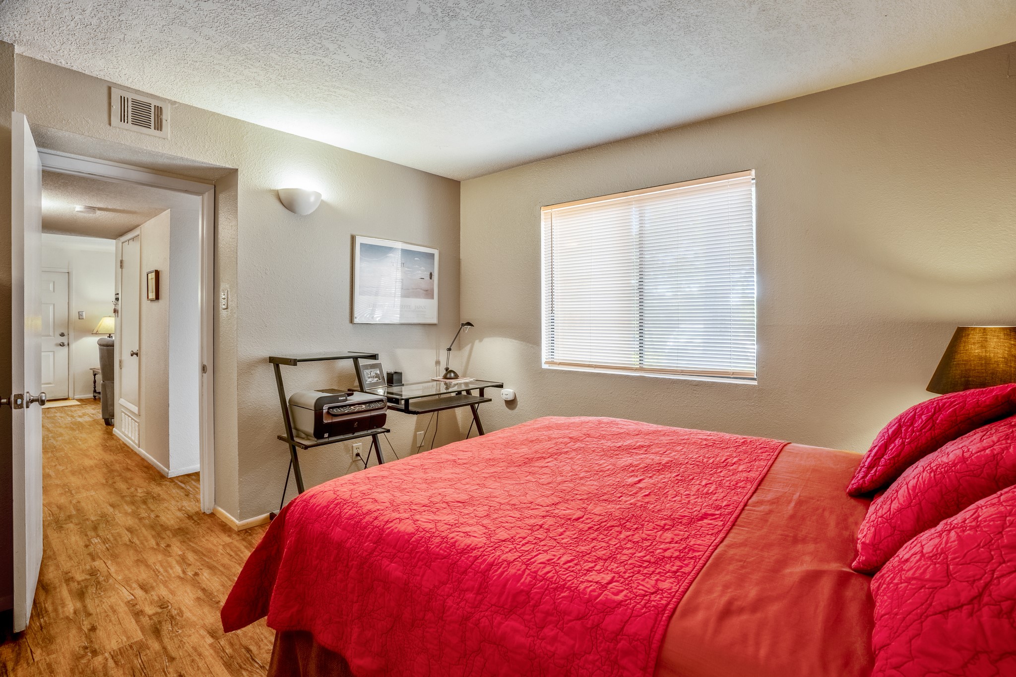 LOCATION, LOCATION , LOCATION...... This charming, 2 bedroom, 2 bath, ground floor unit is in the first building to the right as you enter the compound overlooking beautiful, large shade trees, (not other buildings) offering tons of privacy. It is right next to the walking trails, easy access to all of the Reserve Compound's amenities. The Reserve offers a year round swimming pool, a hot tub, fitness center, a mail center and laundry facilities on 16 acres of a mature park-like setting with privacy, ample car and bicycle parking (small pets 25 lbs and under are allowed). All this just minutes from the Historic Plaza, downtown area and exciting RailYard Area!This unit is being offered fully furnished (a few pieces and some art will not stay). It has been updated with granite counter tops in the kitchen and both bathrooms, the vinyl wood flooring is newer)....many special touches throughout. The patio area is very inviting and private. Roof, stucco, and landscaping are maintained by the HOA. No rentals are allowed under 30 days within the HOA. For more information, check out: https://www.reserveatsantafe.org/condos-available.html