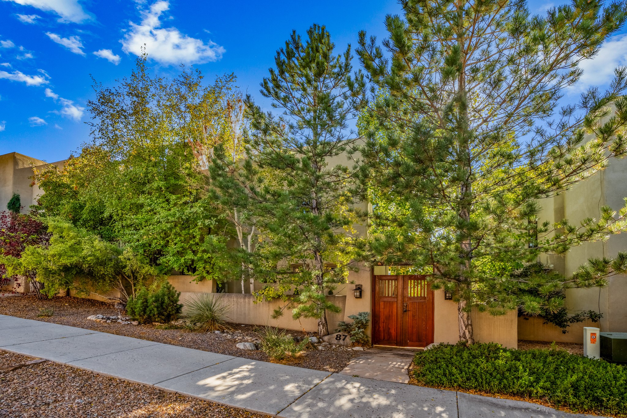Located within the serene and picturesque community of Aldea De Santa Fe. This captivating residence offers unobstructed sunset views. The open-concept living space boasts soaring 20-foot ceilings, captivating the very best of a contemporary design. Earthy yet modern finishes throughout. Including, stone, bamboo and concrete floors and a gas burning fireplace. There are custom wood cabinets in the bathrooms that resemble a basket weave and floor to ceiling tile in the showers. The abundance of windows that allows for the New Mexico sun to pour in, creating a warm and inviting atmosphere. The living area is adjacent dining area and perfectly sized kitchen with Wolf range provide the perfect setting for culinary adventures. There is a Primary bedroom suite on the main floor with bamboo floors and a tasteful en-suite bathroom. The upstairs bedroom is generously sized with an en-suite bathroom and a loft area for relaxing and taking in Santa Fe's amazing desert views. In addition to the stylish interior, the home also offers outdoor spaces that are equally inviting. Enter from the street onto a private enclosed courtyard and you can enjoy entertaining on the deck off of the living room with those in your face views. The 2-car garage offers convenience and storage space, while the radiant heating and central air conditioning ensure year-round comfort. Aldea De Santa Fe offers a community center, parks, 13 miles of walking trails, and a strong sense of community. Enjoy the best of both worlds, with easy access to Santa Fe's vibrant cultural scene, shopping, dining, and outdoor recreation. Experience the harmony of modern living in a Southwestern setting. Don't miss the opportunity to make 87 Avenida Frijoles your new Santa Fe retreat.