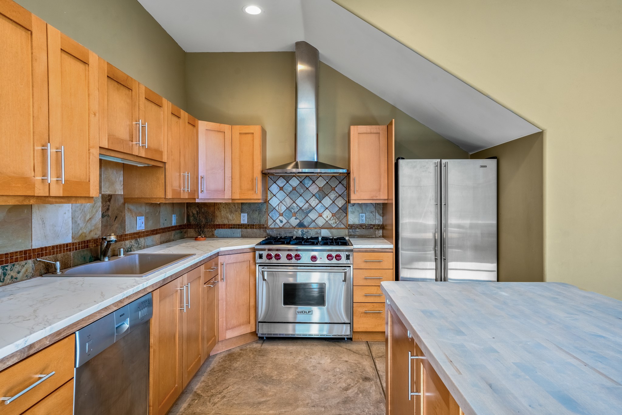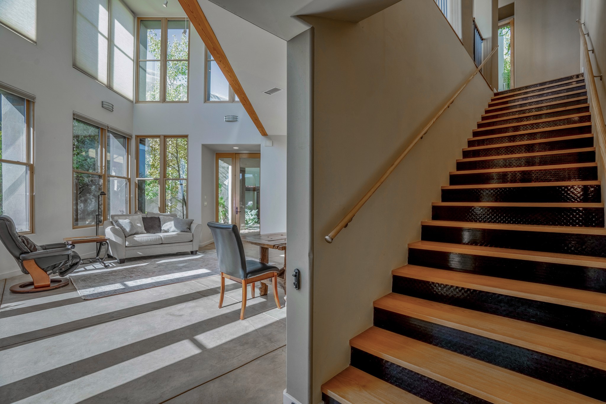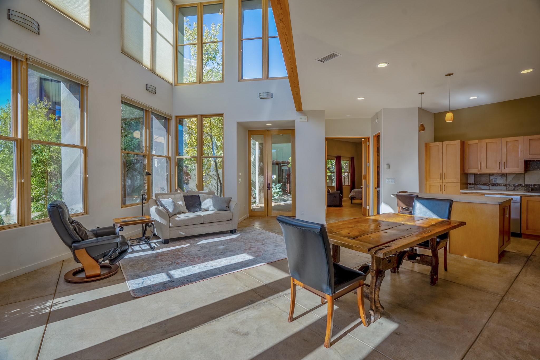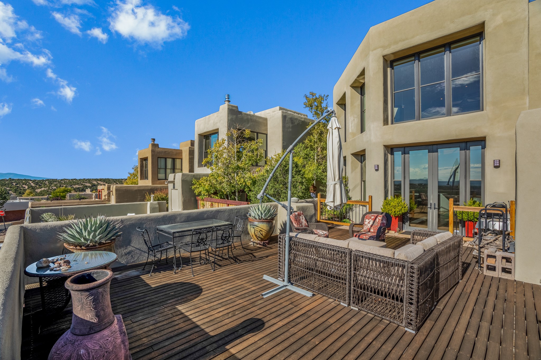 Located within the serene and picturesque community of Aldea De Santa Fe. This captivating residence offers unobstructed sunset views. The open-concept living space boasts soaring 20-foot ceilings, captivating the very best of a contemporary design. Earthy yet modern finishes throughout. Including, stone, bamboo and concrete floors and a gas burning fireplace. There are custom wood cabinets in the bathrooms that resemble a basket weave and floor to ceiling tile in the showers. The abundance of windows that allows for the New Mexico sun to pour in, creating a warm and inviting atmosphere. The living area is adjacent dining area and perfectly sized kitchen with Wolf range provide the perfect setting for culinary adventures. There is a Primary bedroom suite on the main floor with bamboo floors and a tasteful en-suite bathroom. The upstairs bedroom is generously sized with an en-suite bathroom and a loft area for relaxing and taking in Santa Fe's amazing desert views. In addition to the stylish interior, the home also offers outdoor spaces that are equally inviting. Enter from the street onto a private enclosed courtyard and you can enjoy entertaining on the deck off of the living room with those in your face views. The 2-car garage offers convenience and storage space, while the radiant heating and central air conditioning ensure year-round comfort. Aldea De Santa Fe offers a community center, parks, 13 miles of walking trails, and a strong sense of community. Enjoy the best of both worlds, with easy access to Santa Fe's vibrant cultural scene, shopping, dining, and outdoor recreation. Experience the harmony of modern living in a Southwestern setting. Don't miss the opportunity to make 87 Avenida Frijoles your new Santa Fe retreat.
