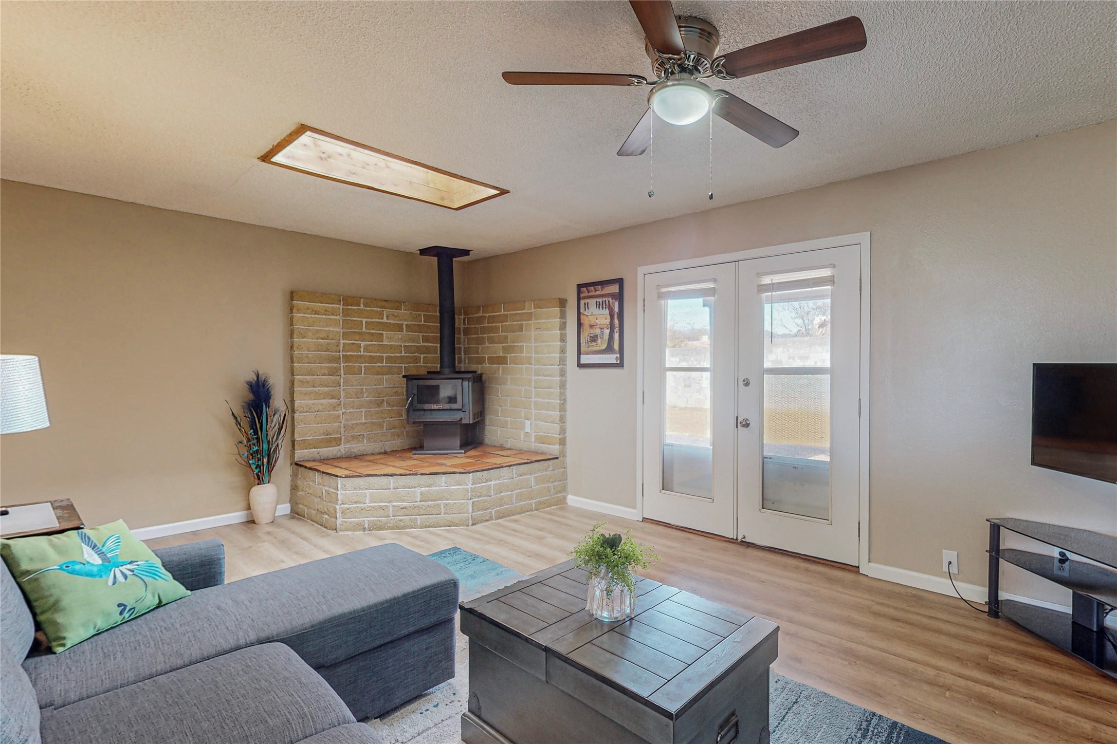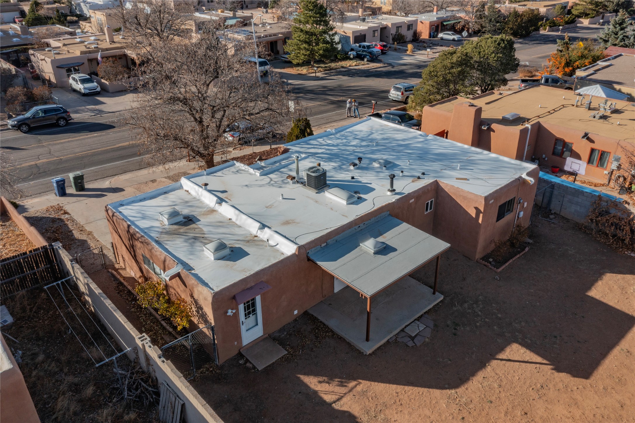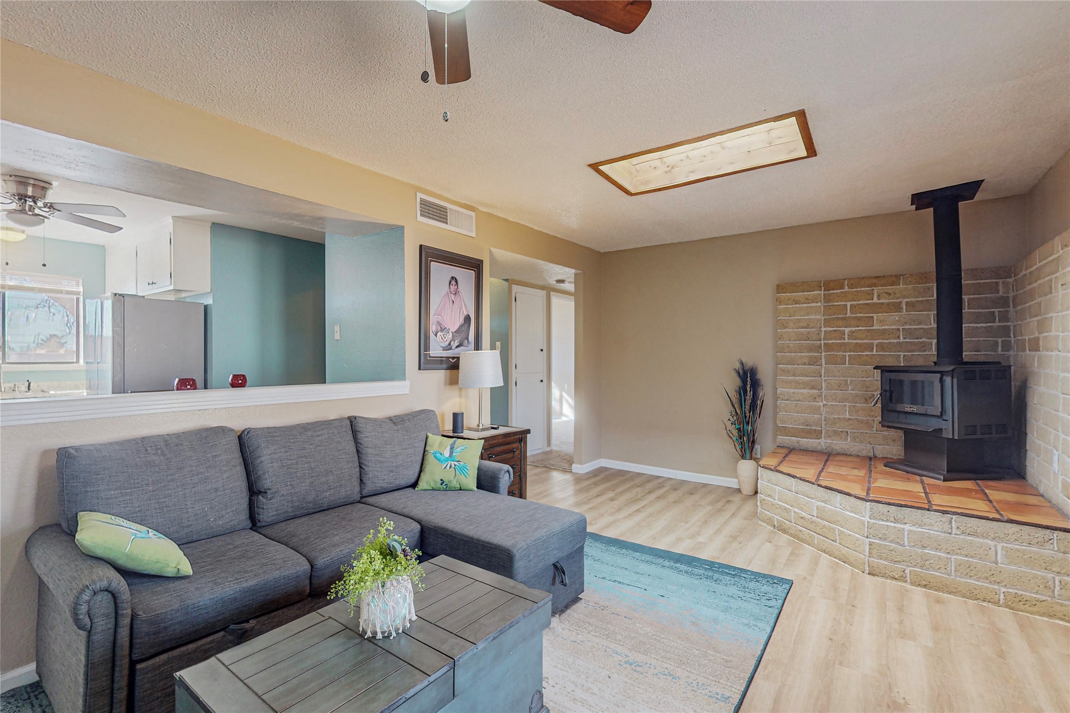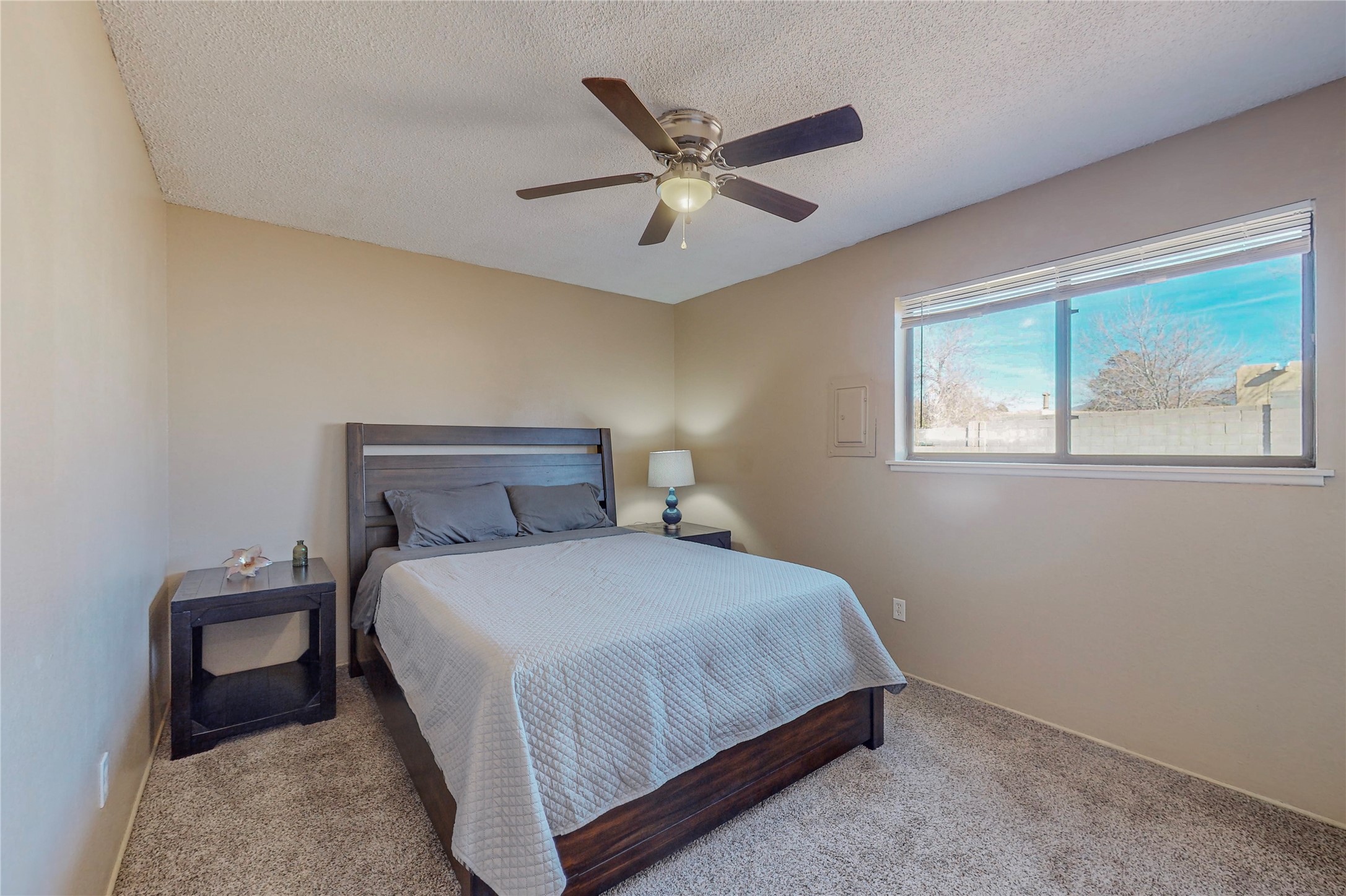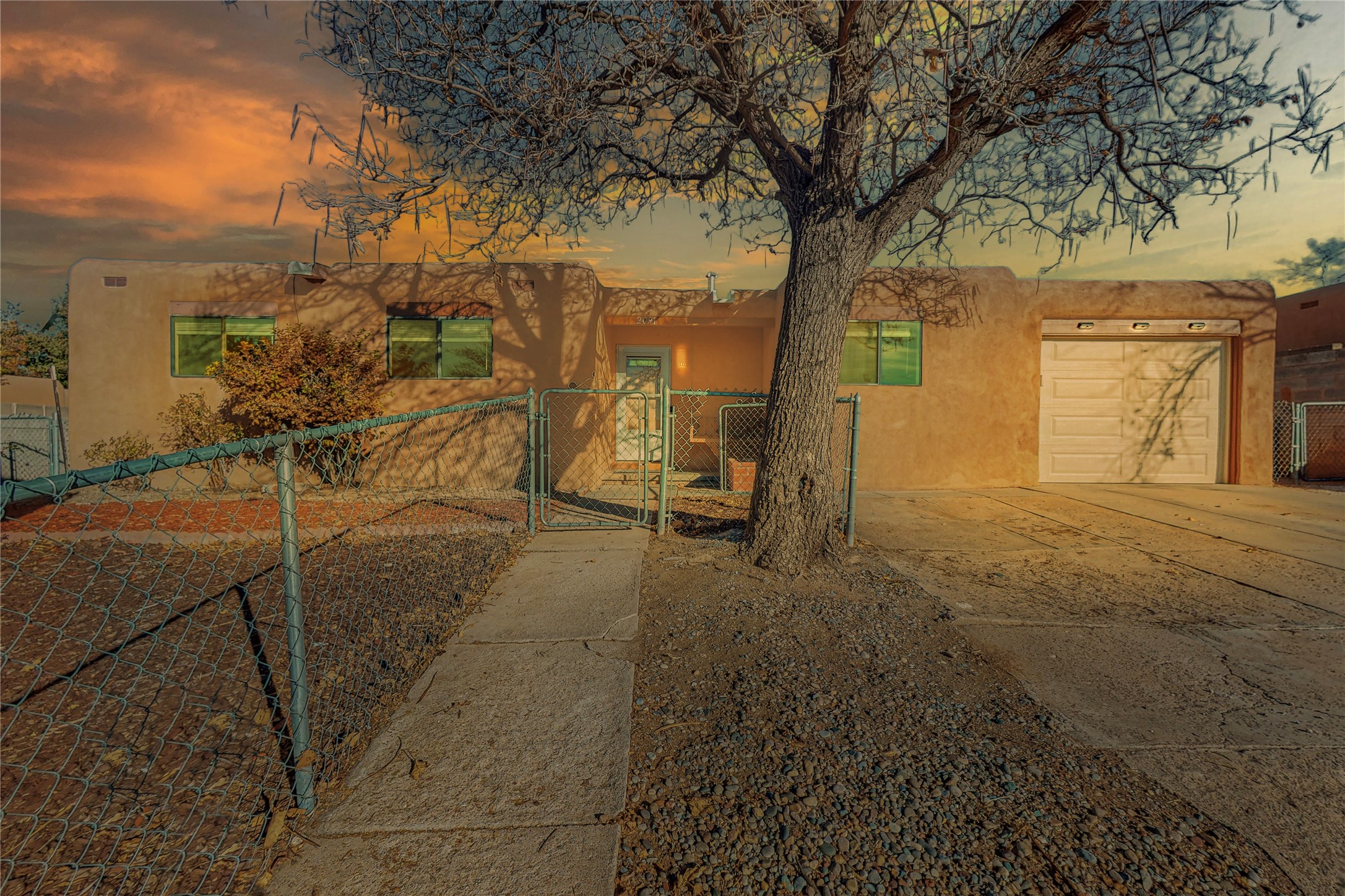Come home to this move in ready FOUR bedroom two bathroom beautiful home! The kitchen is open concept with a dining area that over looks into the spacious living room.The living room has a cozy fireplace and french doors that open up to the very large walled back yard that your family can make their own. Ceiling fans in each of the bedrooms and beautiful skylights throughout the home. A brand new TPO membrane roof was just installed with a 20 year labor and material warranty. There is a single car attached garage with a laundry room. Conveniently located near schools, hospitals, the Railrunner and shops!