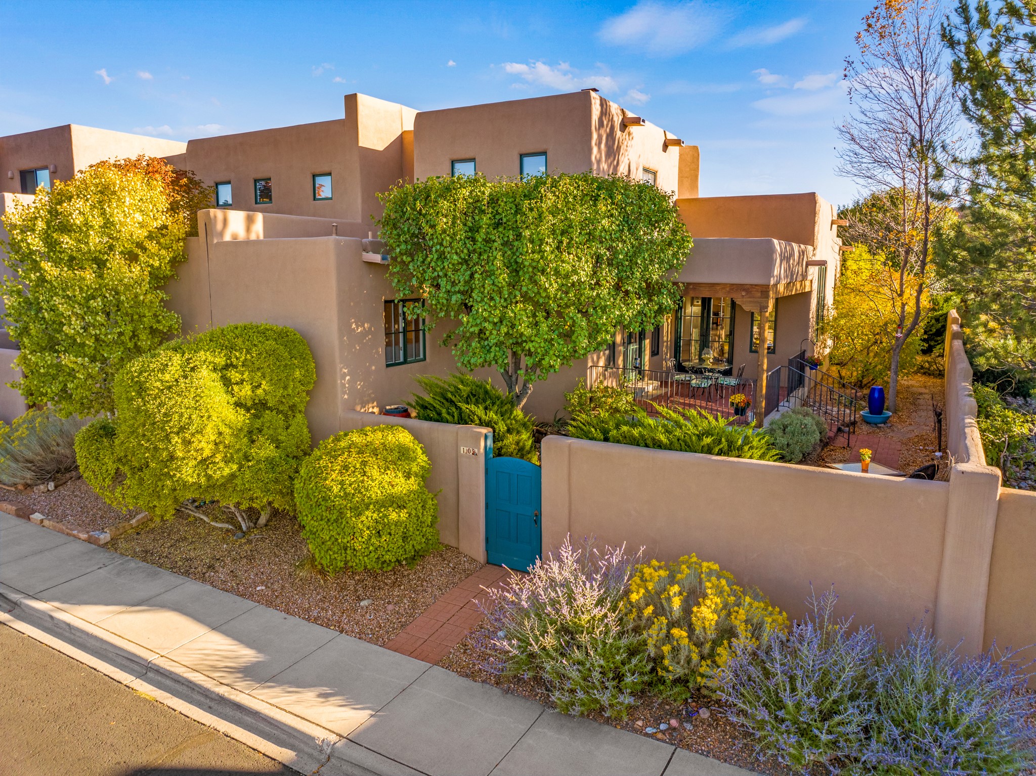 Bright, airy, contemporary patio home located in the heart of Aldea de Santa Fe. This light filled home features an open concept floor plan, first floor master suite, attached garage, radiant in floor heat, evaporative cooling, beautiful landscaping, drip irrigation and a large, covered patio with Jemez mountain views. The main living area has a high ceiling, vigas, large windows, faux paint and wood burning kiva fireplace. Kitchen features spacious pantries, maple cabinets, a center island and stainless Bosch and Amana appliances. The master suite includes a walk-in closet, jetted tub and large shower. French doors with screens in both the living room and master suite open directly to the patio. Two spacious, carpeted bedrooms and full bath are located on the second floor. The lovely and peaceful yard is completely walled for your furry friends. The front of the house faces Aldea open space, offering stunning mountain views and the serenity of a walkable community with fitness amenities, parks, and miles of walking trails. The home backs up to a large parking area for guests. Great location with easy access to NM 599, Los Alamos, downtown Santa Fe. Aldea de Santa Fe is a new urbanist subdivision that offers 13 miles of walking trails, community center, Bocci ball, tennis and basket-ball courts. Just steps away from Aldea plaza and specialty shops, caf, and businesses. community is great place to meet new friends with many special interest clubs in place.