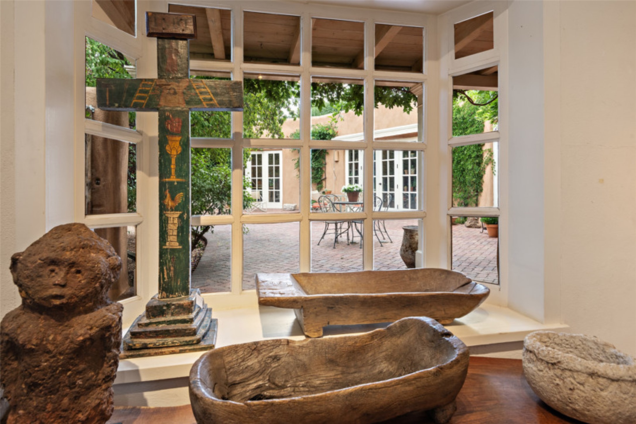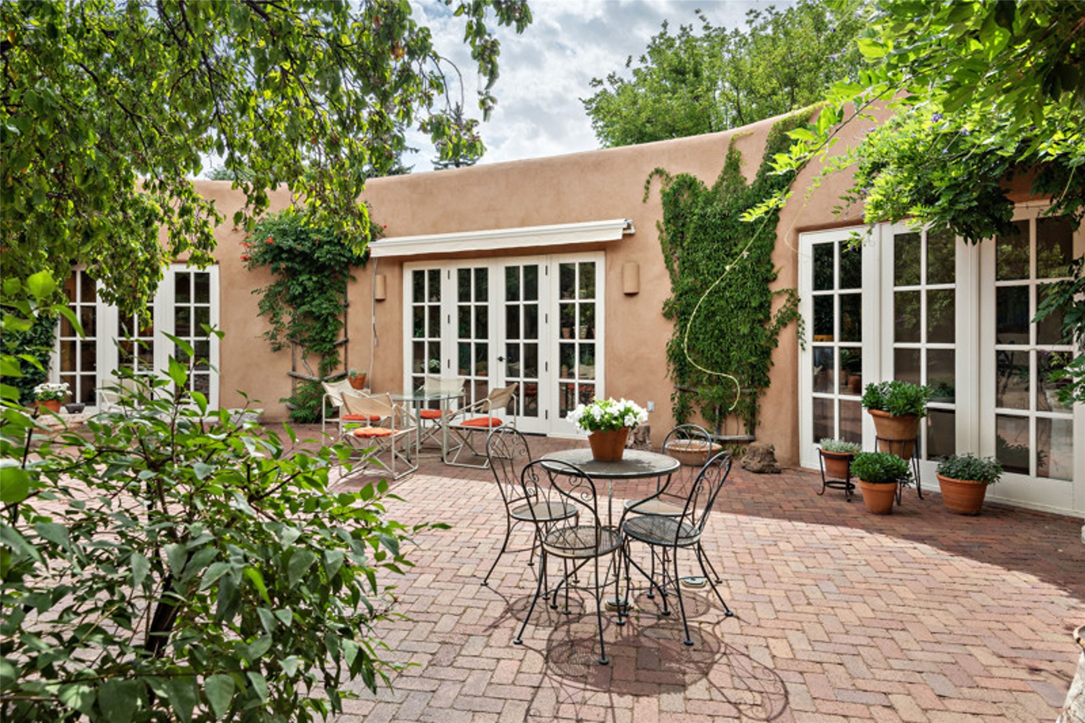 Home of the noted collector and beloved Santa Fe icon , the late Omer Claiborne- this lovely compound is tucked down a quiet lane off Canyon Road. The original home and guest house were built by Agnes Sims in 1947- 1948 . Omer designed the elegant main house in 1997 , attaching it to the original structure . This single level home has a clean , modernist aesthetic and features many architectural details , including lighted , recessed shelves for his museum quality artifacts , multiple fireplaces , concrete floors , French doors throughout , and 12' beamed ceilings. The 2 bedroom main house opens to a gracious entry courtyard, and flows seamlessly into the original house. The original adobe building is currently used as a gallery but can easily be converted into 2 bedrooms with an existing bath and a sitting area. The detached guest house is accessed through a brick courtyard , and offers privacy and charm. The established landscaping ,coveted location and flexible spaces add to the magic of this special property.