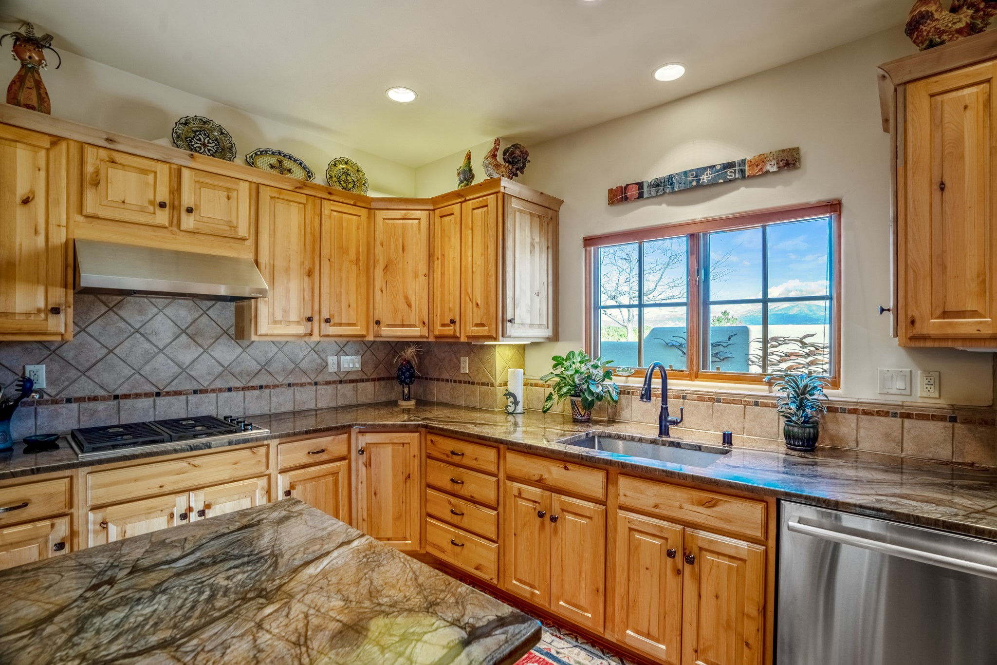 Sited on a view-filled .17 corner lot in Aldea de Santa Fe, this 2500 sq. ft. 3 bedroom/ 2 bath single level home is rich in design and craftsmanship. The living room is architecturally captivating with a commanding fireplace (wood burning with a gas lighter), diamond plastered walls, vigas with tongue and groove ceilings and French doors that lead to a fully enclosed West-facing back courtyard with its own private Aspen grove and a 300 sq. ft. portal for outdoor living. The kitchen was recently updated with gorgeous granite on the countertops and the island and it has double Kitchenaid ovens, a Bosche dishwasher, a Wolf range and an abundance of storage. The large dining room, with a raised kiva fireplace, connects the kitchen and the main living area. The primary bedroom wing has a wonderful entry vestibule, a raised fireplace and French doors that egress onto the back portal. The primary bathroom has a large walk-in shower, a deep soaking tub and double vanities. A beautiful barrel ceiling hallway leads to the lovely powder room, 2 guest bedrooms and the guest bathroom. The generous laundry room also acts as a mudroom and connects to the oversized 690 sq ft. 2-car garage. A new roof with a 10 year transferable warranty, including free annual inspections, will convey with the property. Within a 10-15 minute drive of The Plaza, 43 Avenida Frijoles is outstanding in design/finish and is a great value in Aldea De Santa Fe.