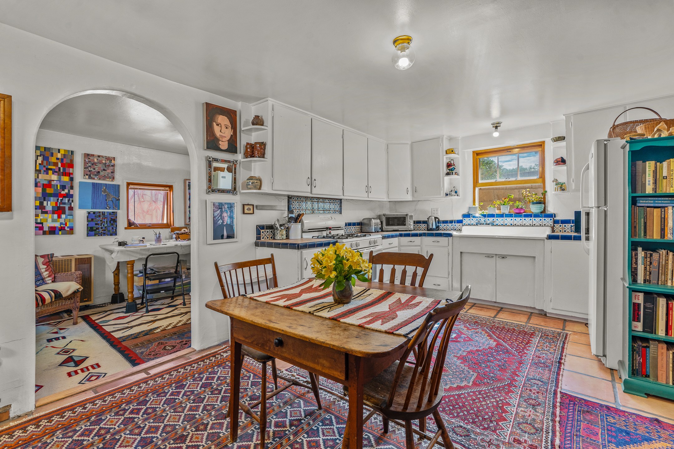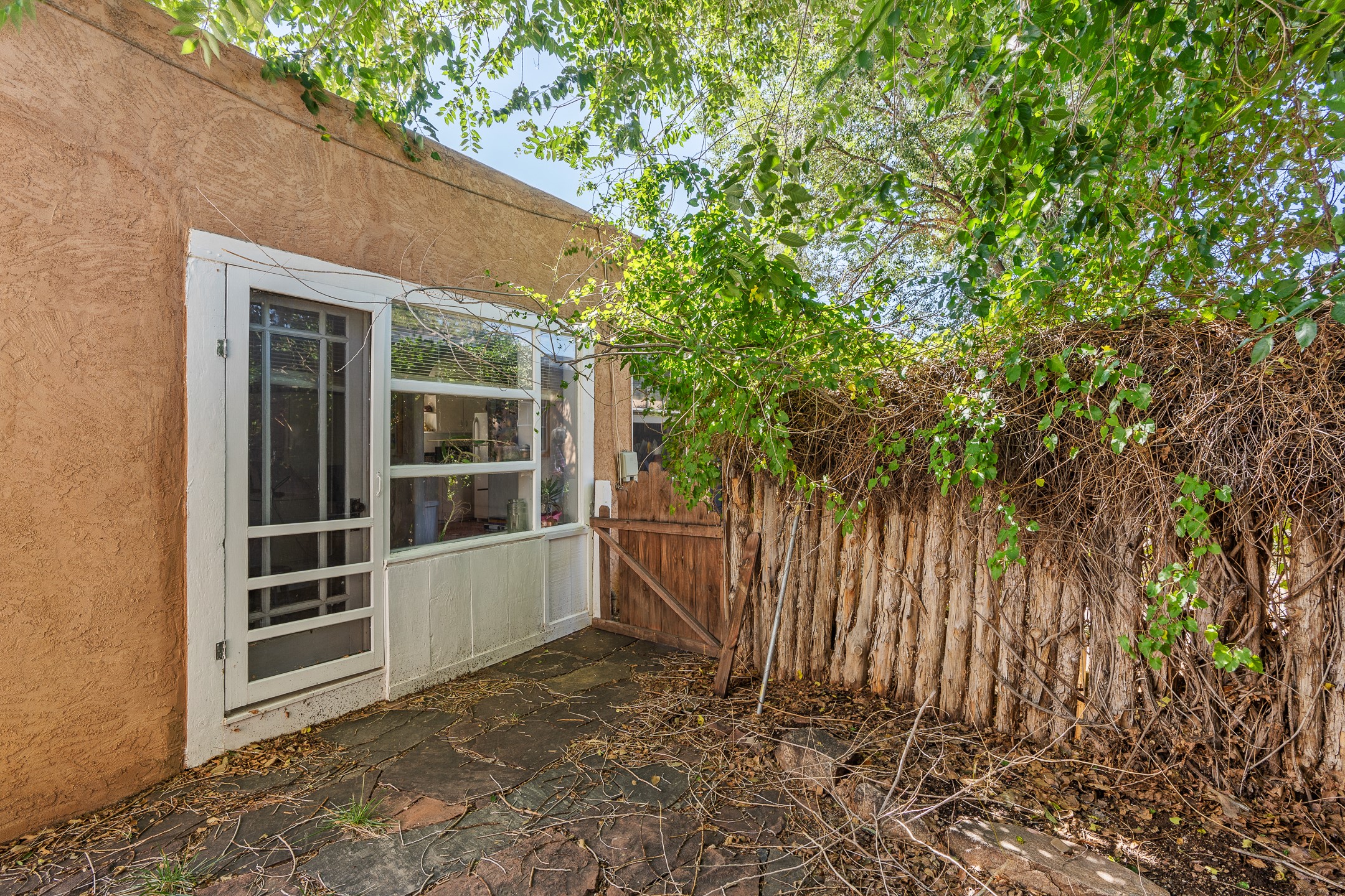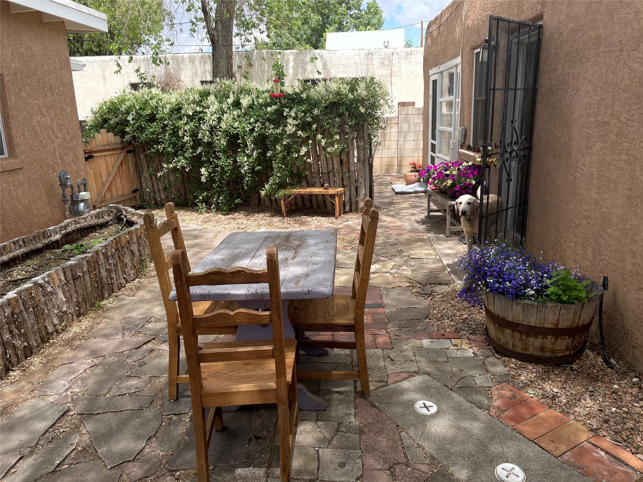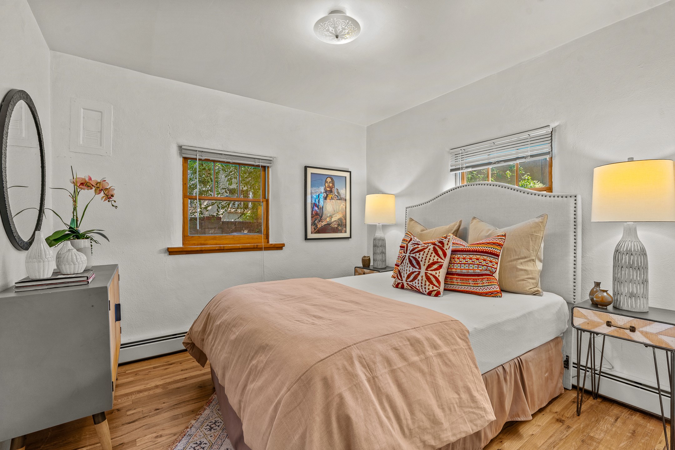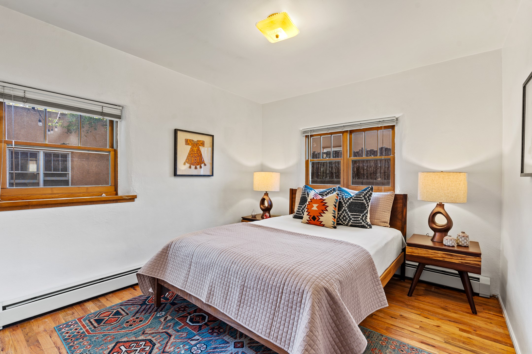 Charming classic authentic Adobe 3 bedroom, one bath main residence with a free-standing one bedroom, one bath guest house, "casita" in the thriving Railyard district. Architectural features include hard wood floors, a wood burning fireplace, newer wood and metal clad windows; individual private courtyards. Newer TPO roof - 2023 (with a transferrable warranty). kitchens with abundant cabinets; washers and dryers and separate meters for electric and gas. Three Off-street parking spaces and a carport. New stucco on the front wall and interior courtyard as of 9-16-25. Located on the Acequia trail that connects to the Farmers Market, Whole Foods, Cafecito, and Counter Culture .... the perfect urban lifestyle down a quiet side street from ultra popular Tune-up cafe and the new Leo's Thai cafe .investor opportunity with current tenant in guest house and rental records available.
