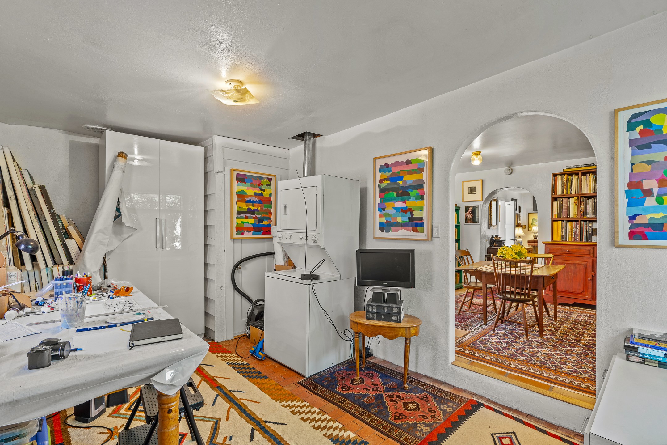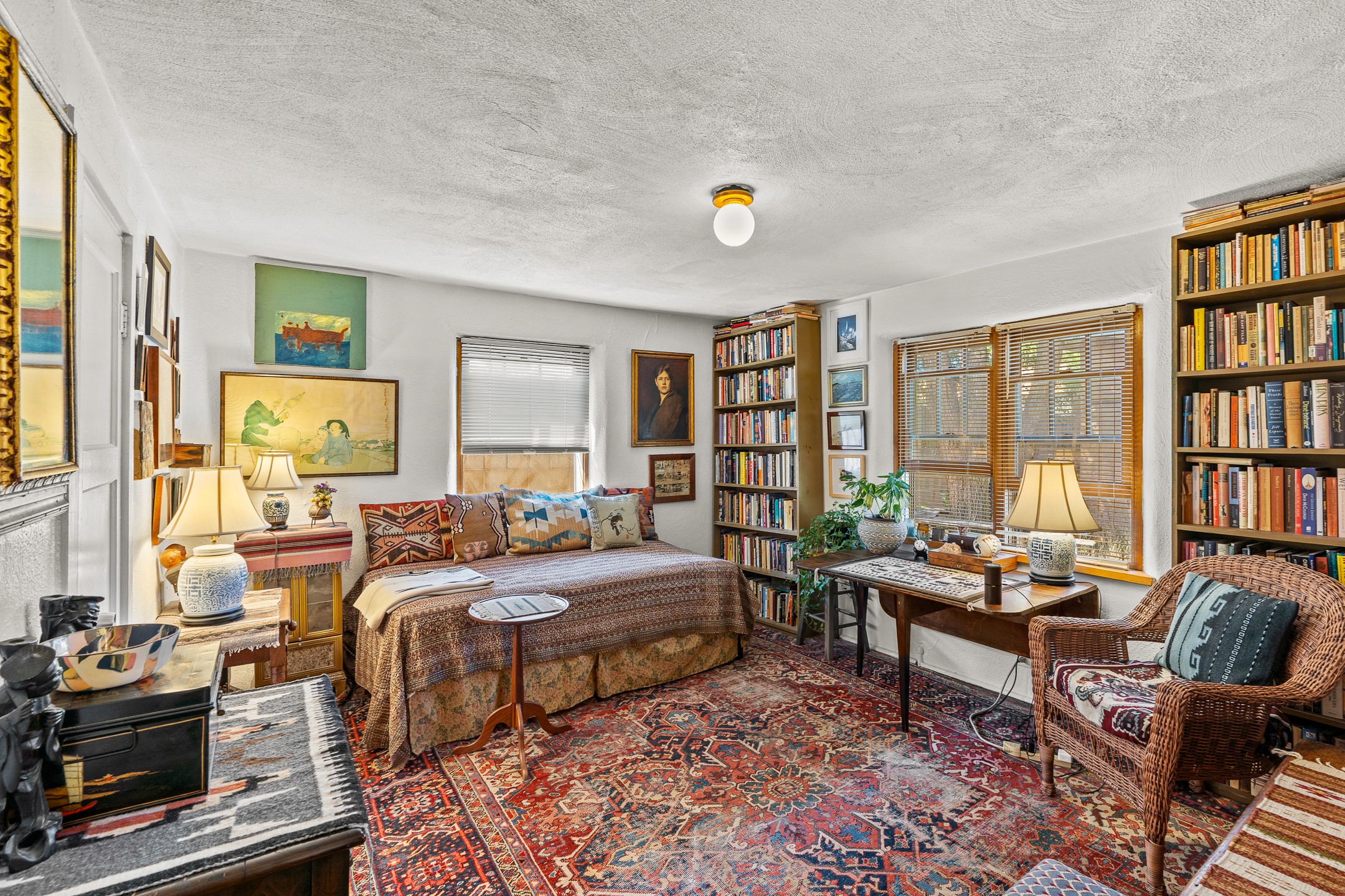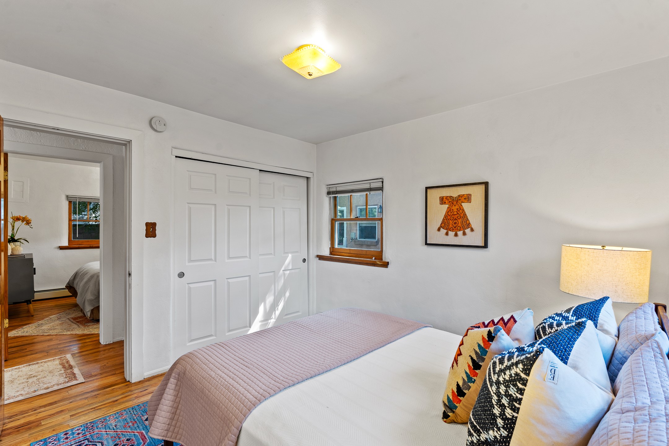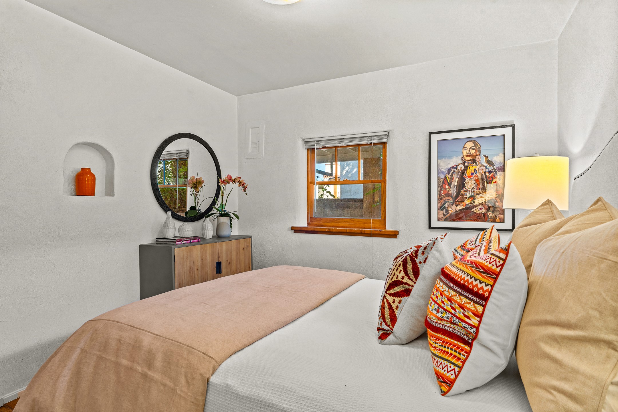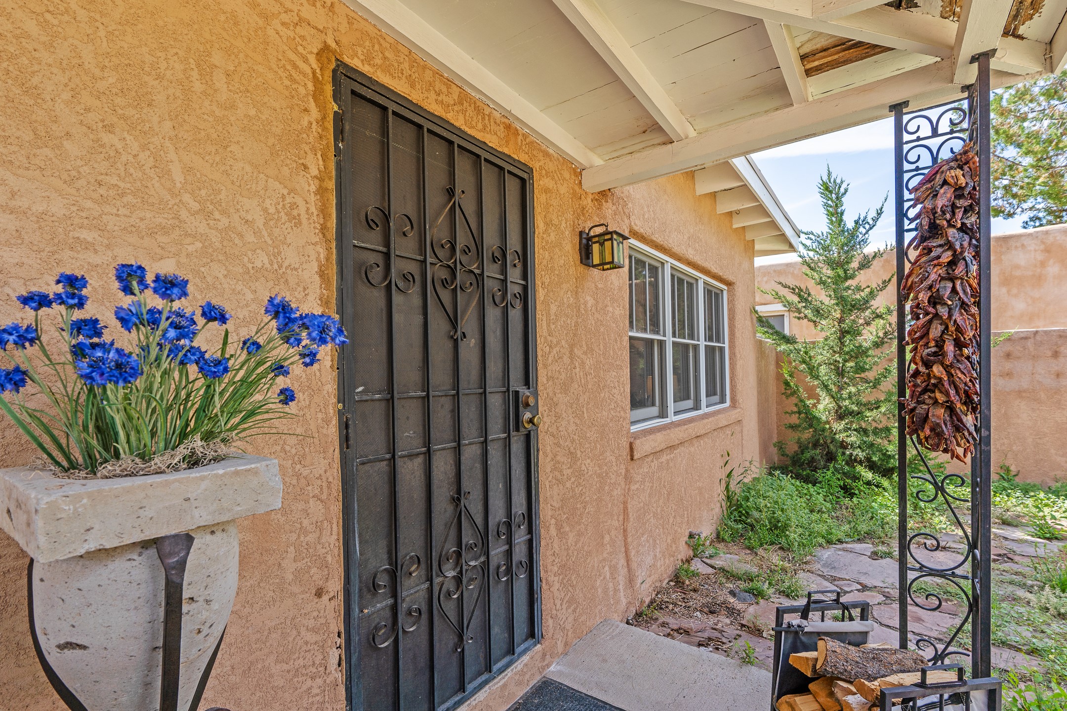 Charming classic authentic Adobe 3 bedroom, one bath main residence with a free-standing one bedroom, one bath guest house, "casita" in the thriving Railyard district. Architectural features include hard wood floors, a wood burning fireplace, newer wood and metal clad windows; individual private courtyards. Newer TPO roof - 2023 (with a transferrable warranty). kitchens with abundant cabinets; washers and dryers and separate meters for electric and gas. Three Off-street parking spaces and a carport. New stucco on the front wall and interior courtyard as of 9-16-25. Located on the Acequia trail that connects to the Farmers Market, Whole Foods, Cafecito, and Counter Culture .... the perfect urban lifestyle down a quiet side street from ultra popular Tune-up cafe and the new Leo's Thai cafe .investor opportunity with current tenant in guest house and rental records available.
