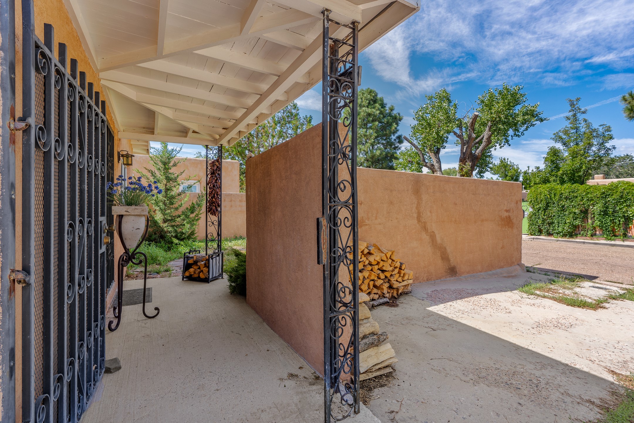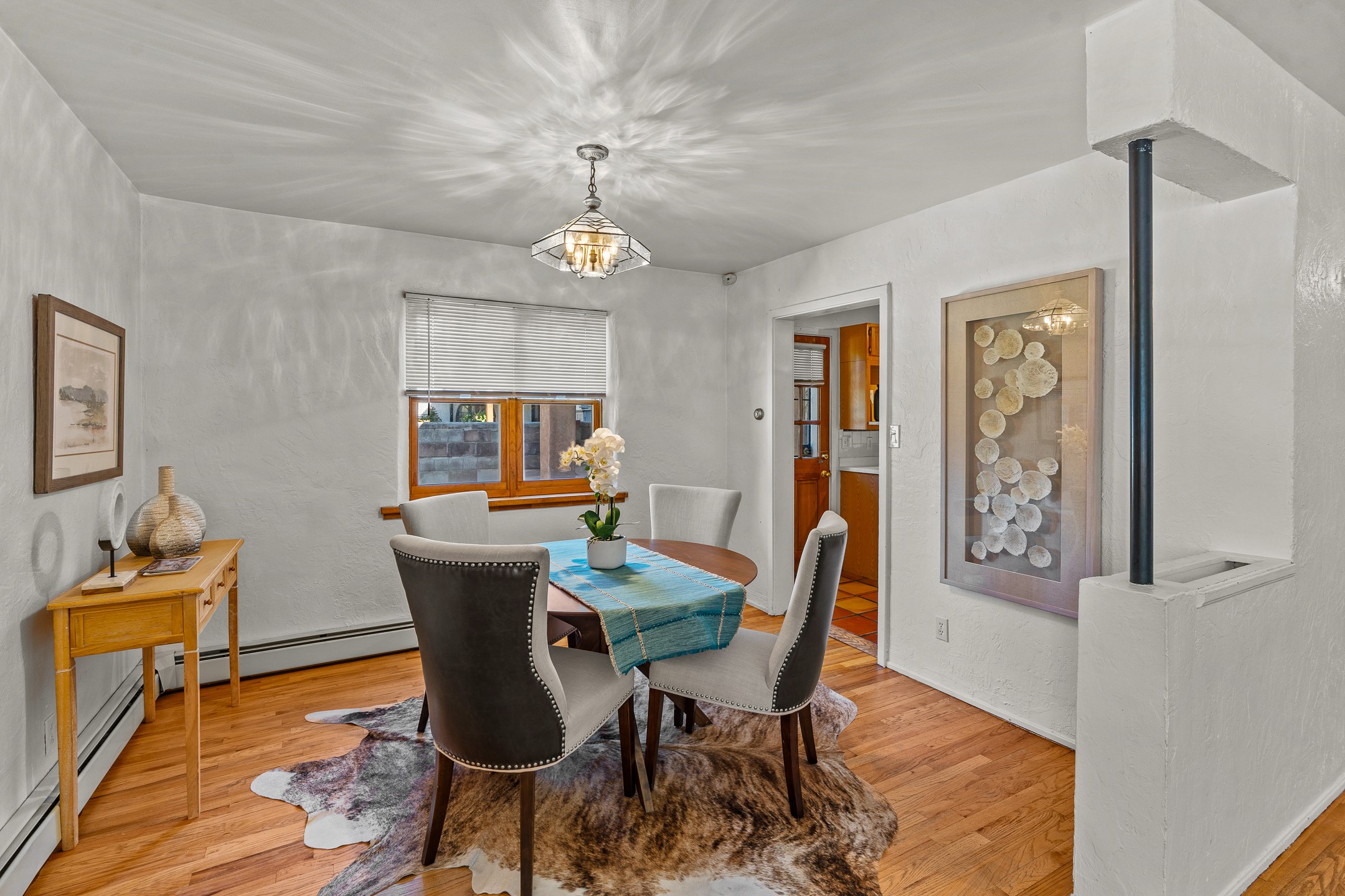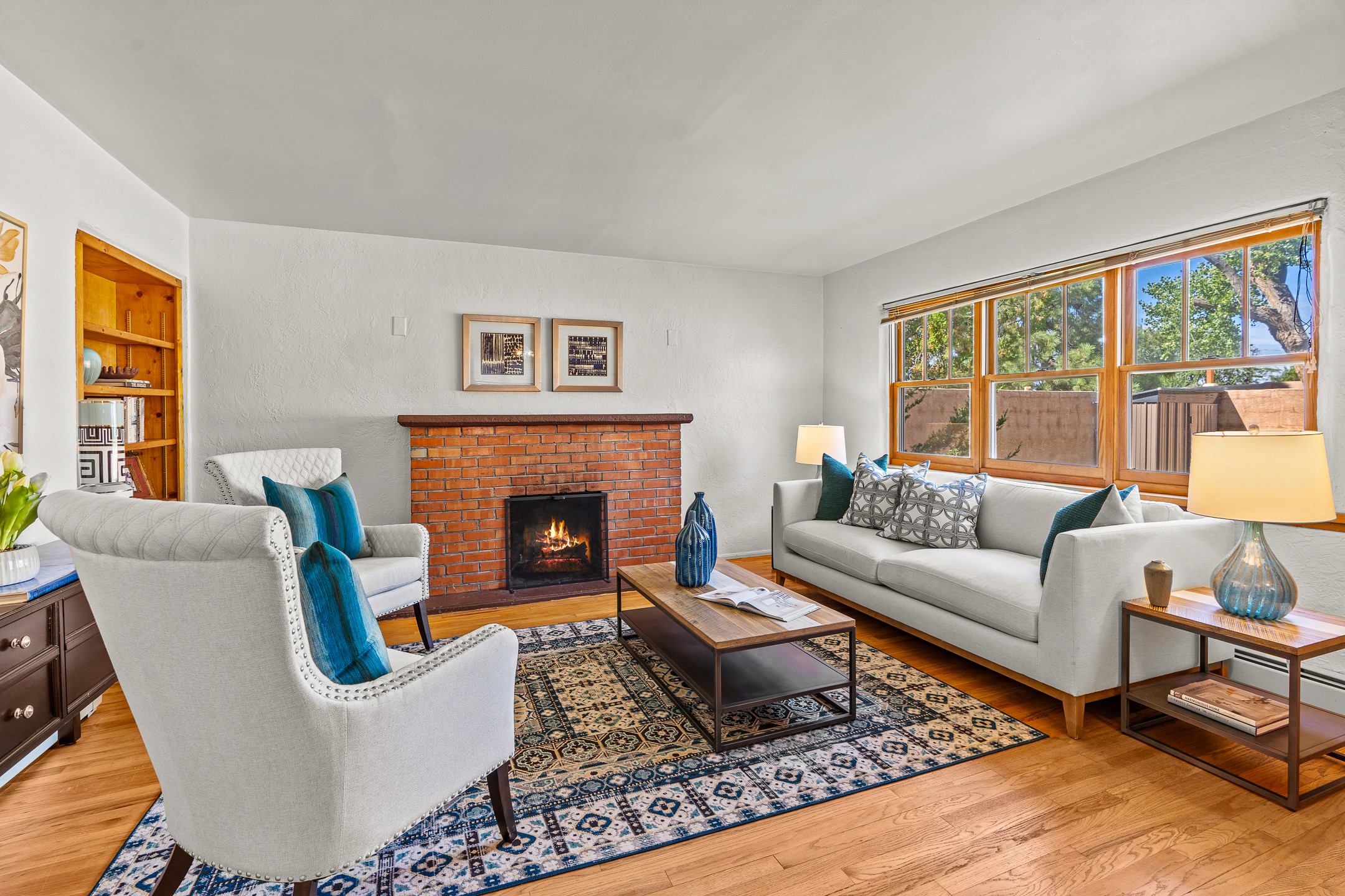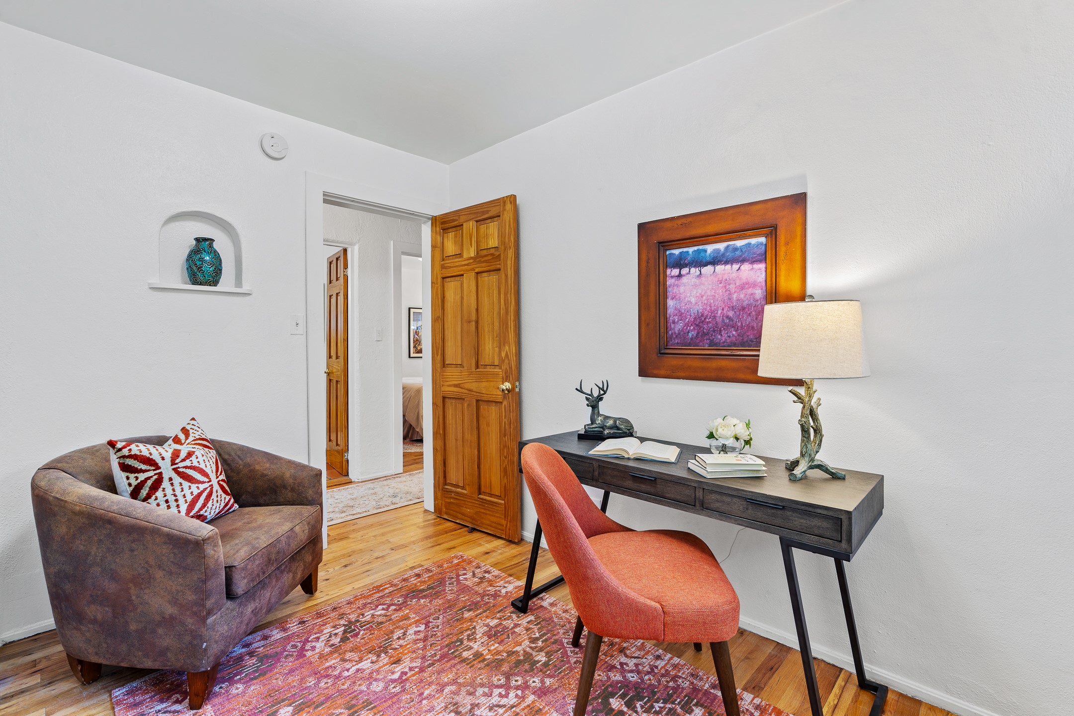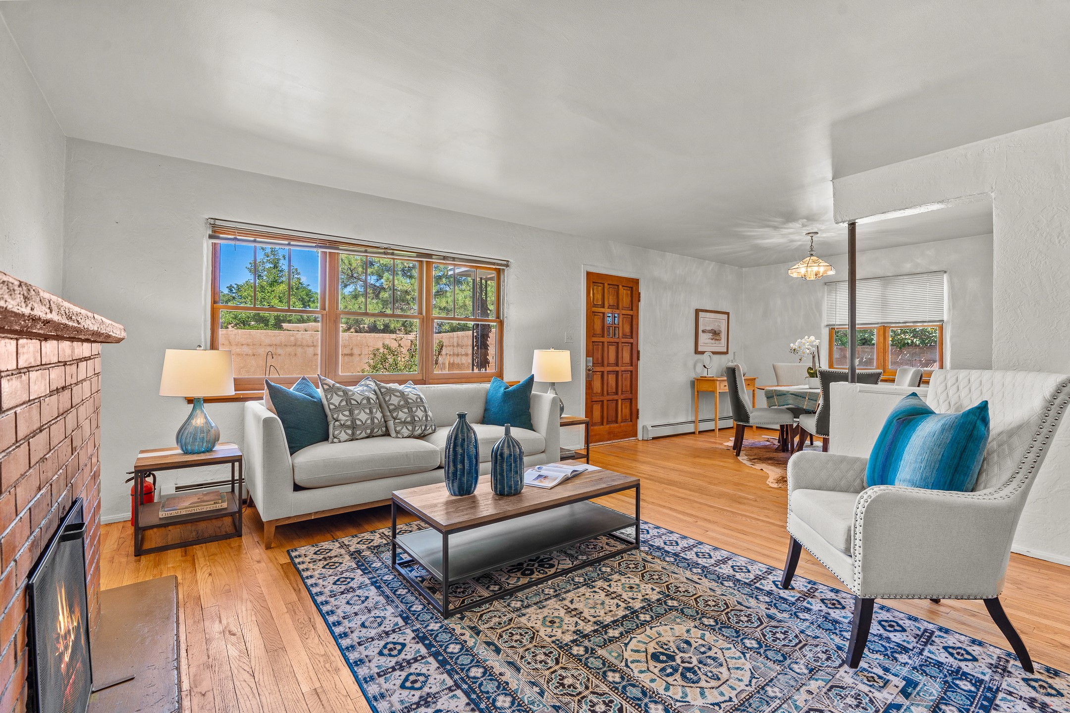 Charming classic authentic Adobe 3 bedroom, one bath main residence with a free-standing one bedroom, one bath guest house, "casita" in the thriving Railyard district. Architectural features include hard wood floors, a wood burning fireplace, newer wood and metal clad windows; individual private courtyards. Newer TPO roof - 2023 (with a transferrable warranty). kitchens with abundant cabinets; washers and dryers and separate meters for electric and gas. Three Off-street parking spaces and a carport. New stucco on the front wall and interior courtyard as of 9-16-25. Located on the Acequia trail that connects to the Farmers Market, Whole Foods, Cafecito, and Counter Culture .... the perfect urban lifestyle down a quiet side street from ultra popular Tune-up cafe and the new Leo's Thai cafe .investor opportunity with current tenant in guest house and rental records available.