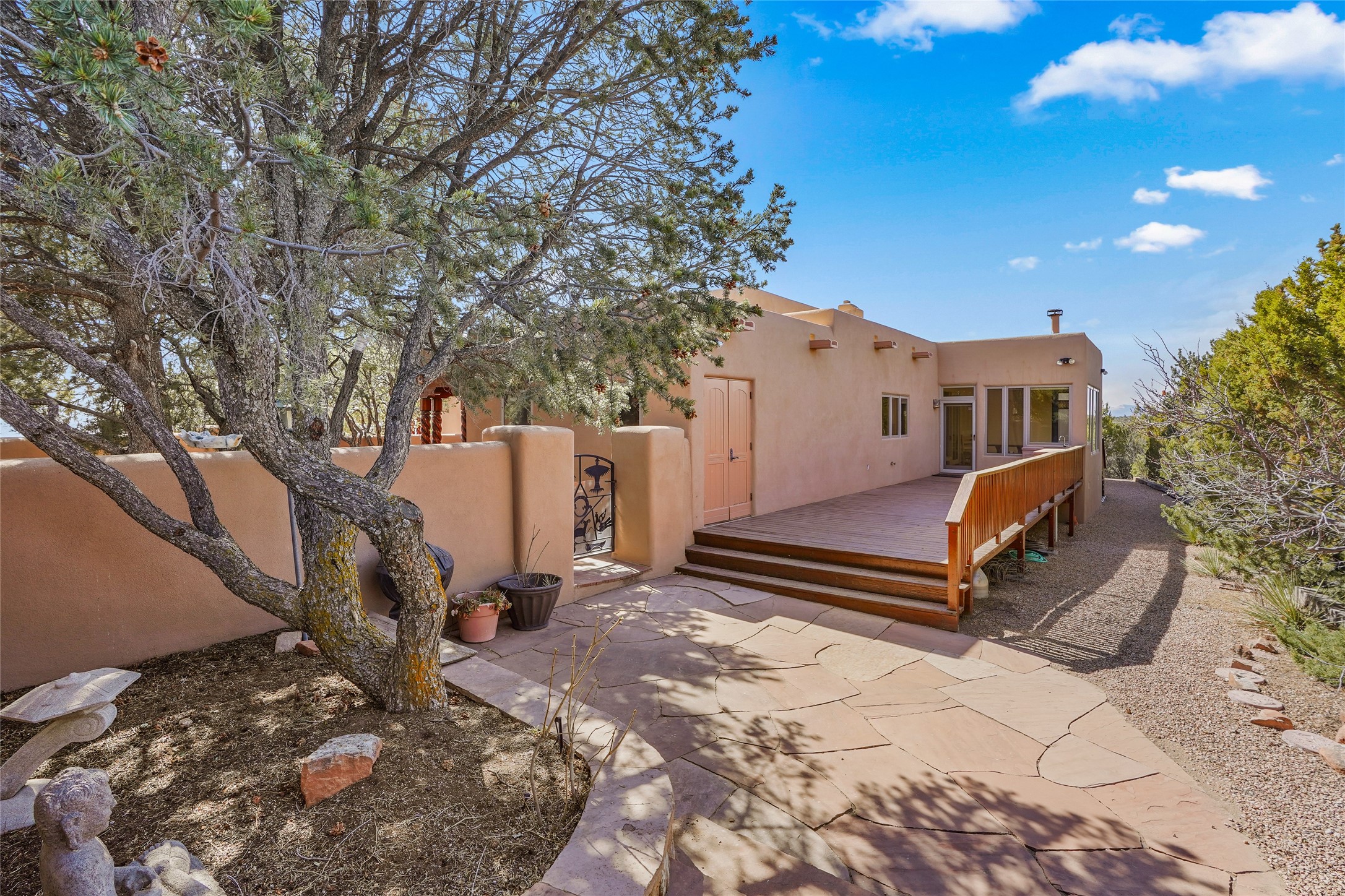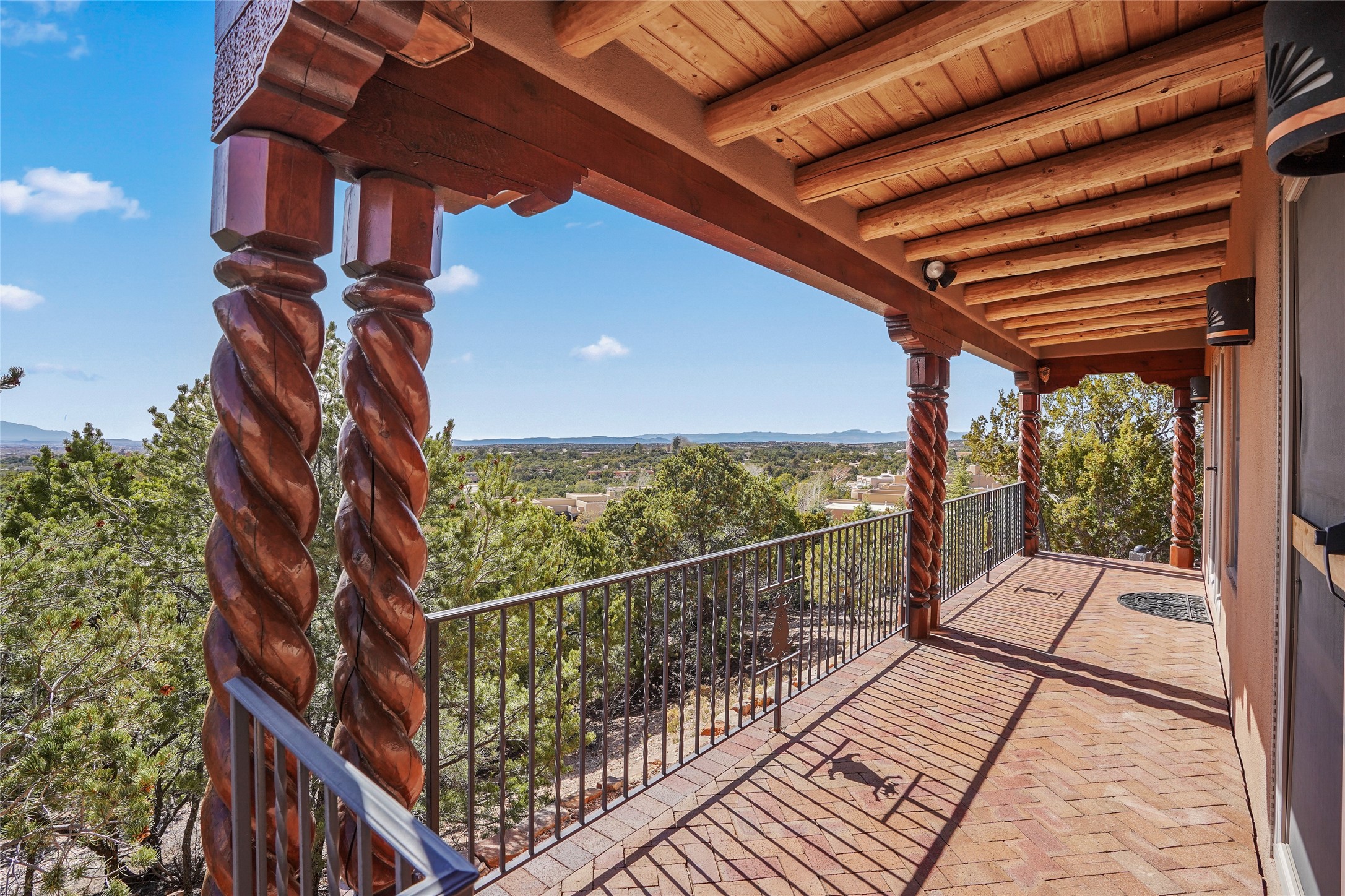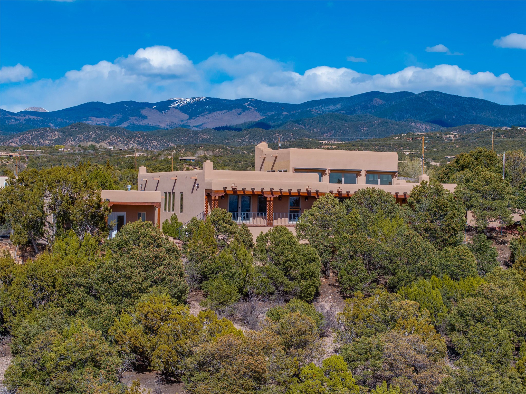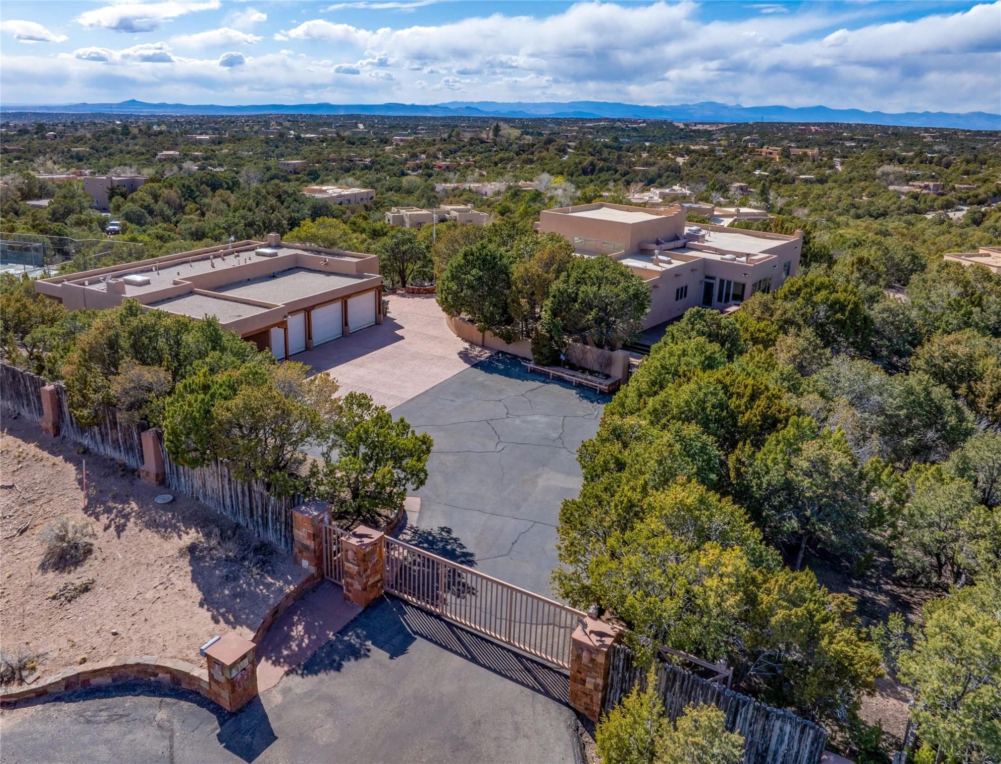A very special estate offering approximately 1.5 miles to the Historic Santa Fe Plaza. Convenient to Highway 285, Tesuque Village, Ski Santa Fe and The Santa Fe Opera. The single level main house commands exquisite views of Downtown Santa Fe, the Jemez Mountains and a gorgeous, nestled view of the Sangre de Cristo Mountains. The gorgeous Kitchen is well designed and equipped. The guest casita has two fireplaces and also has a great view to Downtown from the large south facing veranda. The beautiful art studio is a perfect workspace with a kitchenette (partial kitchen: Sink, counter, cabinets. No appliances) and 1/2 bath. A 3- car garage is a great addition to this estate compound. There is also a tennis court included with this offering. The tennis court needs work, though it is thoughtfully located on the property with views of Downtown. The Great Room has 14' high ceilings with hand carved beams. The ceiling also has viga and cedar latillas. A wet bar is also located in the Great Room. This is an extremely well-designed home as well as are the additional structures. This property is coyote fenced and gated with many security features.