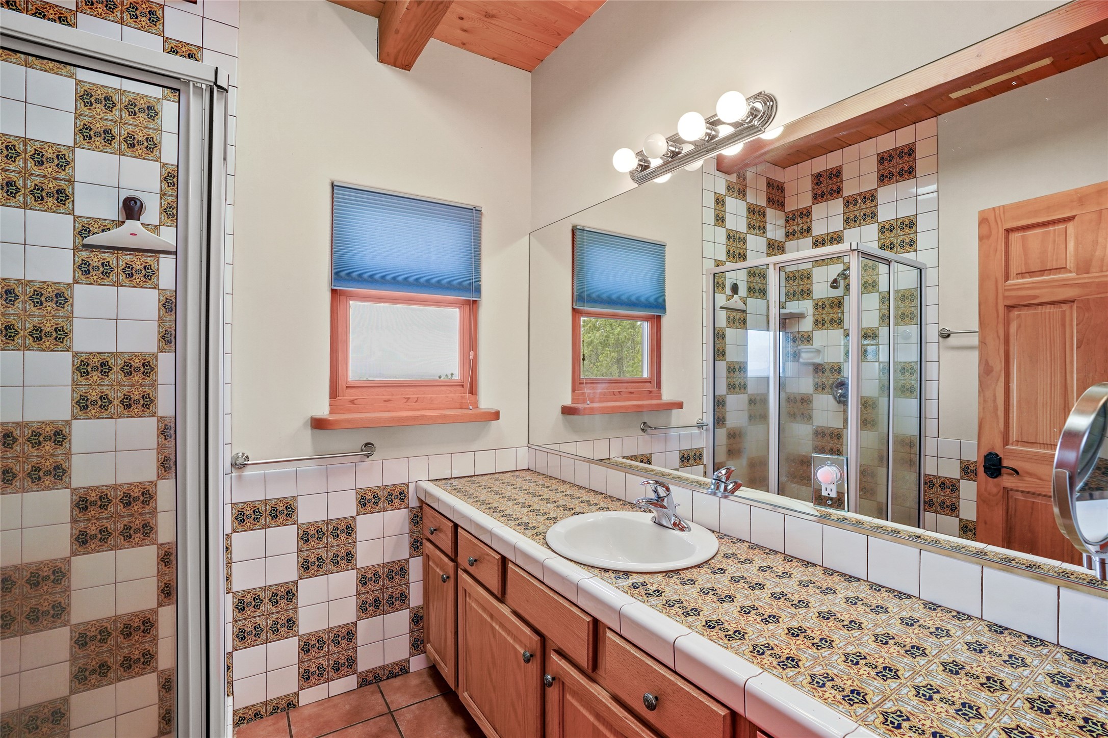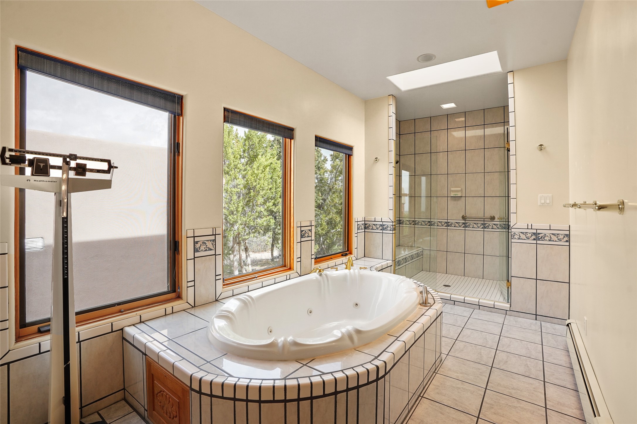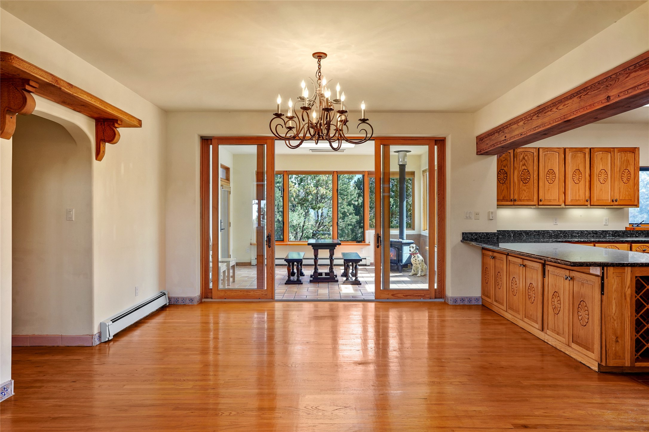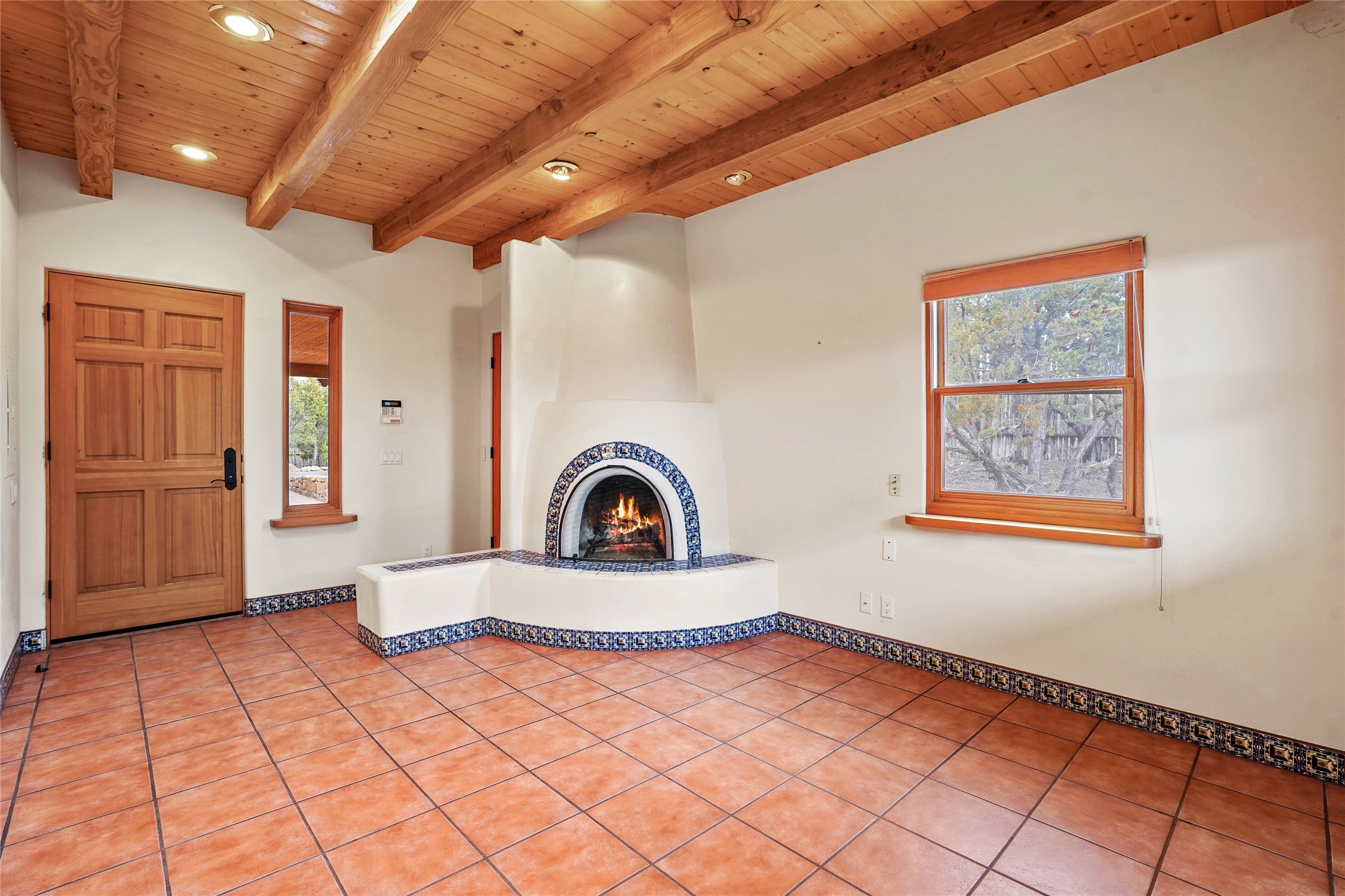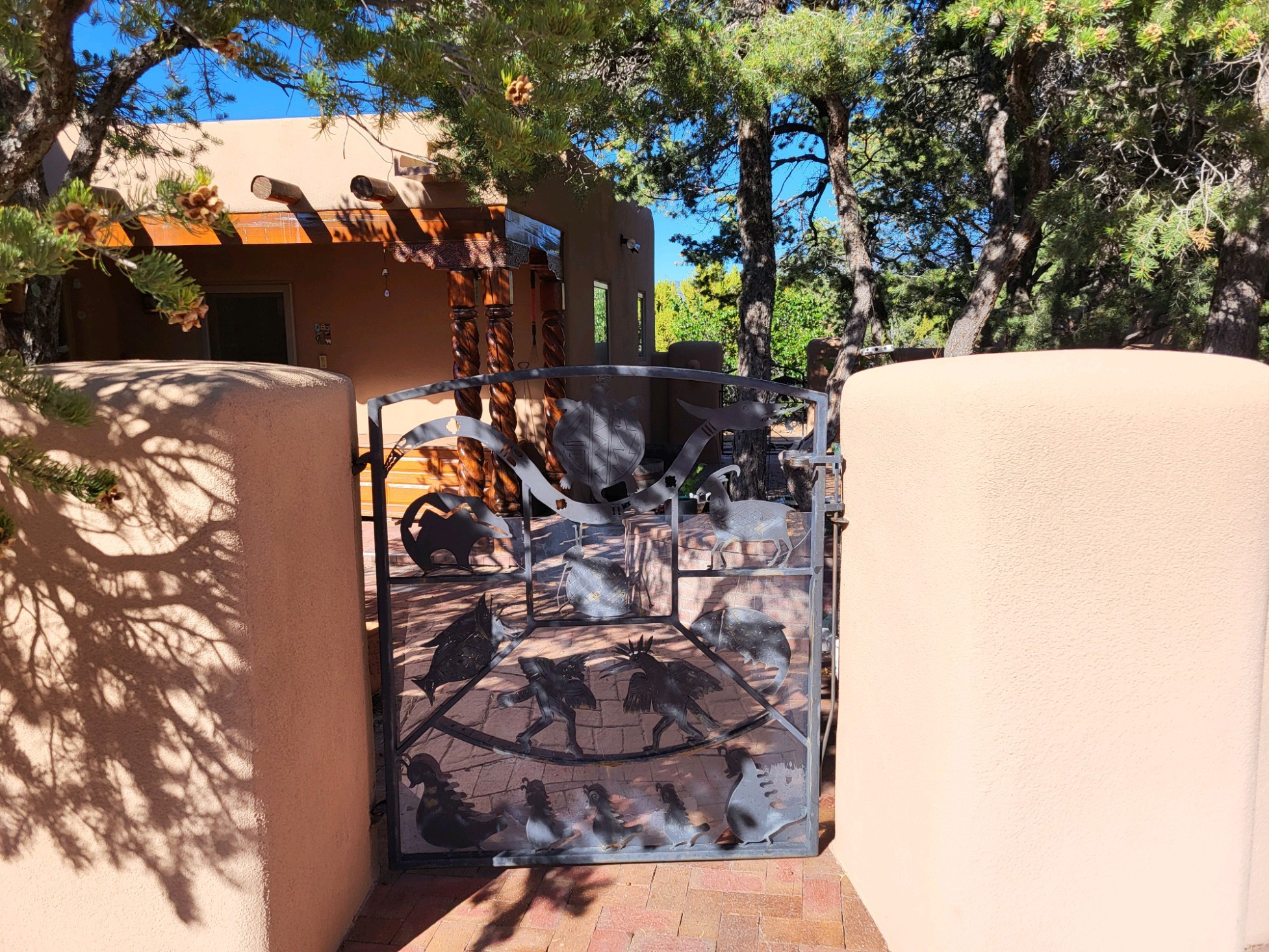 A very special estate offering approximately 1.5 miles to the Historic Santa Fe Plaza. Convenient to Highway 285, Tesuque Village, Ski Santa Fe and The Santa Fe Opera. The single level main house commands exquisite views of Downtown Santa Fe, the Jemez Mountains and a gorgeous, nestled view of the Sangre de Cristo Mountains. The gorgeous Kitchen is well designed and equipped. The guest casita has two fireplaces and also has a great view to Downtown from the large south facing veranda. The beautiful art studio is a perfect workspace with a kitchenette (partial kitchen: Sink, counter, cabinets. No appliances) and 1/2 bath. A 3- car garage is a great addition to this estate compound. There is also a tennis court included with this offering. The tennis court needs work, though it is thoughtfully located on the property with views of Downtown. The Great Room has 14' high ceilings with hand carved beams. The ceiling also has viga and cedar latillas. A wet bar is also located in the Great Room. This is an extremely well-designed home as well as are the additional structures. This property is coyote fenced and gated with many security features.