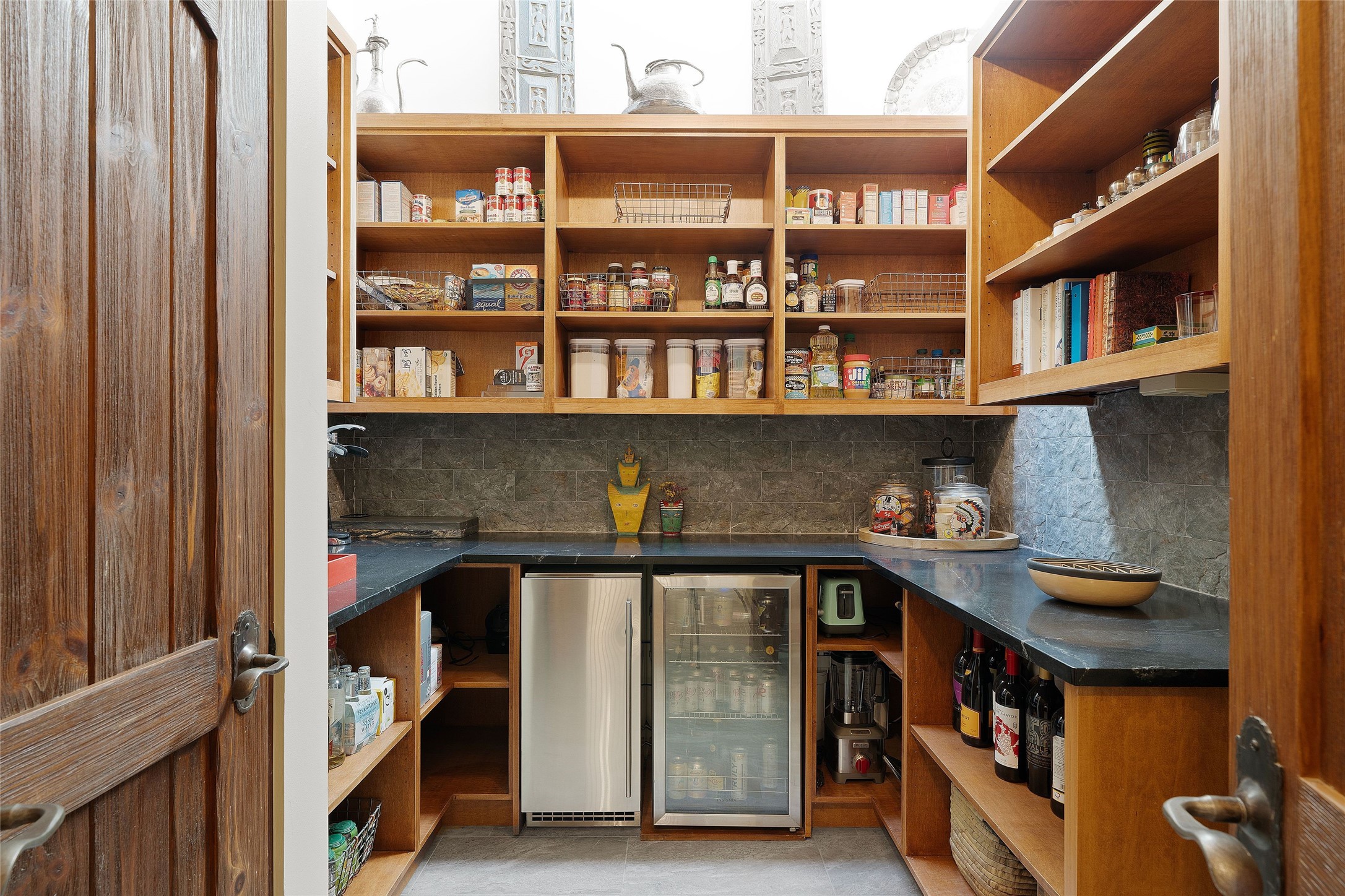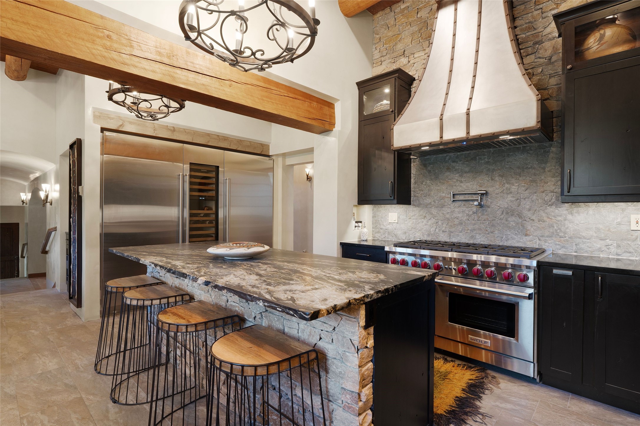 There is a warmth, substance, and grandeur to this house at 2570 Atalaya Hills Trail. Sited on over seven acres high above the city in the Atalaya Hills gated subdivision, the expansive property is simultaneously intimate yet has a stately quality reminiscent of one of Santa Fe's classic and famous hotels. This residence has four bedrooms, an attached one-bedroom casita with full kitchen and a detached two-room studio with a powder bath. The house also has multiple living, recreational, and office-like spaces. The environment is both classic in feeling, but elevated with modern design where needed. The kitchen recently underwent an extensive renovation that included custom cabinetry, Mexican crafted steel and brass vent hood, Wolf range, separate Sub Zero refrigerator and freezer, wine fridge, coffee bar, and walk-in pantry. The primary bedroom is set aloft at the top of the house and looks over the city which gleams in the valley below. The Jemez Mountains provide the backdrop for spectacular sunsets. At night, the warm light reflects off the plaster walls and enriches the carved wood and wrought iron detail throughout to give the house a romantic quality. The outdoor entertaining spaces are abundant with multiple patios all of which enjoy mountain or city views. The main outdoor space features an intimate seating area with fireplace, a rooftop deck and a fire pit next to the spa. Although set in a peaceful rural location, this property is only three miles from the plaza. For added convenience, there is a spacious two car garage with storage and a separate one car garage for the casita or the extra toys. This is a property rich in character and quality with exceptional views and setting that gives the future owner great flexibility in how they want to live. The adjacent five acre tract can be purchased with the home.