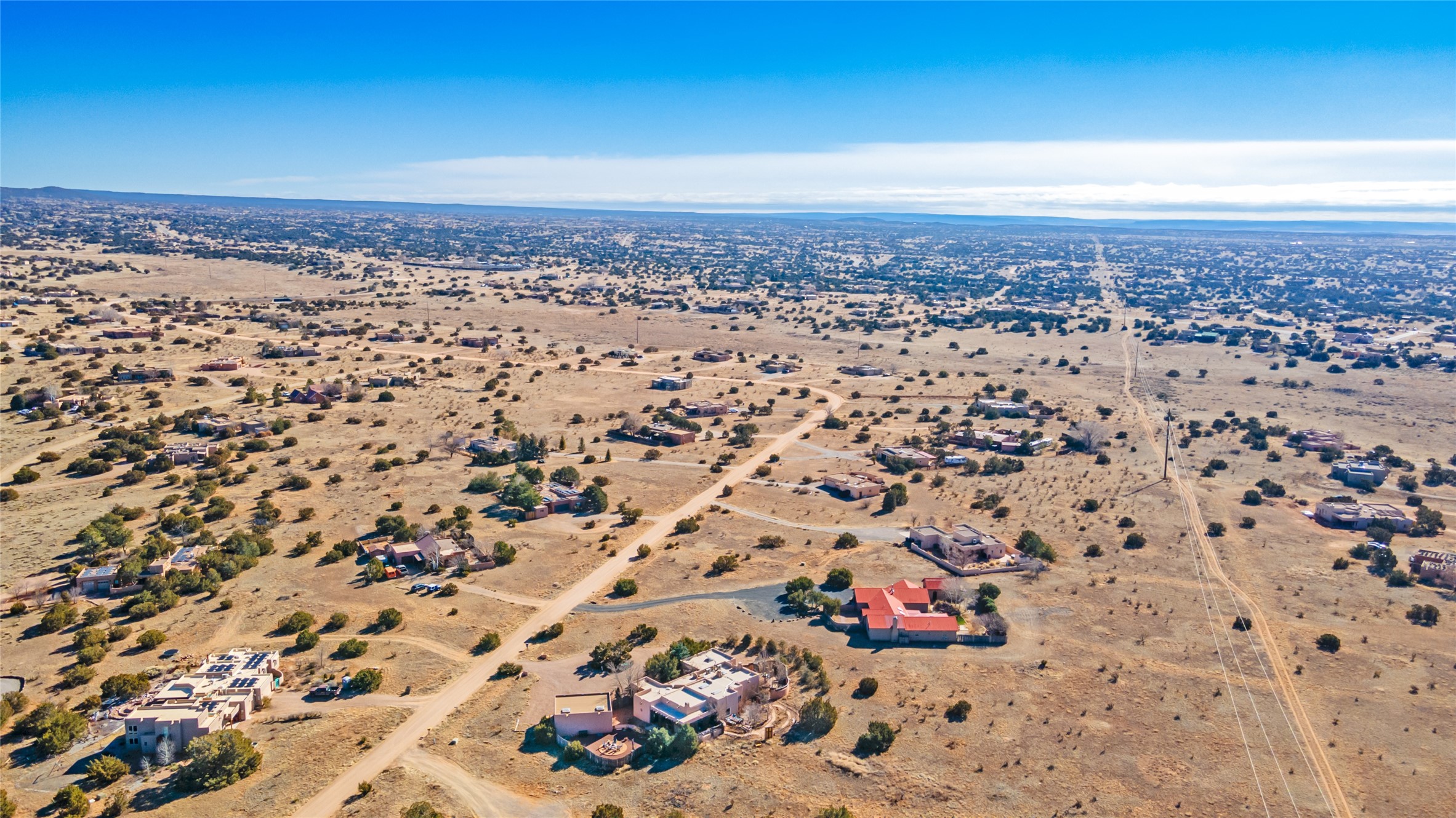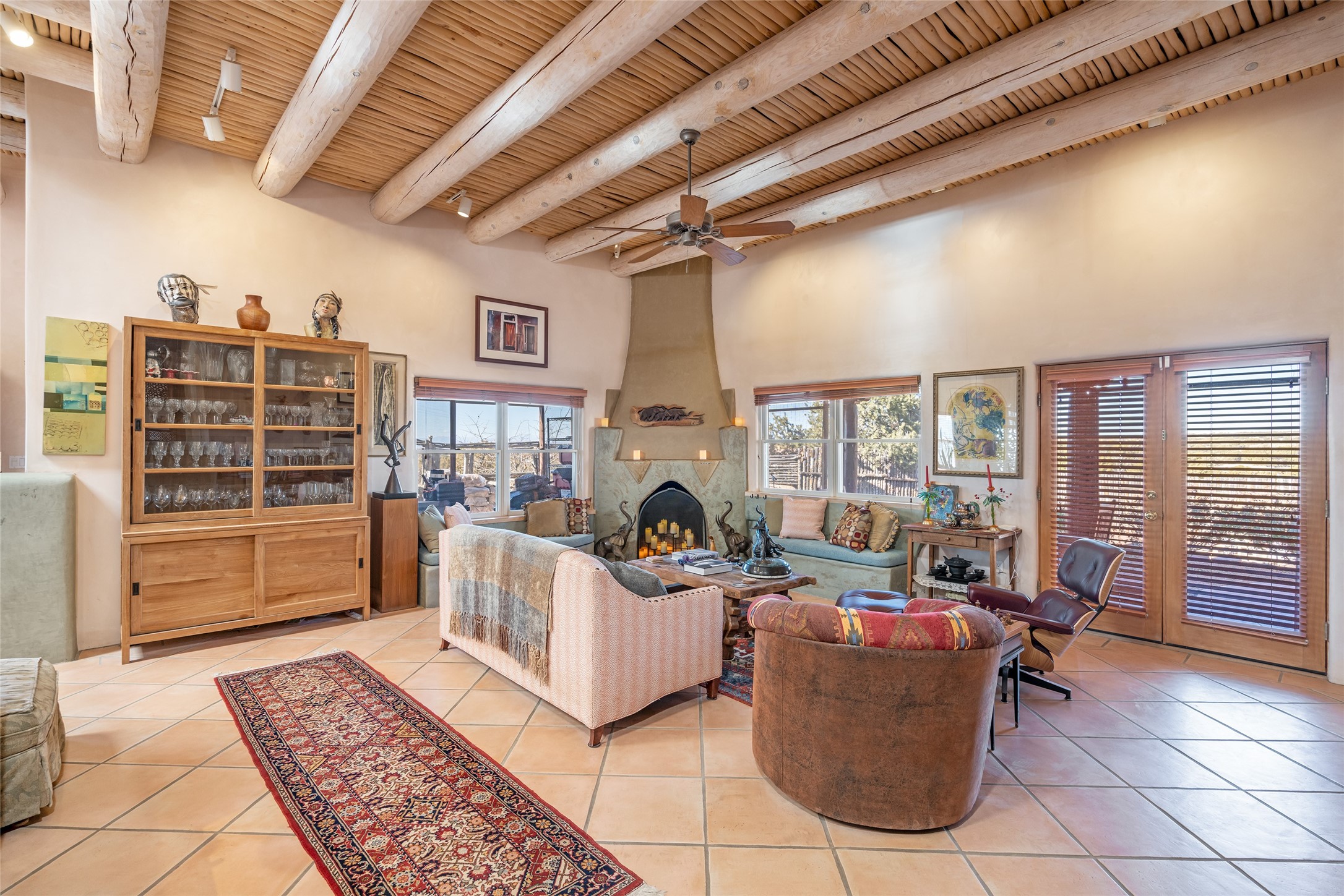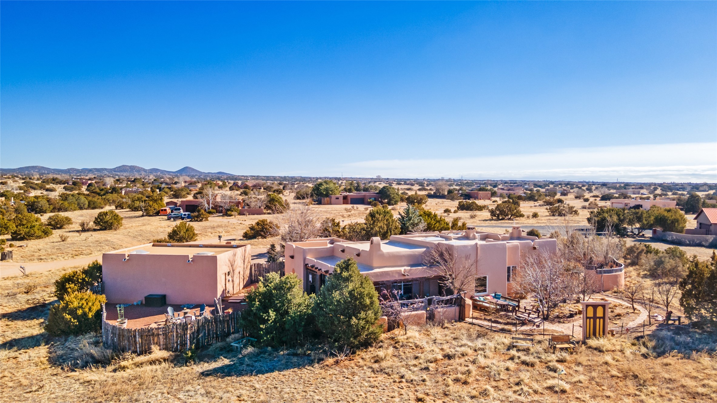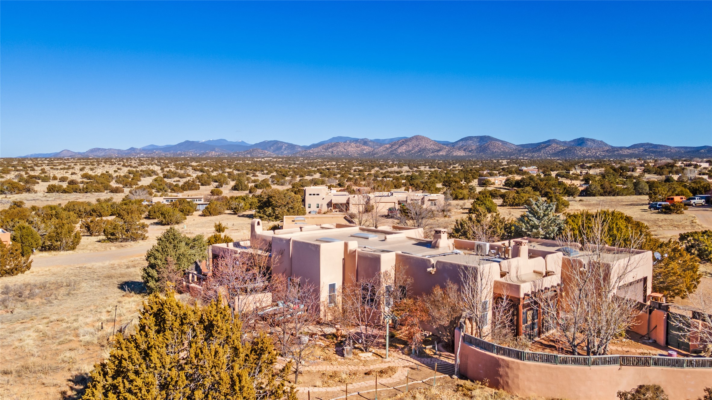 Lovely Eldorado home on 1.61 acres with views! Walled in entry courtyard with a Koi pond plus several outdoor portals with a green belt bordering the property in the back area. 3 bedrooms, 2 1/2 baths with an attached artist studio with a sink and upgraded 220 electric. There is a heated office area off the laundry room which is next to the heated studio. Three Kiva fireplaces and many colorful Santa Fe touches with an Asian twist! Vigas, Latilla ceilings, nichos, built-in bancos, vivid tile murals and 17" x 17" ceramic tile flooring throughout most of the home. New Weil McClain boiler installed in February 2025. Kitchen features stainless appliances with a newer Wolf induction cooktop, new LG refrigerator, Asko dishwasher, and new heavy duty Speed Queen washer/dryer. The kitchen cabinets have animated, hand painted tin motif panels. One step down to the Living area plus there is a den right by the kitchen. A bookshelf features a secret door that goes from the den to the entryway. Four mini-splits installed about 4 years ago. Roof redone by Santa Fe Roofing and Stucco; transferrable warranty until 11/2034. A heated walk way to the detached 3 car garage (874 square feet) was added in 2018 with built in California Closets cabinets. The garage also has epoxy painted floors and 2 skylights for natural light; with one skylight that can manually open. Mature landscaping with inground irrigation plus many apple, cherry and pear trees. Don't miss this delightful property; a peaceful oasis with plenty of Southwest charm.