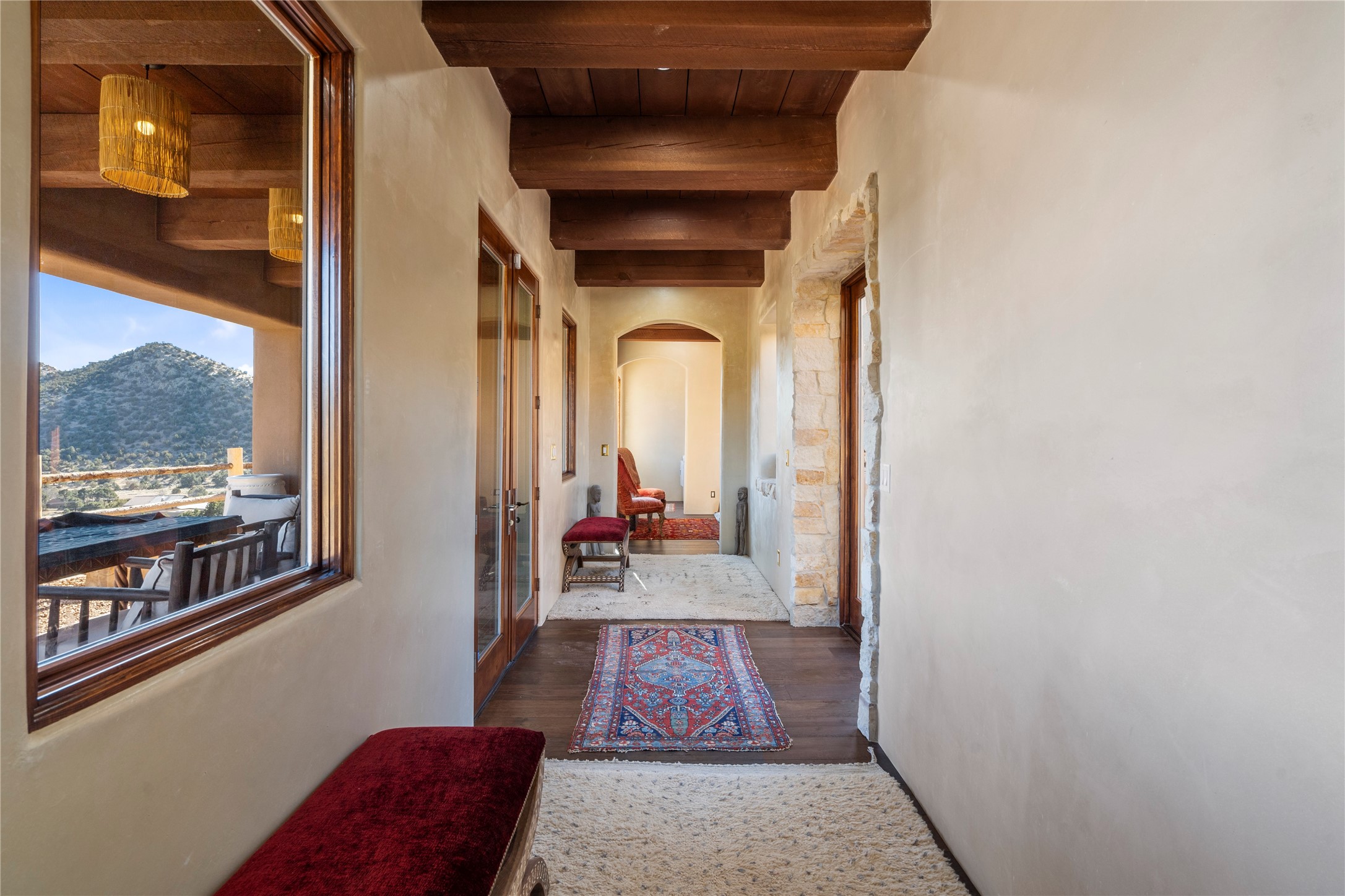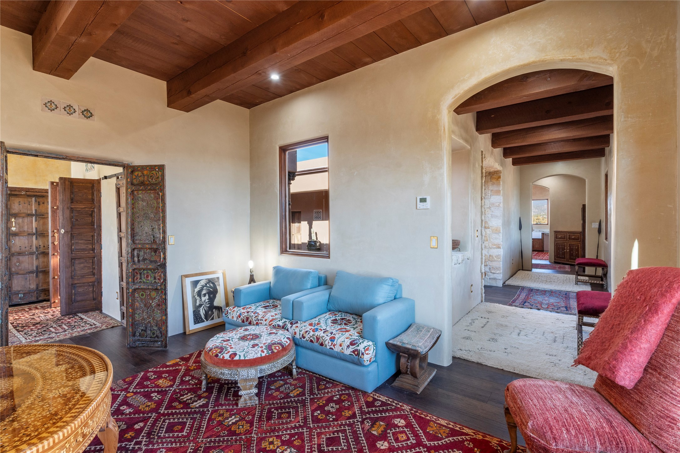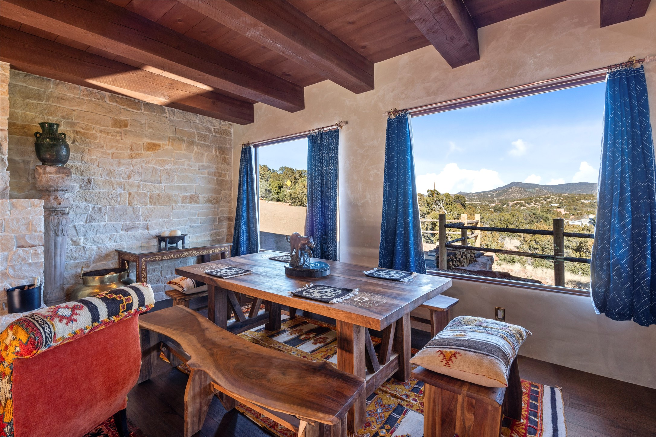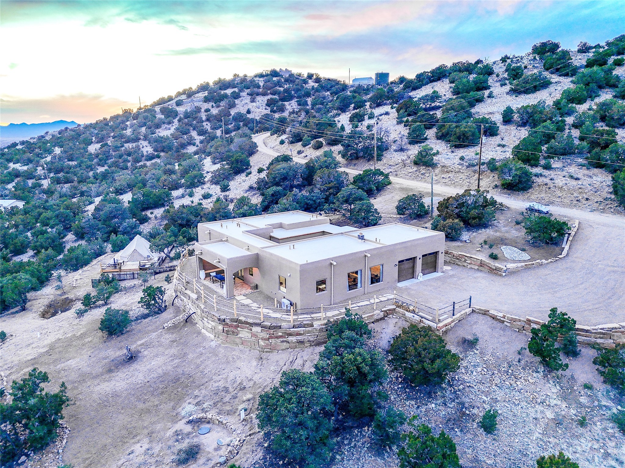 Meticulously designed by one of the world's premier jewelers, whose clients include Hollywood celebrities, fashion models, and other discerning individuals drawn to his unique, classically inspired art, and eye for detail.Just Imagine living in a pristine property created by an incredible artist in the peak of his career. This gorgeous home is the manifestation of a lifetime of world travels, creating an ambiance and layout of beauty everywhere: with every hand painted tile collected through time, every faucet, every stone. Nestled within the highly sought-after Sun Hills community, this newly constructed 2 bedroom 2.5 bath oasis offers the perfect blend of luxury and tranquility, with views from all directions, light and good taste everywhere. Set on 5 acres of magnificent beauty, this exceptional home provides breathtaking, panoramic views and a serene environment, just 15 minutes from downtown Santa Fe. Photos don't do it justice, we tried! You have to come experience this for yourself! Just about every door and intricate details has been thoughtfully sourced from abroad, contributing to the home's regal, yet inviting atmosphere.Despite its grandeur, it feels warm and intimate, reflecting impeccable taste and craftsmanship at every turn. Come and experience stunning views, ultimate privacy, and an unmatched sense of peace and quiet in your true oasis in Santa Fe.Offered fully furnished, yes fully furnished with internationally collected pieces at an outstanding price for new construction in Santa Fe, this home will never be replicated, offering you the rare opportunity to live within a precious jewell.