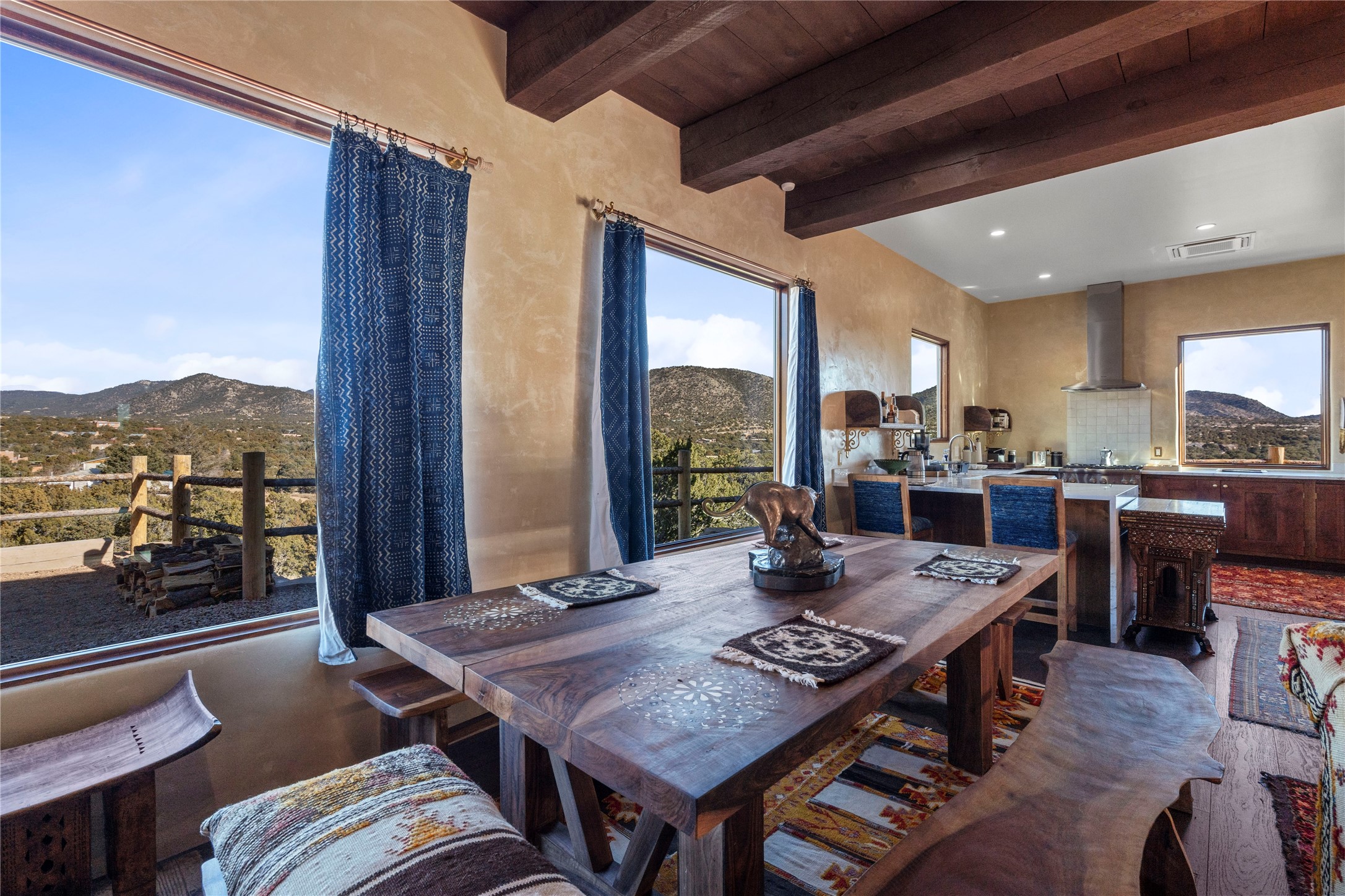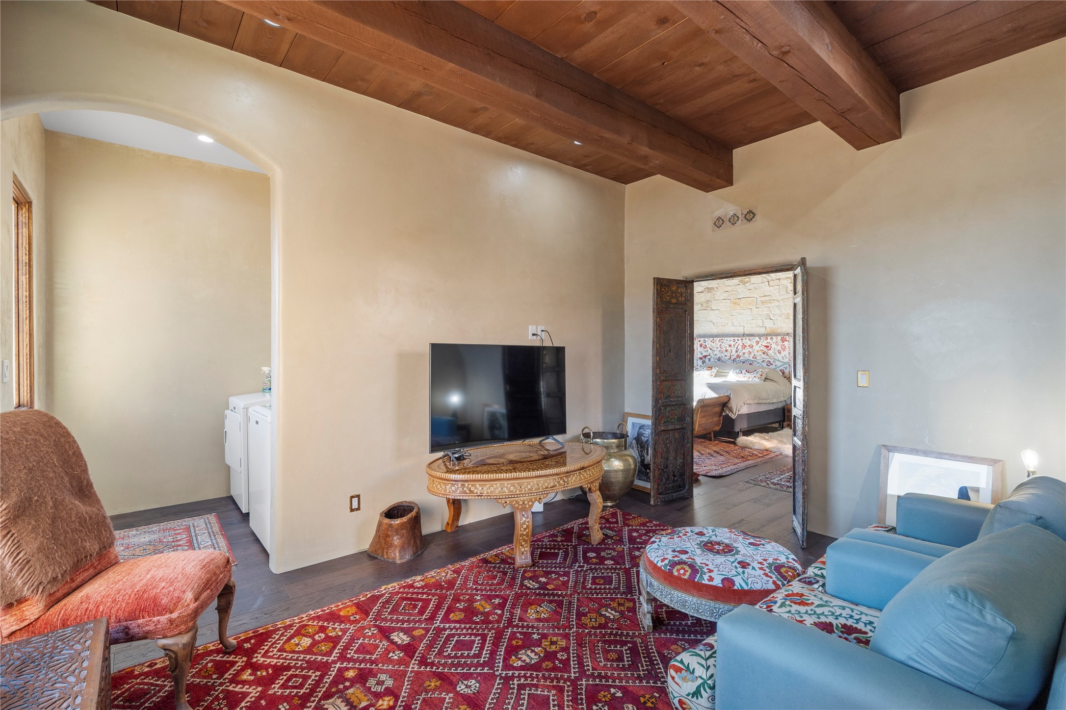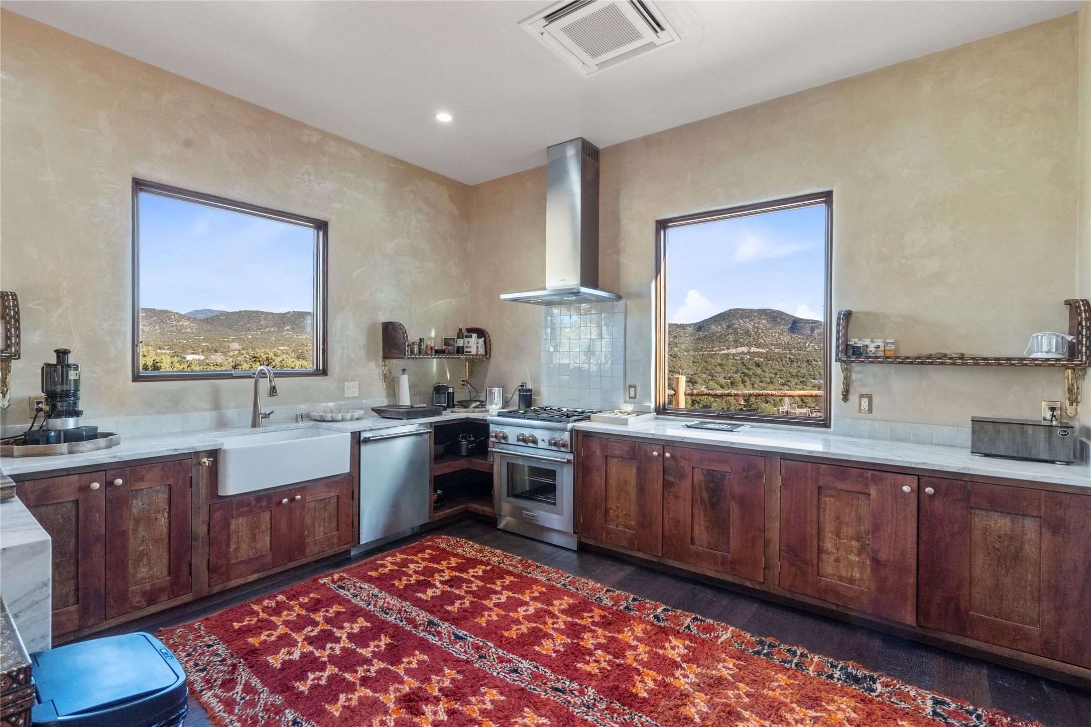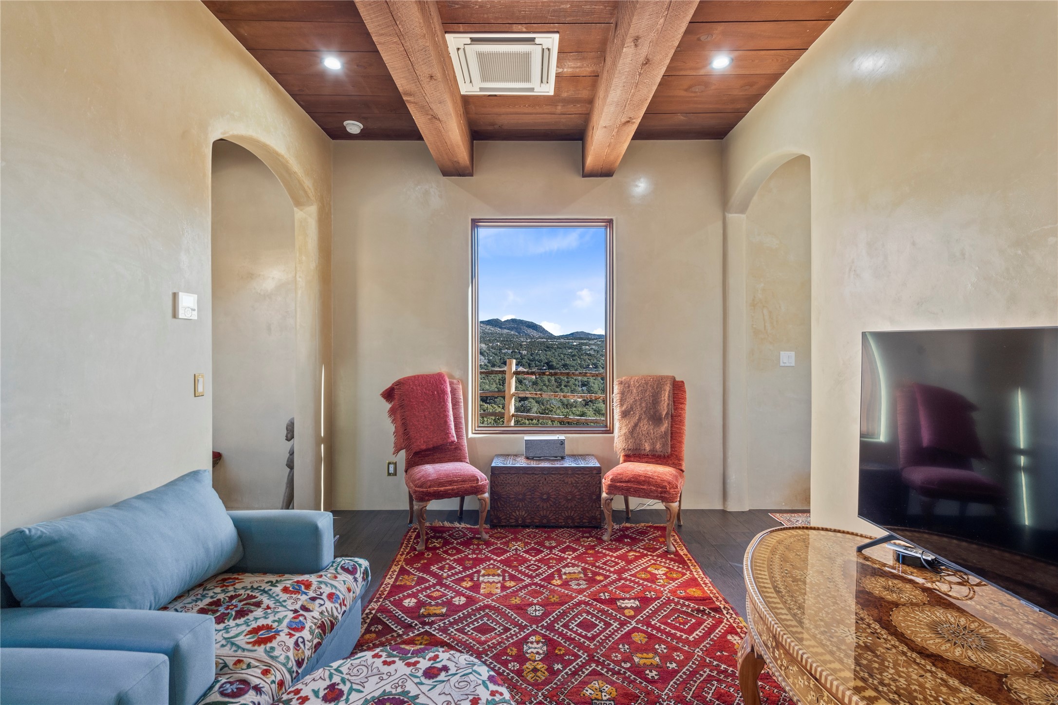 Meticulously designed by one of the world's premier jewelers, whose clients include Hollywood celebrities, fashion models, and other discerning individuals drawn to his unique, classically inspired art, and eye for detail.Just Imagine living in a pristine property created by an incredible artist in the peak of his career. This gorgeous home is the manifestation of a lifetime of world travels, creating an ambiance and layout of beauty everywhere: with every hand painted tile collected through time, every faucet, every stone. Nestled within the highly sought-after Sun Hills community, this newly constructed 2 bedroom 2.5 bath oasis offers the perfect blend of luxury and tranquility, with views from all directions, light and good taste everywhere. Set on 5 acres of magnificent beauty, this exceptional home provides breathtaking, panoramic views and a serene environment, just 15 minutes from downtown Santa Fe. Photos don't do it justice, we tried! You have to come experience this for yourself! Just about every door and intricate details has been thoughtfully sourced from abroad, contributing to the home's regal, yet inviting atmosphere.Despite its grandeur, it feels warm and intimate, reflecting impeccable taste and craftsmanship at every turn. Come and experience stunning views, ultimate privacy, and an unmatched sense of peace and quiet in your true oasis in Santa Fe.Offered fully furnished, yes fully furnished with internationally collected pieces at an outstanding price for new construction in Santa Fe, this home will never be replicated, offering you the rare opportunity to live within a precious jewell.