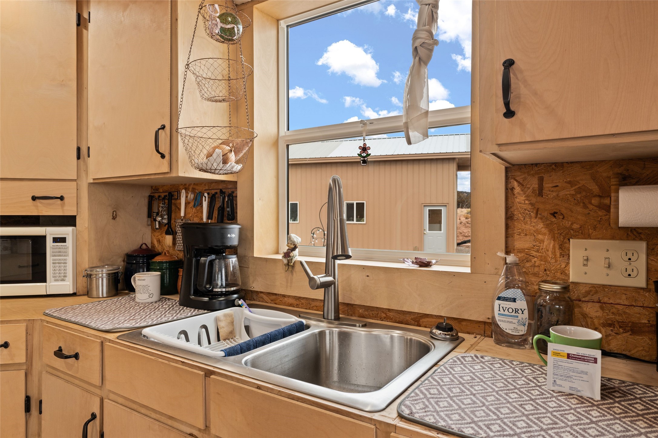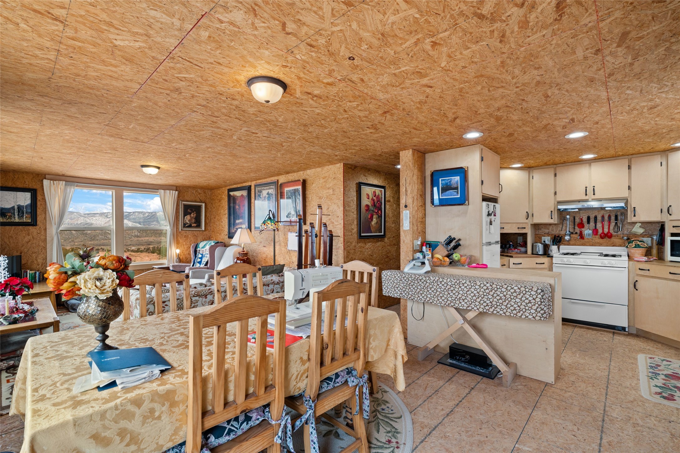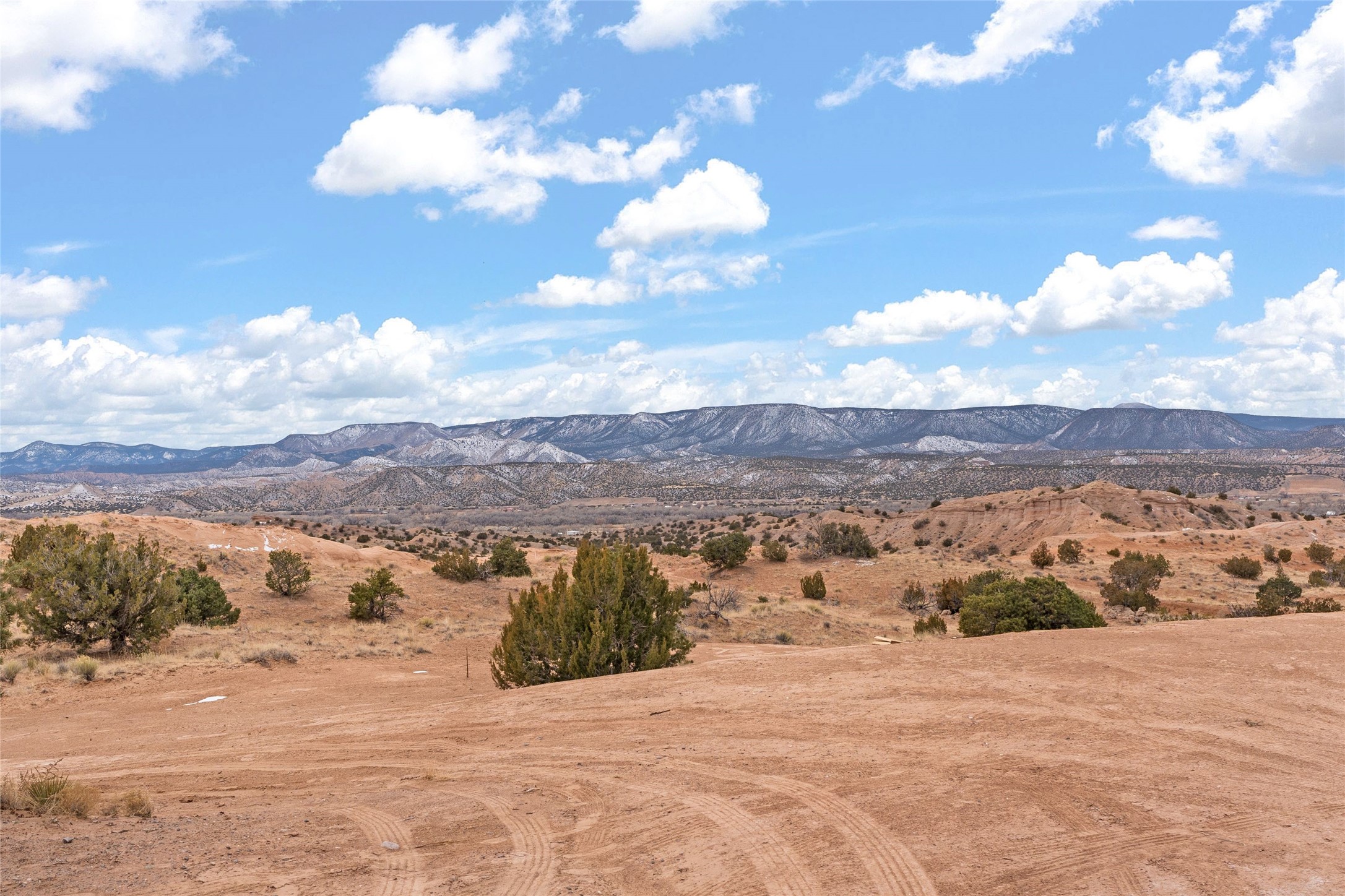 Great possibilities and 360 views from this unique, off the grid property in the hills of Abiquiu. Wonderful location with direct line views of the Pedernal, Plaza Blanca and Santa Fe and Taos mountains. This offering includes two separately deeded, one acre lots. The functional home has Pro Panel roofing and siding and benefits from solar energy, a private well and efficient, well-designed systems, featuring three bedrooms and two baths and an open living room, dining and kitchen area. Outbuildings include a large garage/shop/RV storage building as well as another separate storage building.