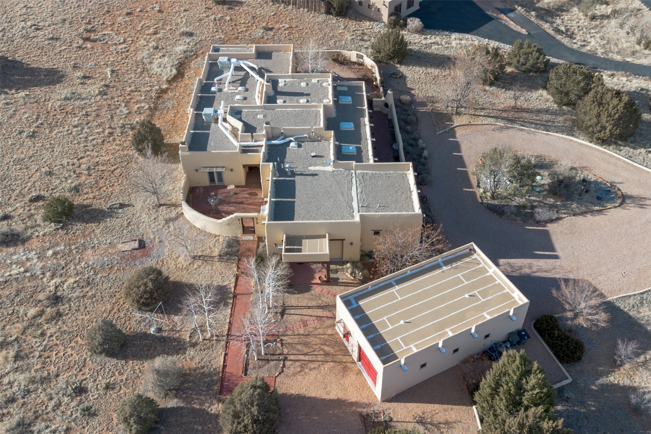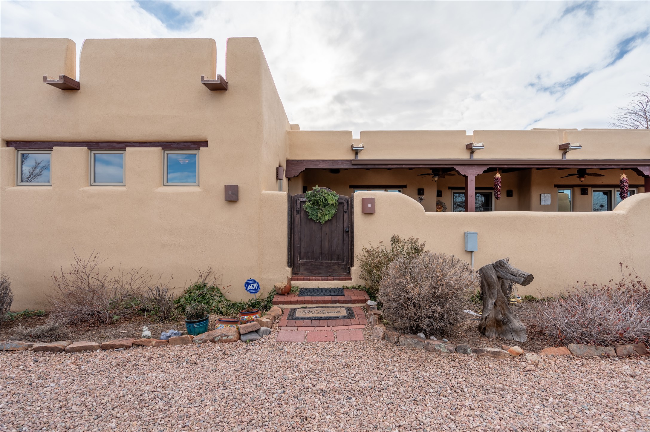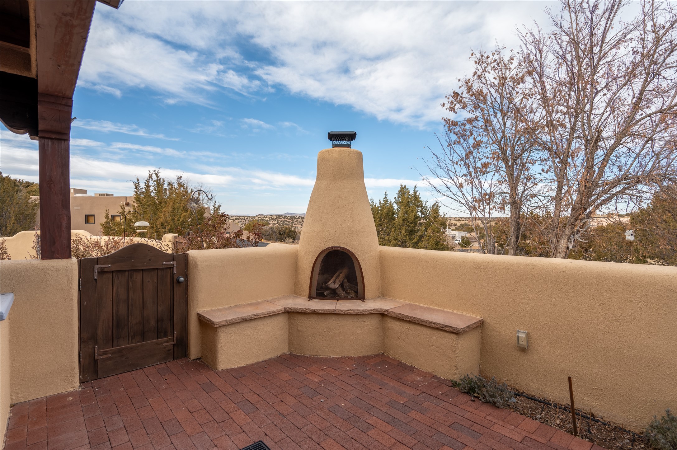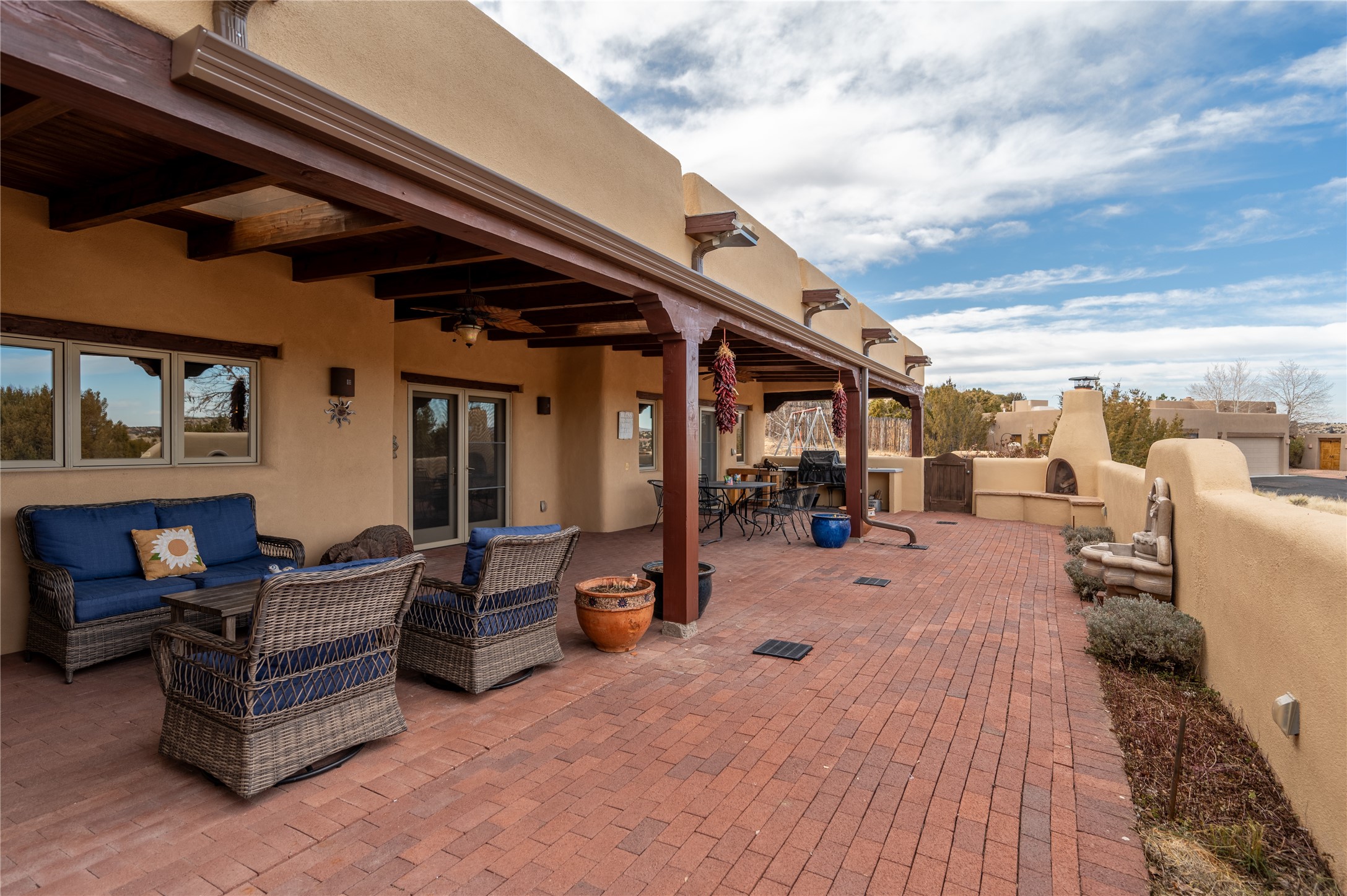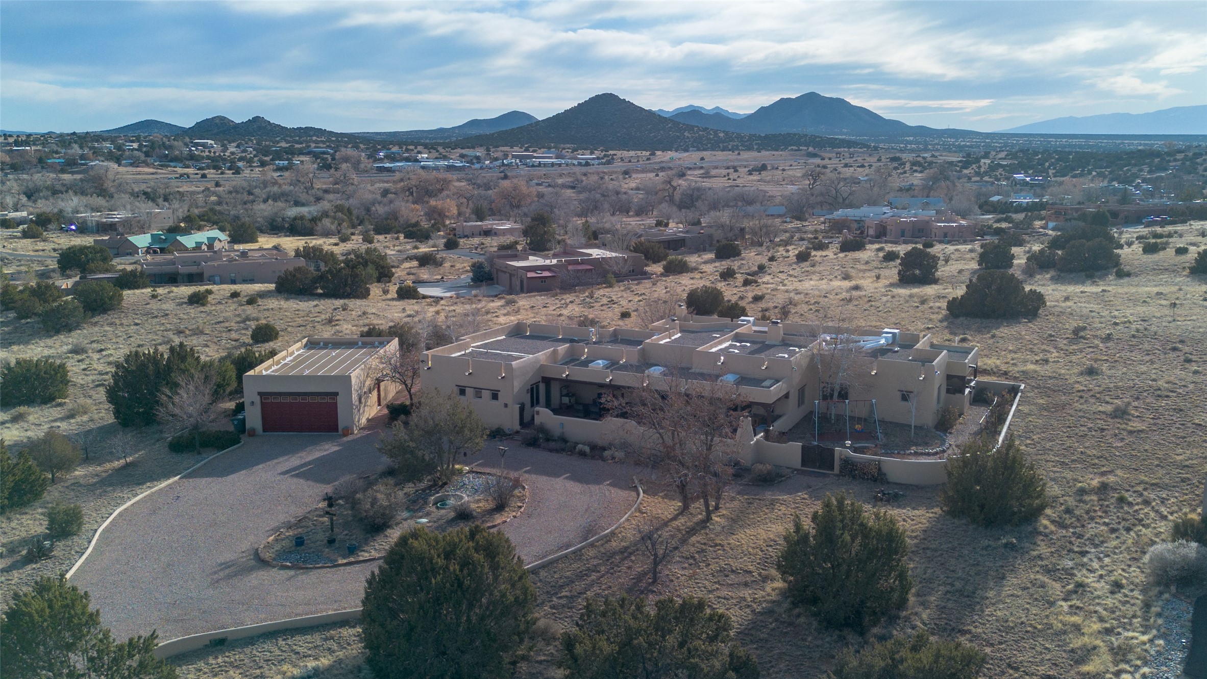Near and Far. Within 10 minutes of shopping, airport, hospital, dining and more, but the rural environment feels far from town. An authentic adobe in a gated neighborhood, the 3814 square feet includes 595 square foot 1 bedroom guest apartment or amazing studio for artists and crafts people. A favorite feature is the master bedroom's 2 separated full baths each with their own walk in closets. The high beamed ceilings are simply elegant, as are the plaster walls, lovely wood finishes, and exquisit lit art coves . Bonuses include a den, an office, 5 fireplaces, a well appointed large kitchen, a 3 car garage plus workshop, mountain views, and privacy. The deep covered patio (portal) is perfect for all weather entertaining and relaxation. A easy commute to Los Alamos or Albuquerque. This is a must see home.