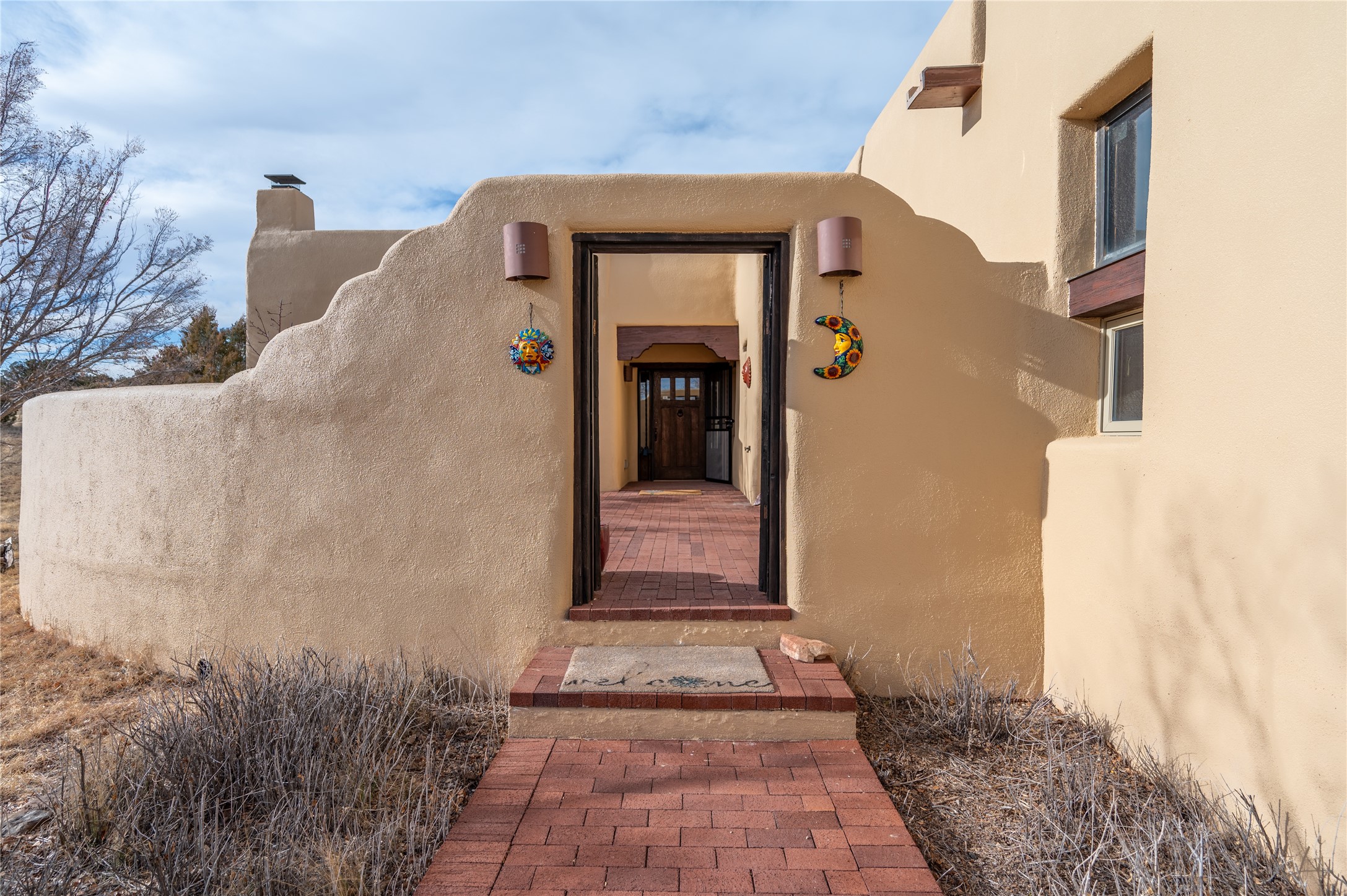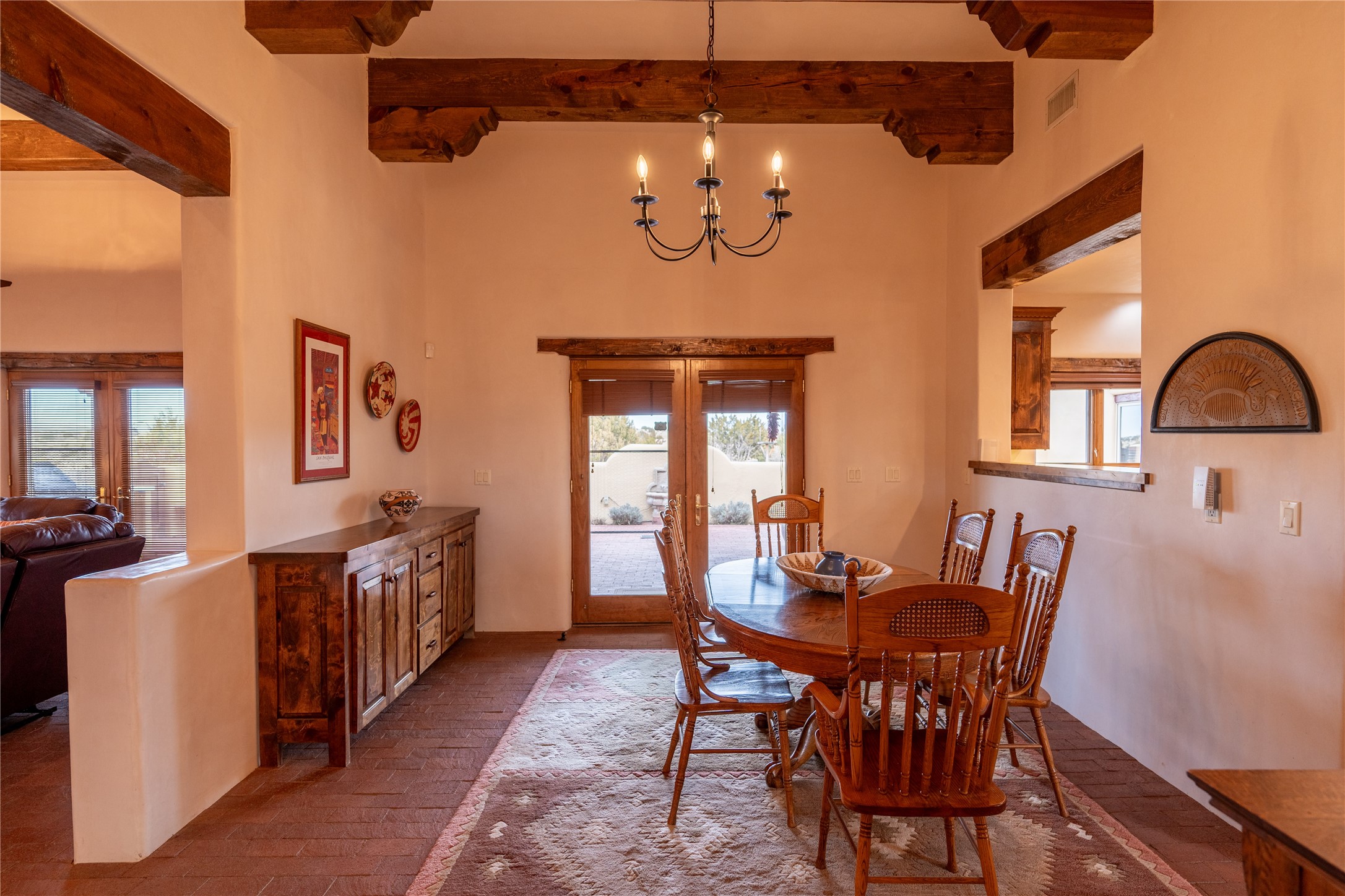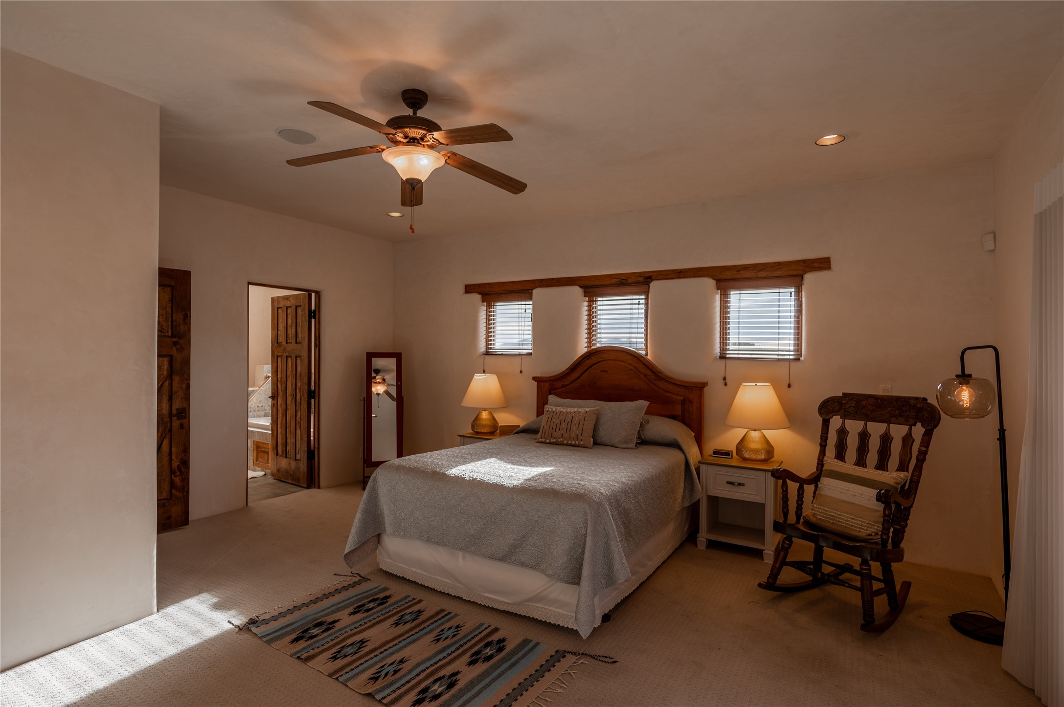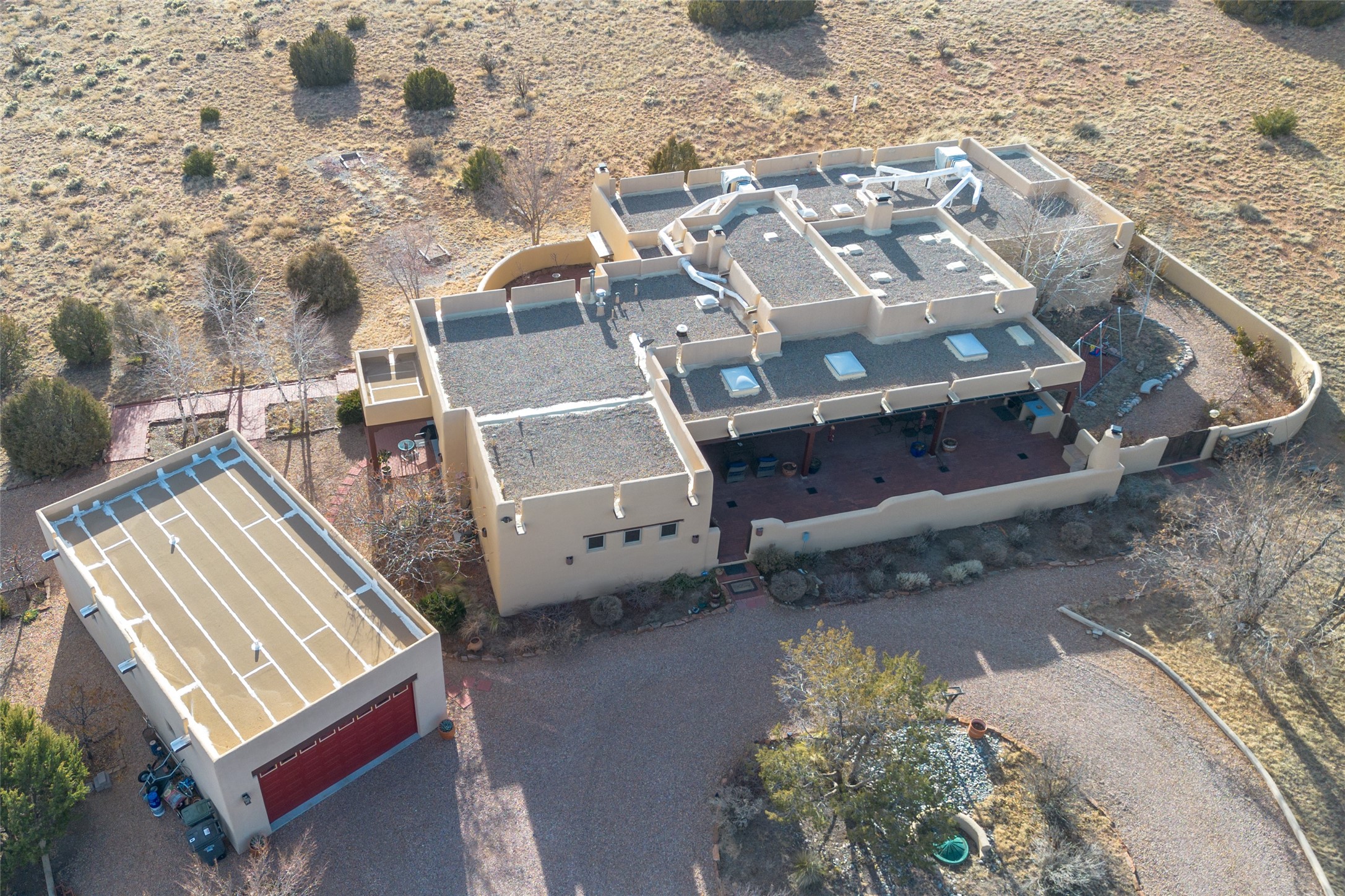 Near and Far. Within 10 minutes of shopping, airport, hospital, dining and more, but the rural environment feels far from town. An authentic adobe in a gated neighborhood, the 3814 square feet includes 595 square foot 1 bedroom guest apartment or amazing studio for artists and crafts people. A favorite feature is the master bedroom's 2 separated full baths each with their own walk in closets. The high beamed ceilings are simply elegant, as are the plaster walls, lovely wood finishes, and exquisit lit art coves . Bonuses include a den, an office, 5 fireplaces, a well appointed large kitchen, a 3 car garage plus workshop, mountain views, and privacy. The deep covered patio (portal) is perfect for all weather entertaining and relaxation. A easy commute to Los Alamos or Albuquerque. This is a must see home.