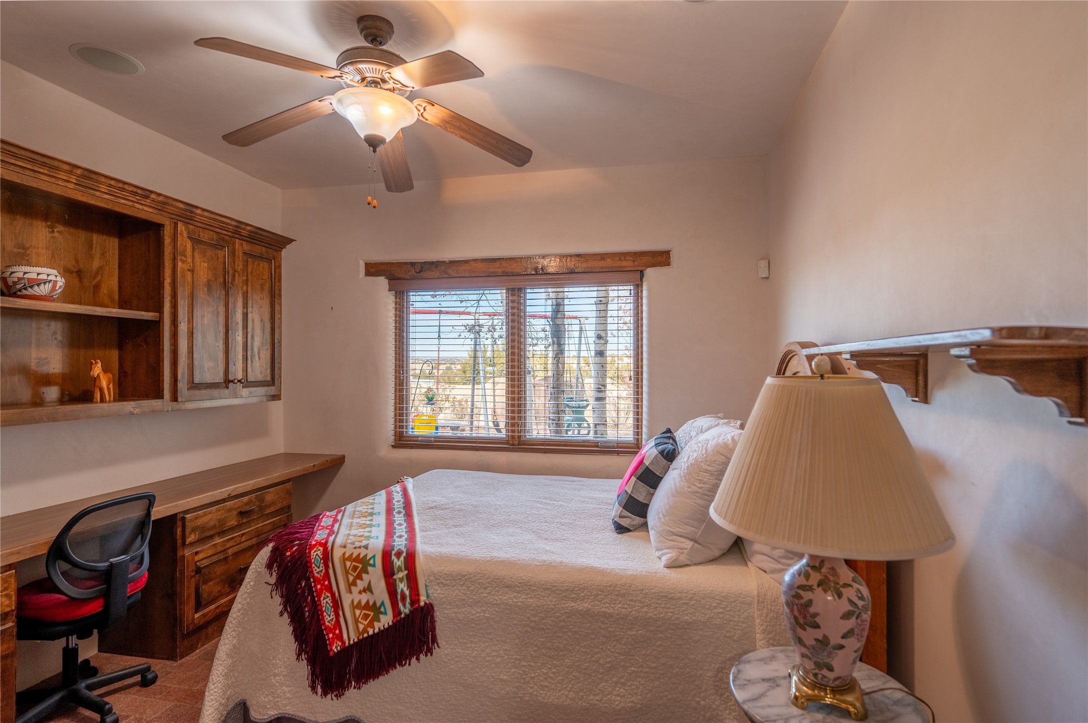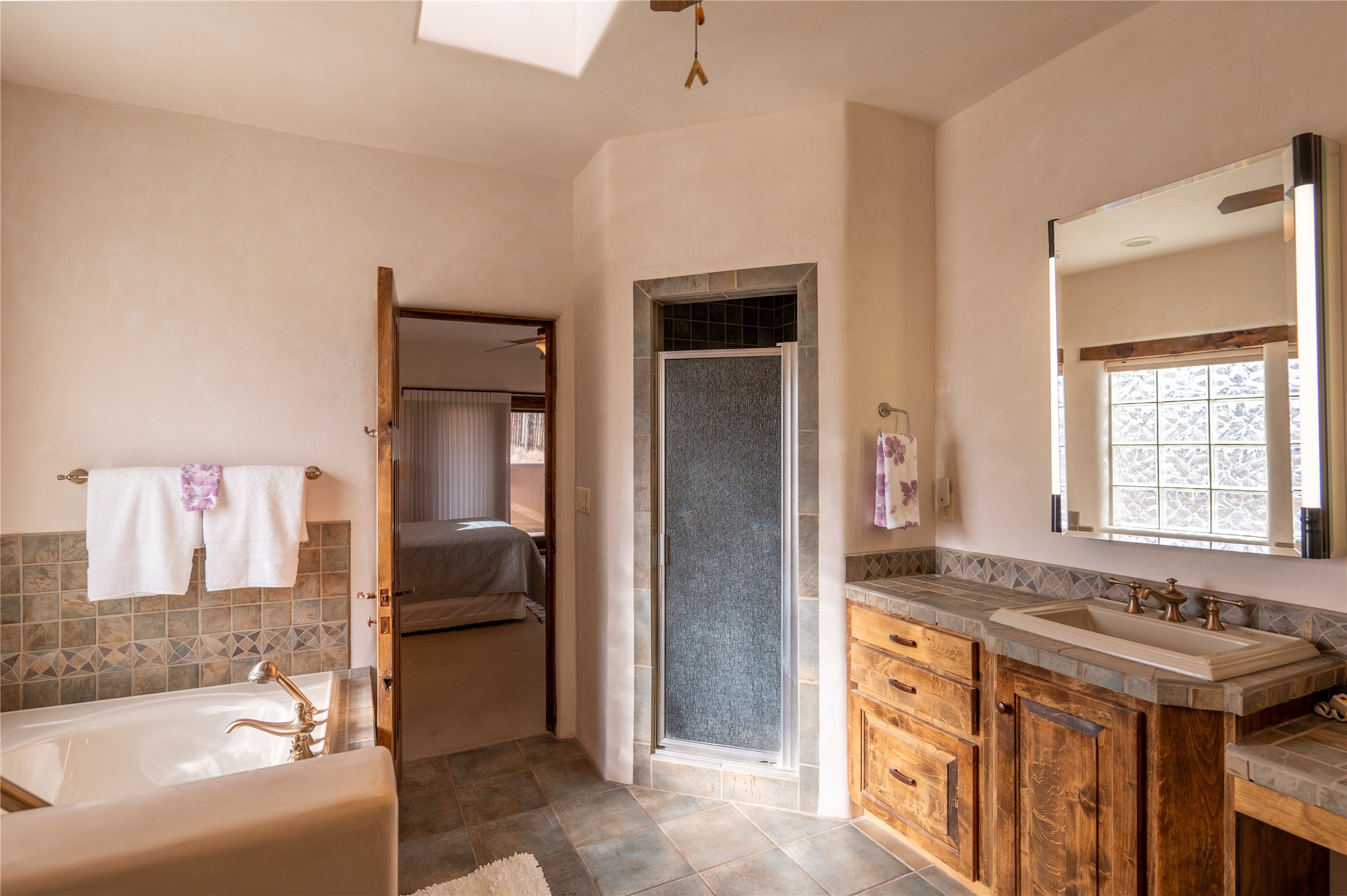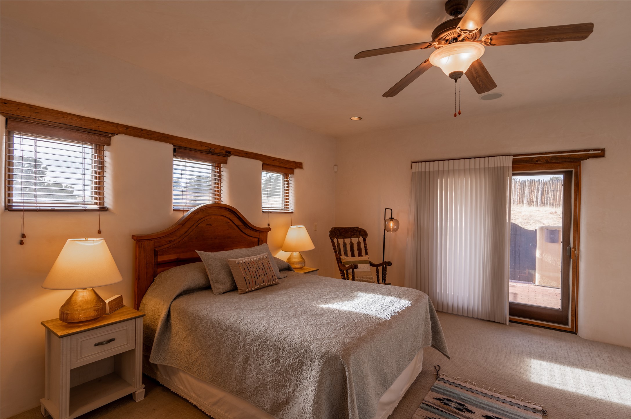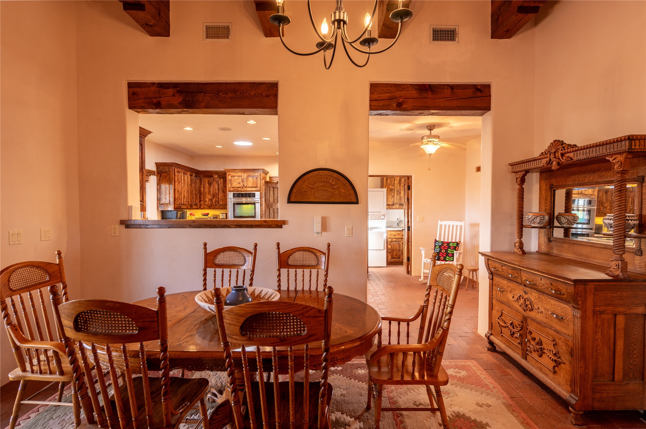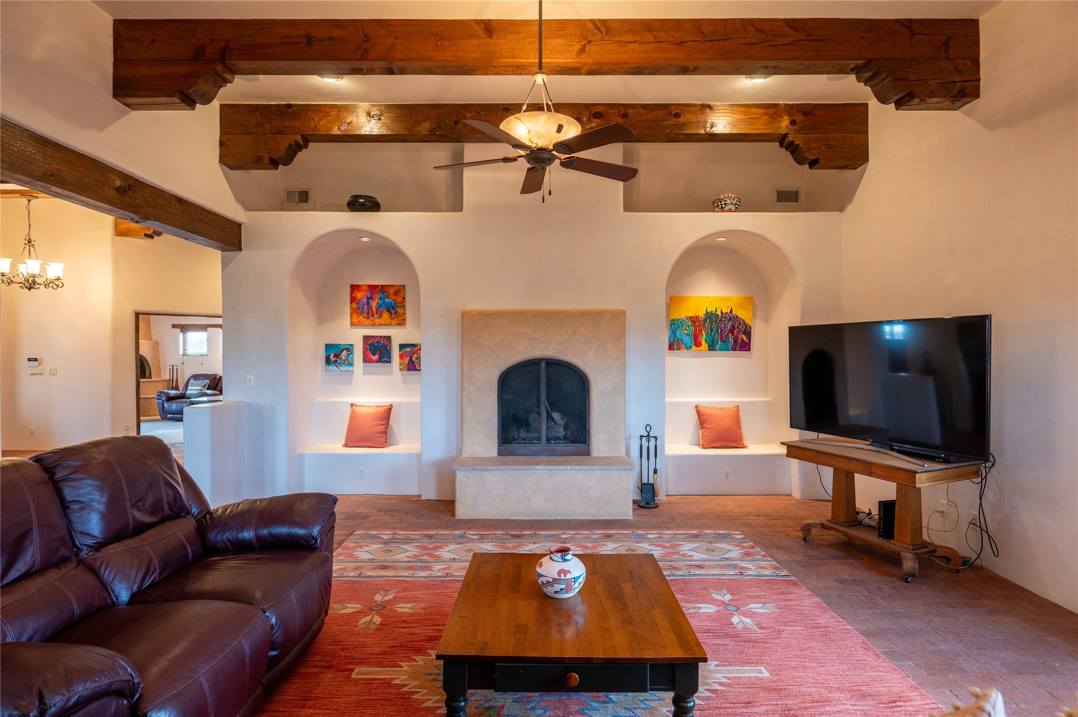 Near and Far. Within 10 minutes of shopping, airport, hospital, dining and more, but the rural environment feels far from town. An authentic adobe in a gated neighborhood, the 3814 square feet includes 595 square foot 1 bedroom guest apartment or amazing studio for artists and crafts people. A favorite feature is the master bedroom's 2 separated full baths each with their own walk in closets. The high beamed ceilings are simply elegant, as are the plaster walls, lovely wood finishes, and exquisit lit art coves . Bonuses include a den, an office, 5 fireplaces, a well appointed large kitchen, a 3 car garage plus workshop, mountain views, and privacy. The deep covered patio (portal) is perfect for all weather entertaining and relaxation. A easy commute to Los Alamos or Albuquerque. This is a must see home.